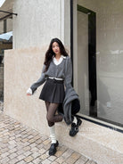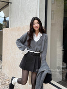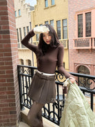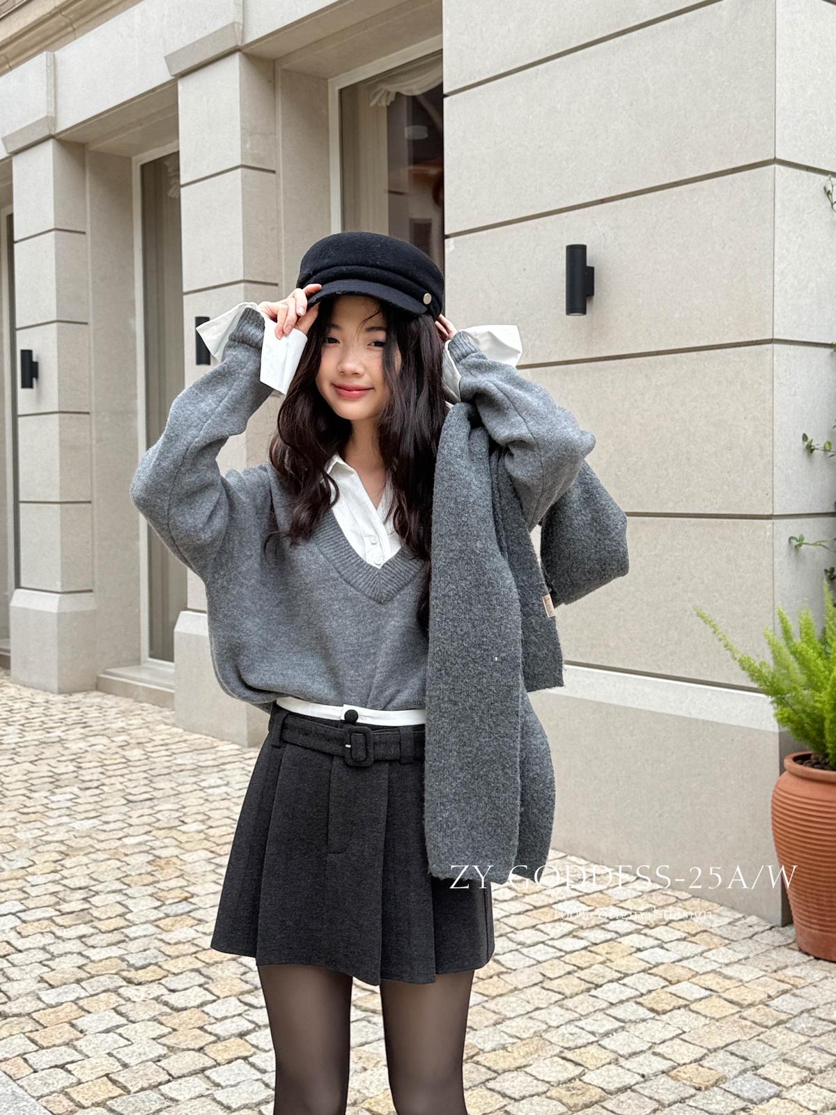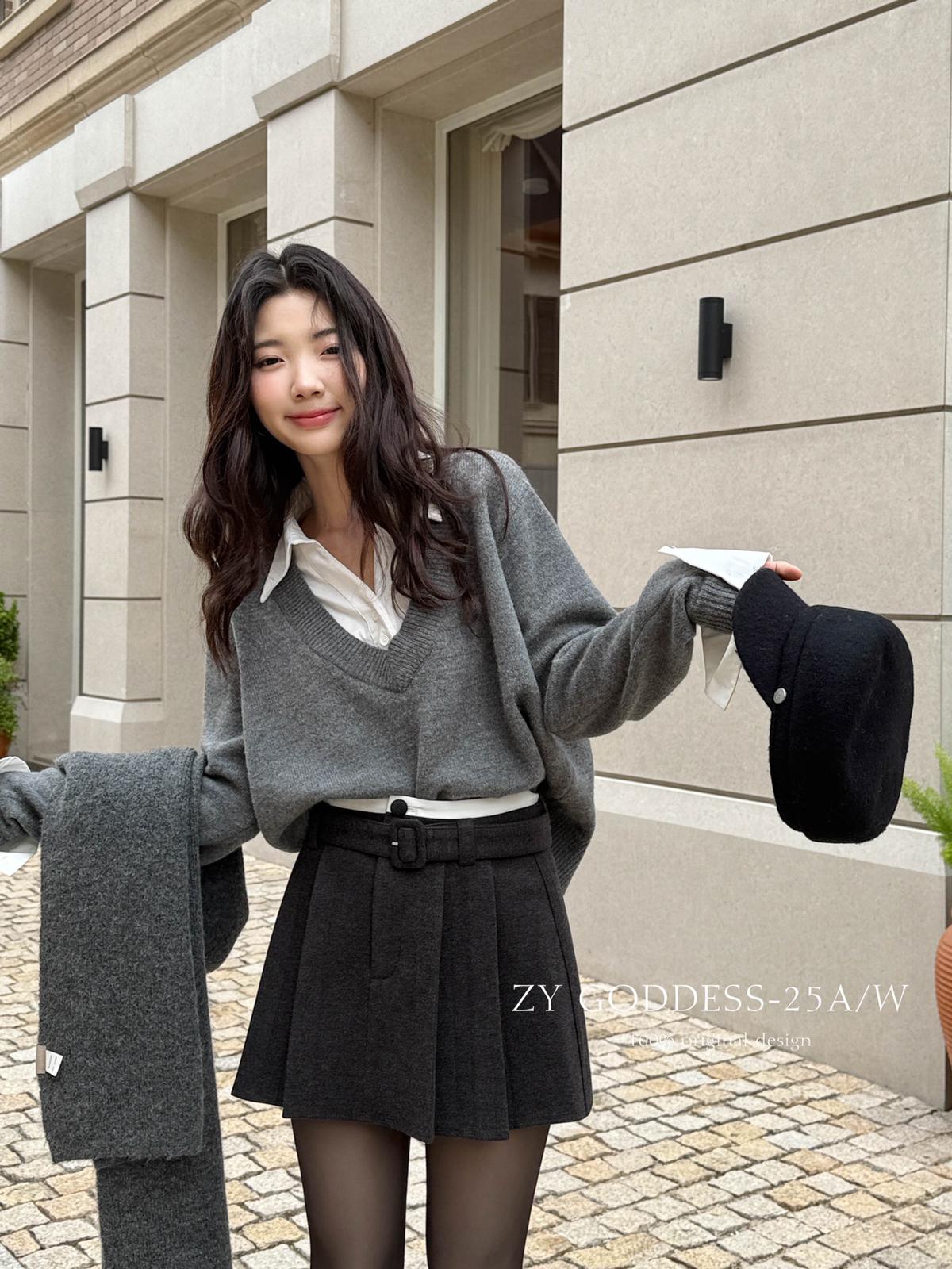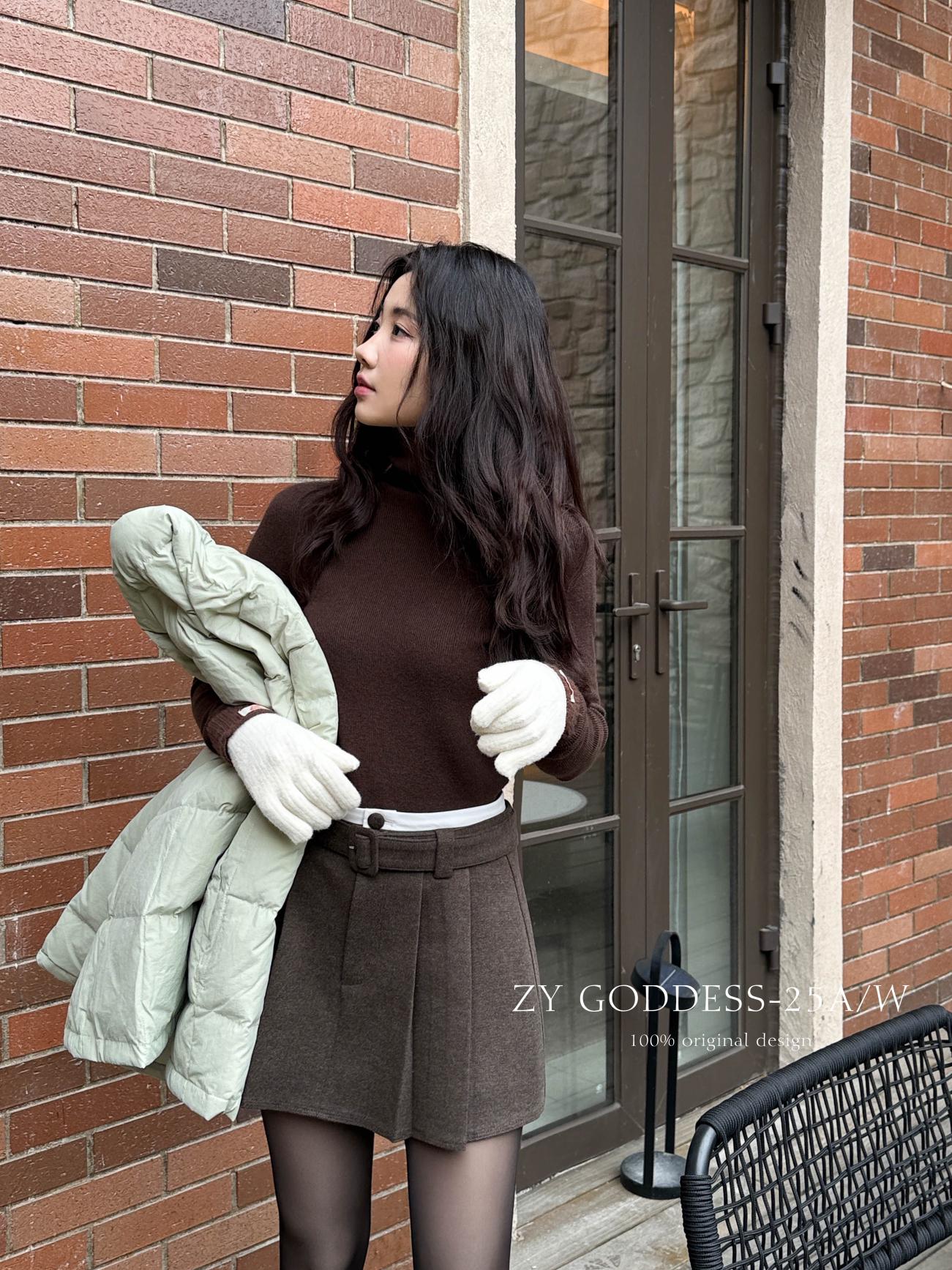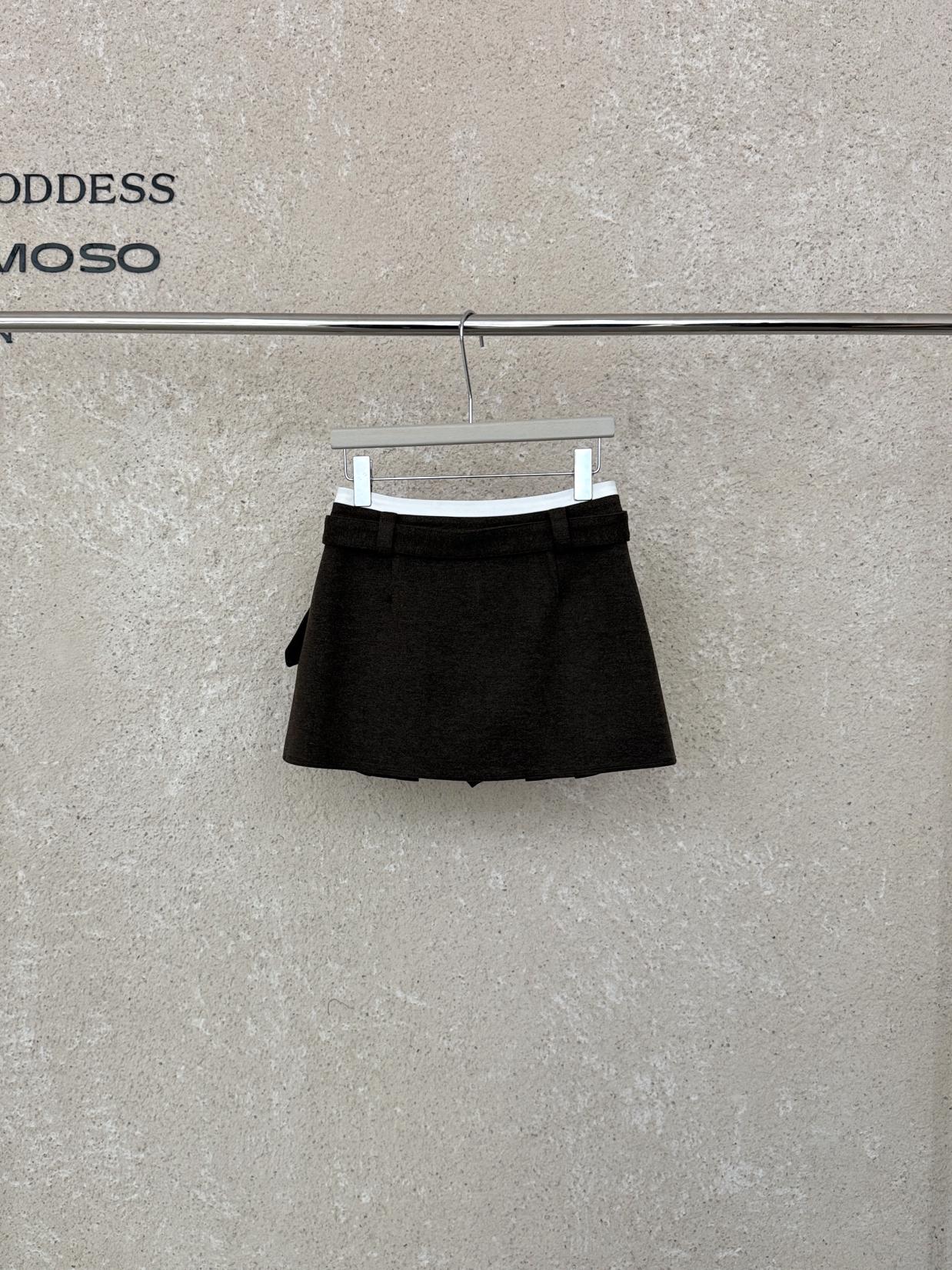 【C7917】韓系甜美學院風復古撞色拼接高腰顯瘦A字羊毛毛呢百褶短裙半身裙(配腰帶)(含10%羊毛)