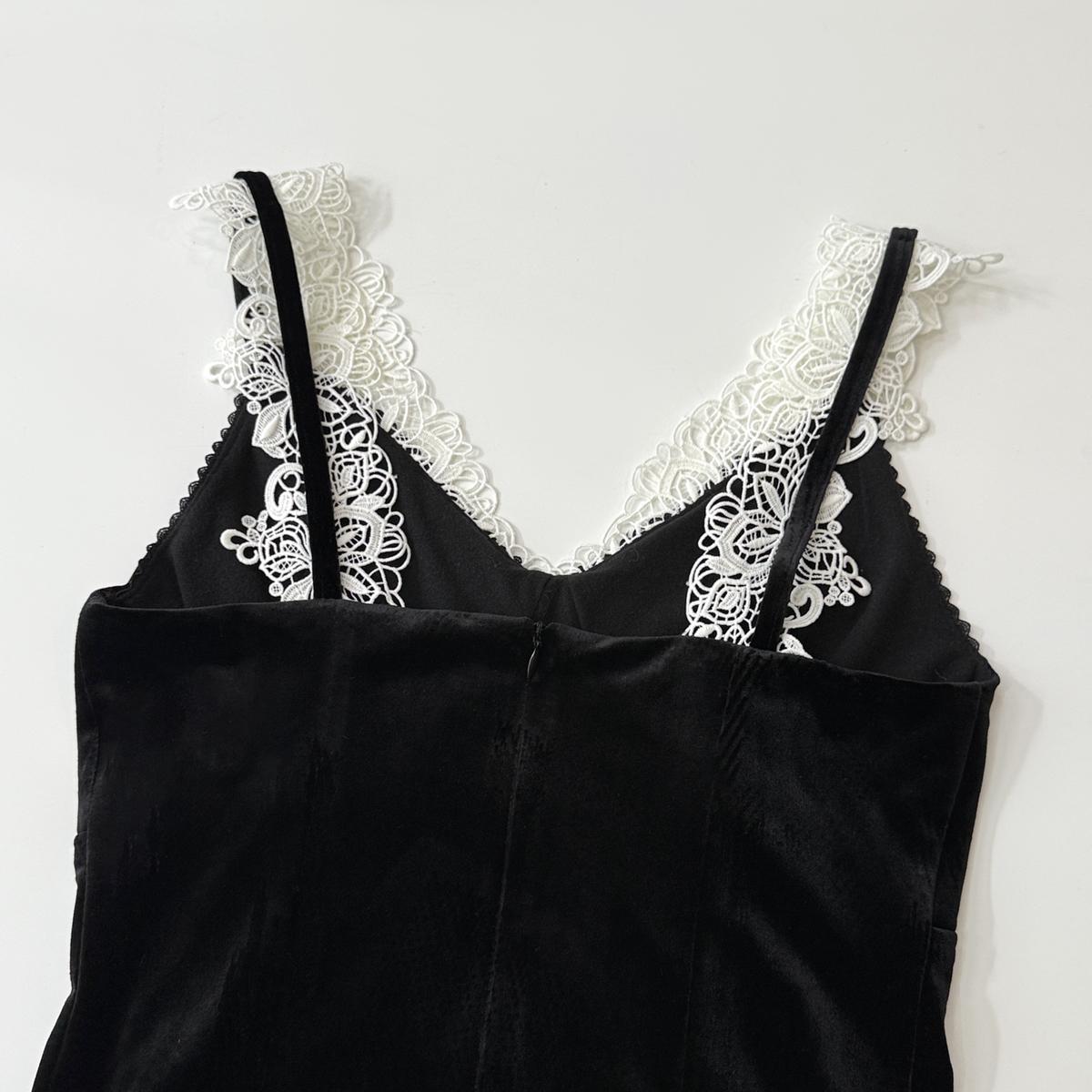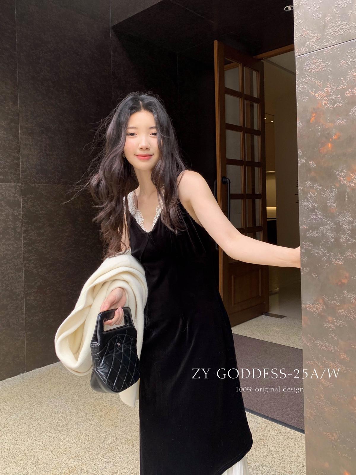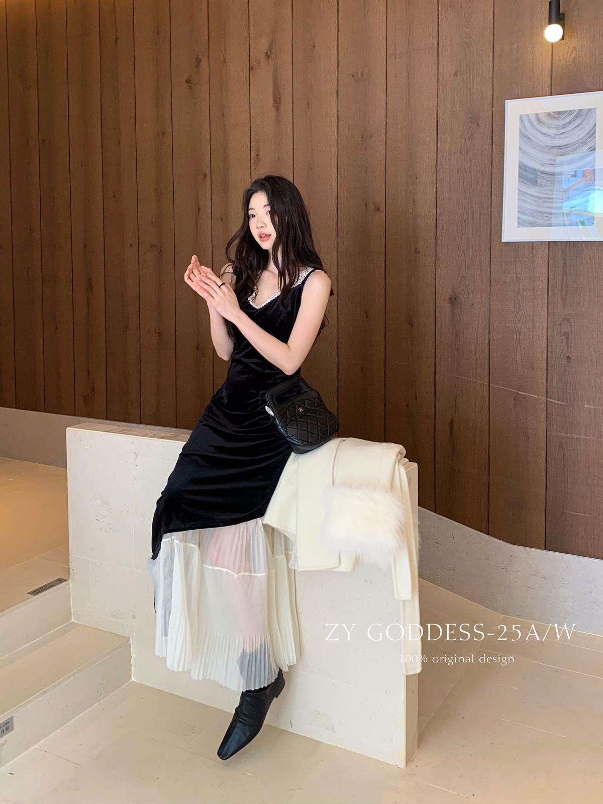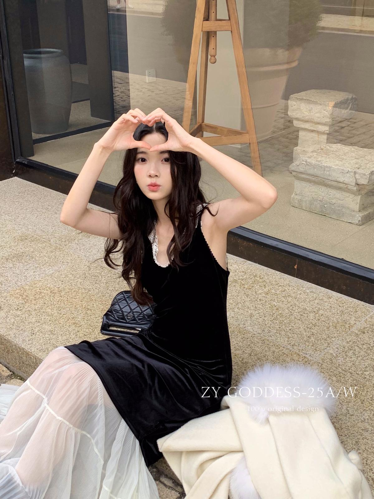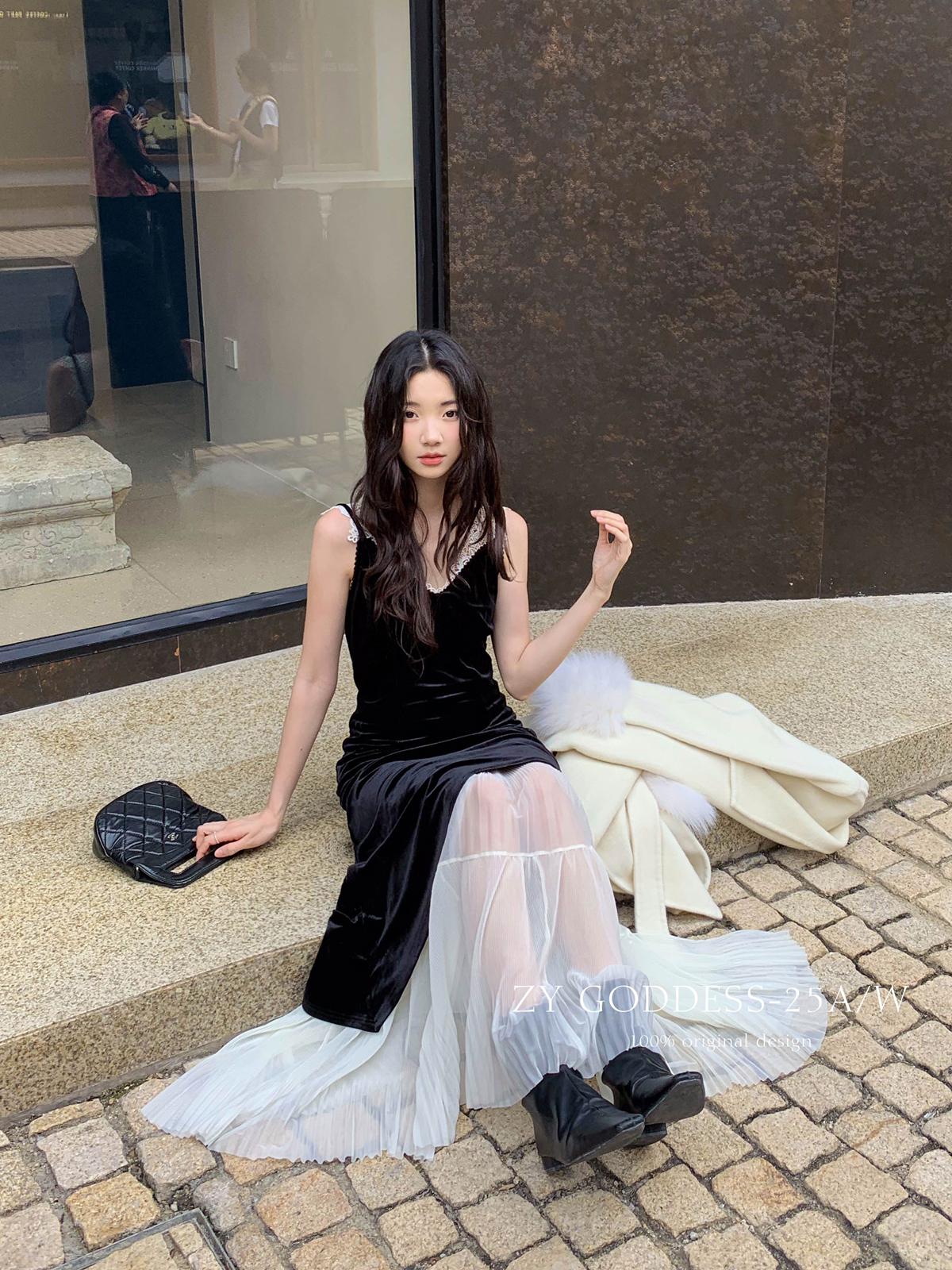 3. 【C7919】絕美女神裙~法式優雅V領絲絨拼接網紗蕾絲吊帶裙連衣裙(飄逸仙女裙~)