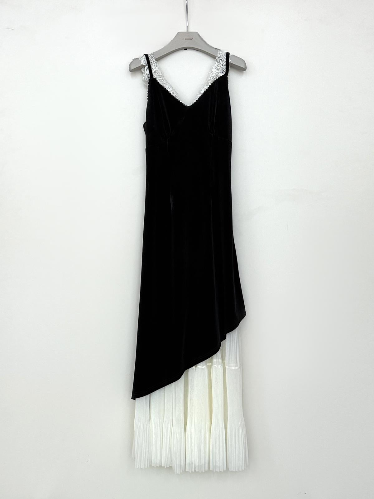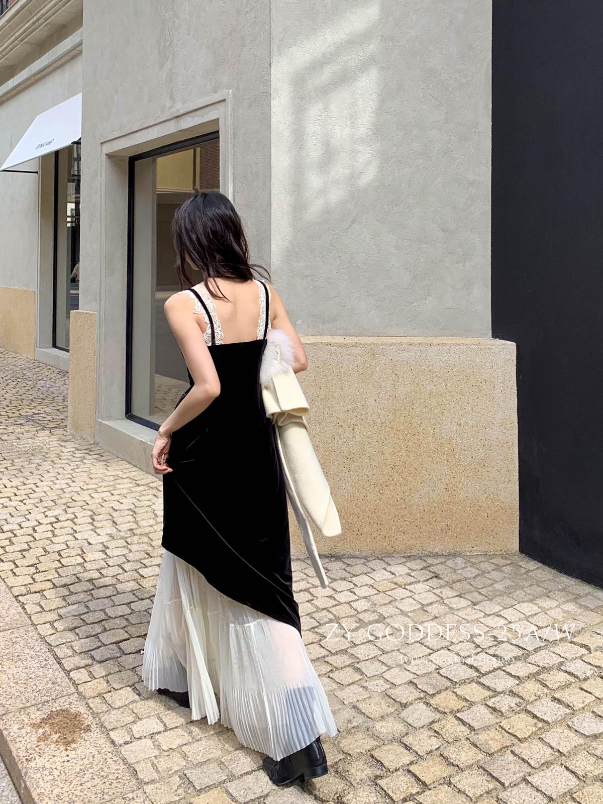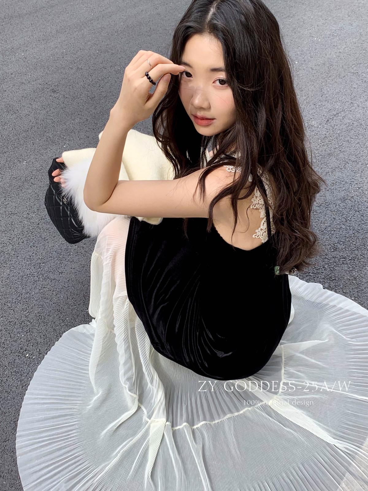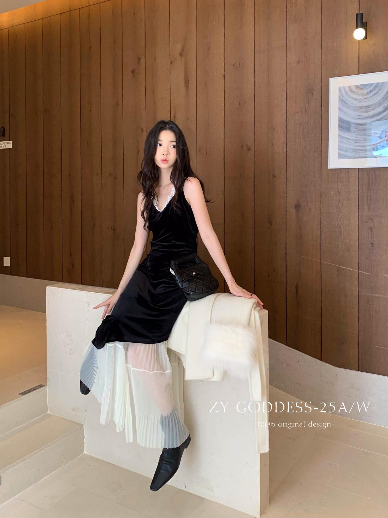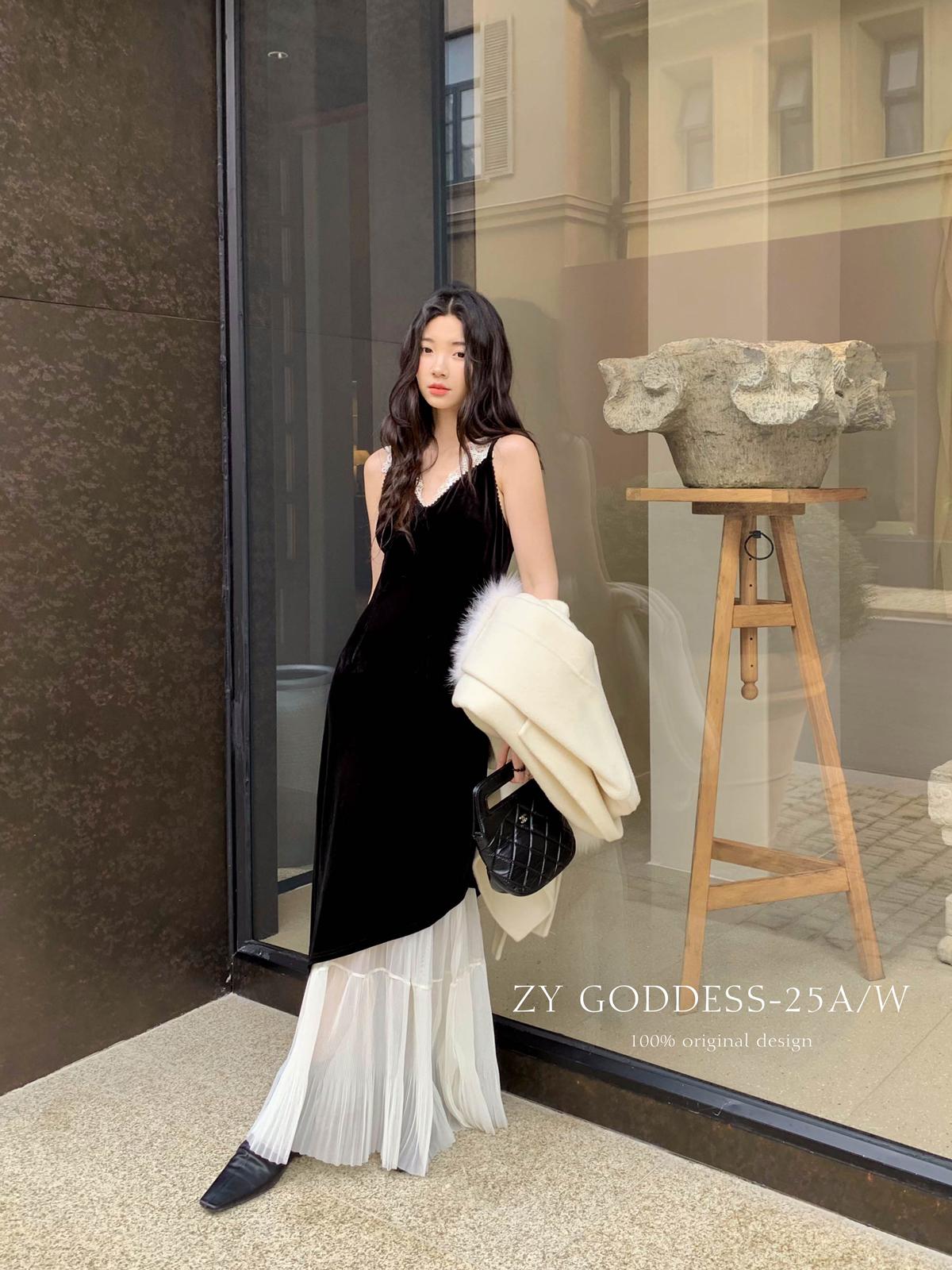 3. 【C7919】絕美女神裙~法式優雅V領絲絨拼接網紗蕾絲吊帶裙連衣裙(飄逸仙女裙~)