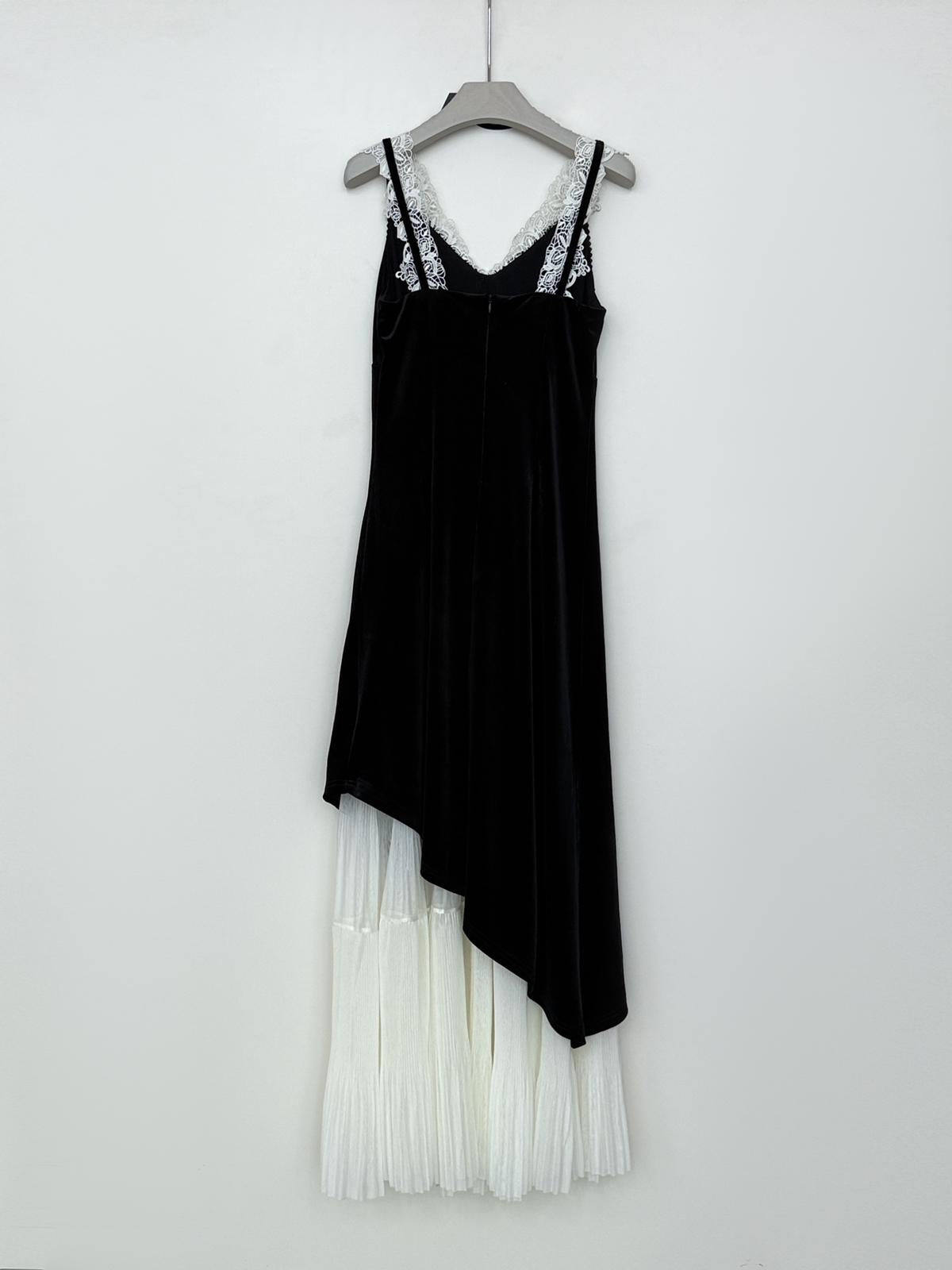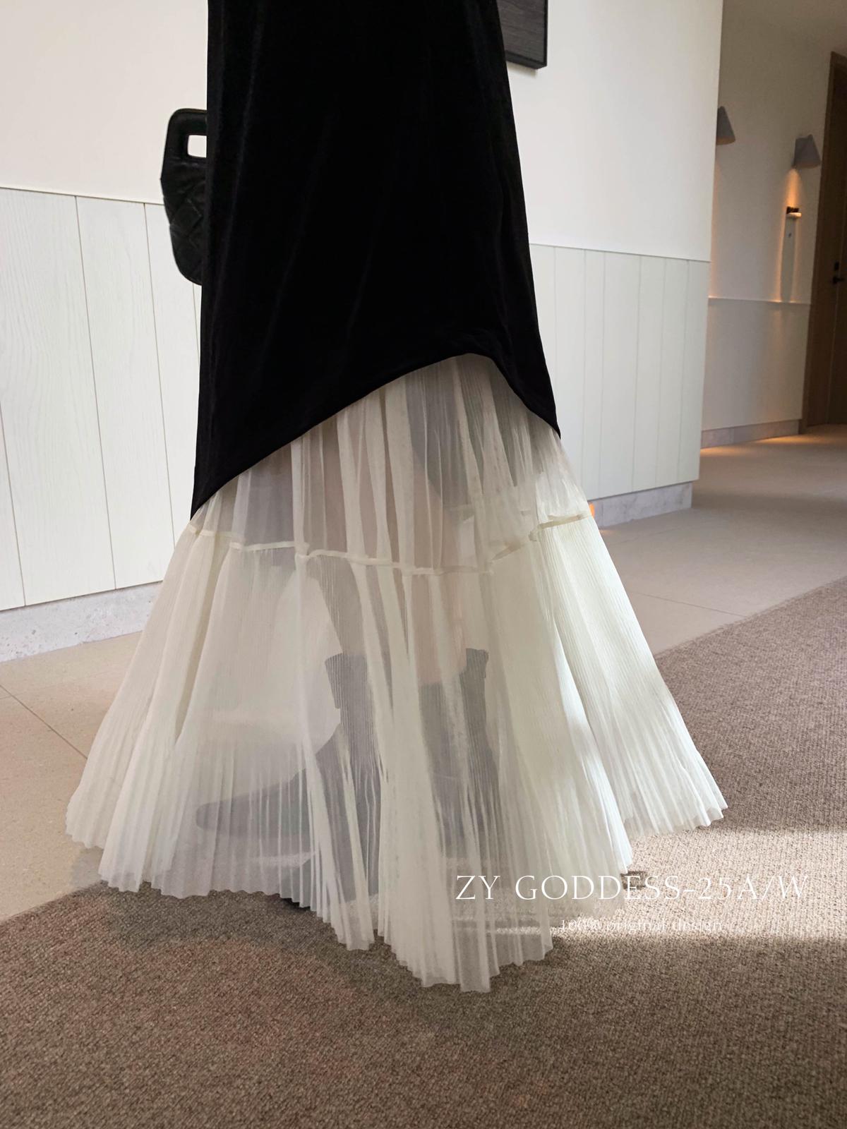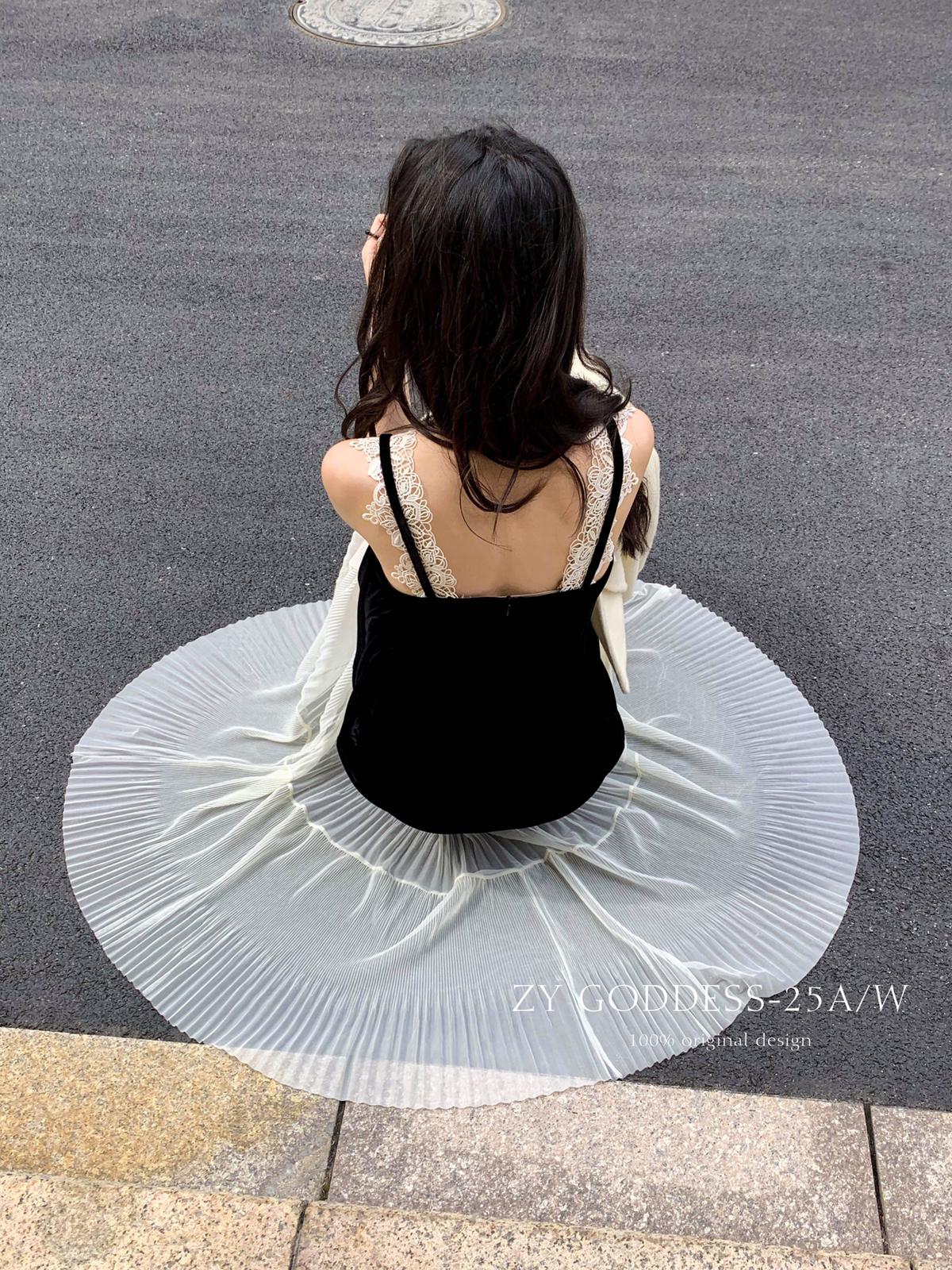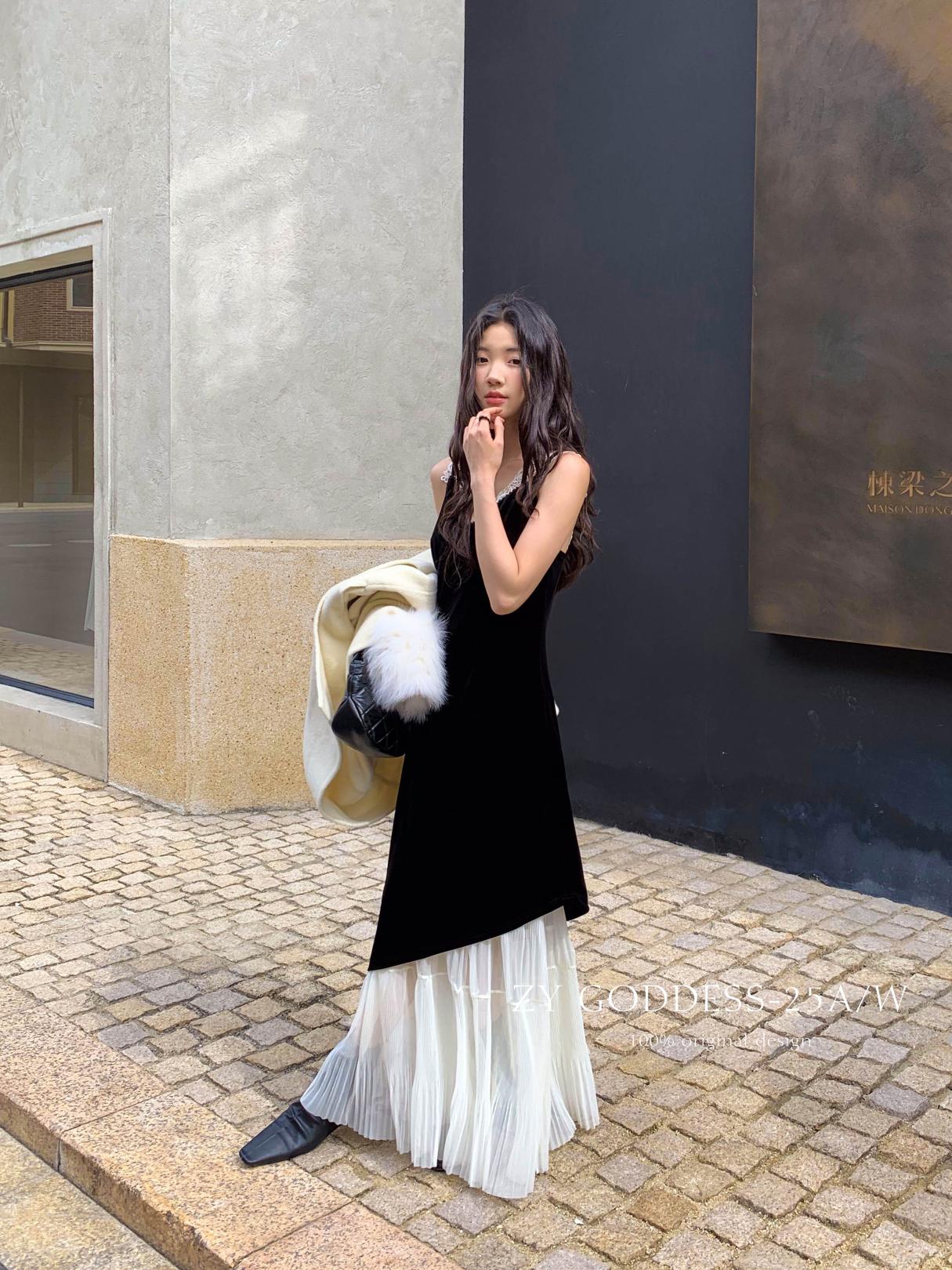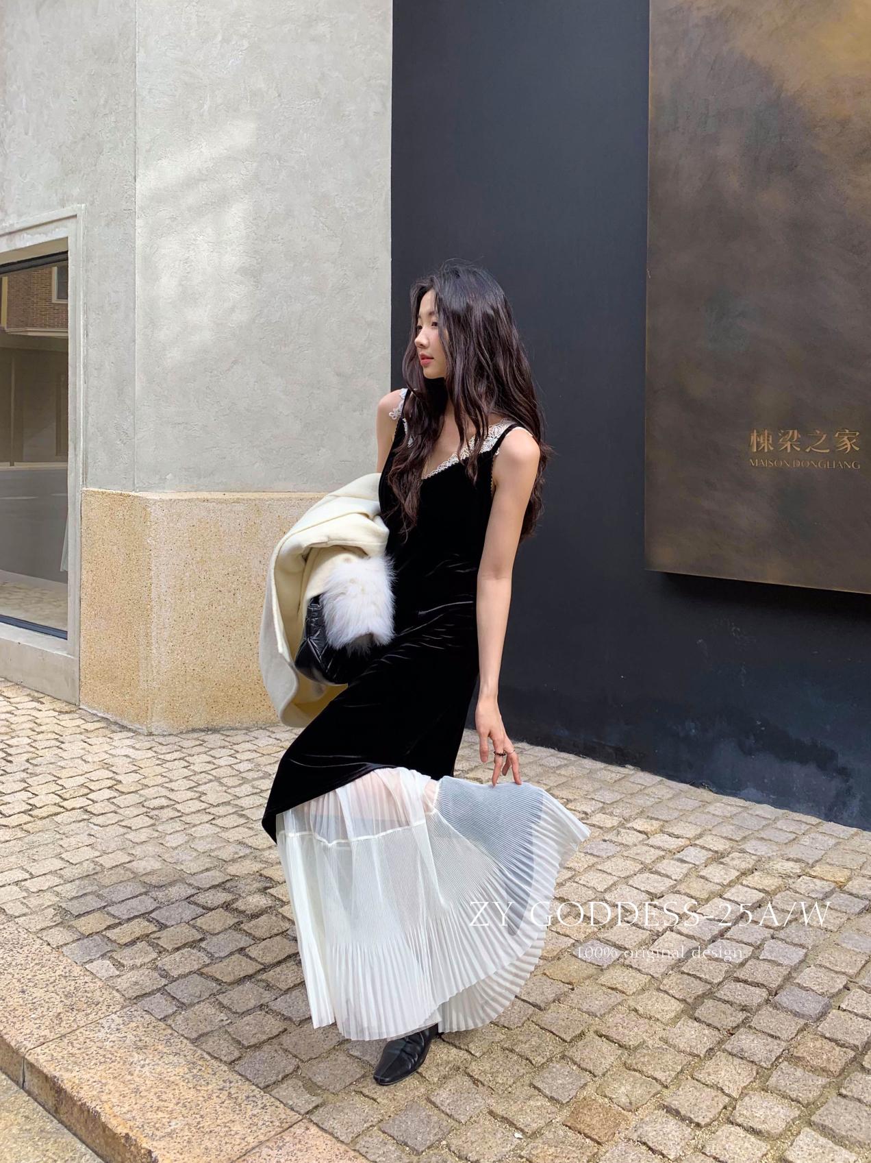 3. 【C7919】絕美女神裙~法式優雅V領絲絨拼接網紗蕾絲吊帶裙連衣裙(飄逸仙女裙~)