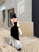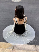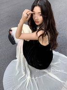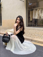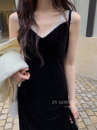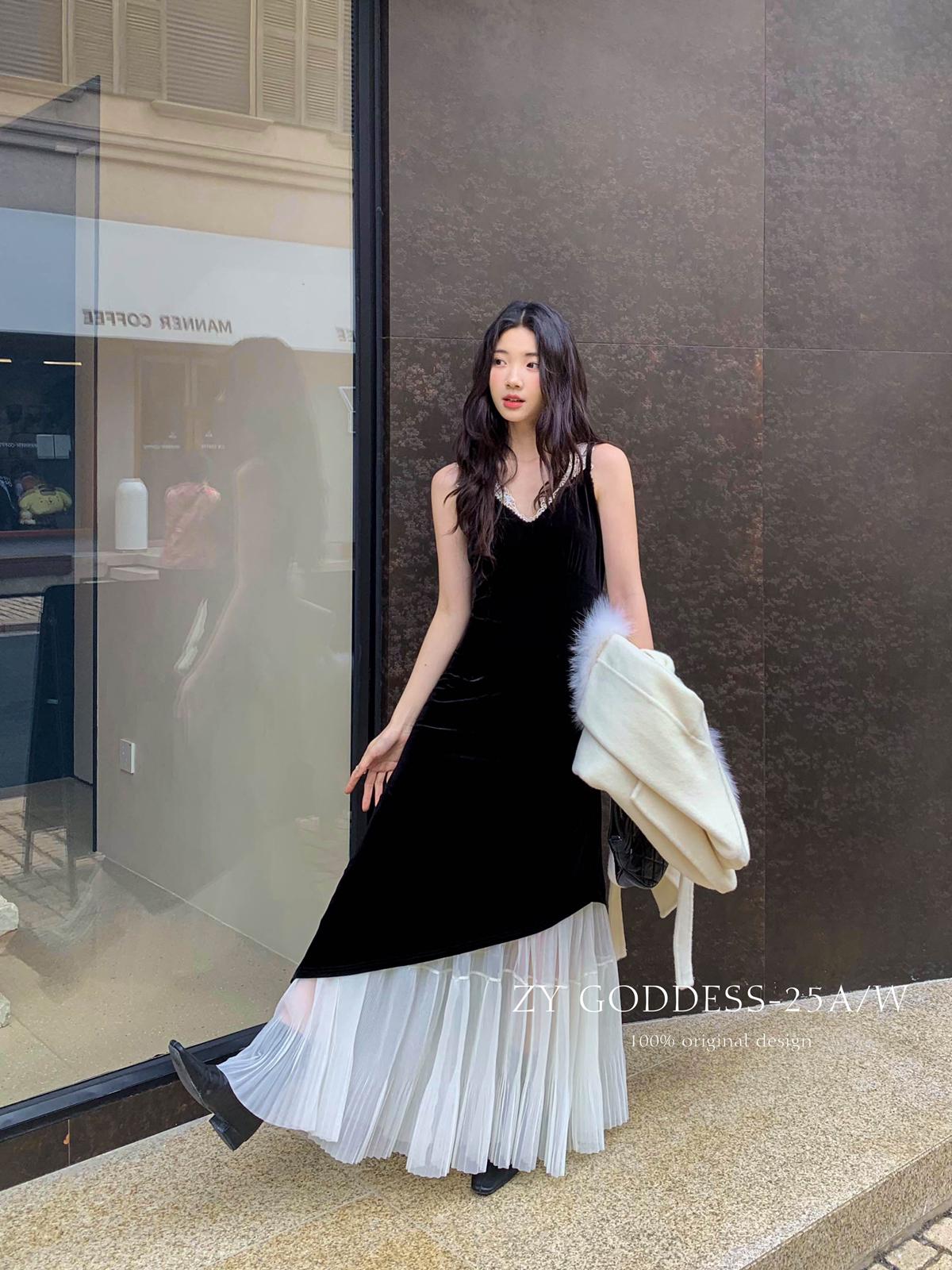 【C7919】絕美女神裙~法式優雅V領絲絨拼接網紗蕾絲吊帶裙連衣裙(飄逸仙女裙~)