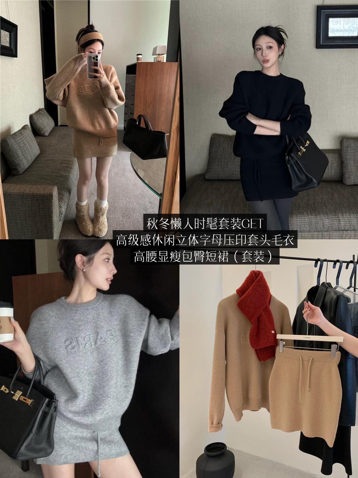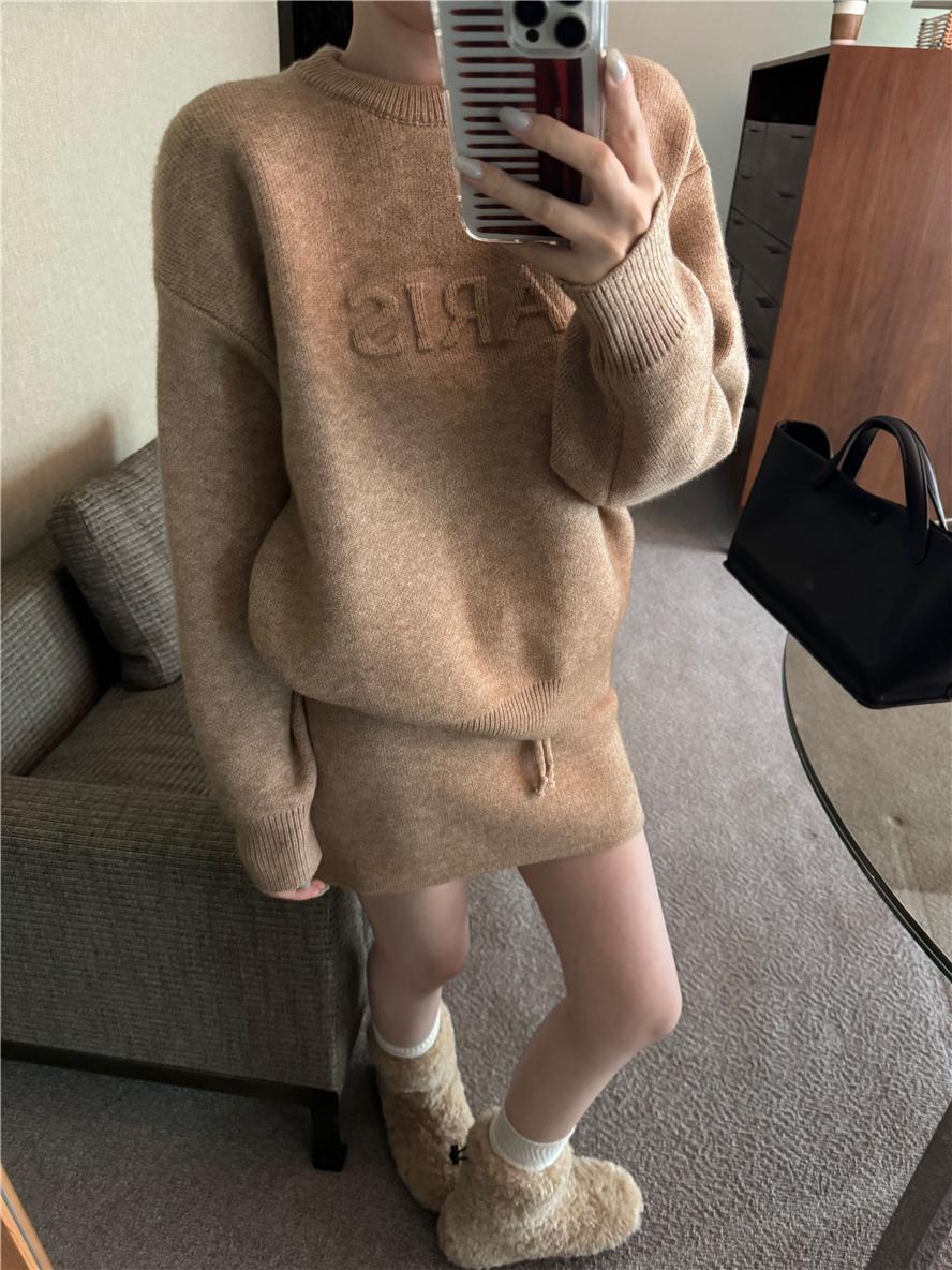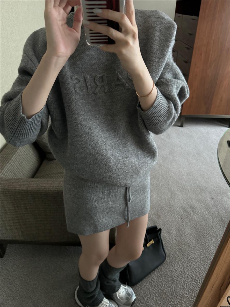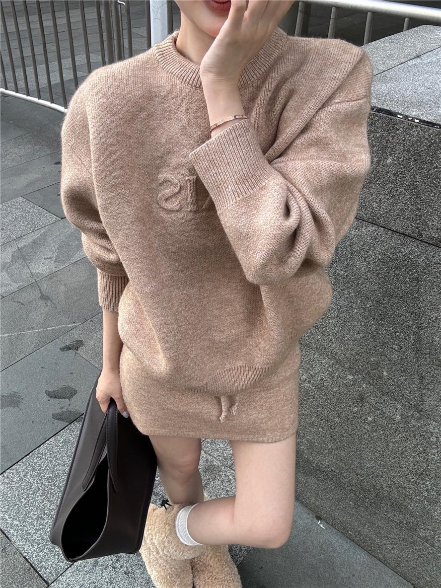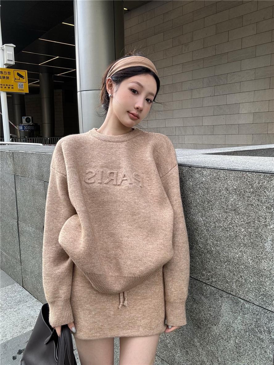 【C7920】高級感休閒立體字母壓印套頭毛衣+高腰顯瘦包臀短裙套裝
