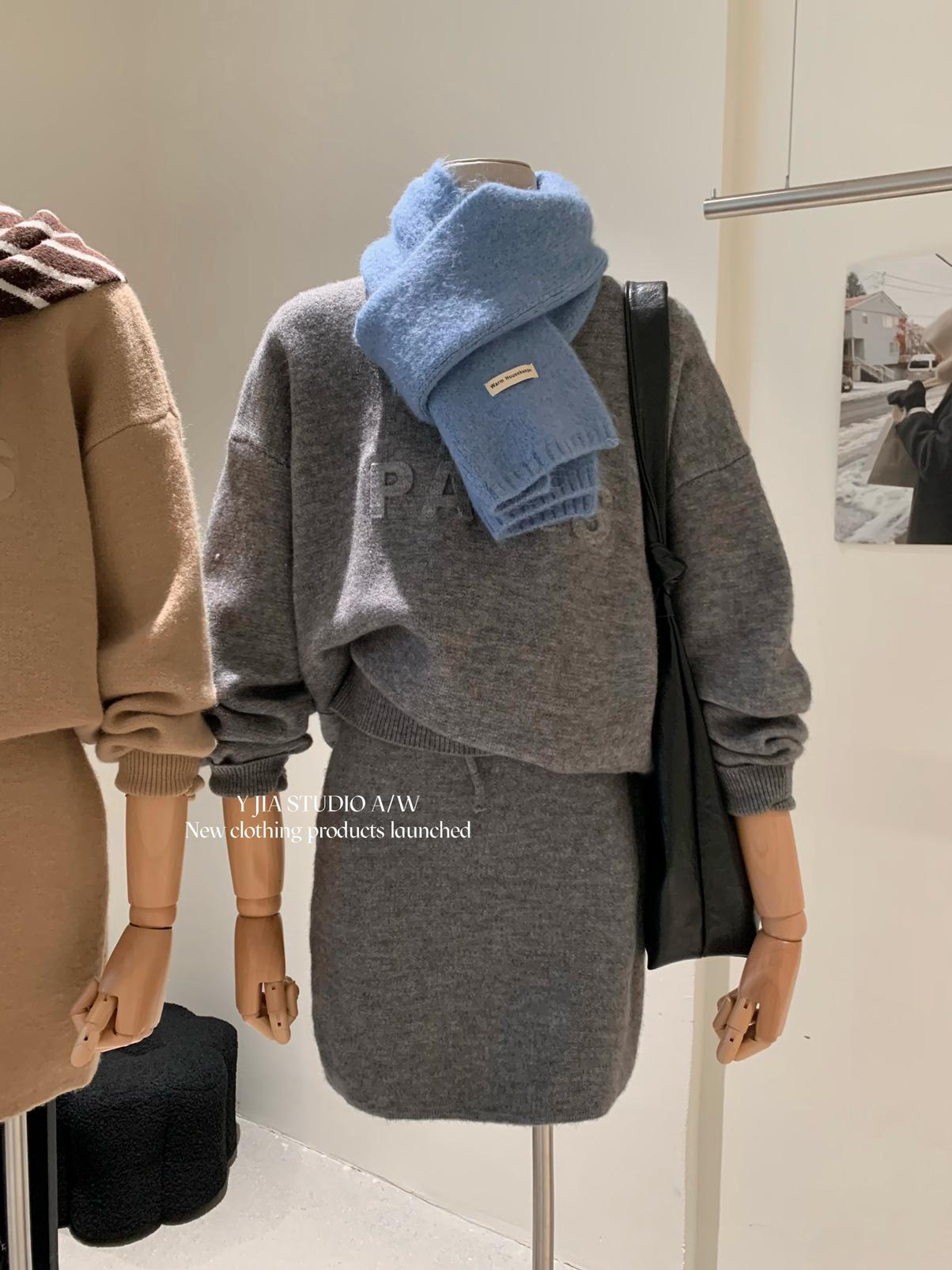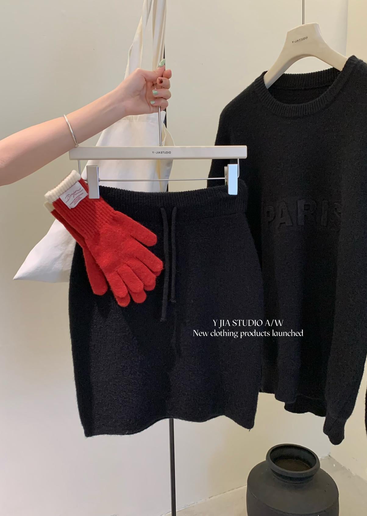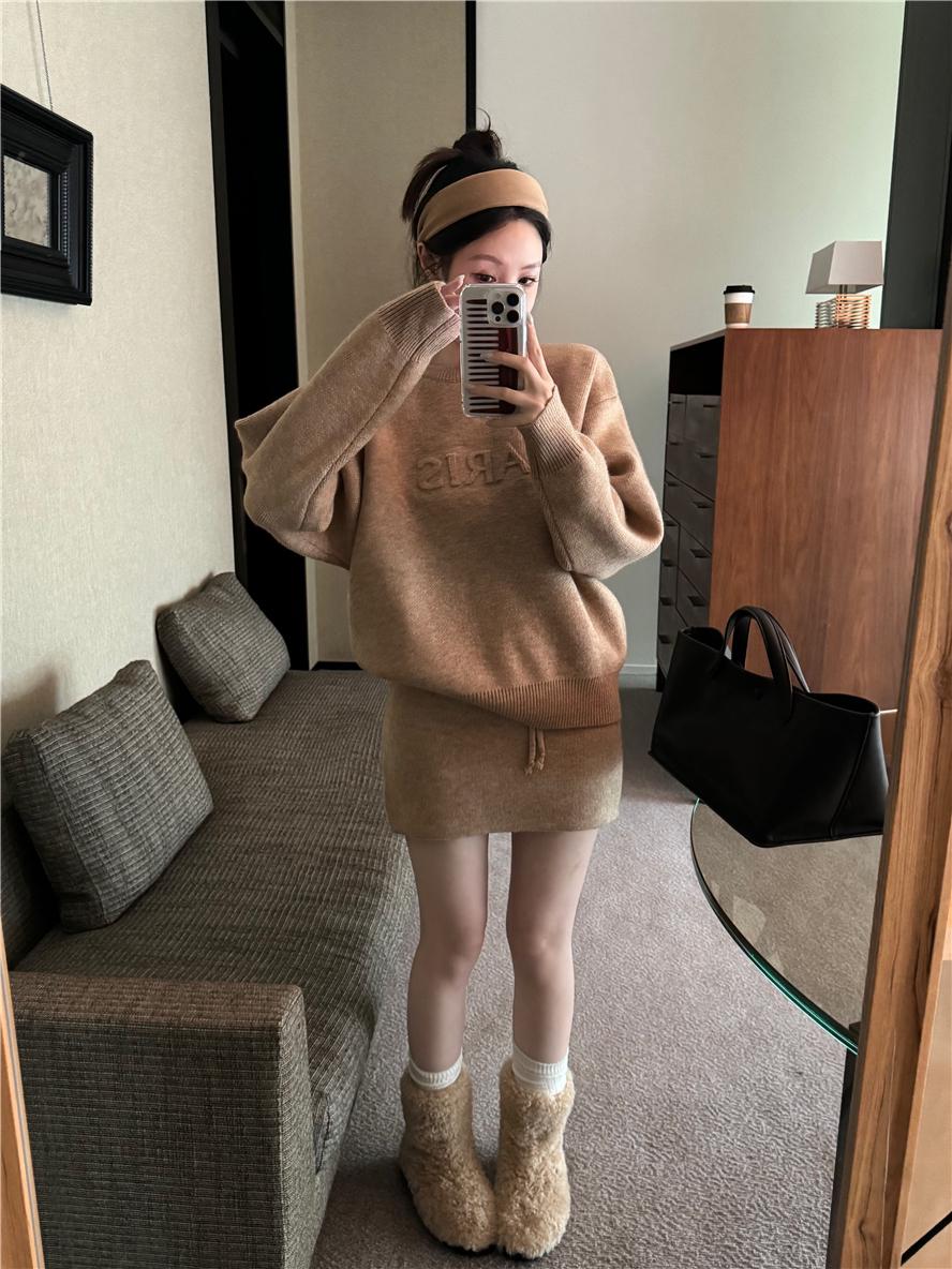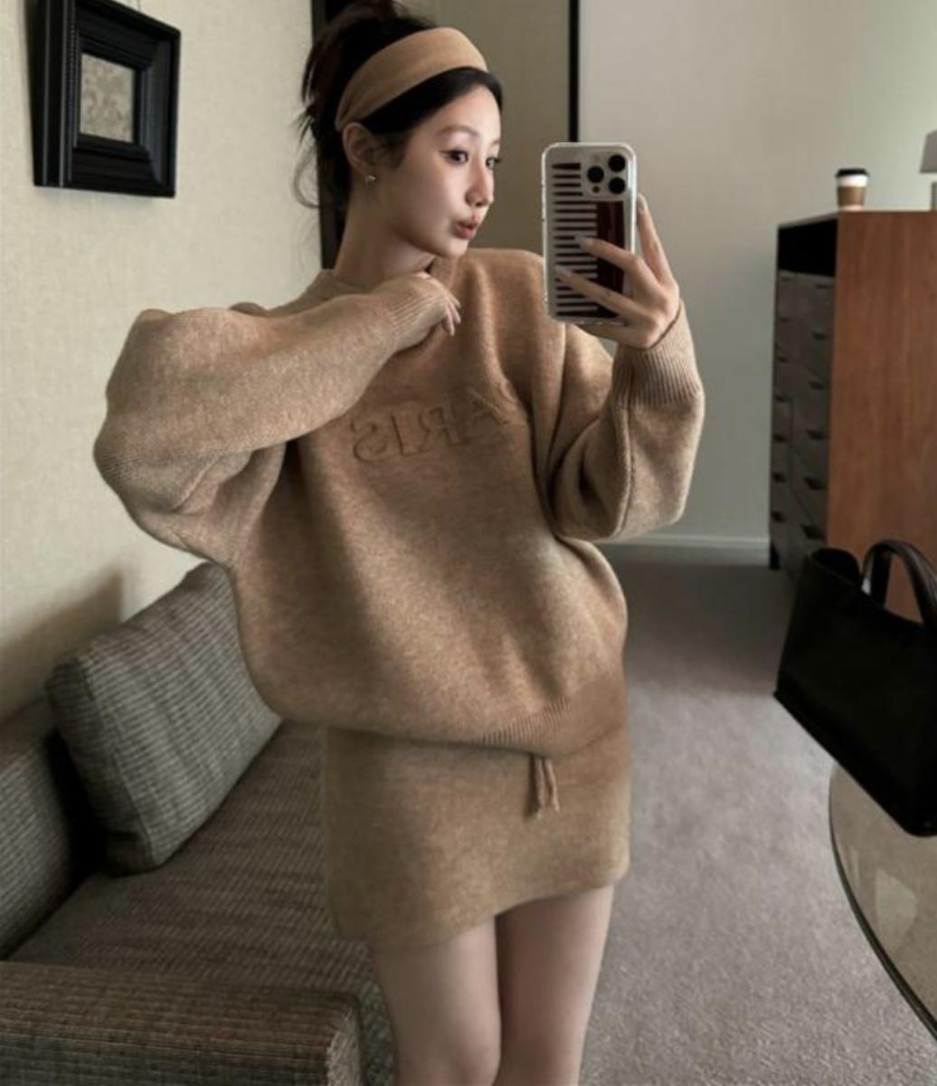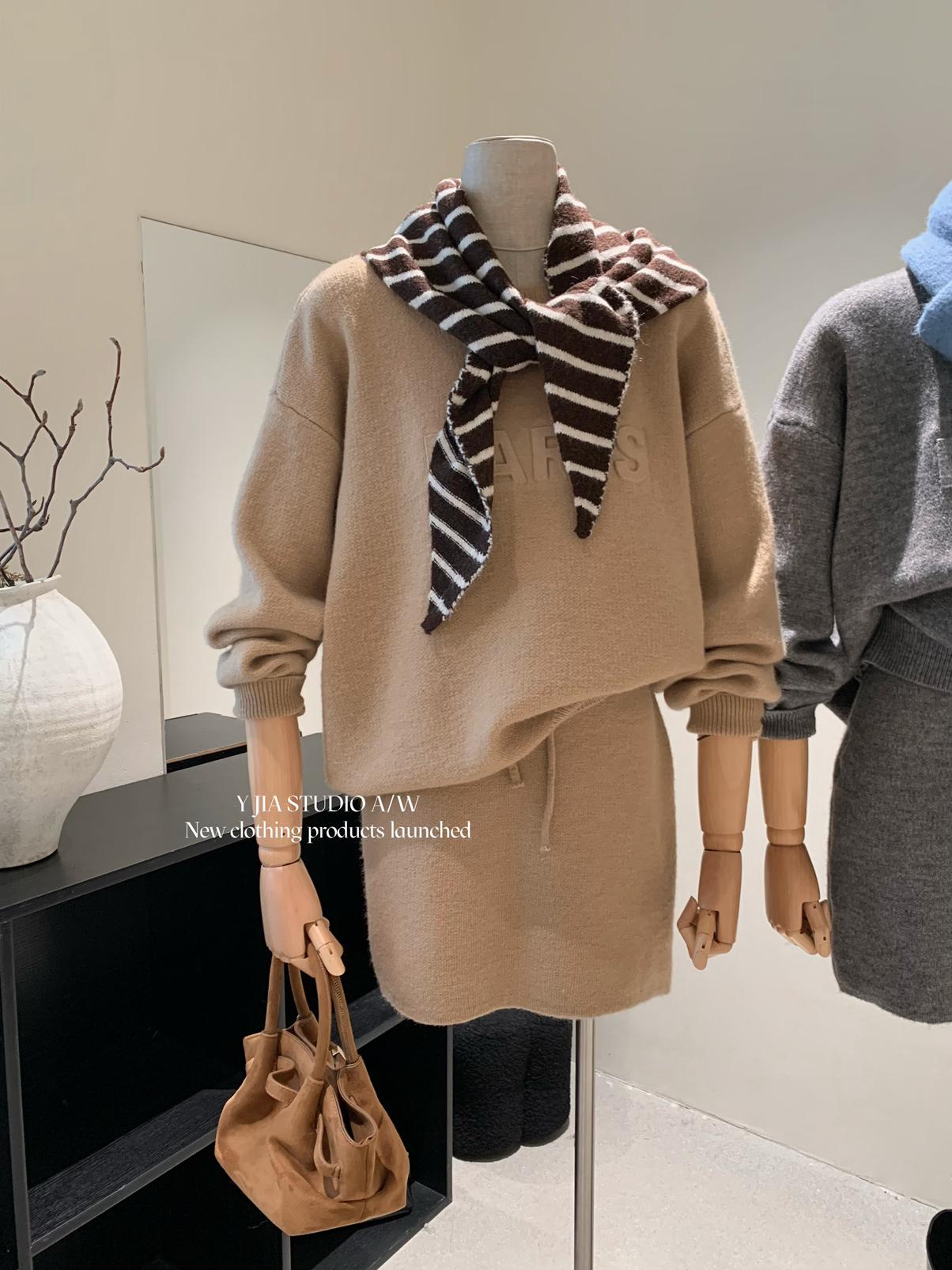 【C7920】高級感休閒立體字母壓印套頭毛衣+高腰顯瘦包臀短裙套裝