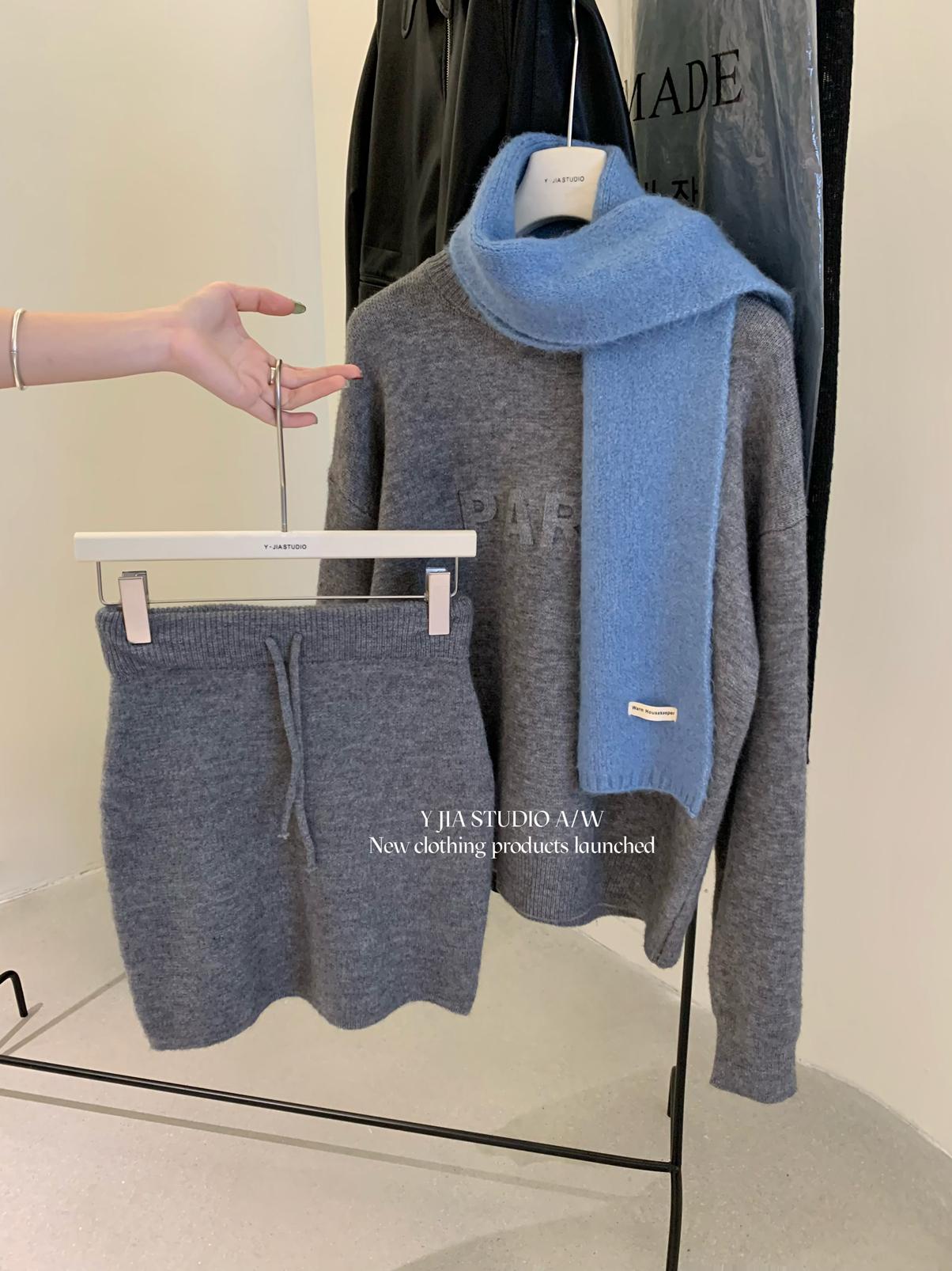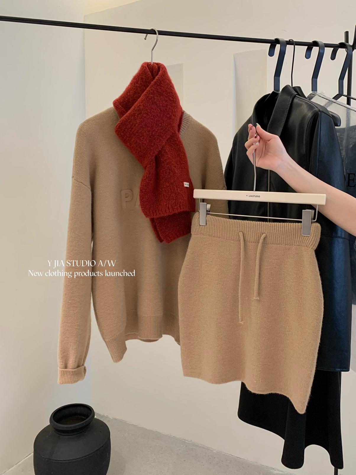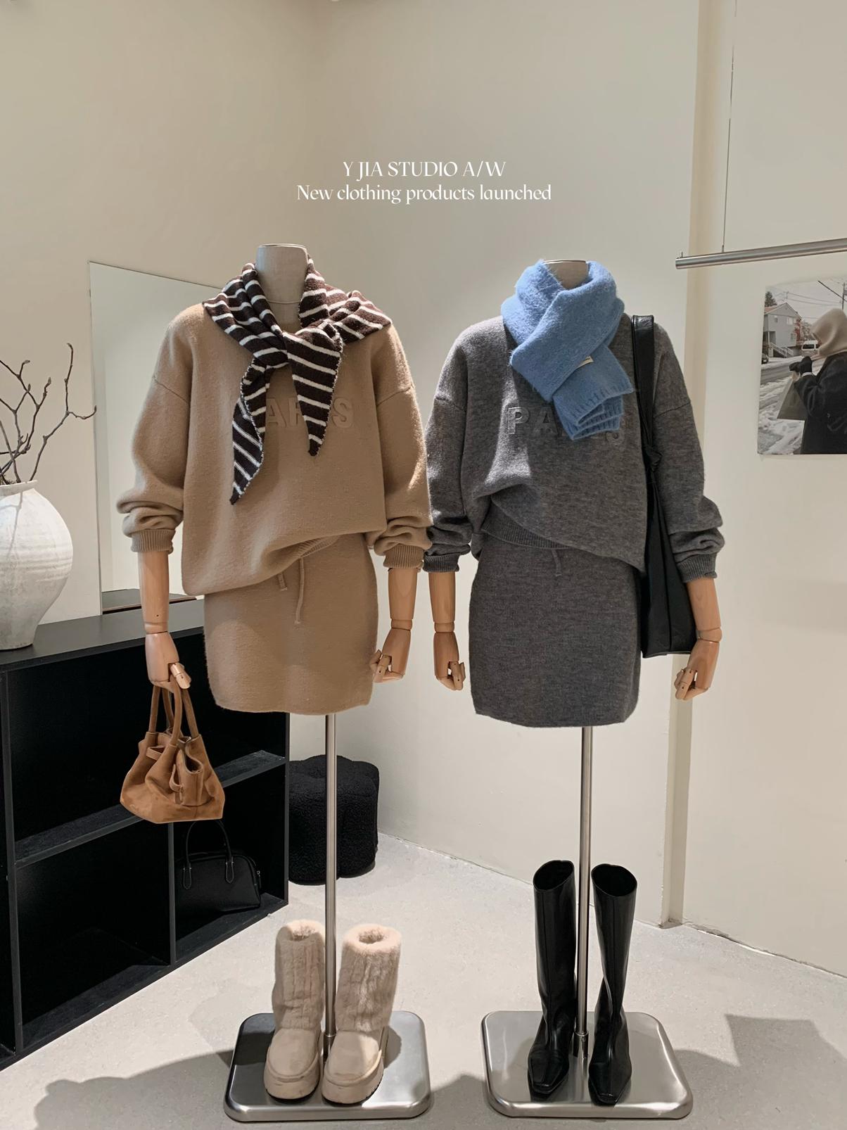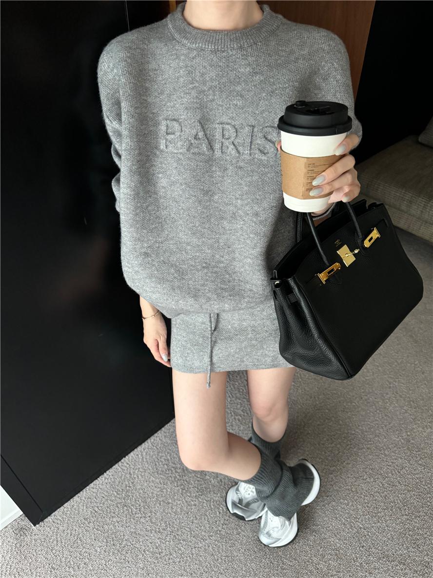 【C7920】高級感休閒立體字母壓印套頭毛衣+高腰顯瘦包臀短裙套裝