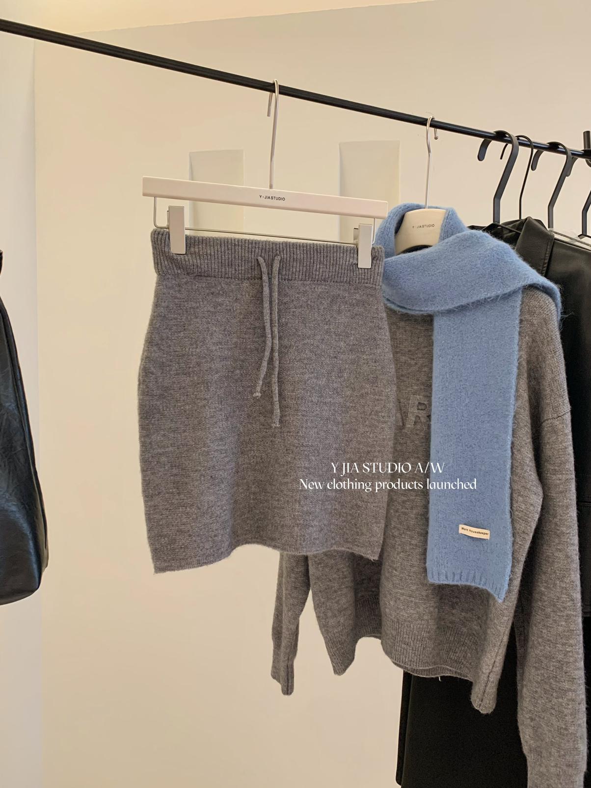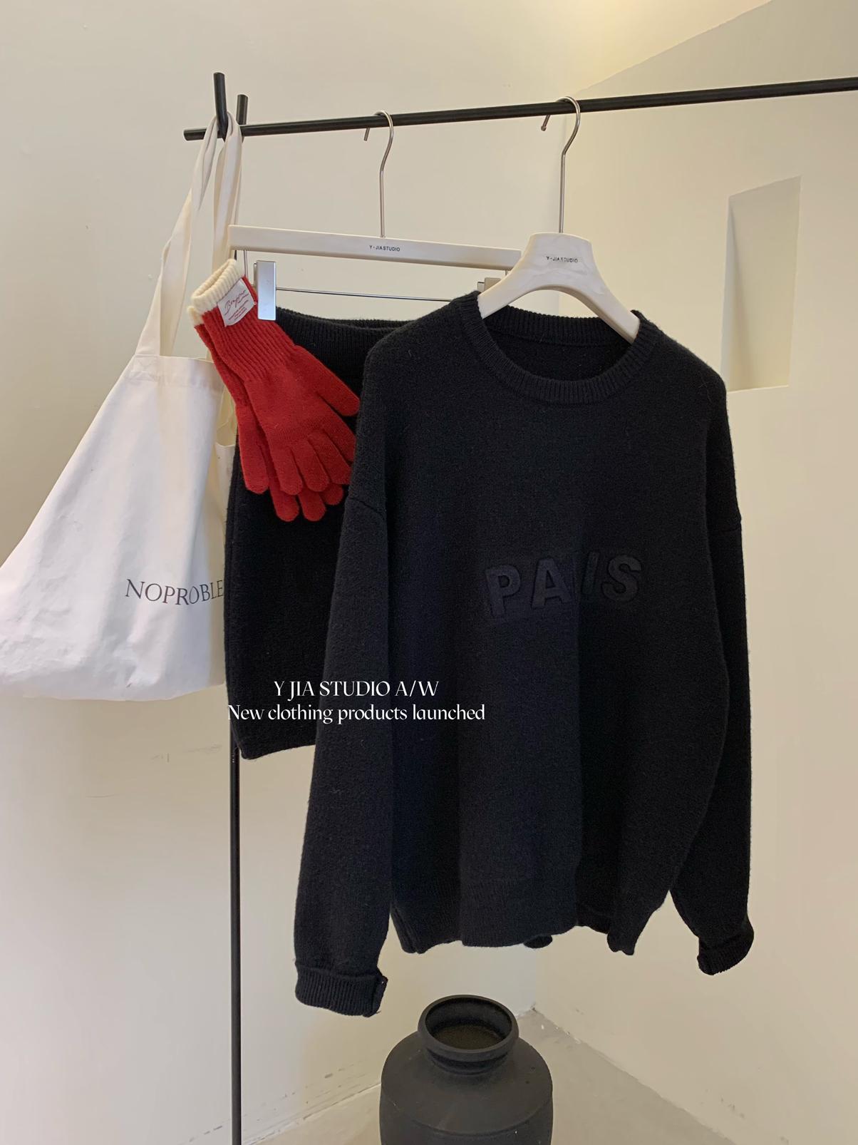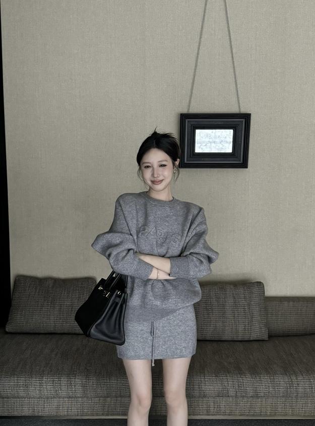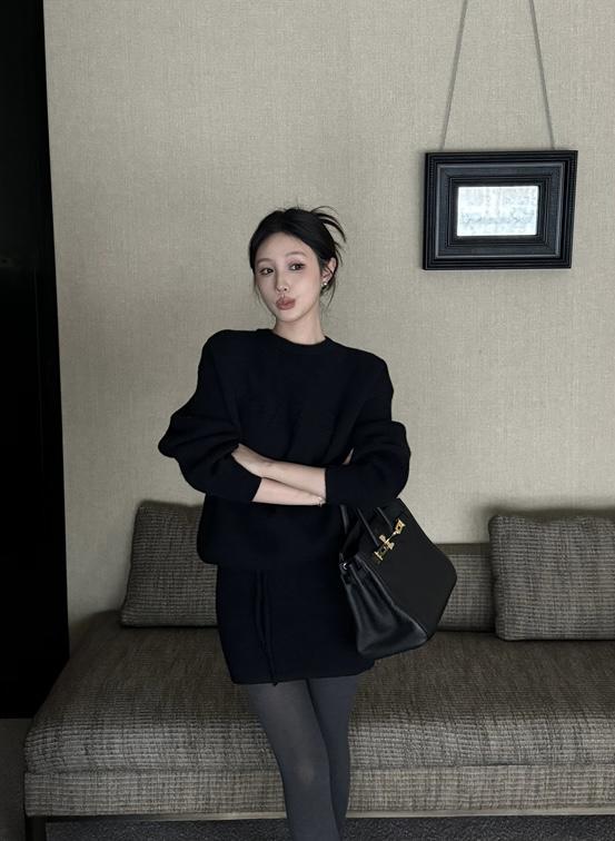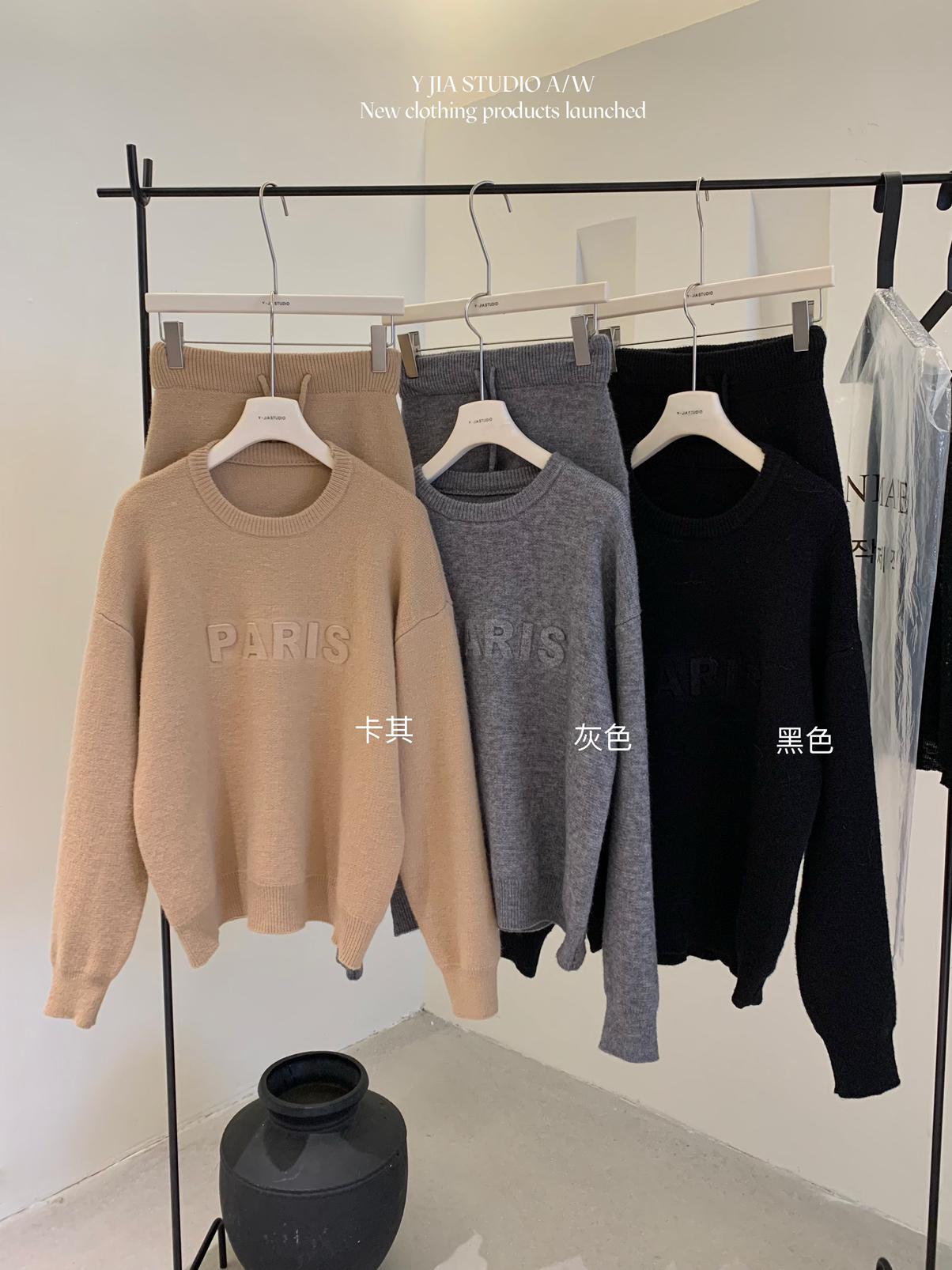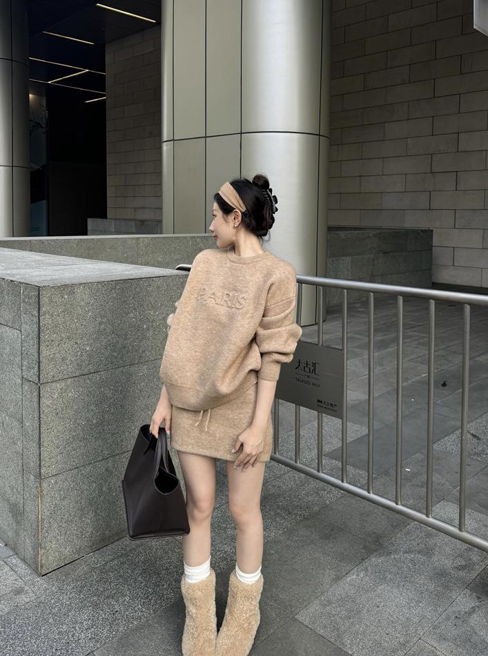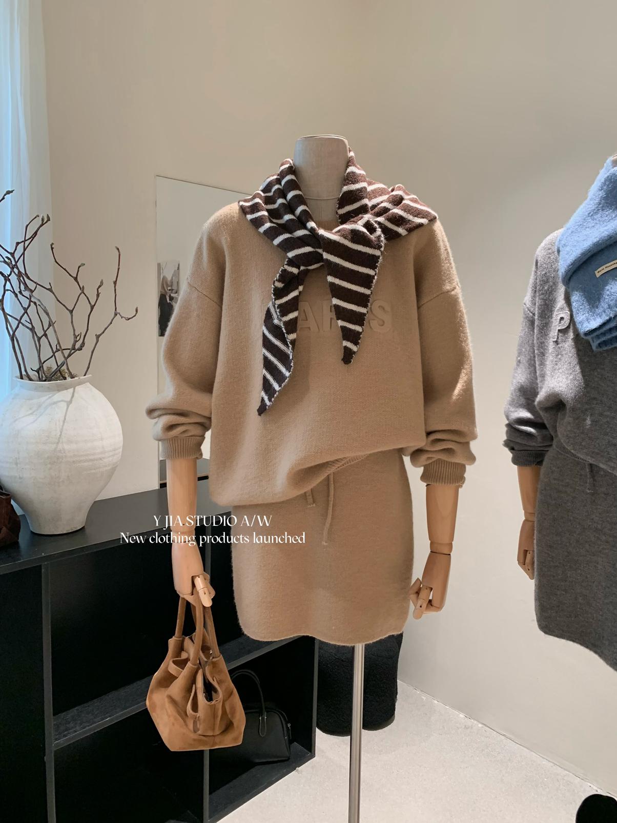 【C7920】高級感休閒立體字母壓印套頭毛衣+高腰顯瘦包臀短裙套裝
