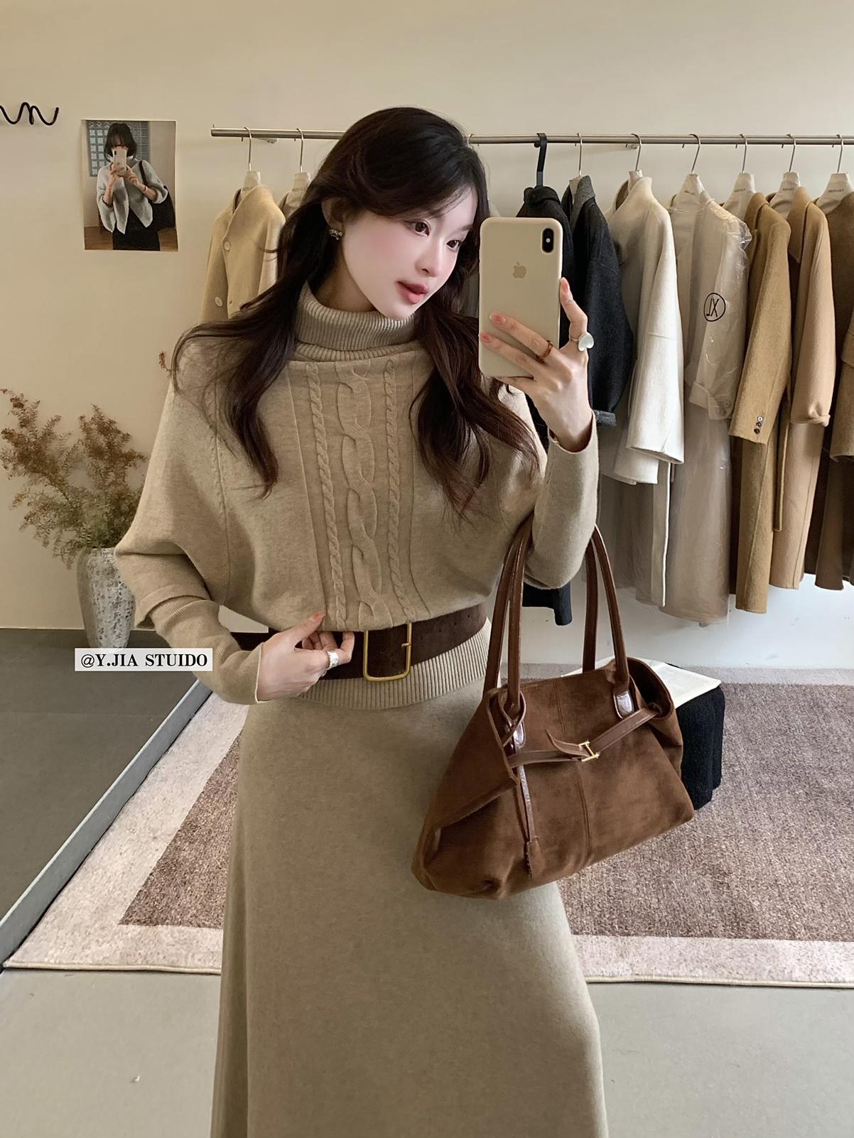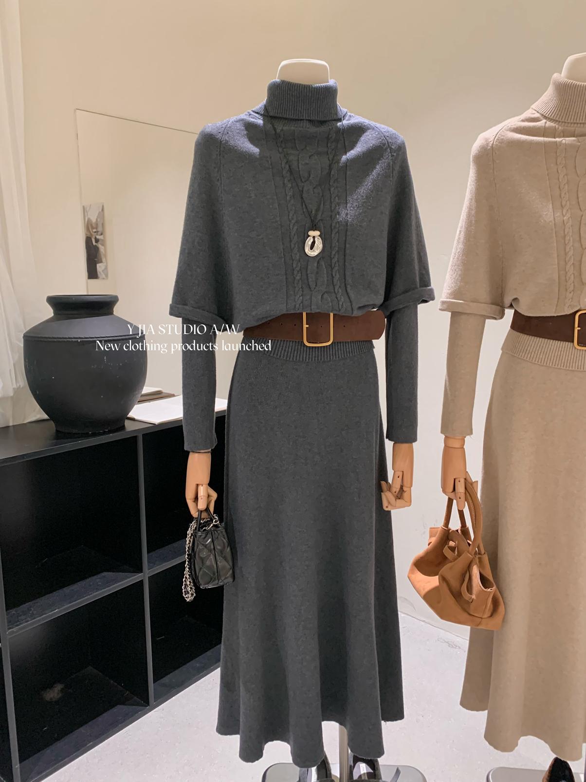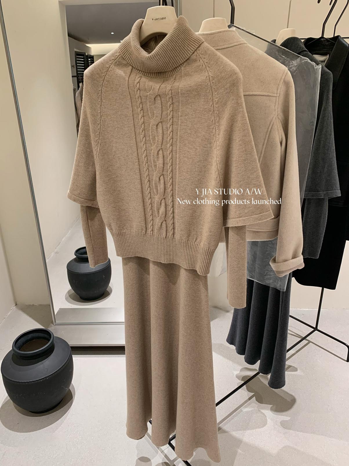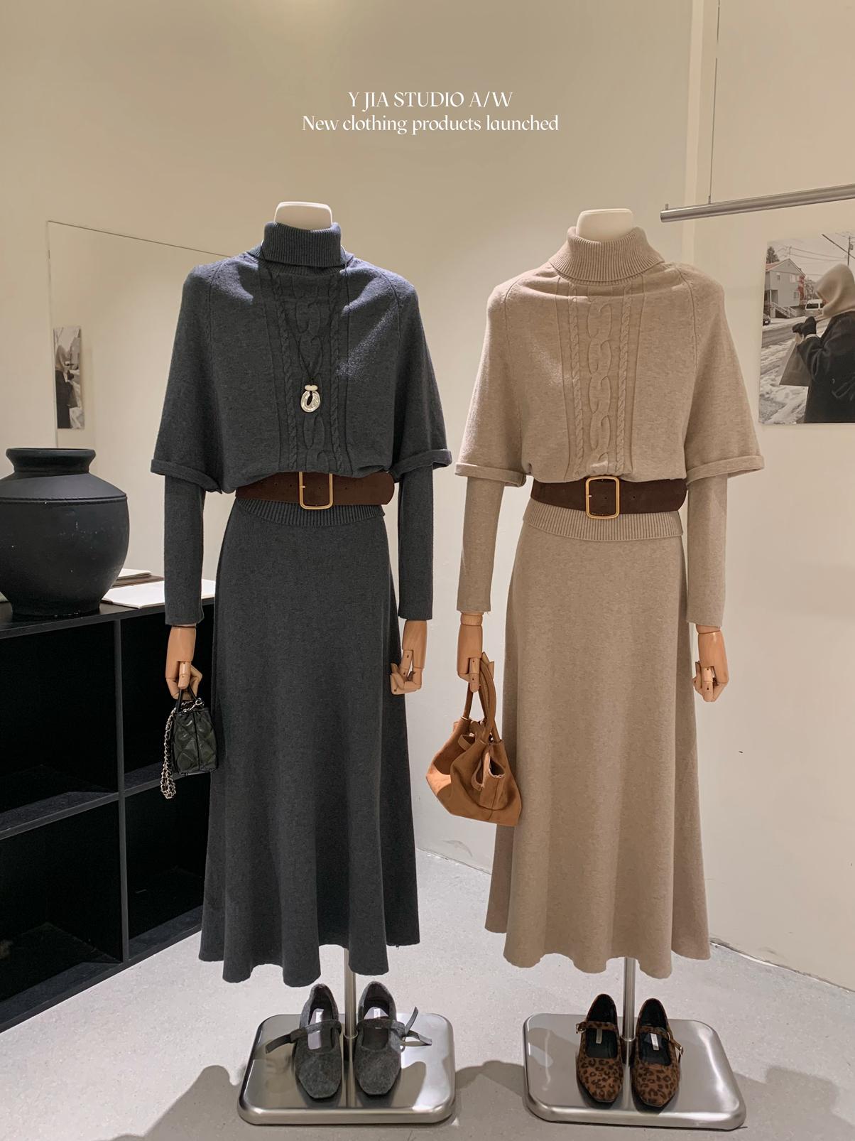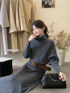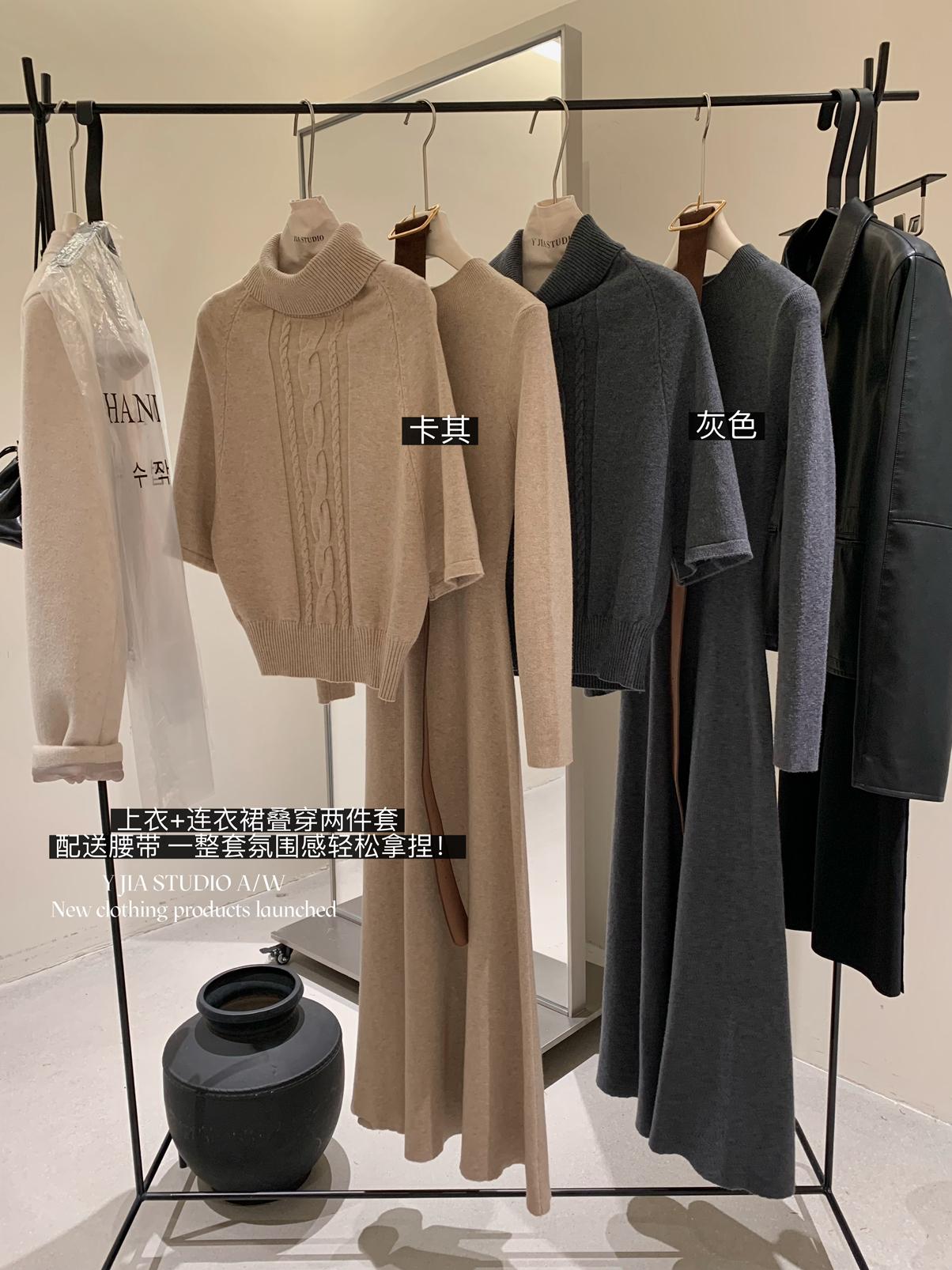 【C7945】慵懶風,高領麻花短袖針織毛衣+疊穿長袖長款連衣裙套裝(配腰帶)
