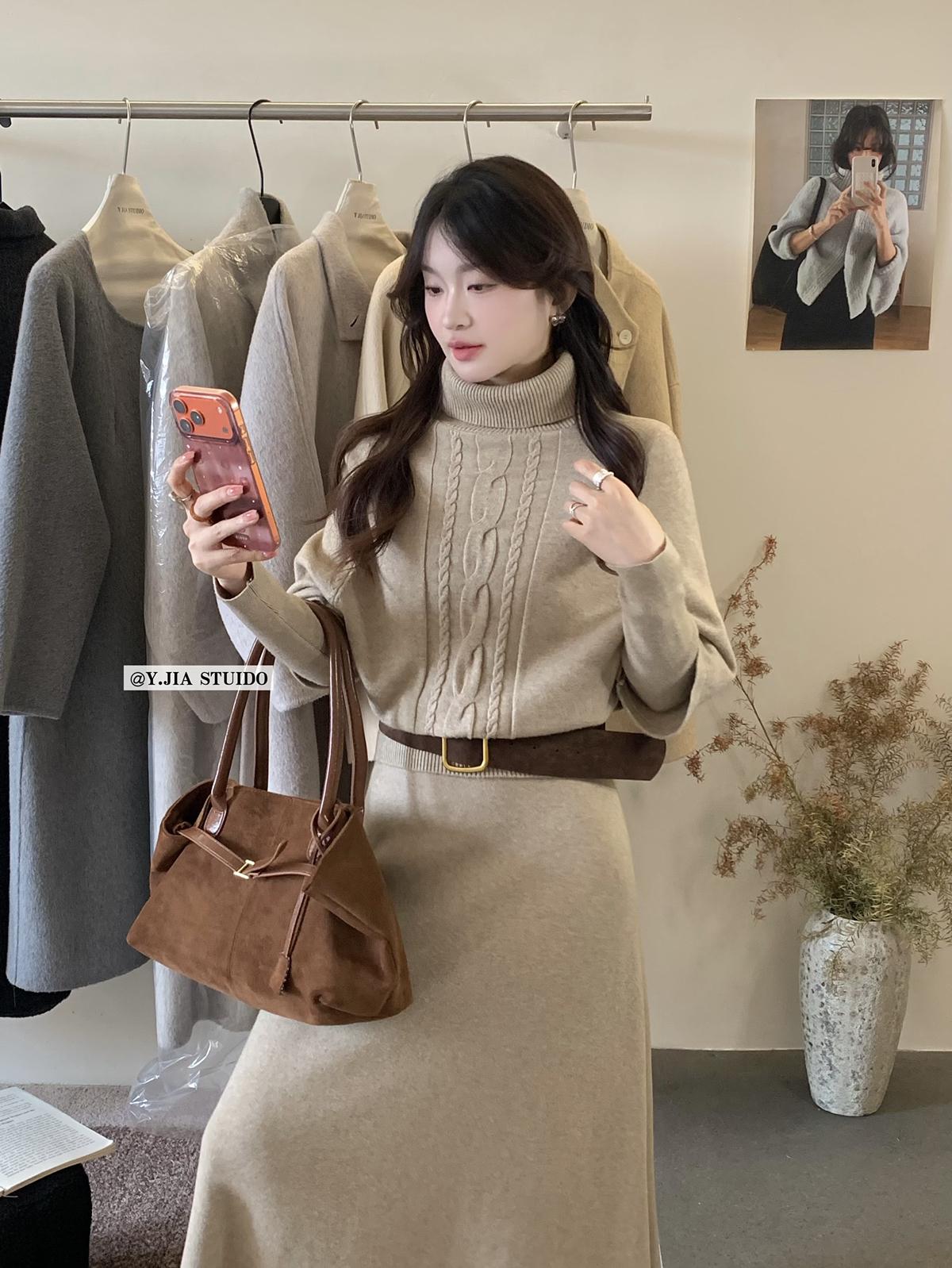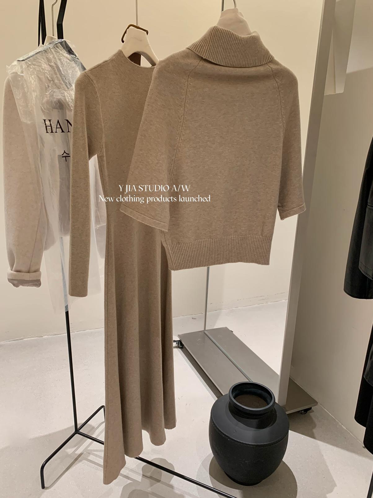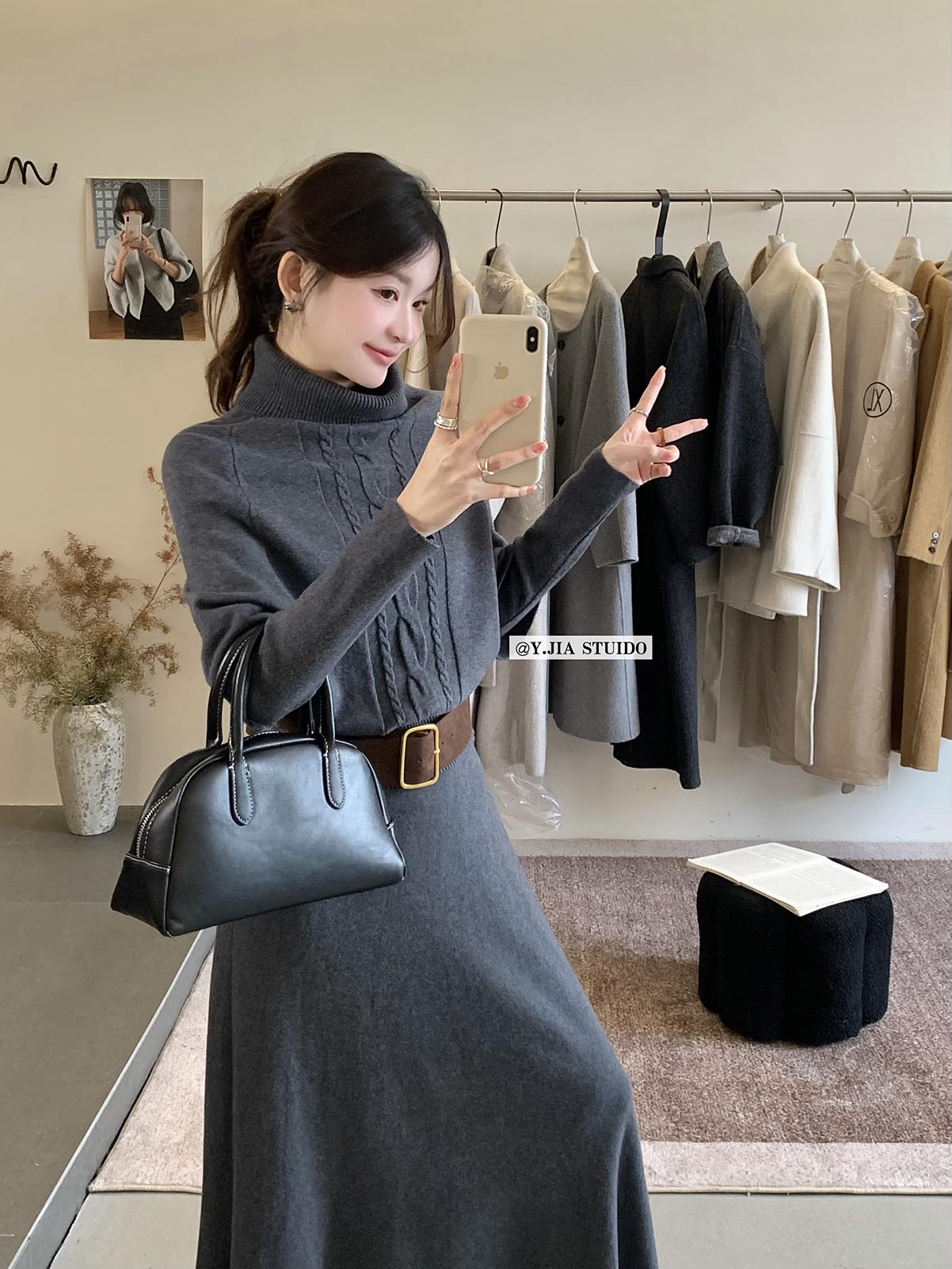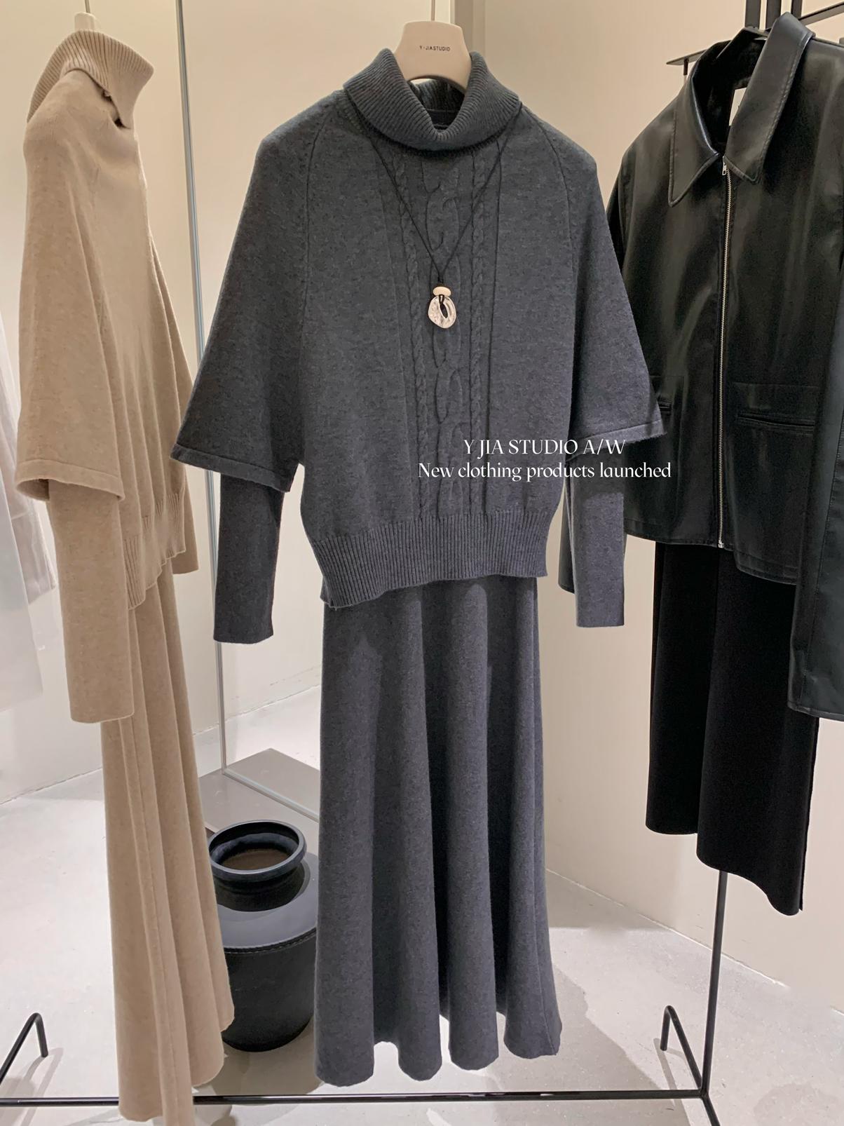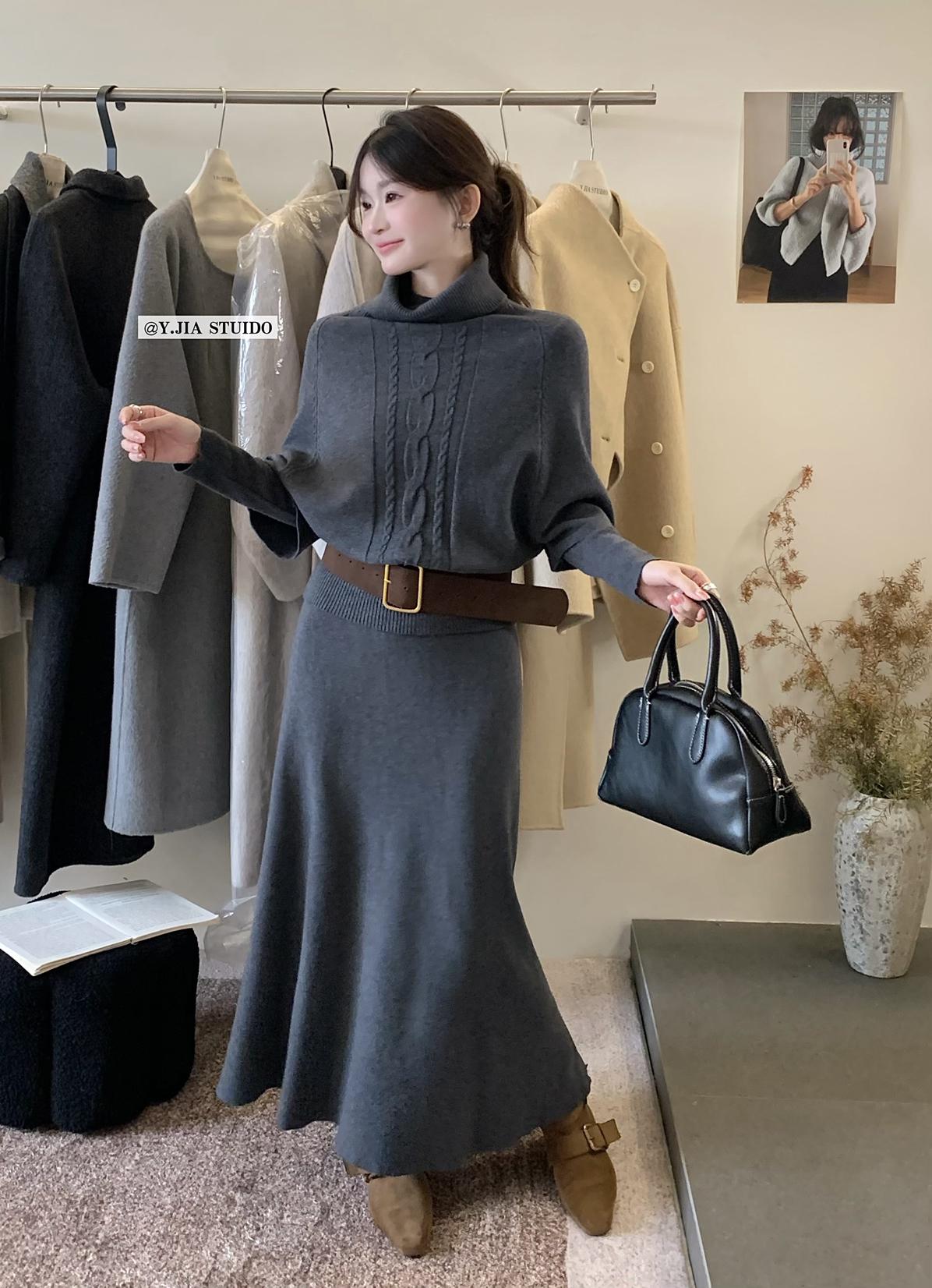 【C7945】慵懶風,高領麻花短袖針織毛衣+疊穿長袖長款連衣裙套裝(配腰帶)