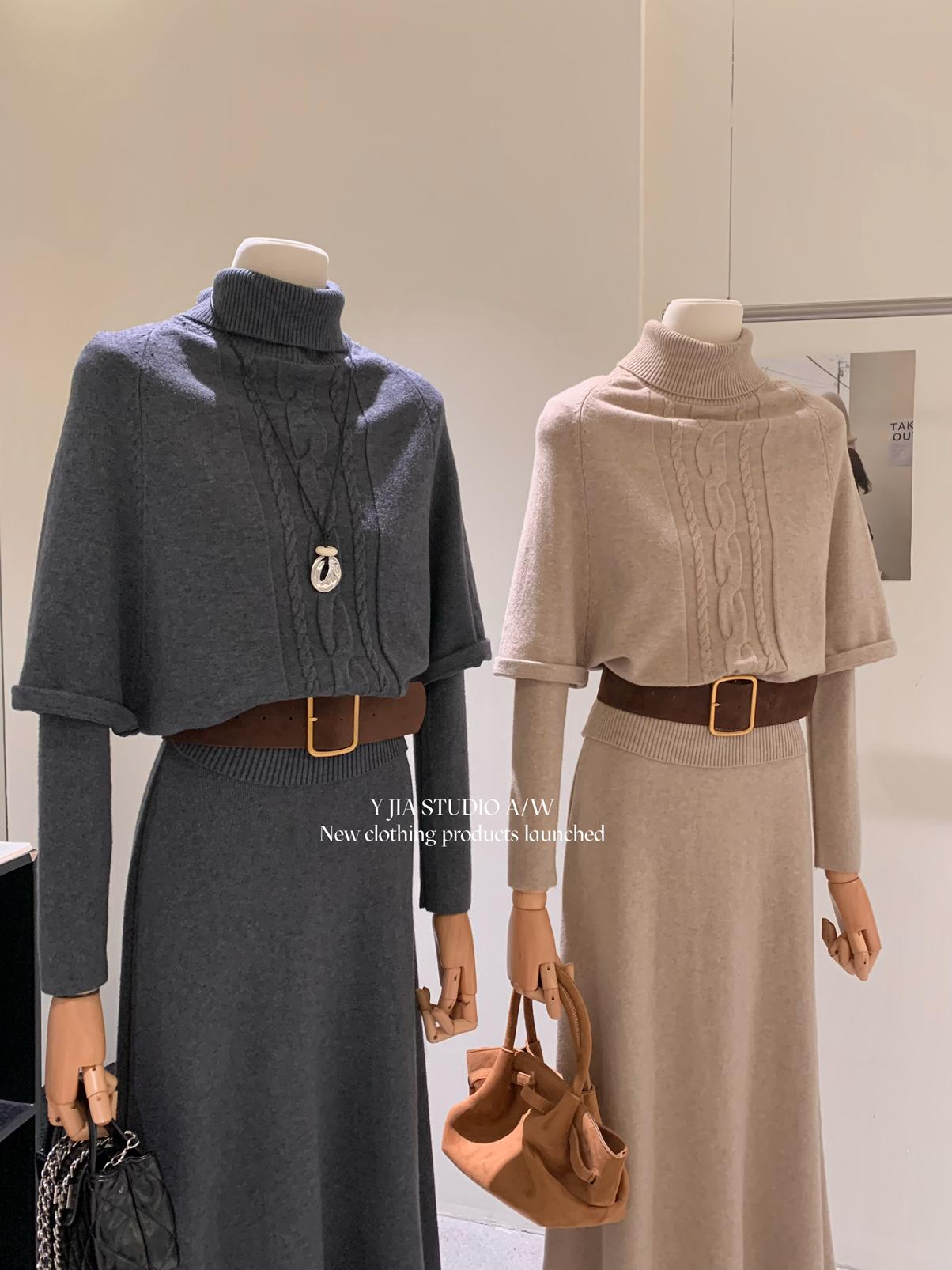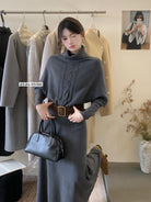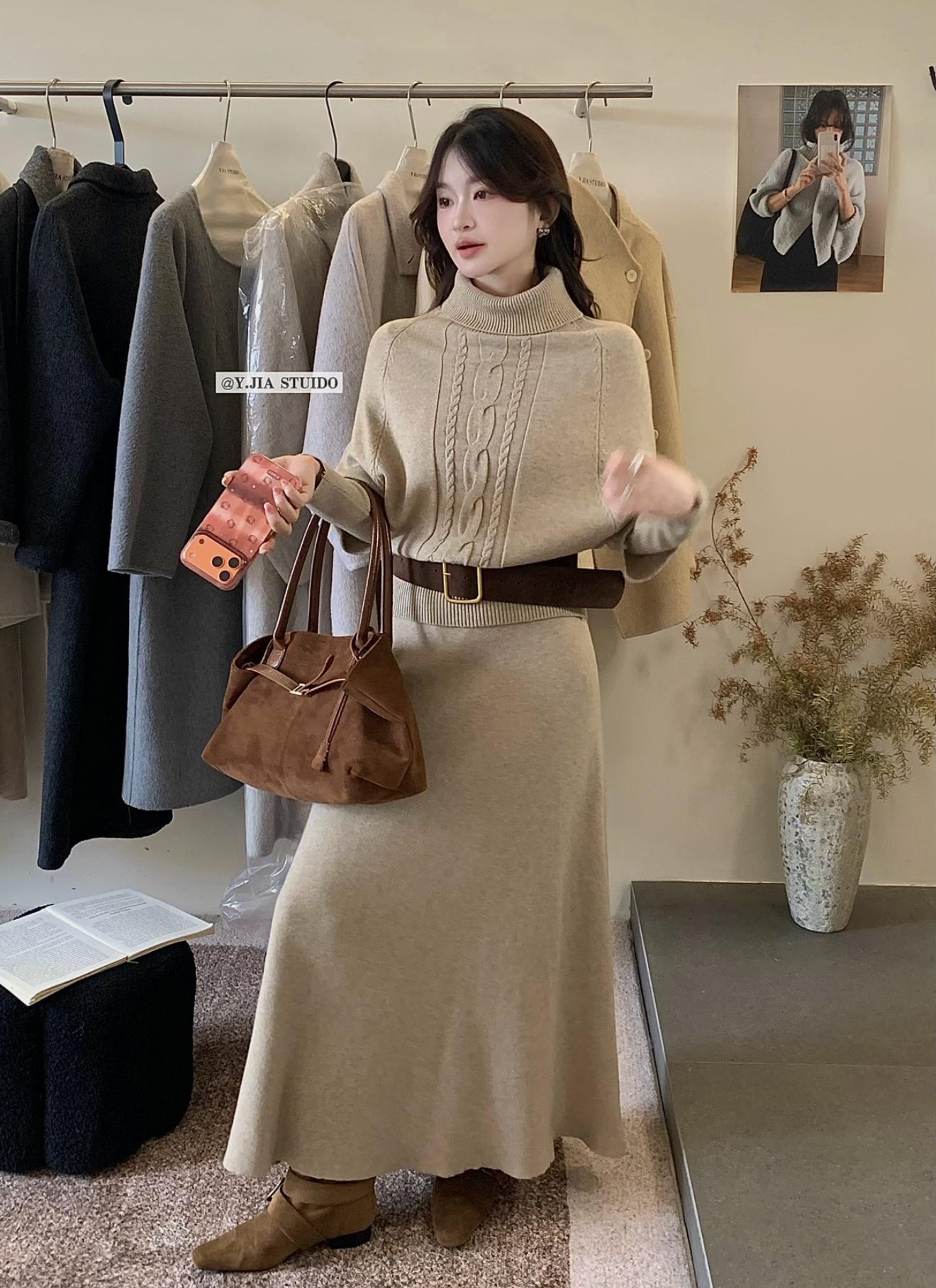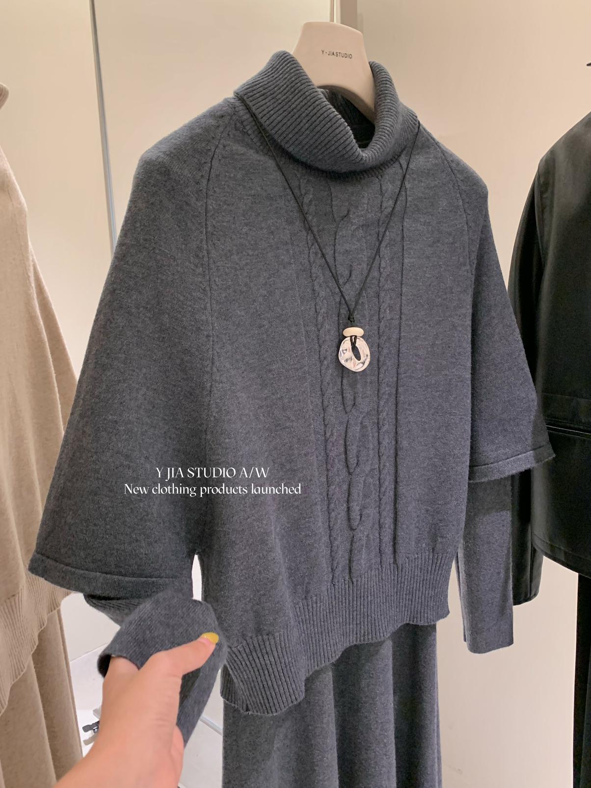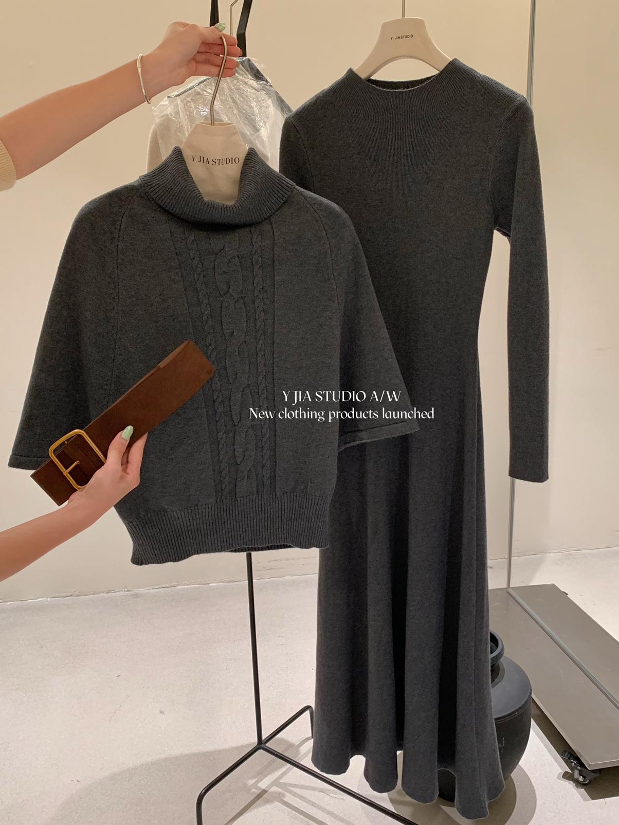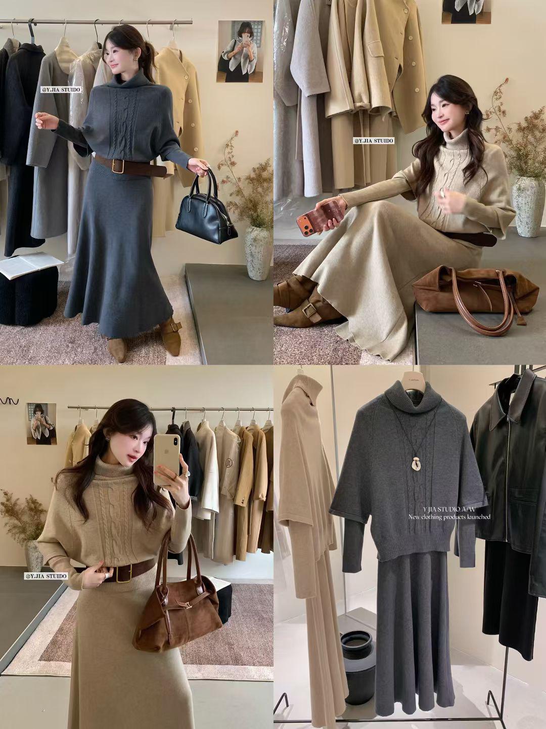 【C7945】慵懶風,高領麻花短袖針織毛衣+疊穿長袖長款連衣裙套裝(配腰帶)