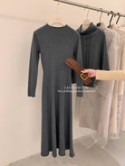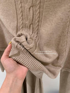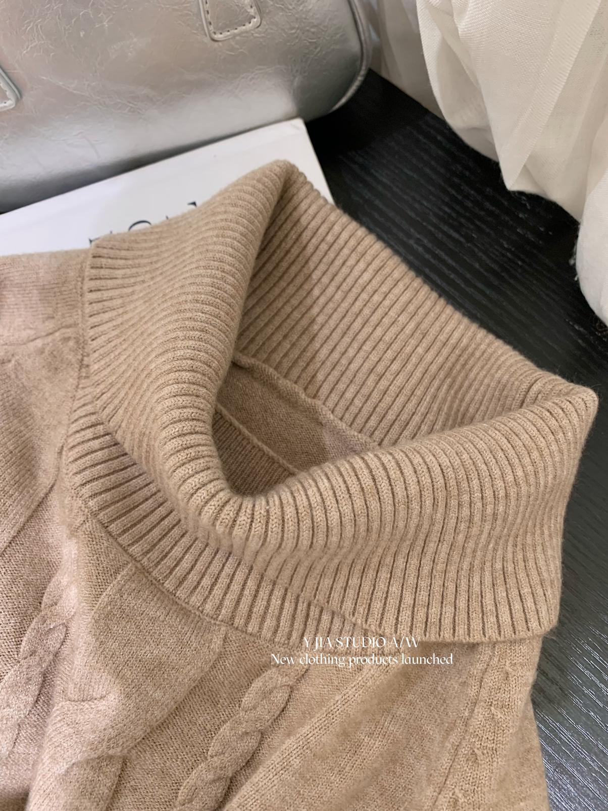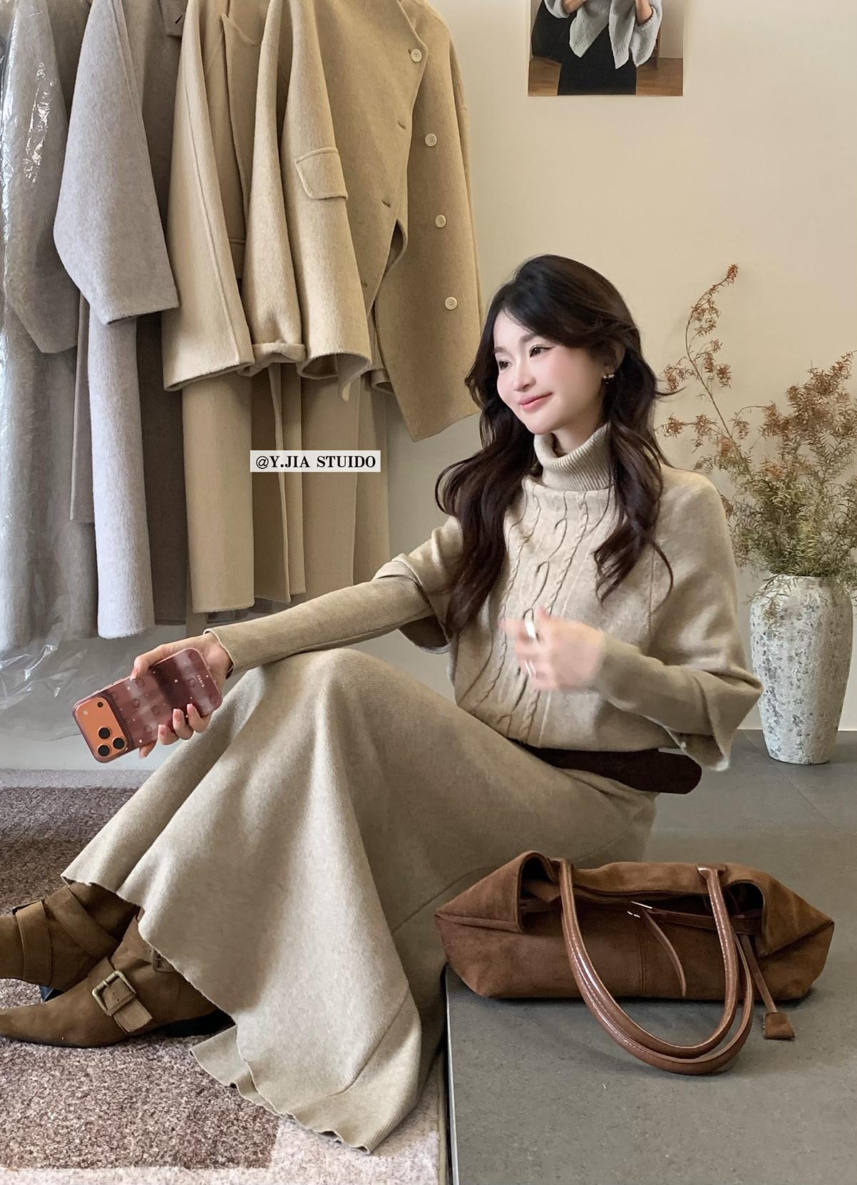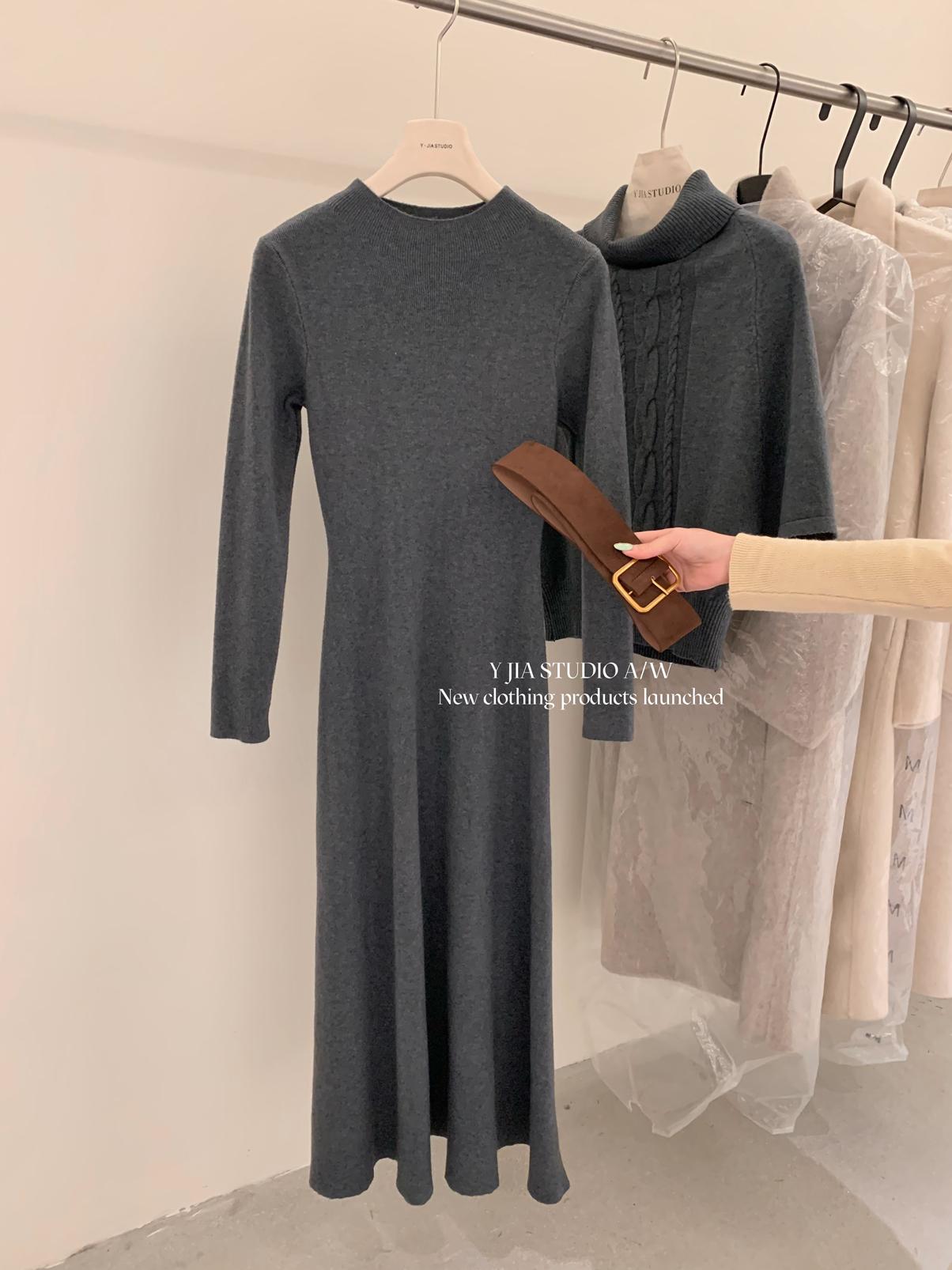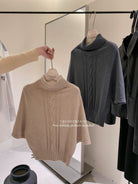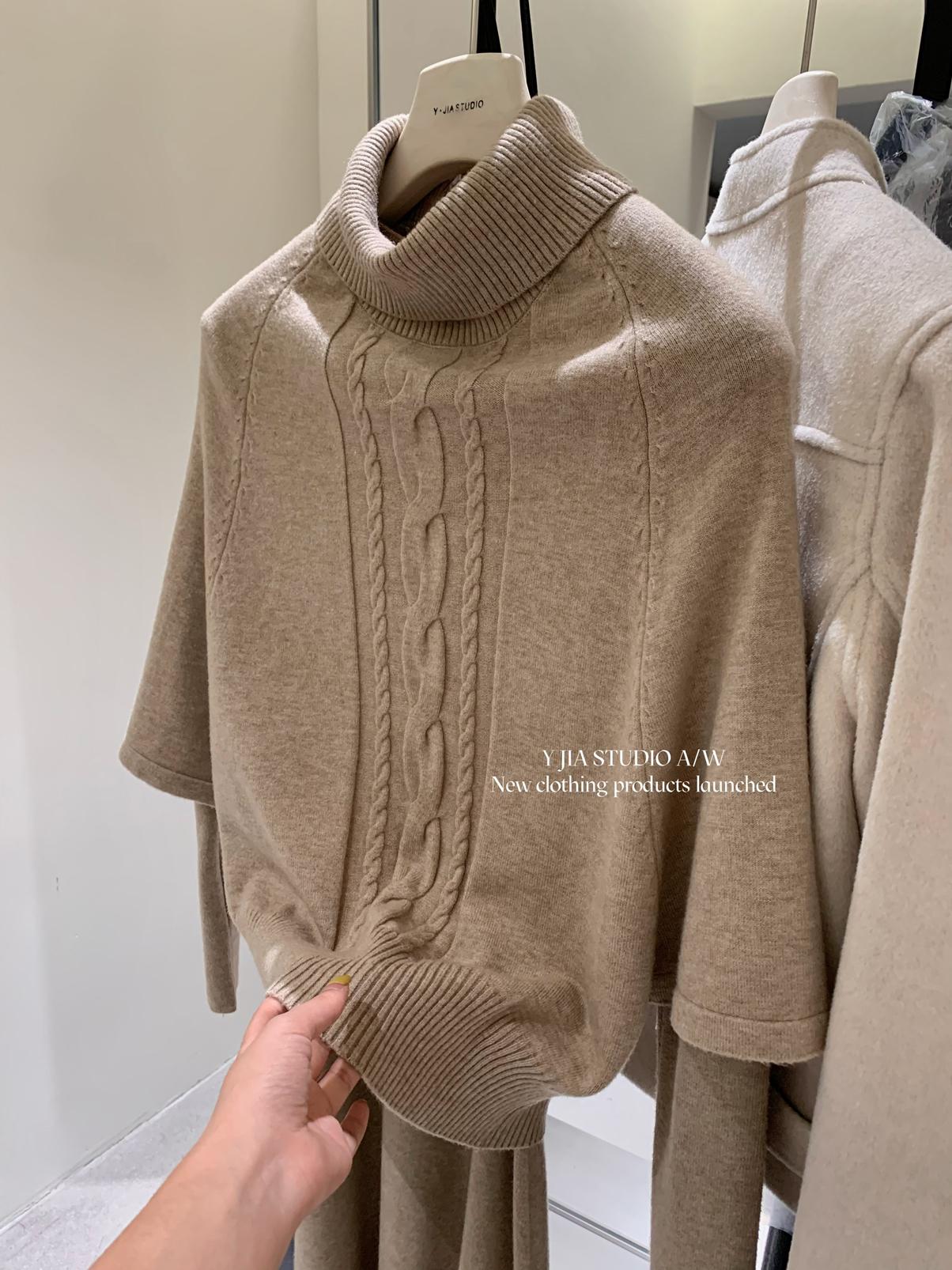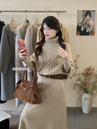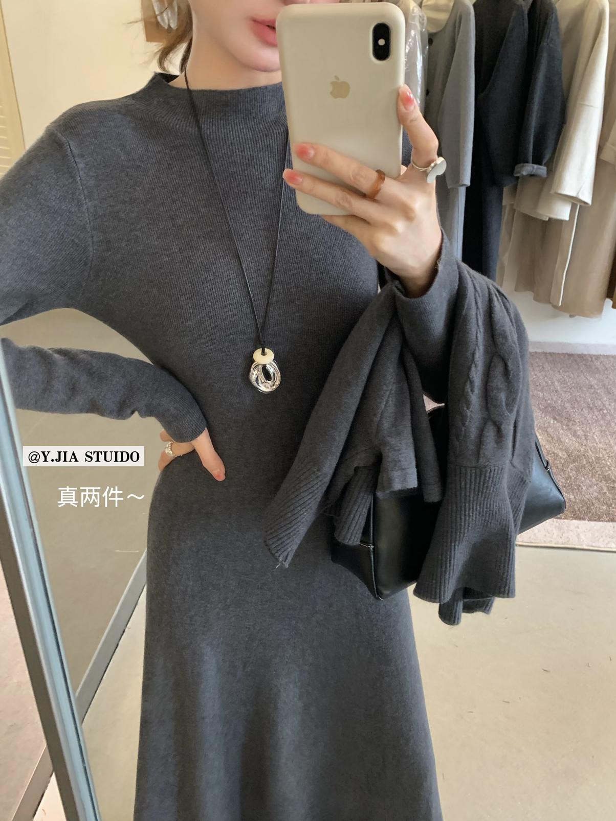 【C7945】慵懶風,高領麻花短袖針織毛衣+疊穿長袖長款連衣裙套裝(配腰帶)