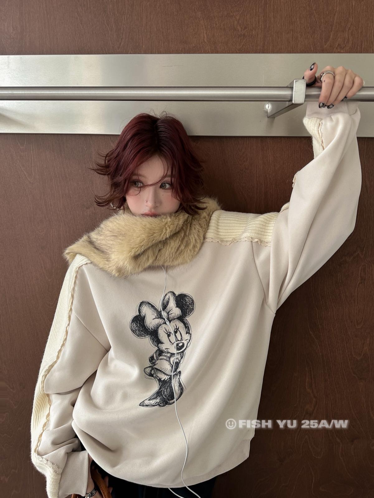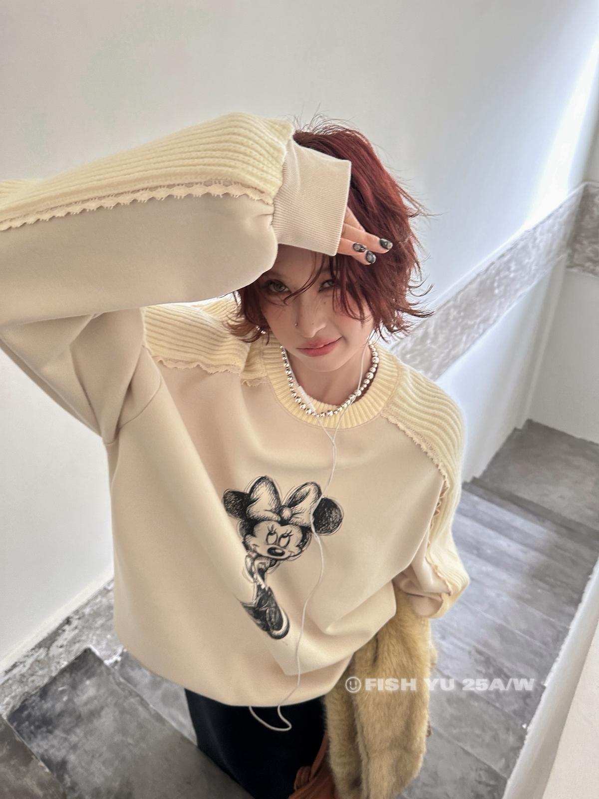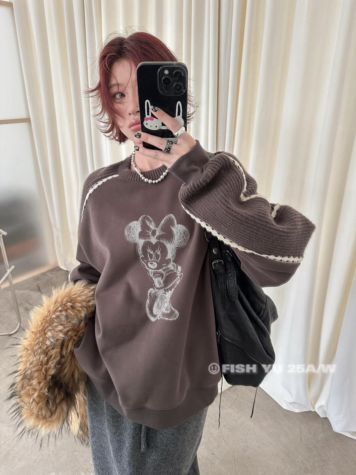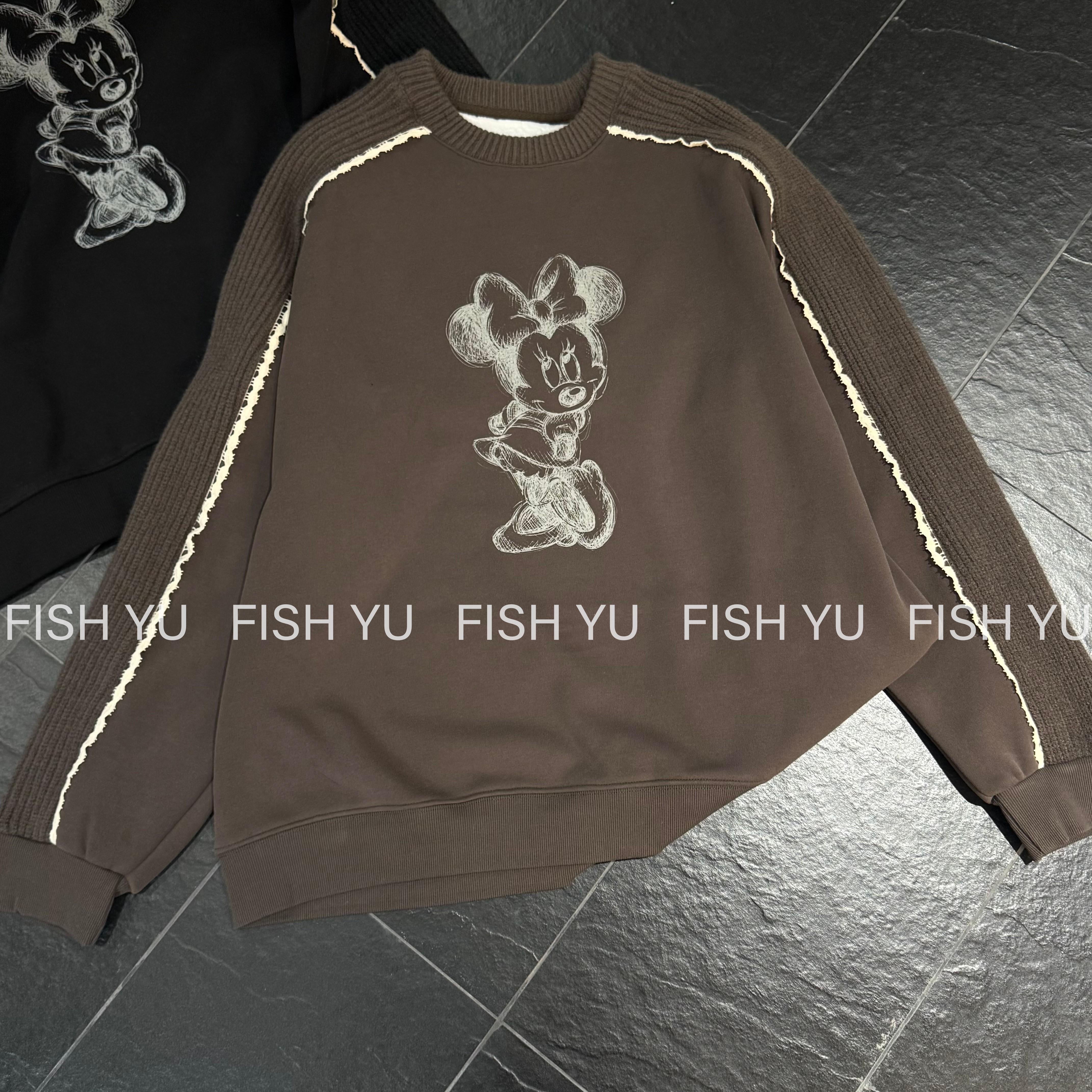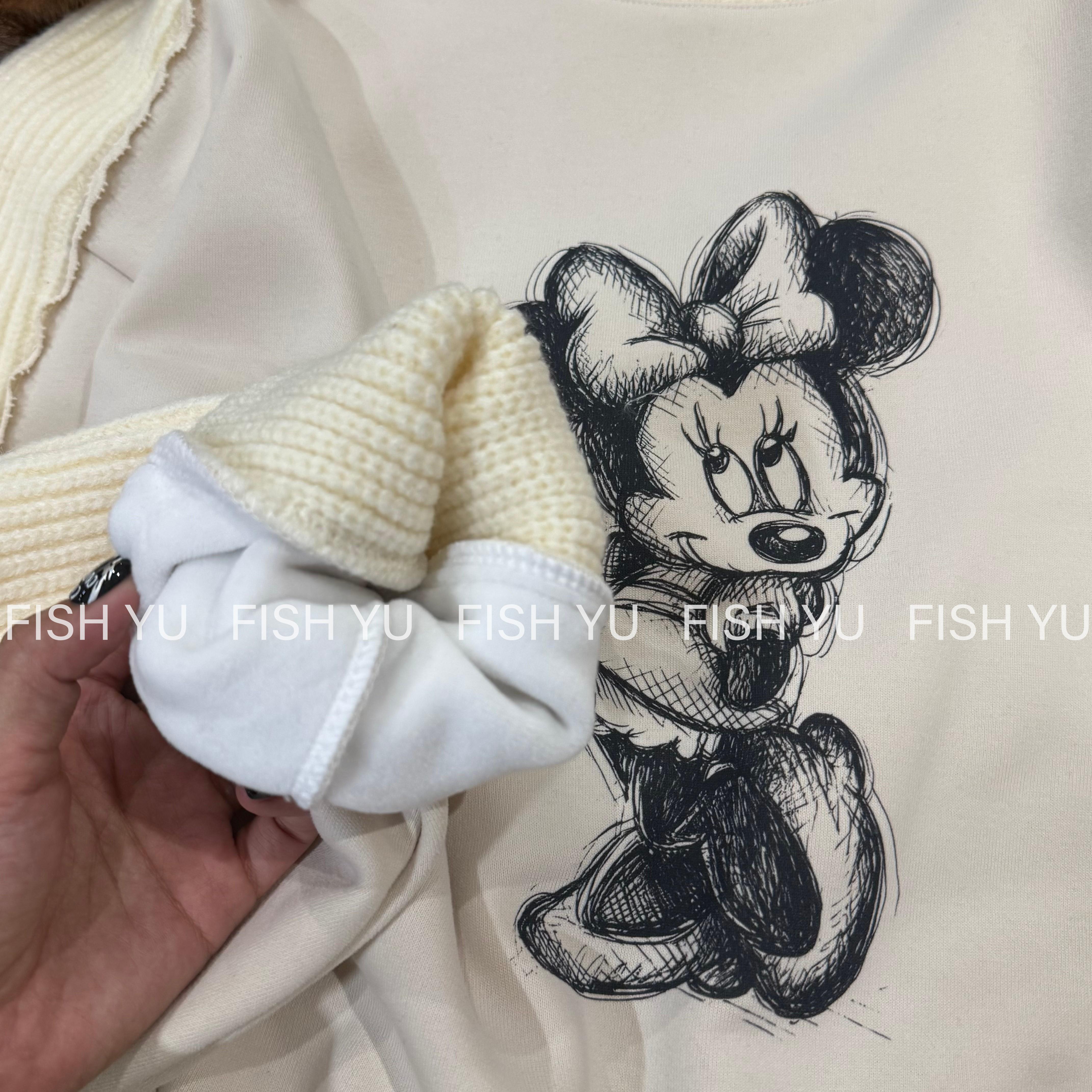 【C7955】韓貨卡通塗鴉米奇印花北極絨毛織拼接花邊內裏複合搖粒絨寬鬆圓領衛衣