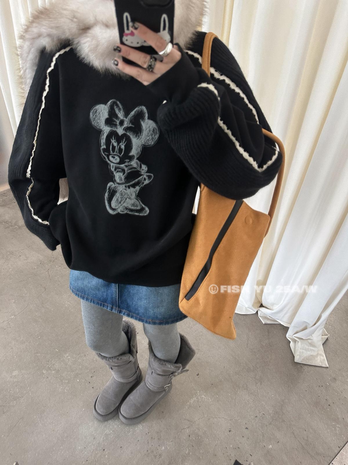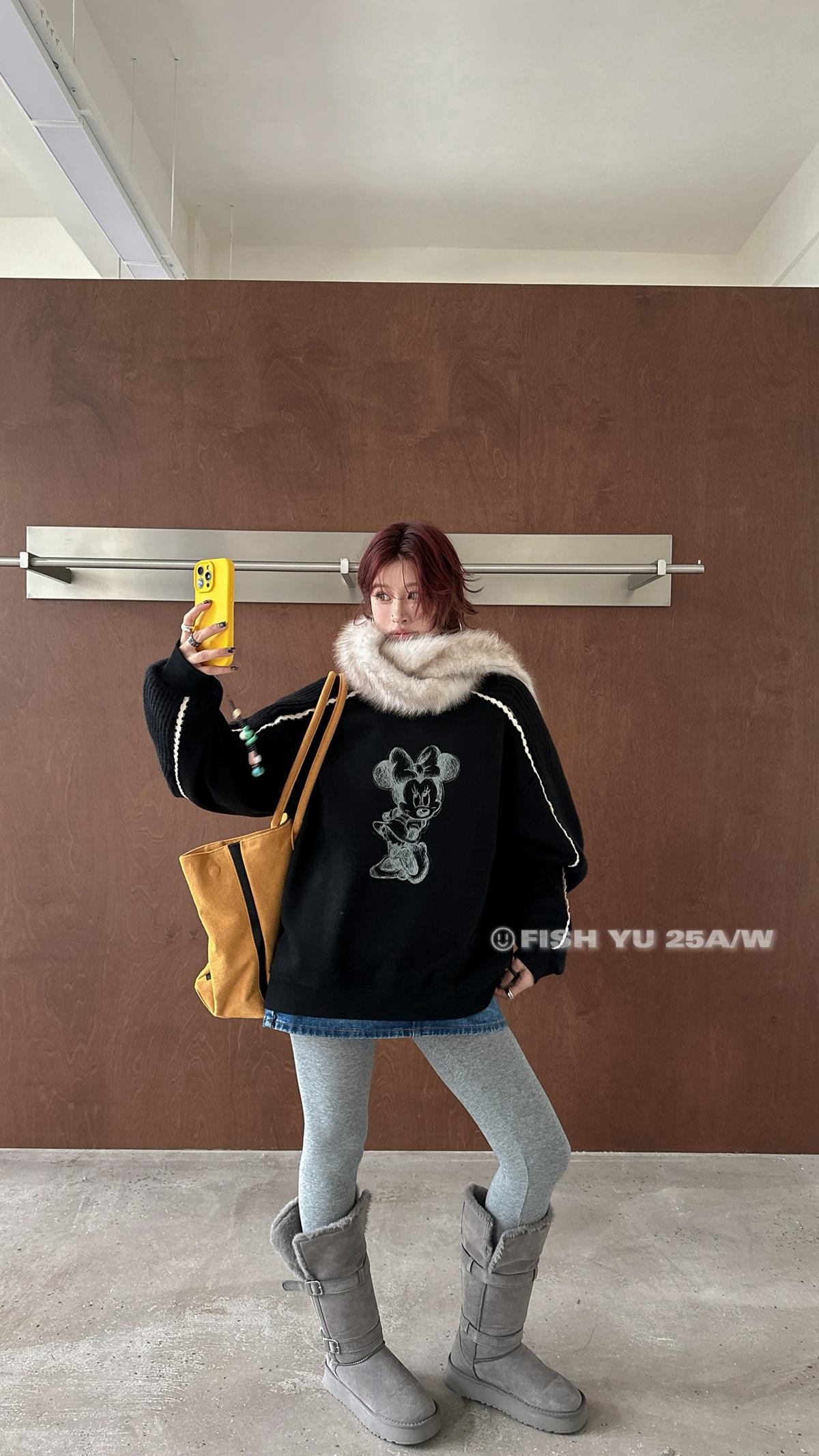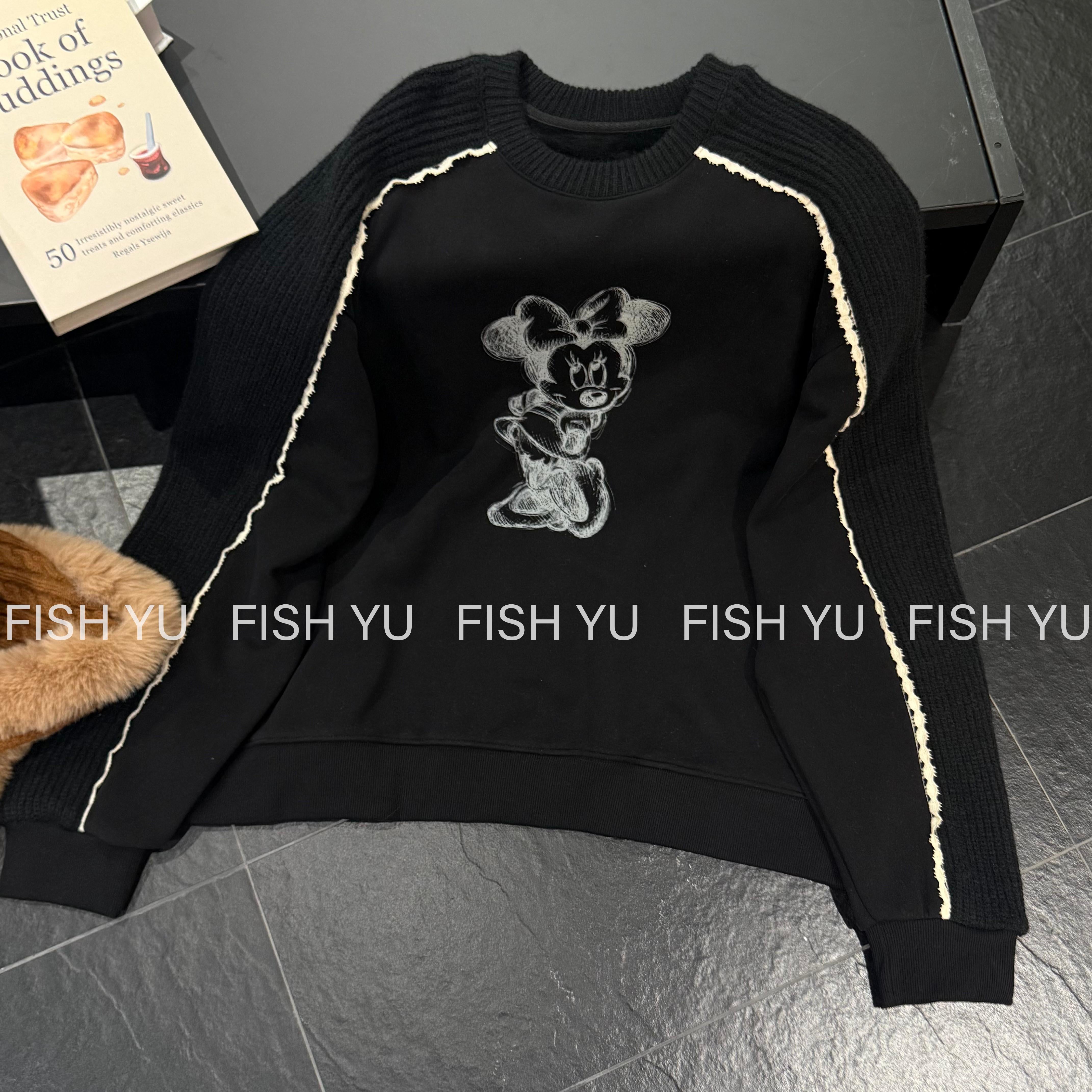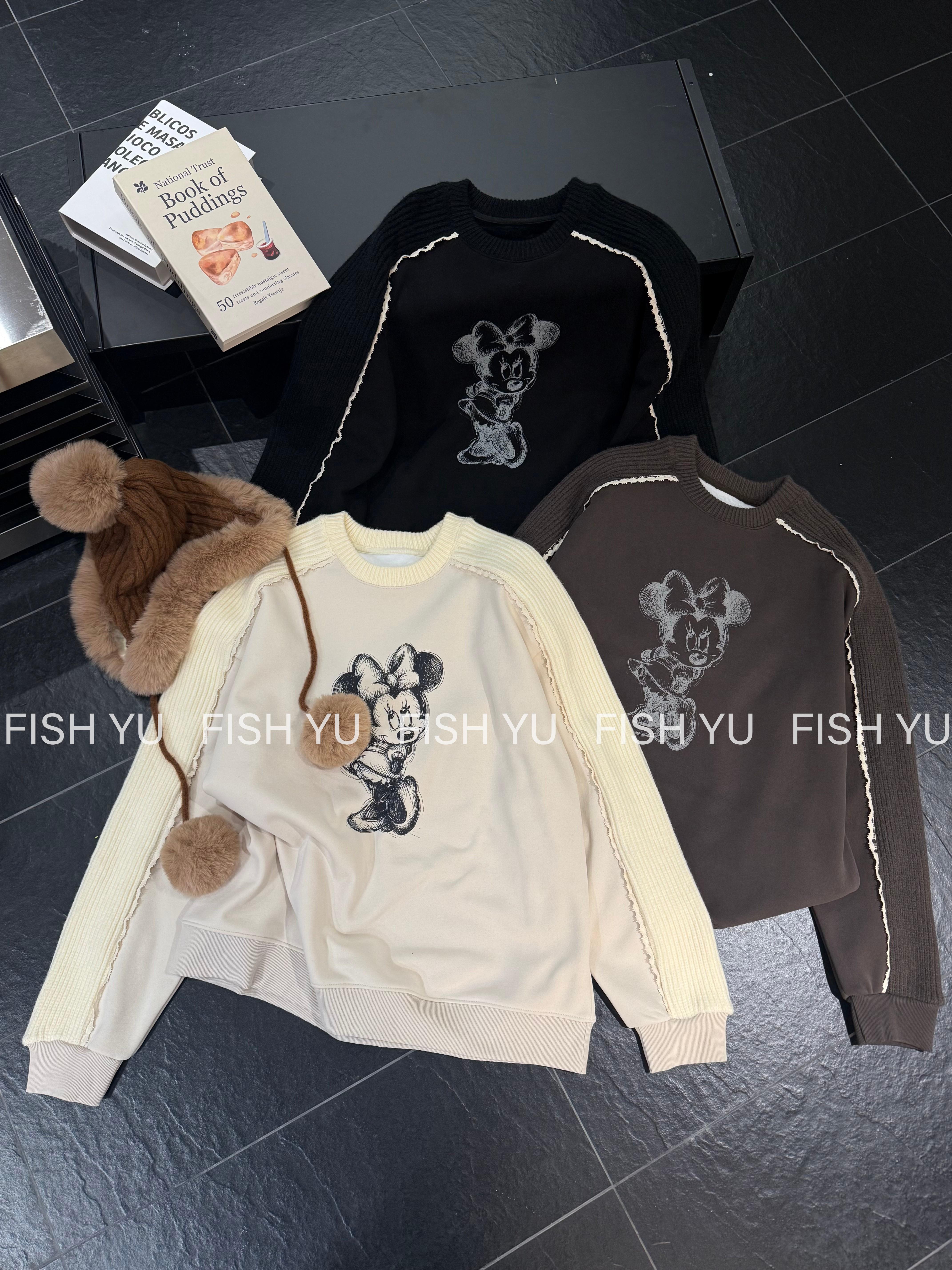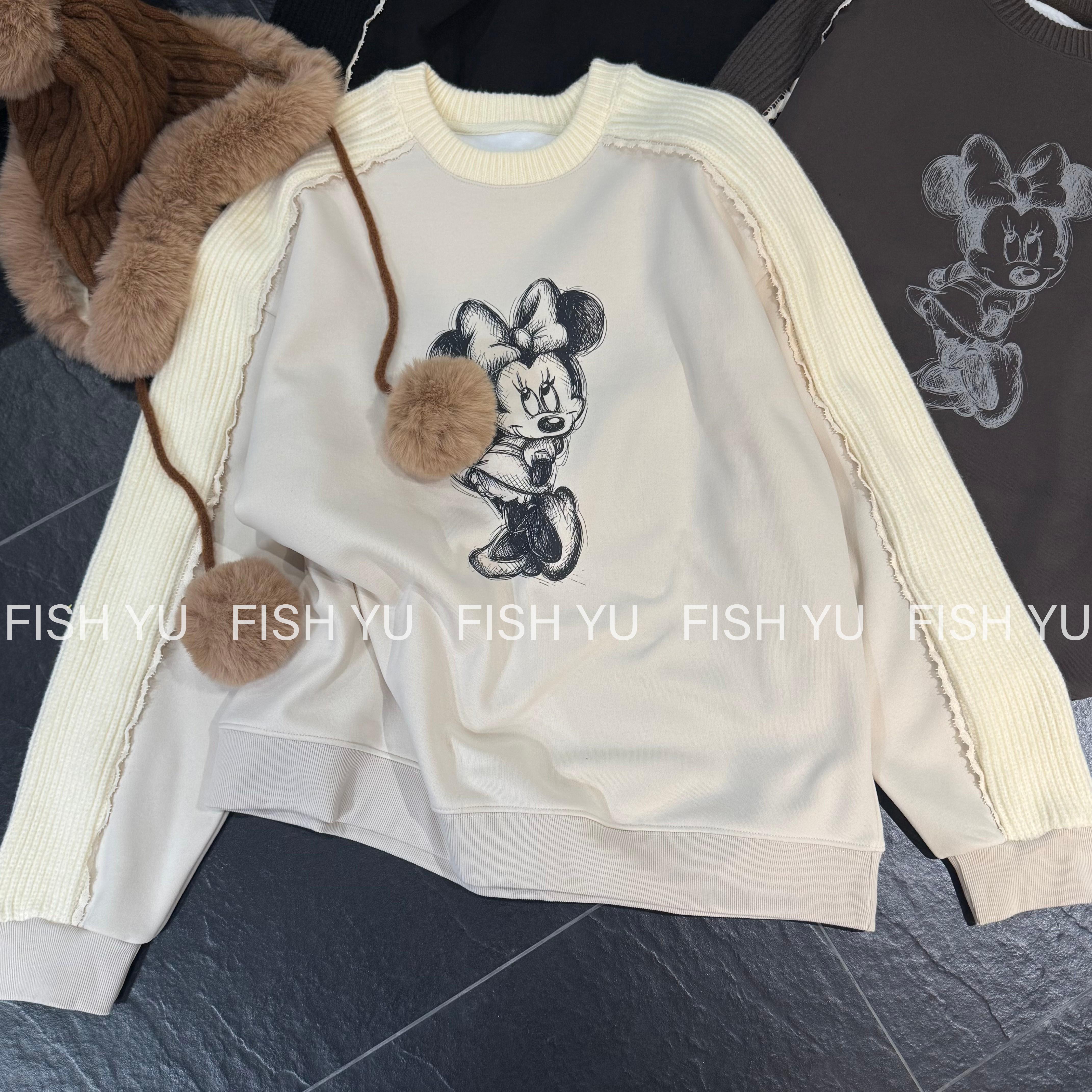 【C7955】韓貨卡通塗鴉米奇印花北極絨毛織拼接花邊內裏複合搖粒絨寬鬆圓領衛衣