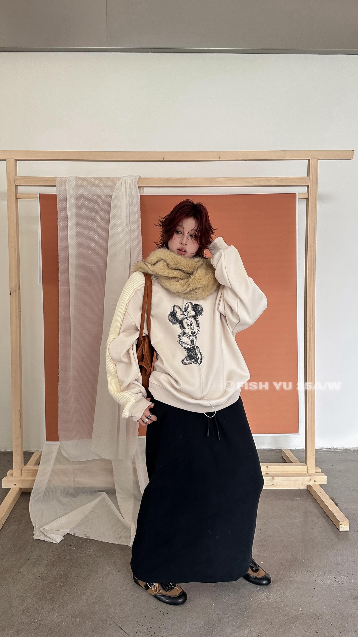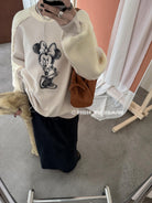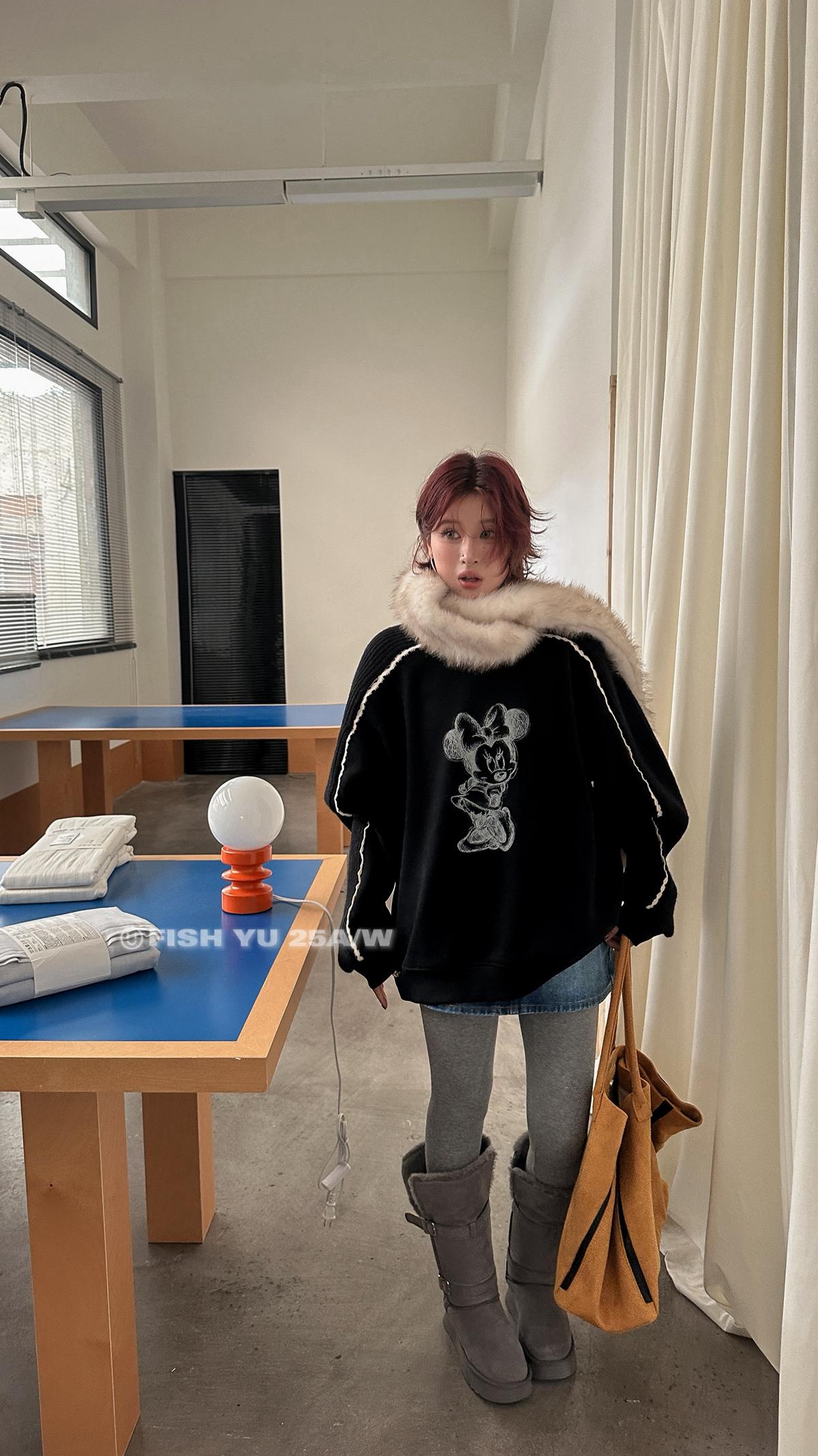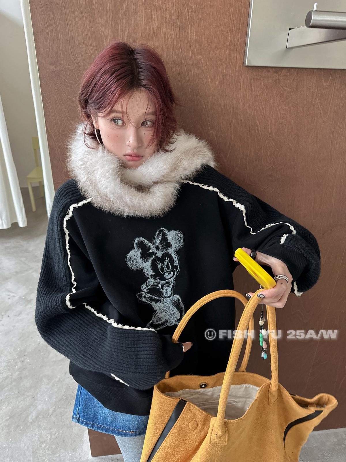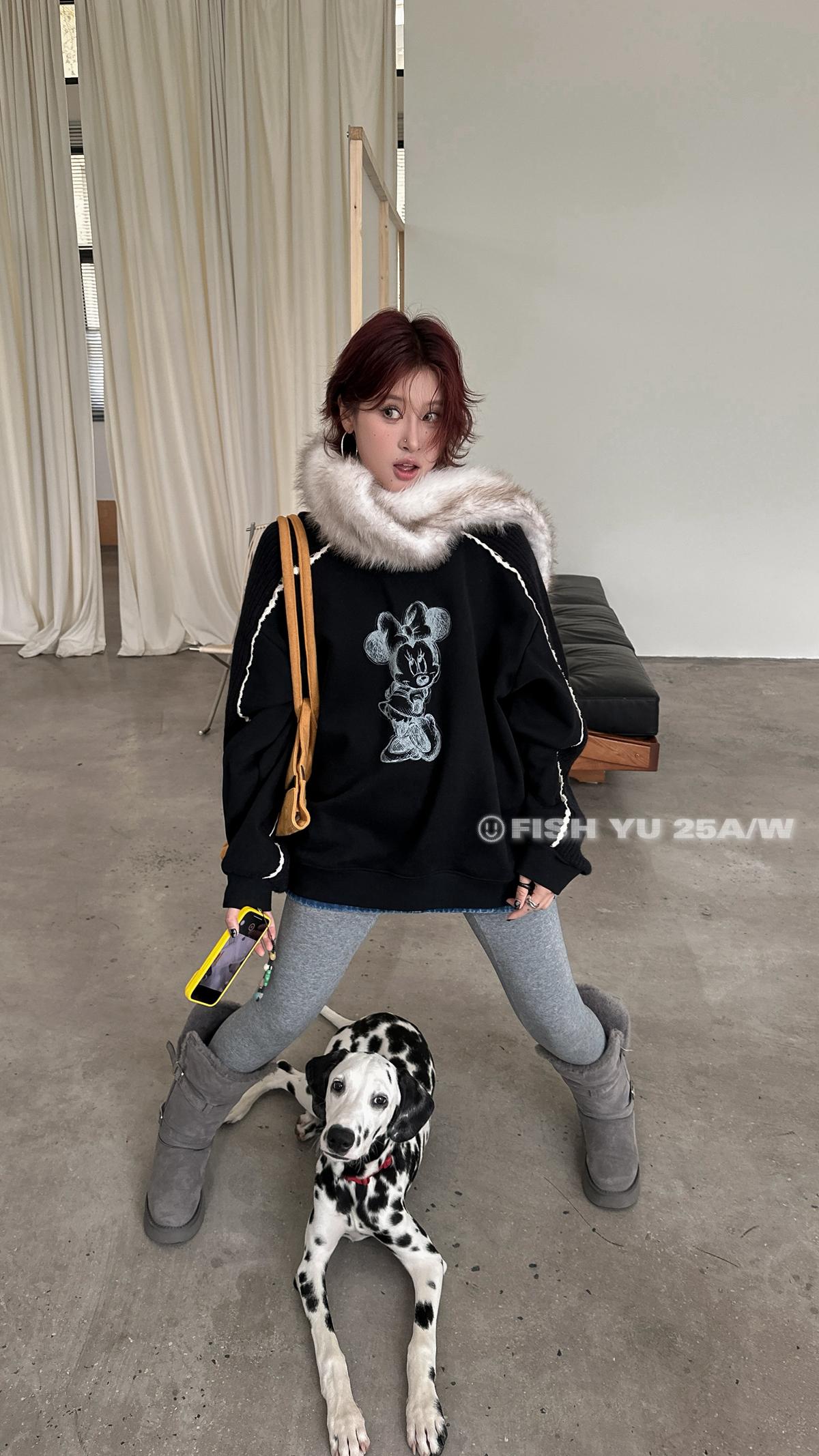 【C7955】韓貨卡通塗鴉米奇印花北極絨毛織拼接花邊內裏複合搖粒絨寬鬆圓領衛衣