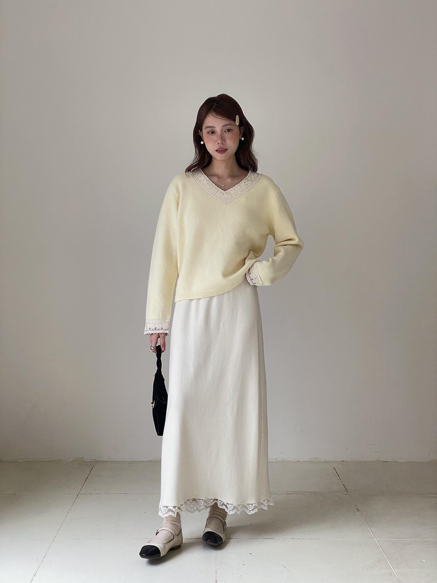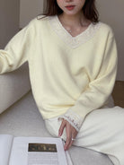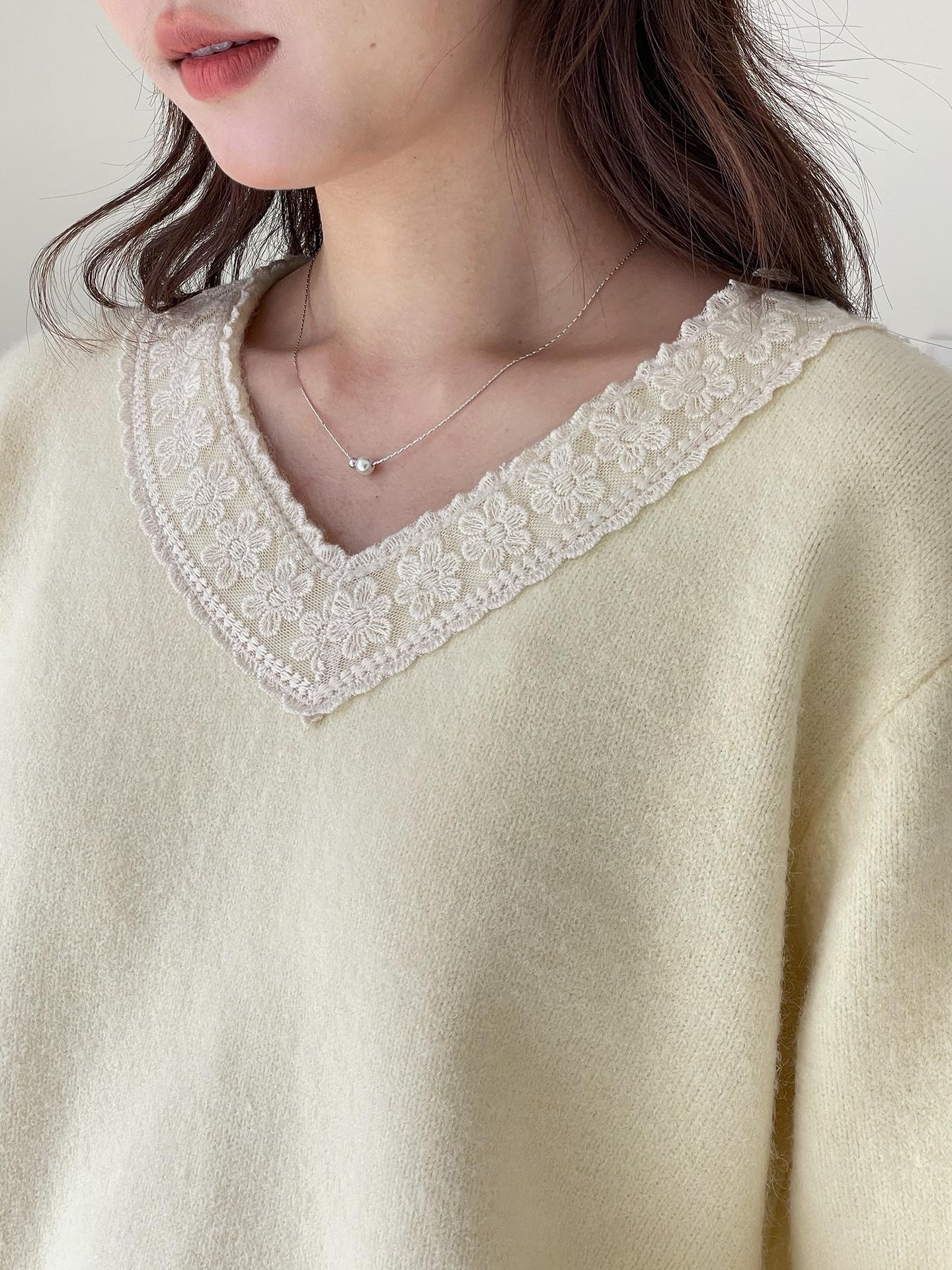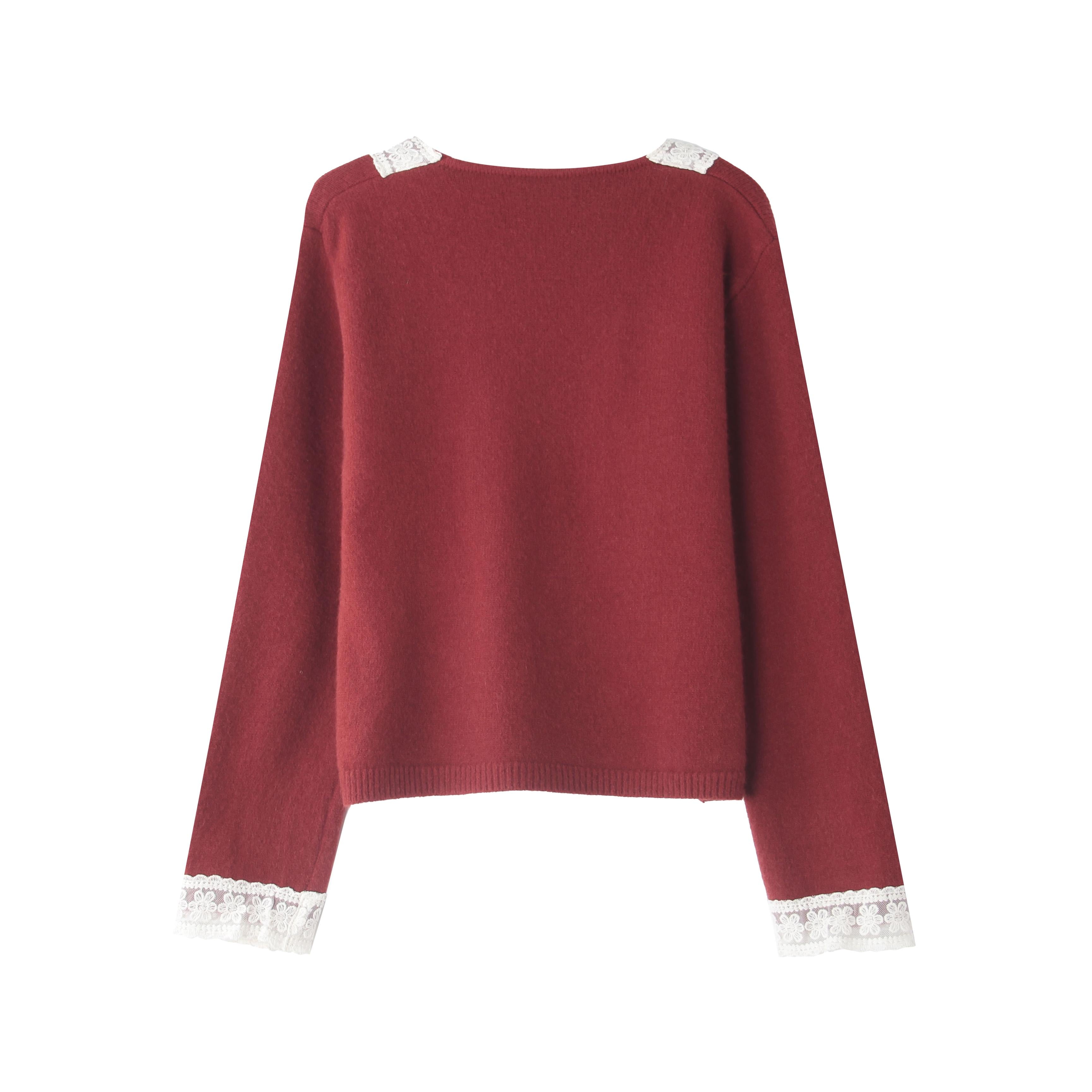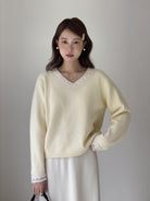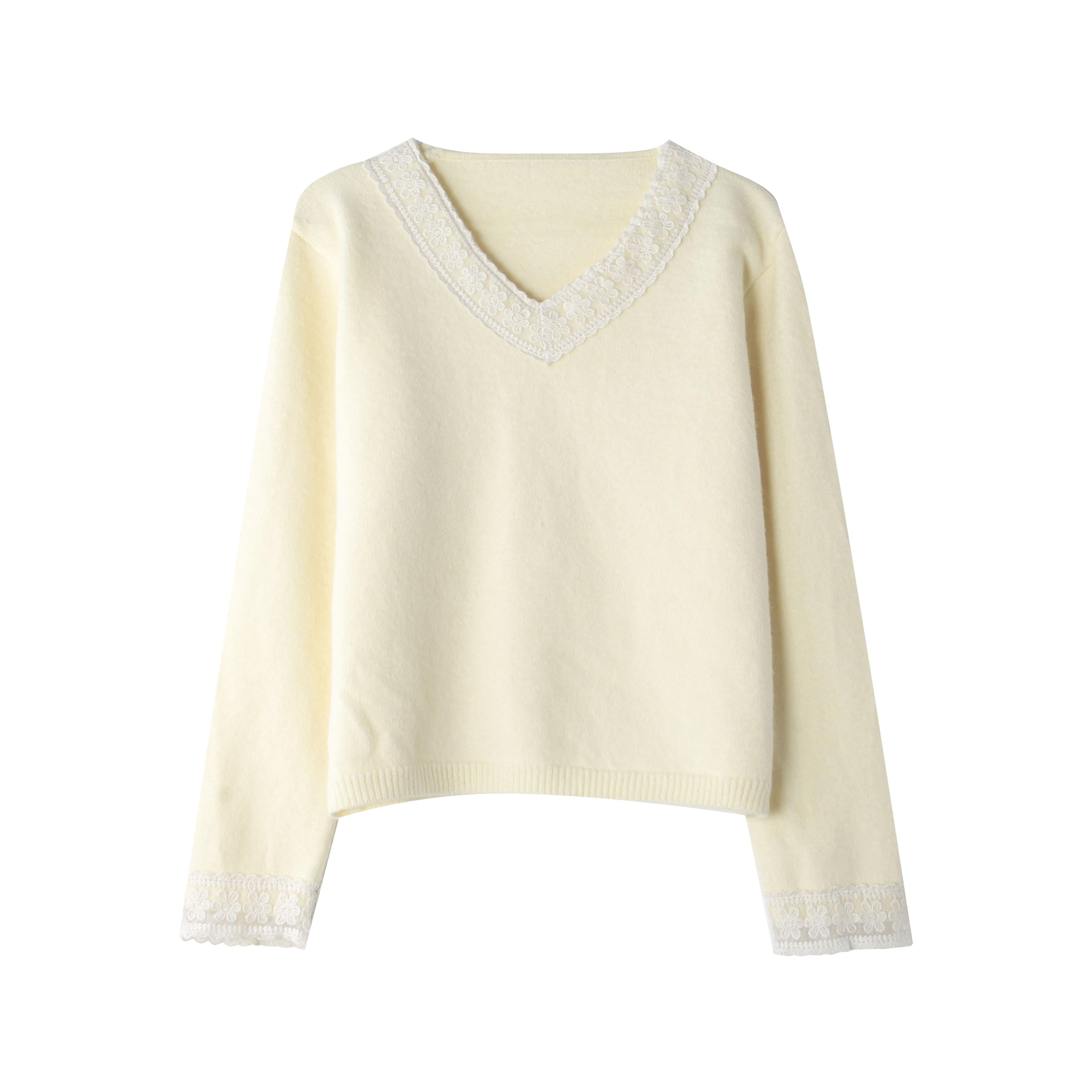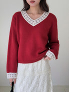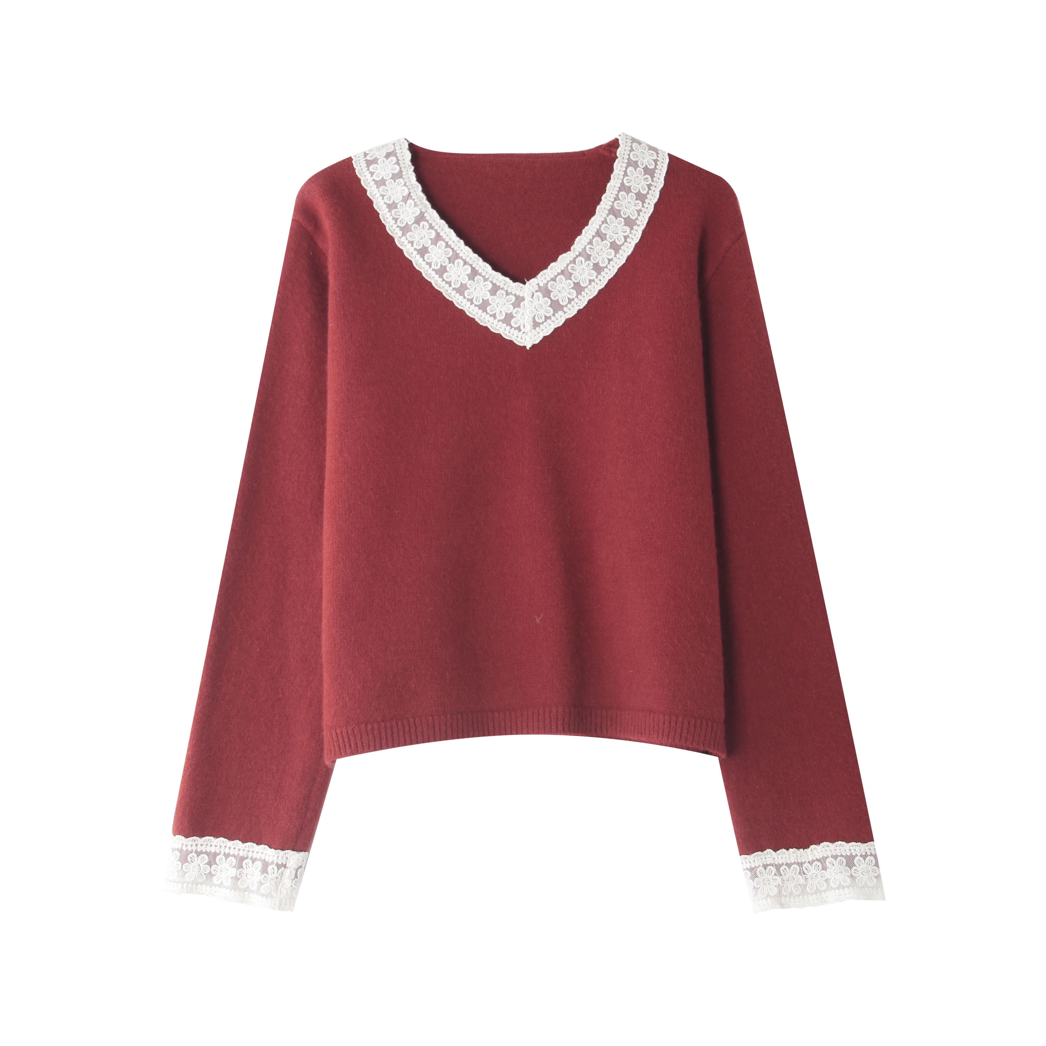 【C7957】冬上新!法式撞色蕾絲拼接V領套頭保暖毛衣