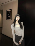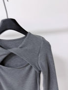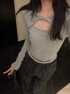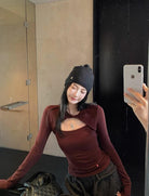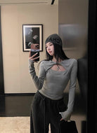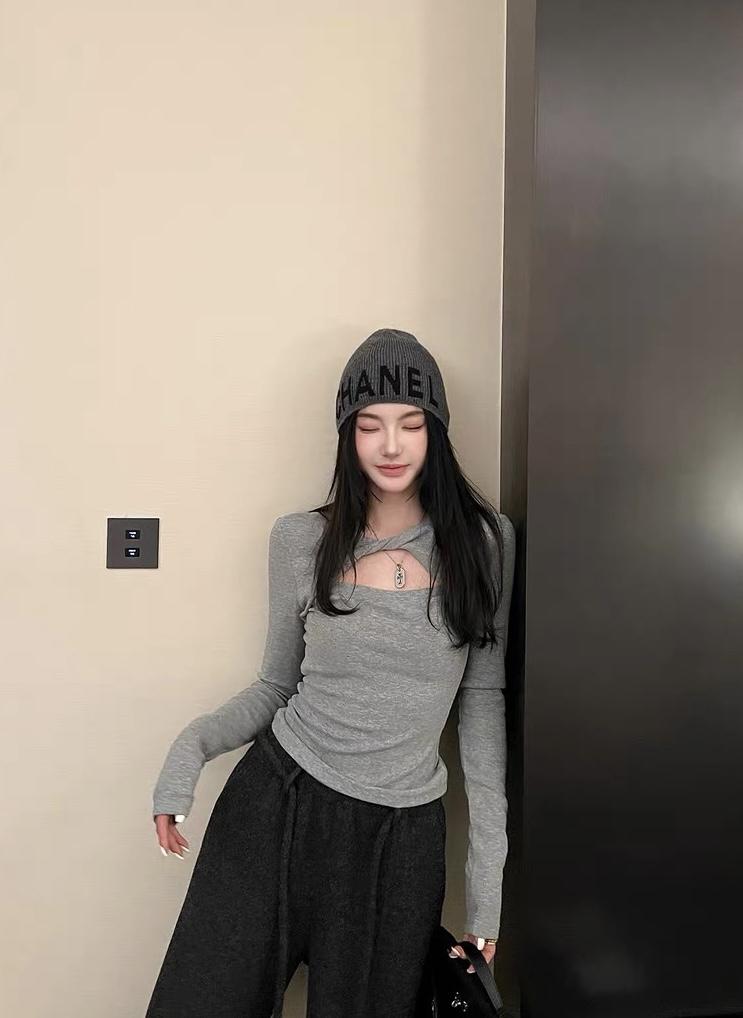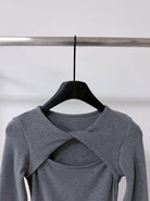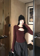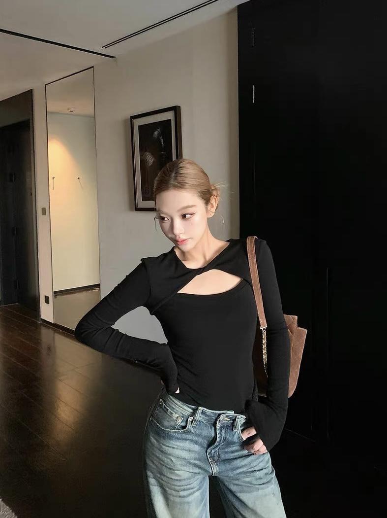 【C7993】韓系小衆設計感鏤空扭結解構設計加絨修身顯瘦長袖小衫