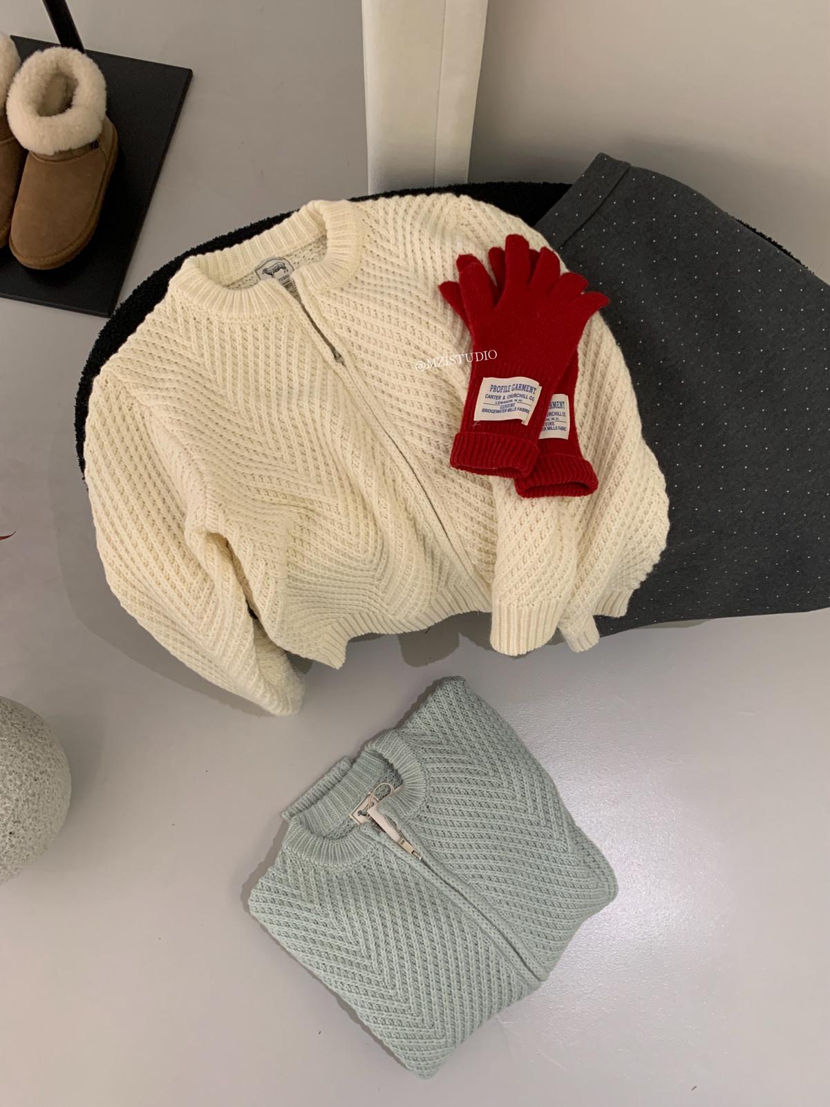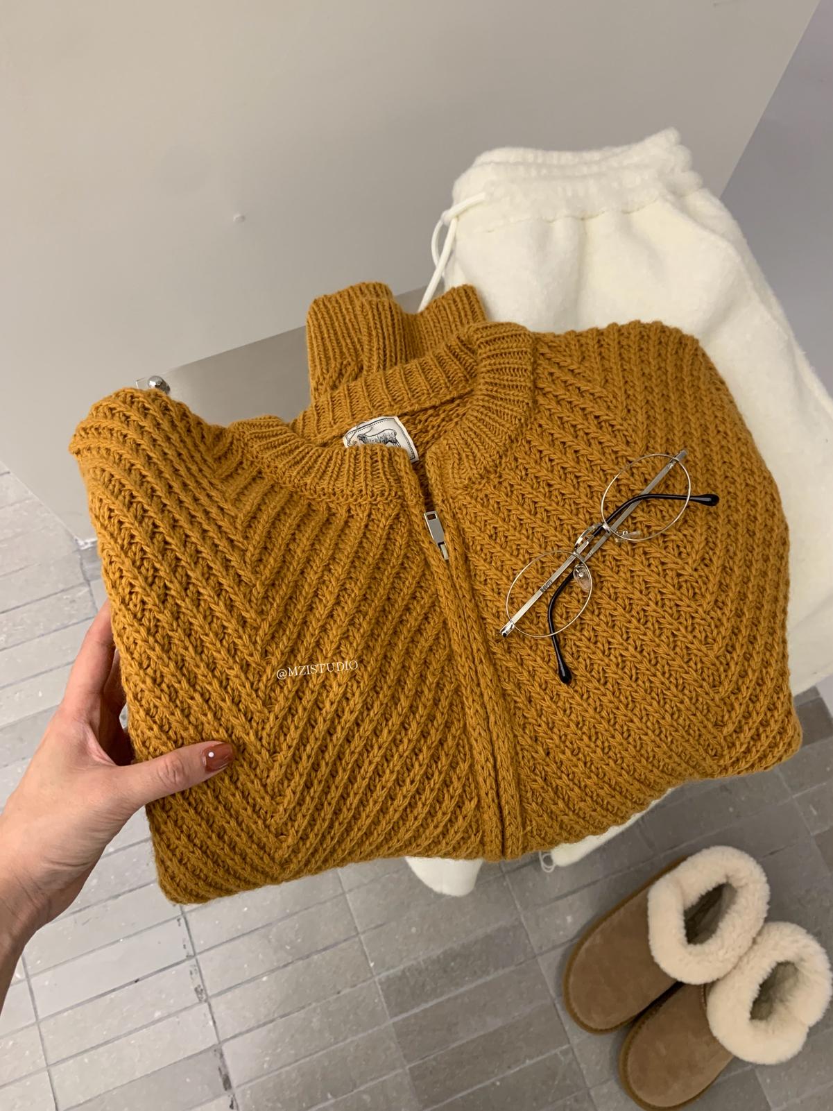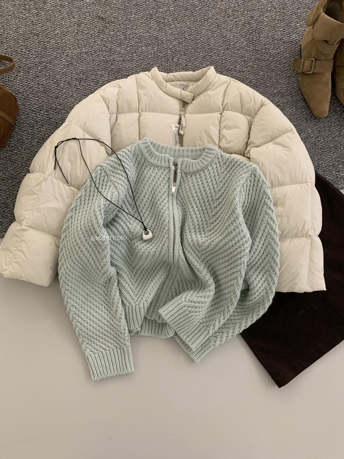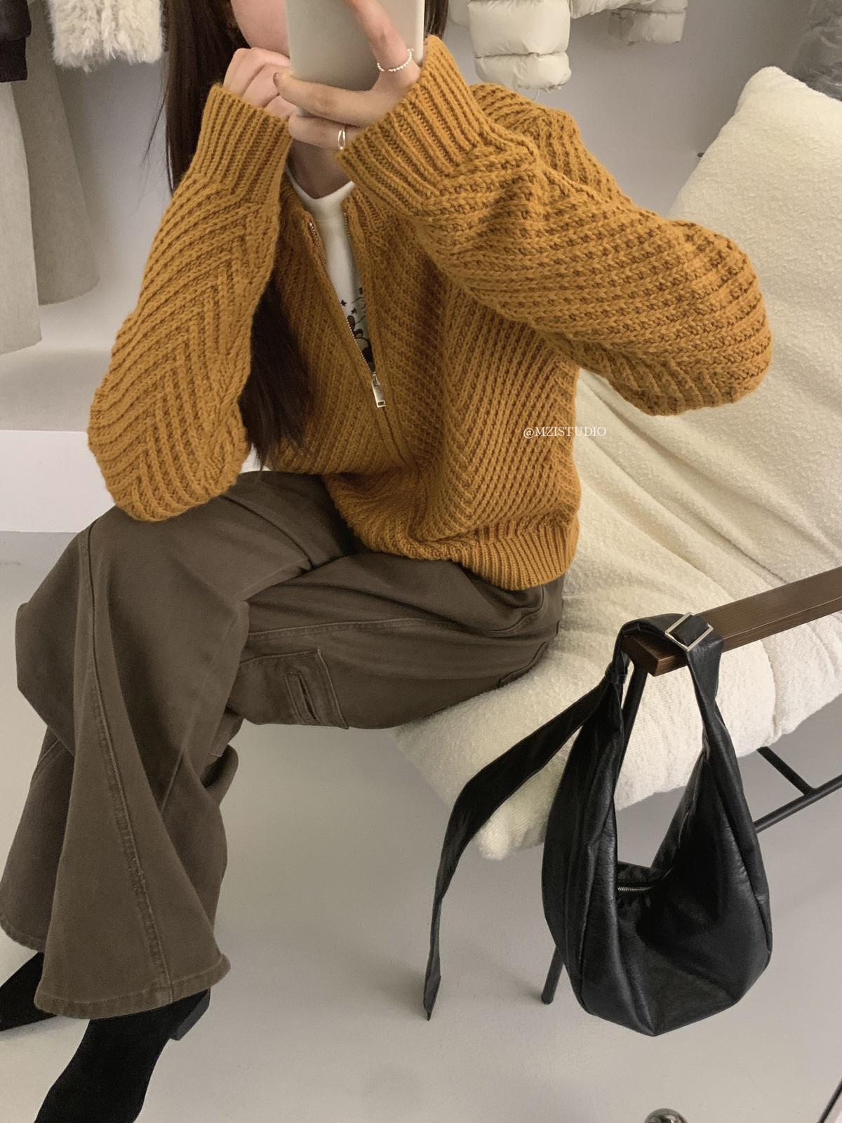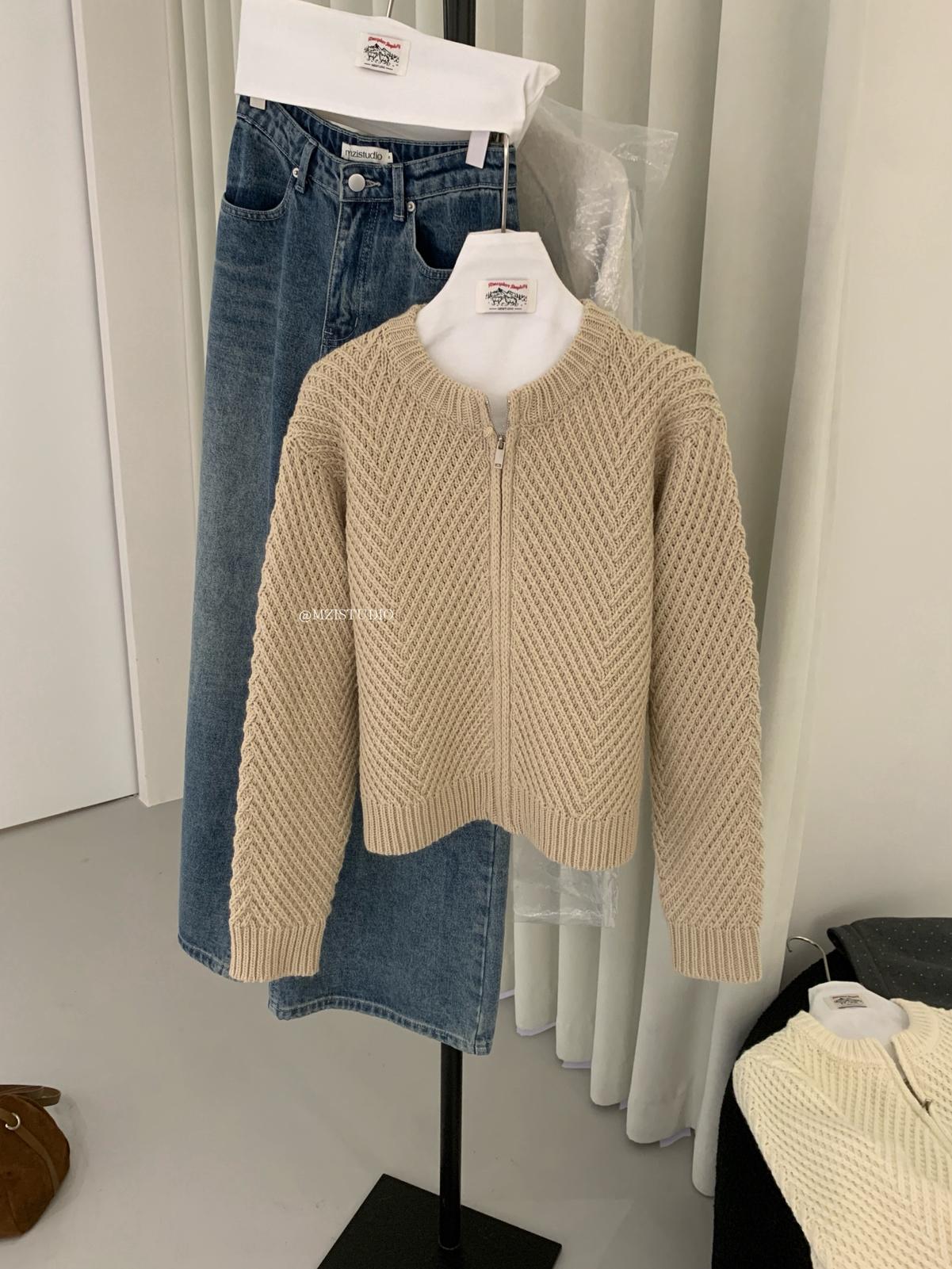【C7998】輕盈自在冬季中性色調利落溫暖提花重工拉鍊圓領開衫保暖毛衣