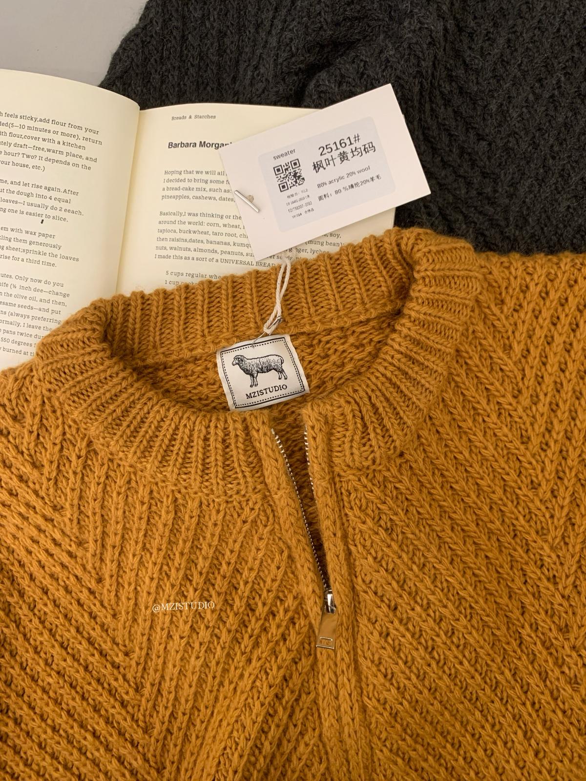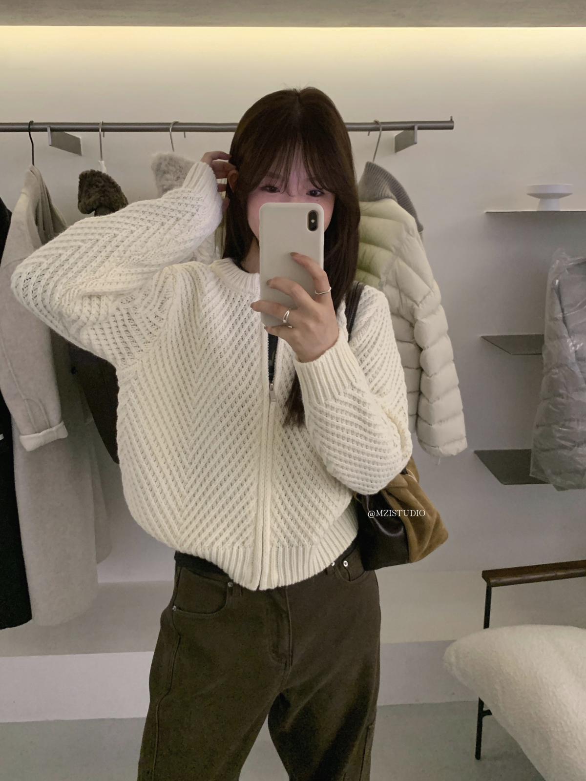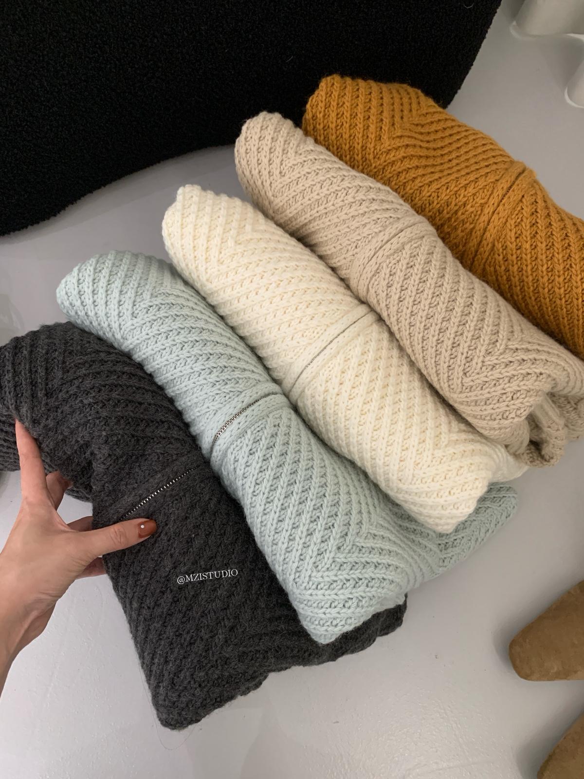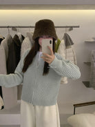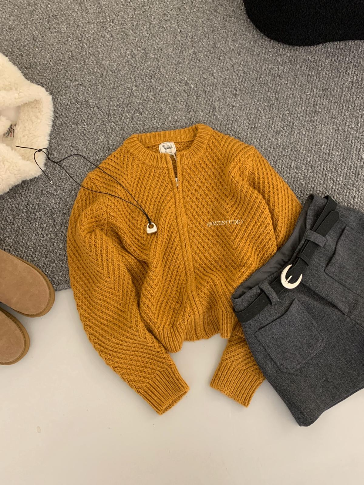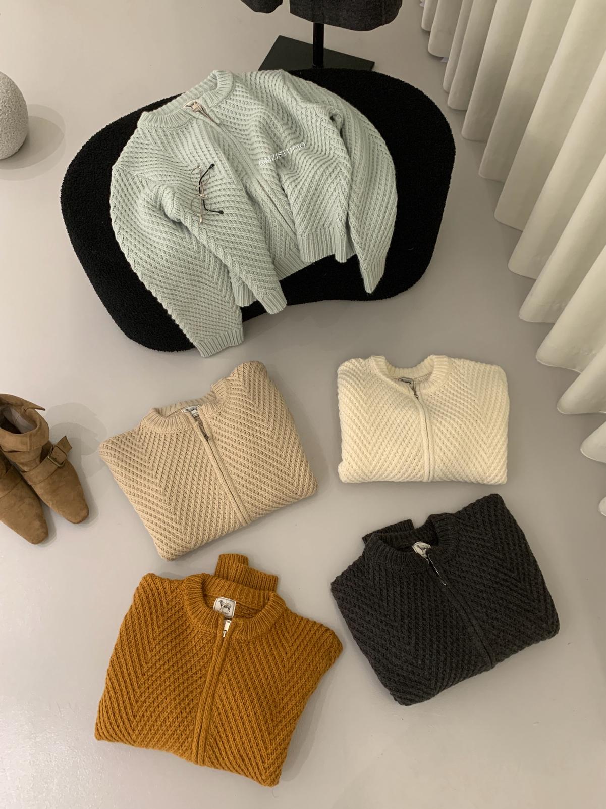 【C7998】輕盈自在冬季中性色調利落溫暖提花重工拉鍊圓領開衫保暖毛衣