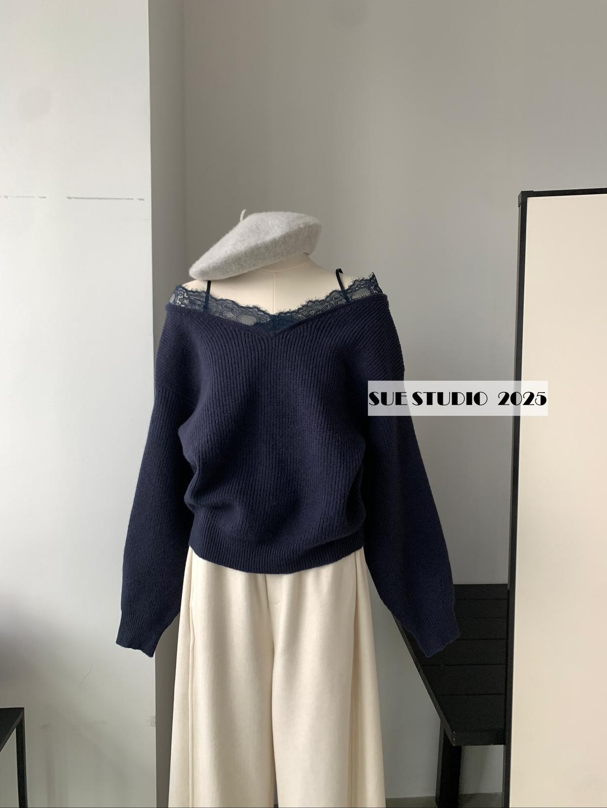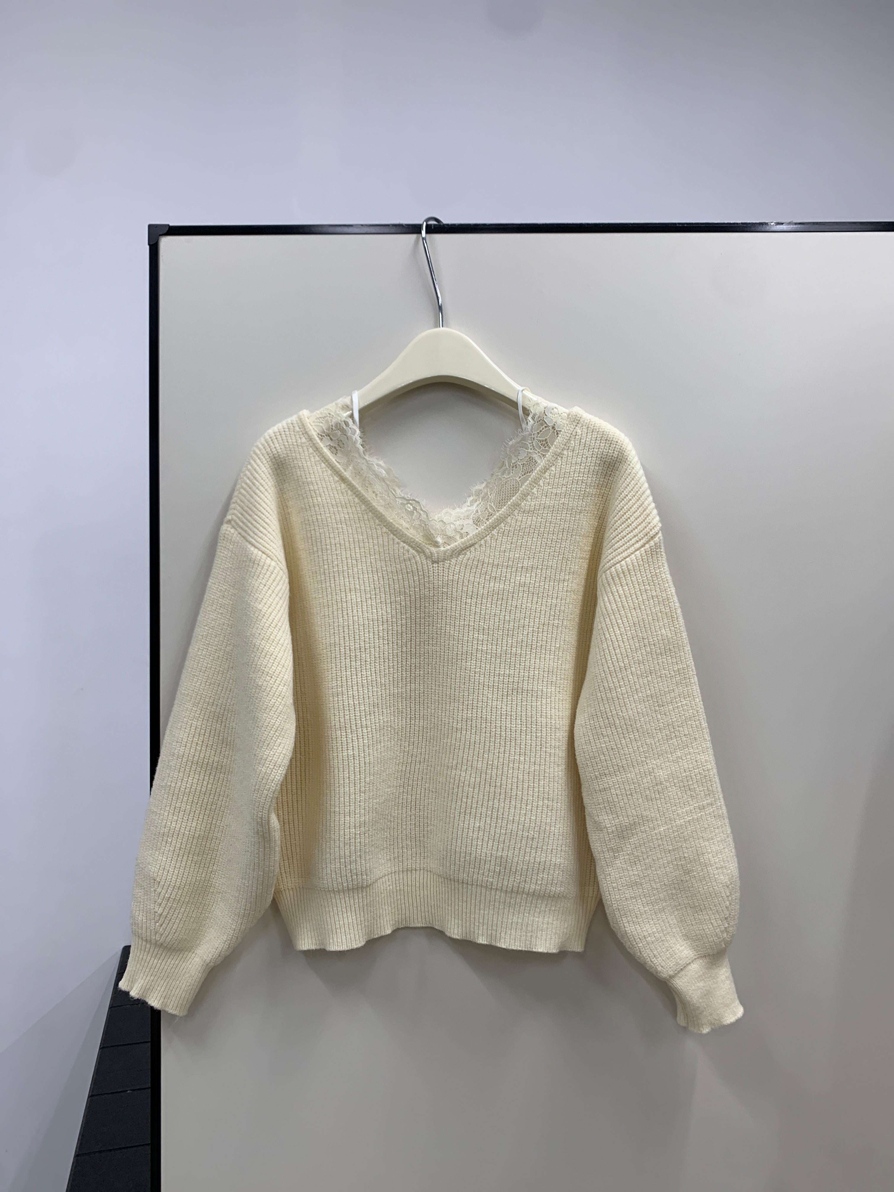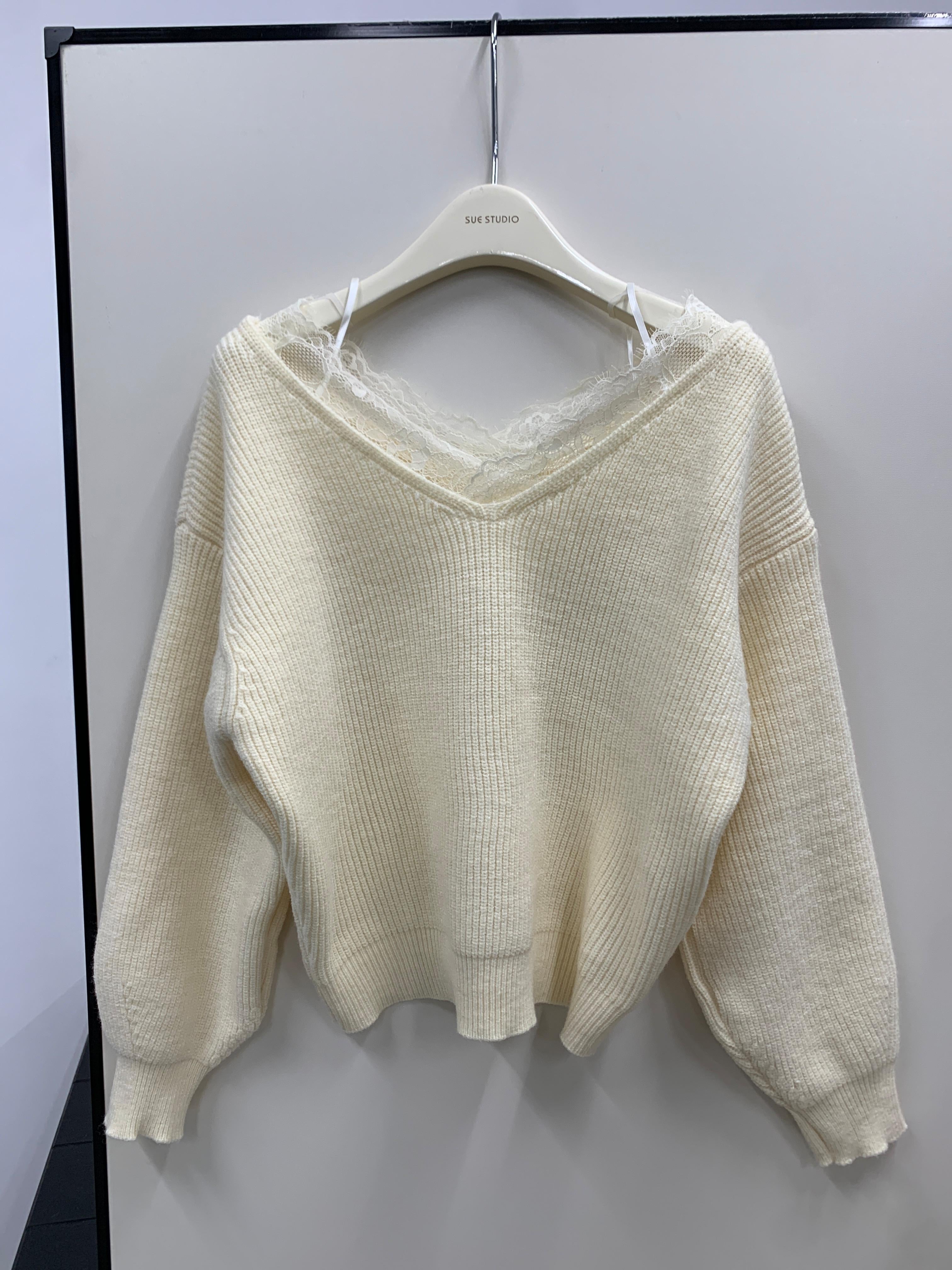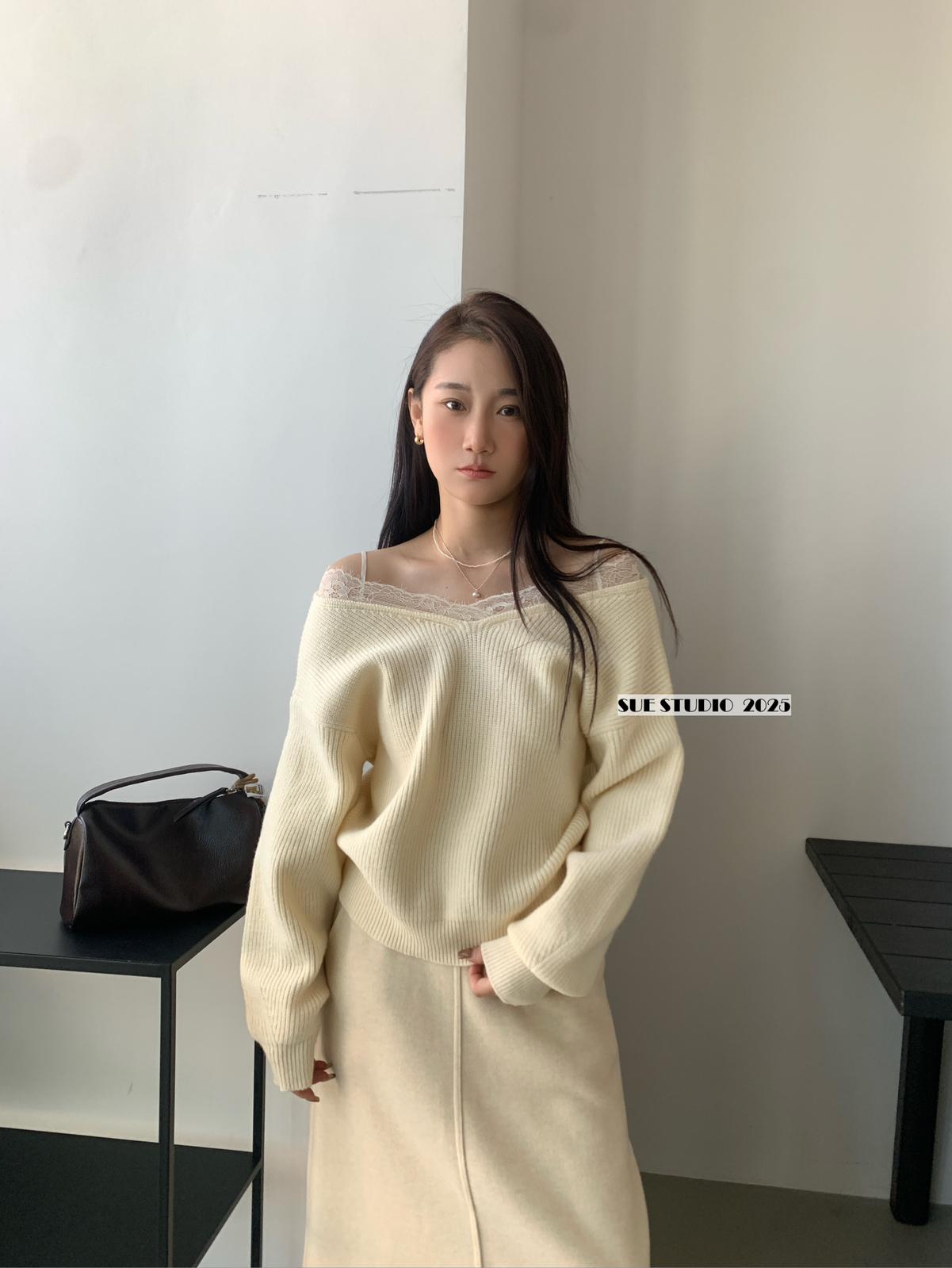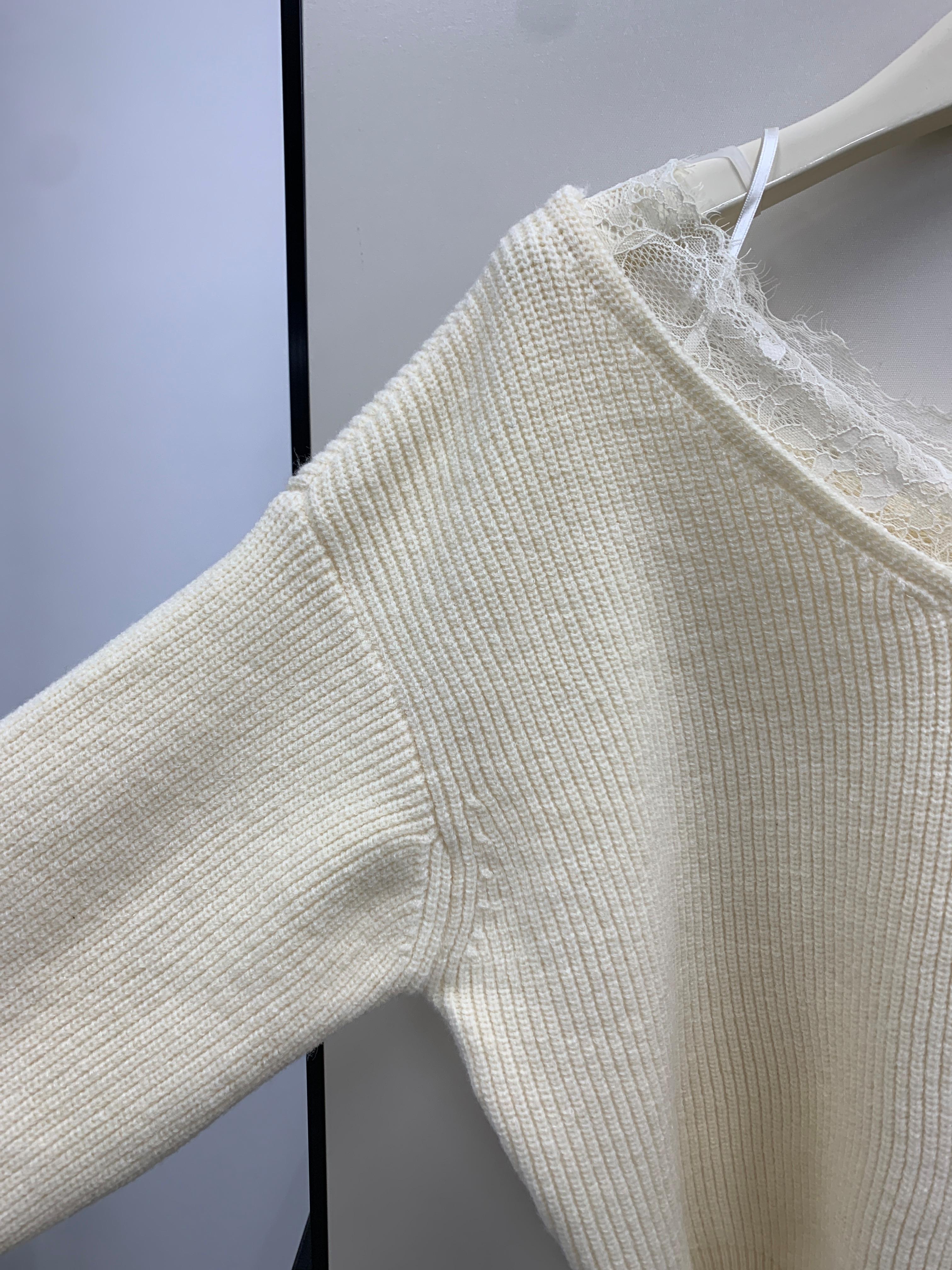 【C8020】韓系蕾絲小設計感一字領毛衣