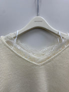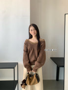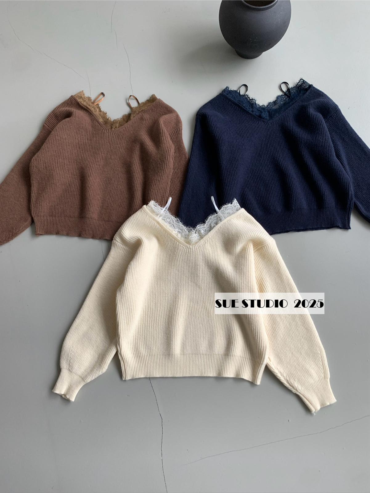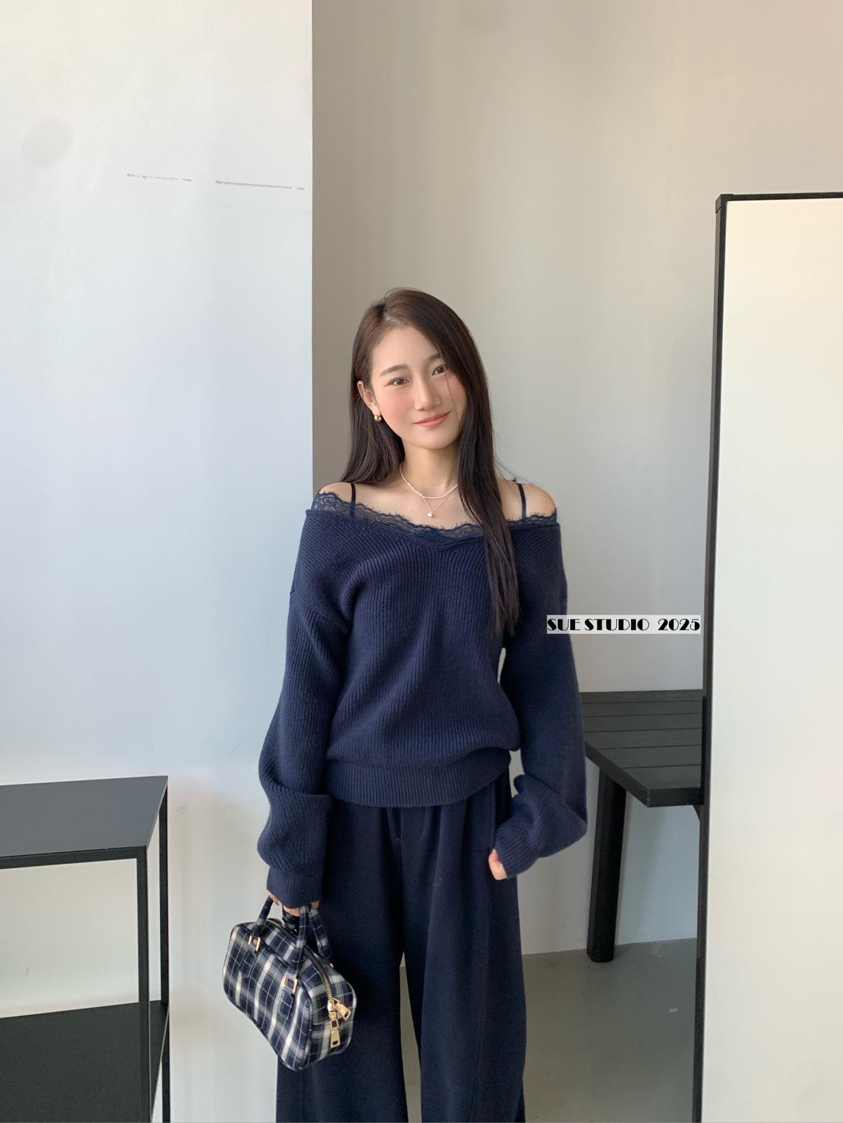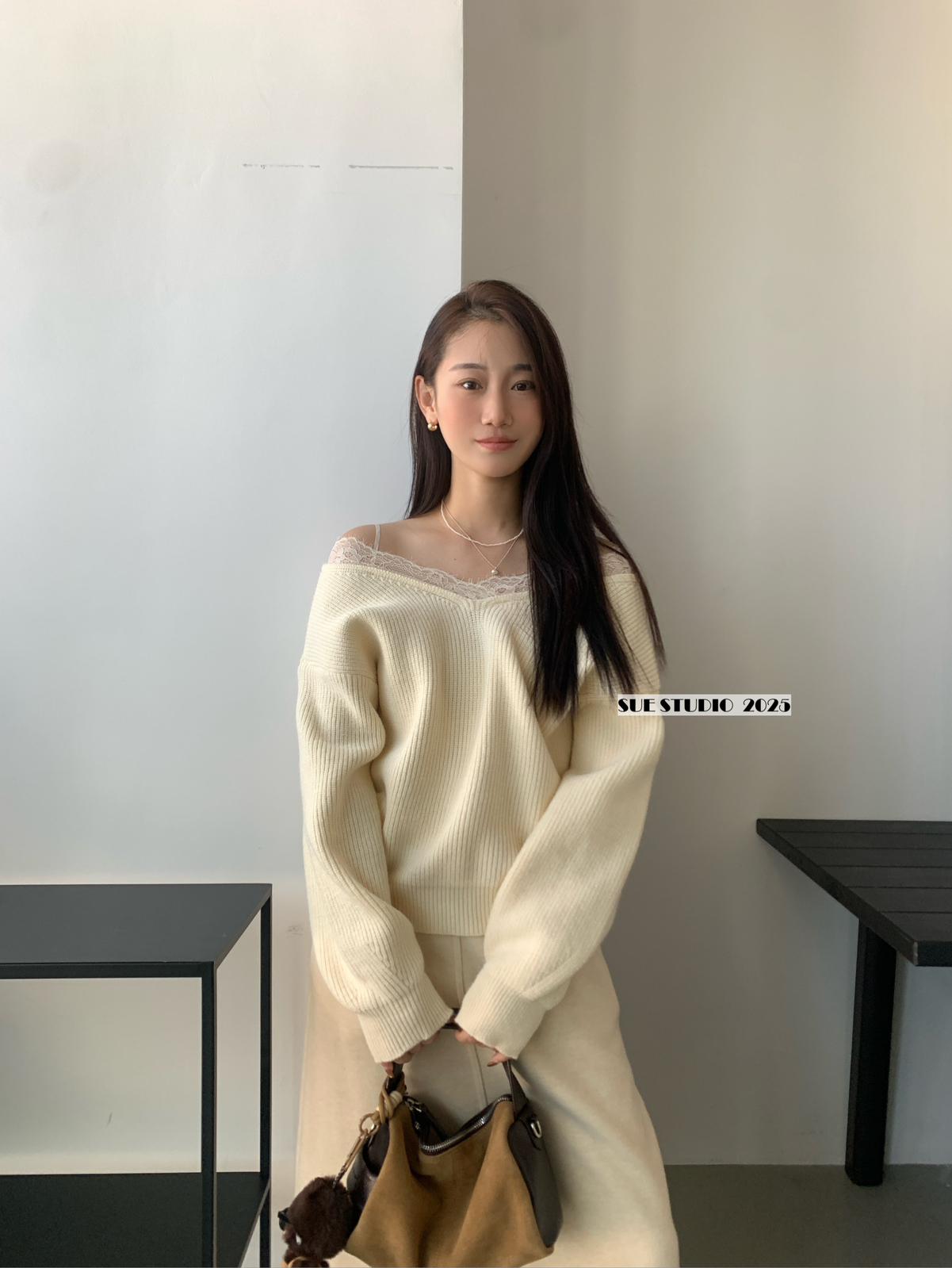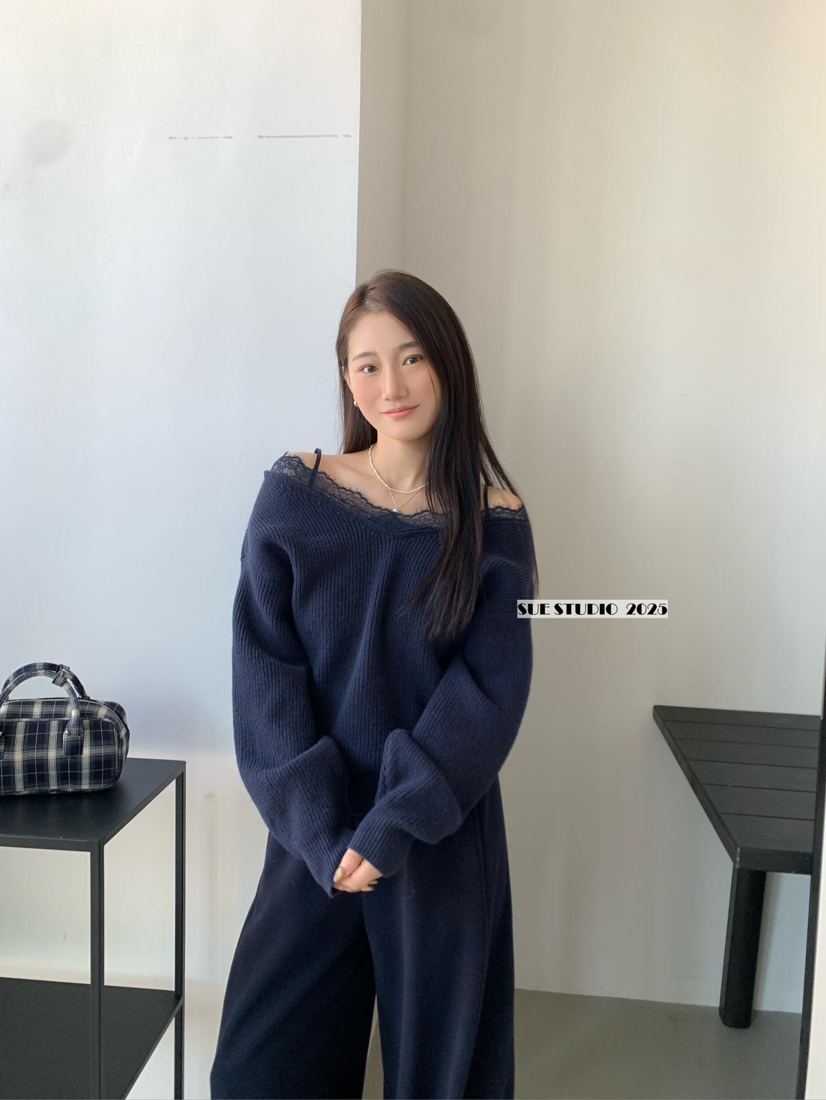 【C8020】韓系蕾絲小設計感一字領毛衣