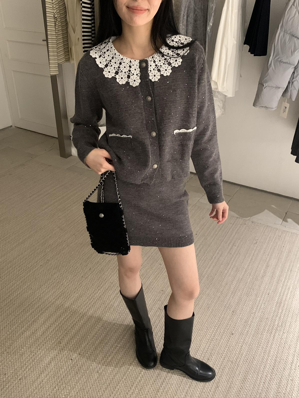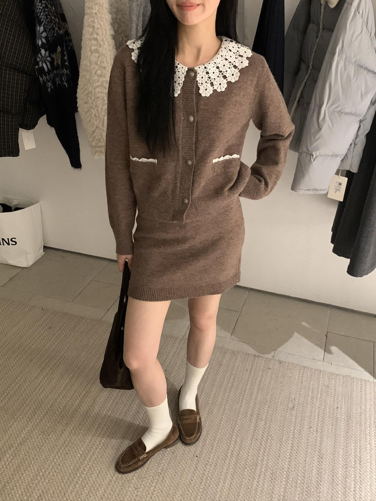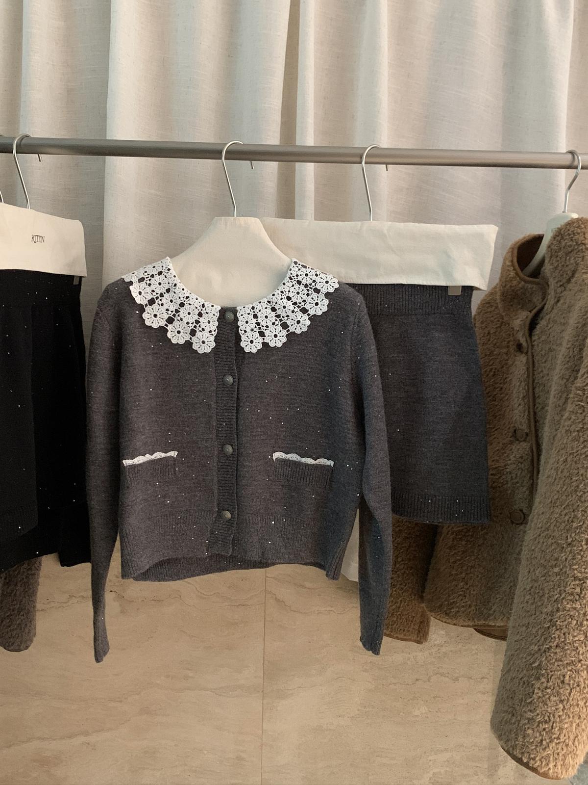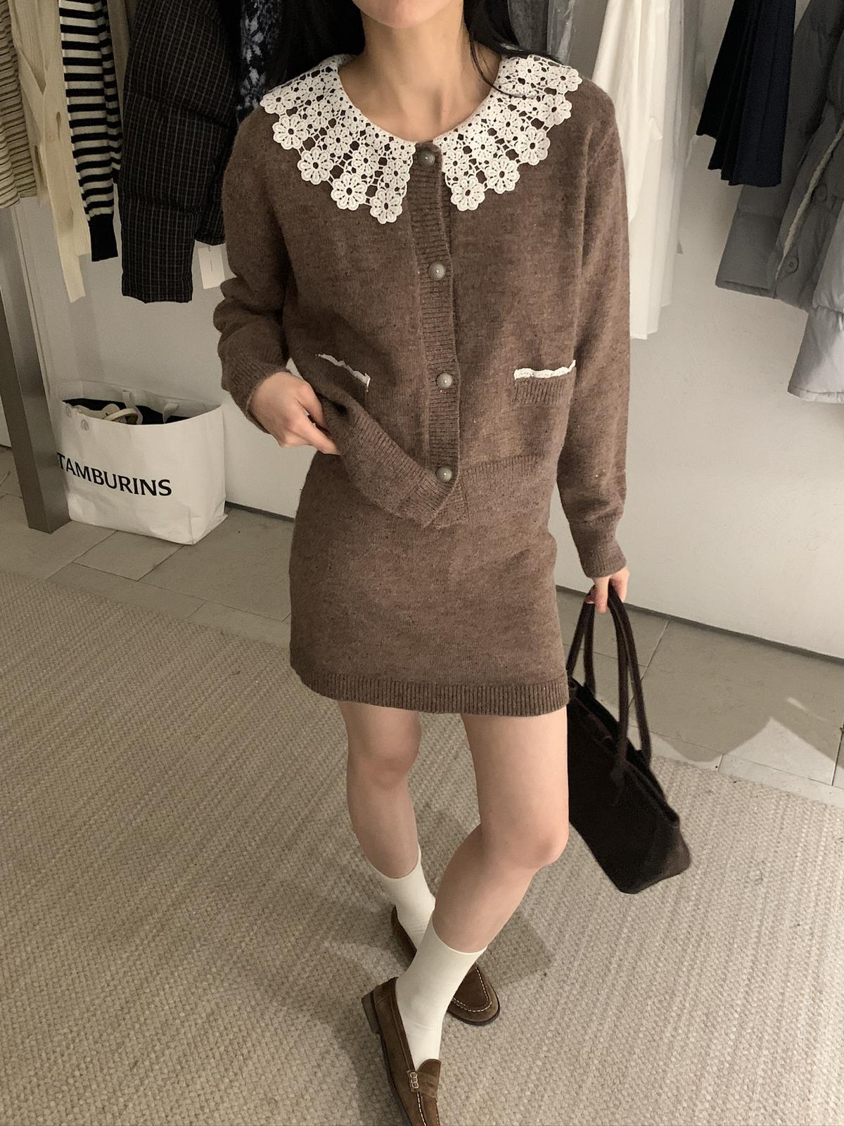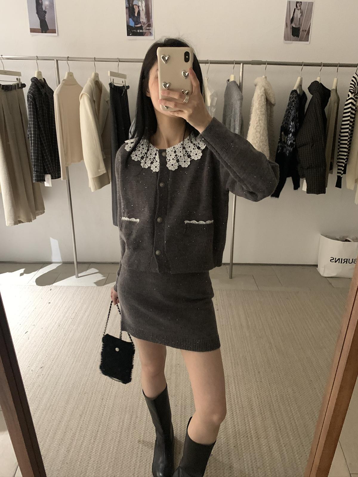【C8033】韓系復古甜美花邊開衫毛衣+高腰半身裙套裝