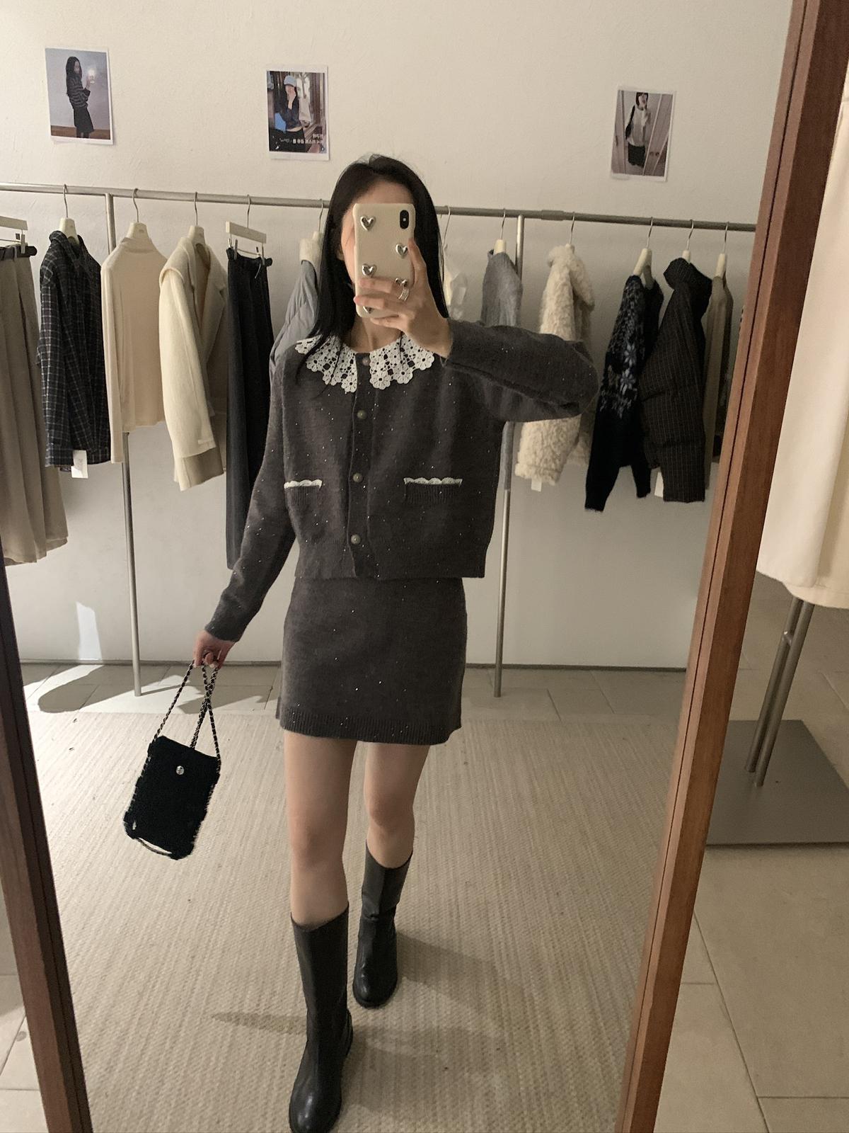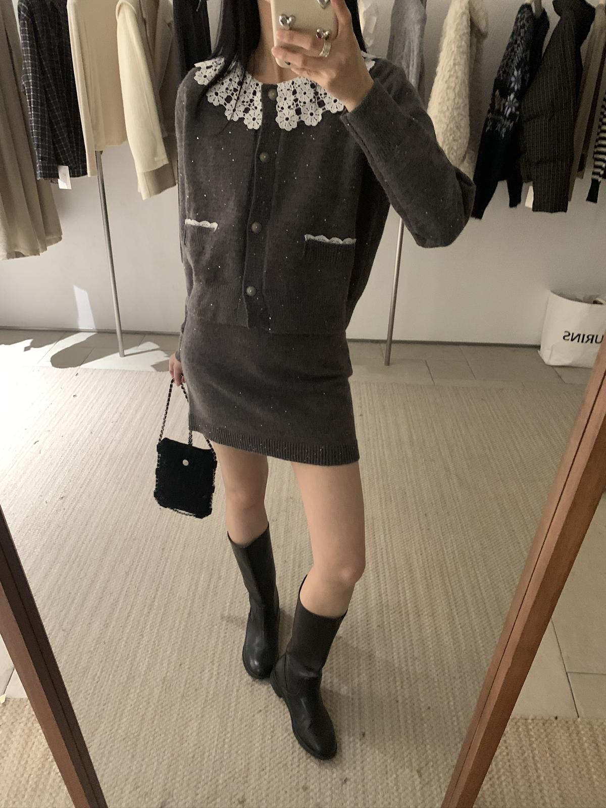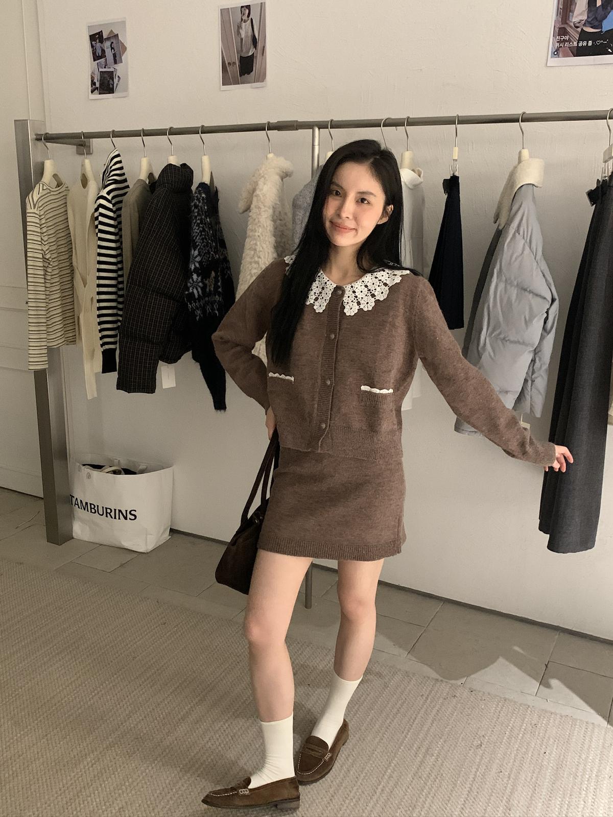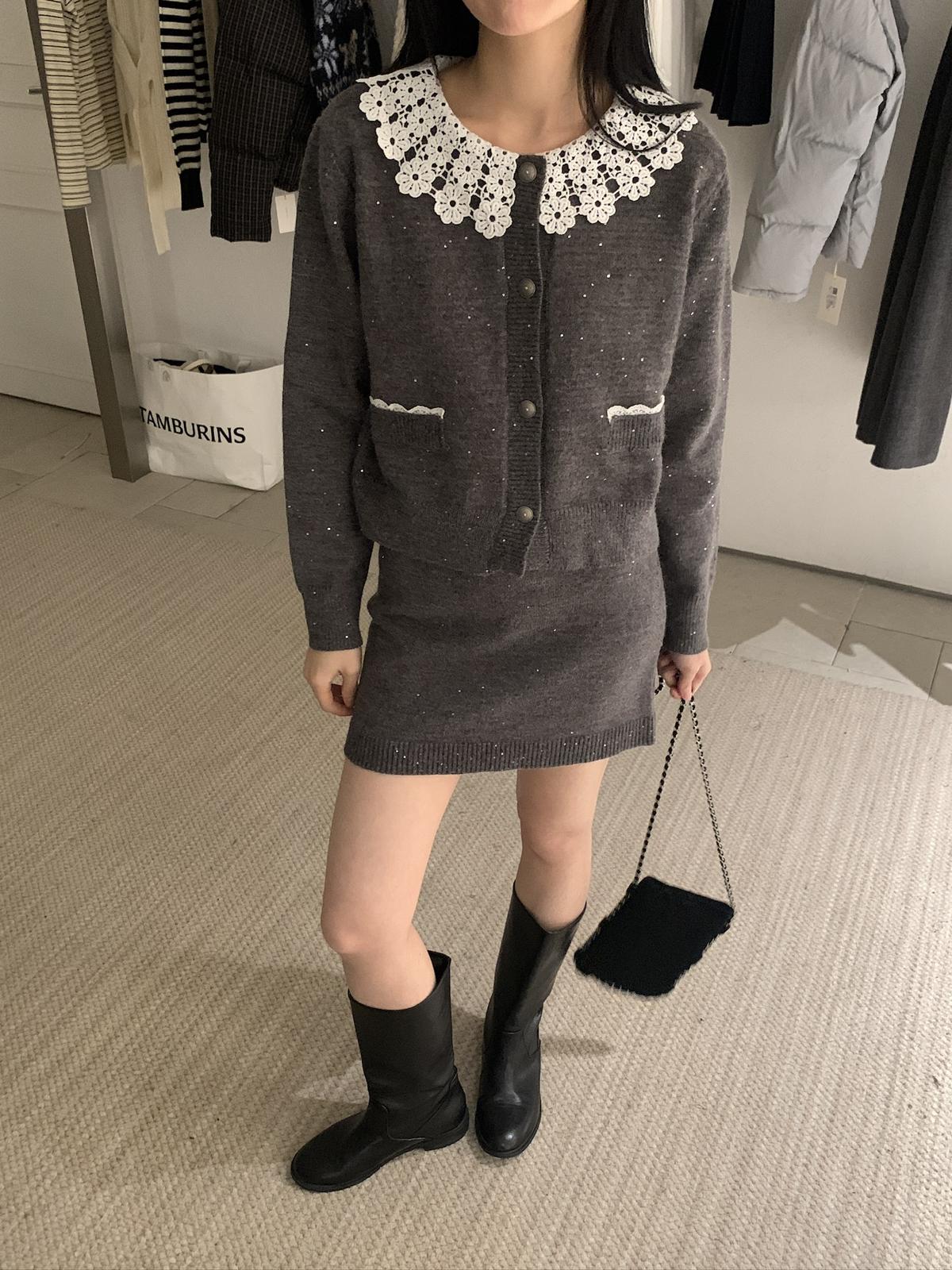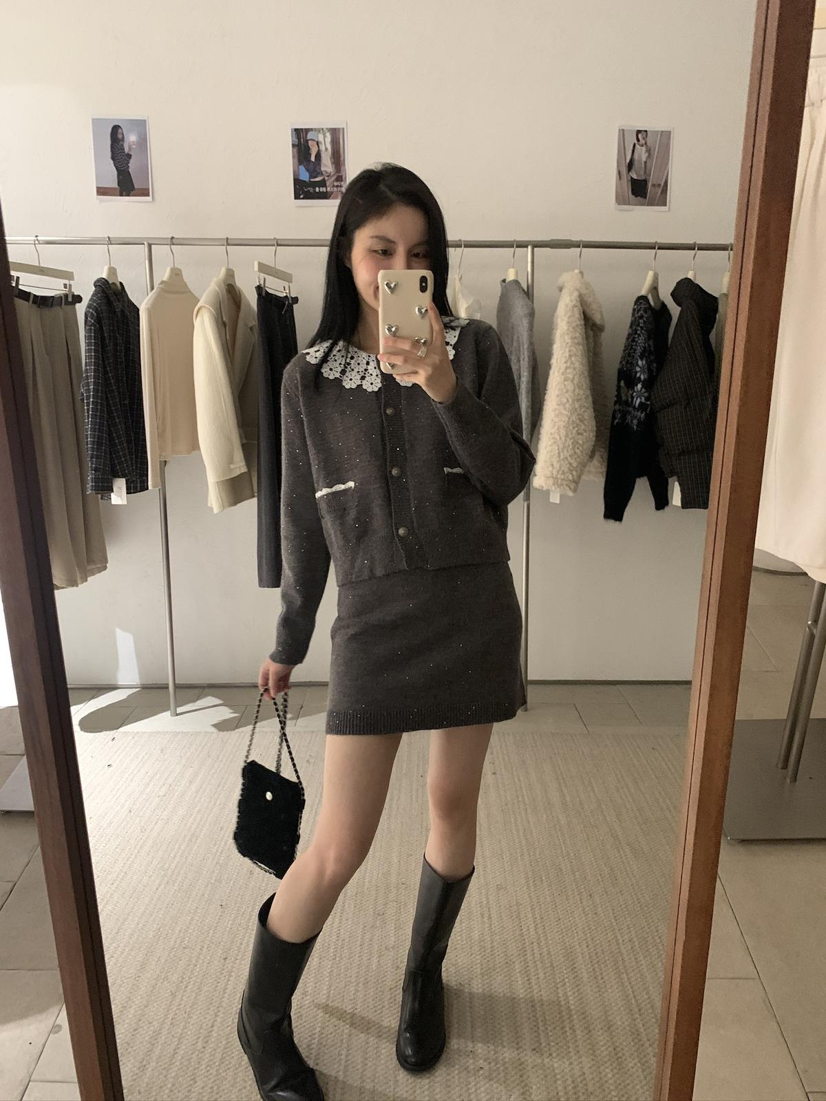 【C8033】韓系復古甜美花邊開衫毛衣+高腰半身裙套裝