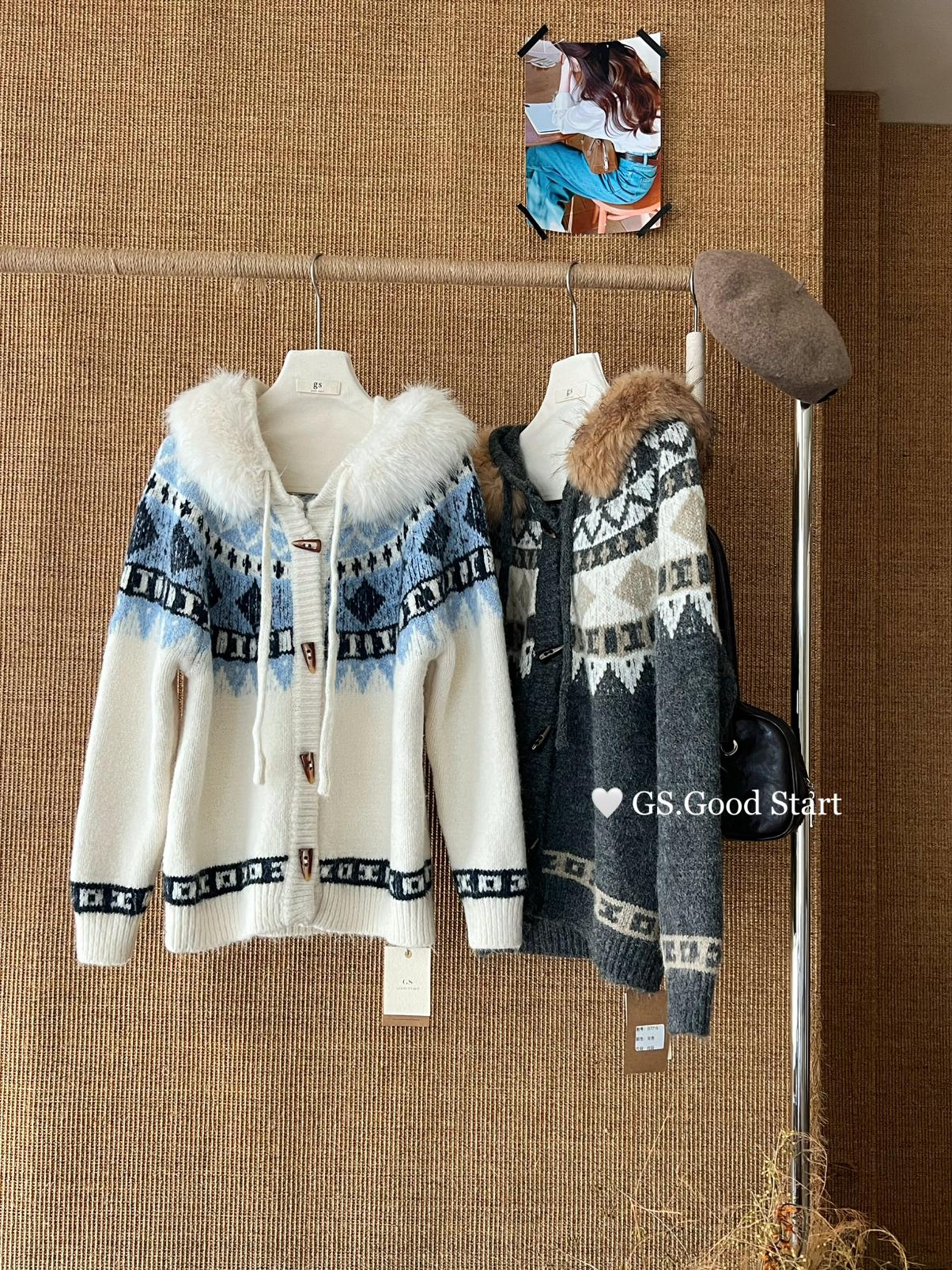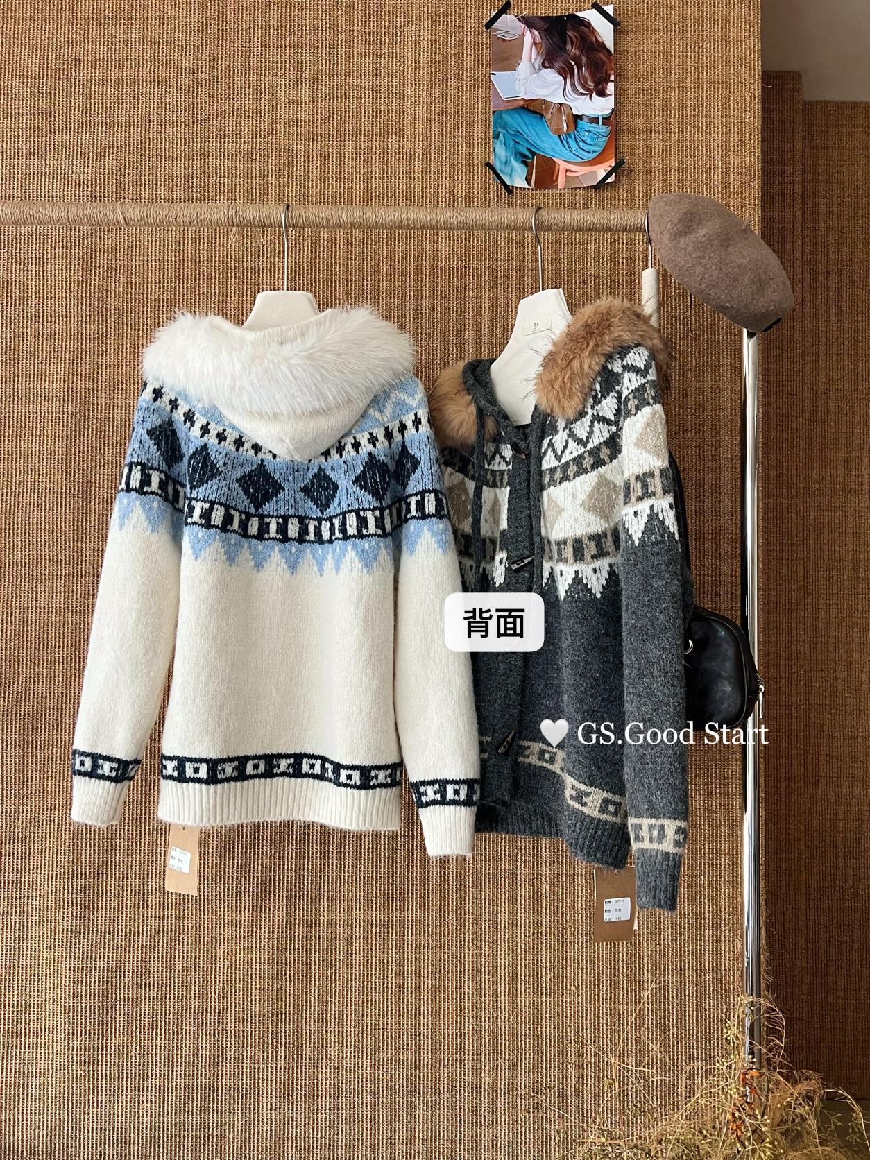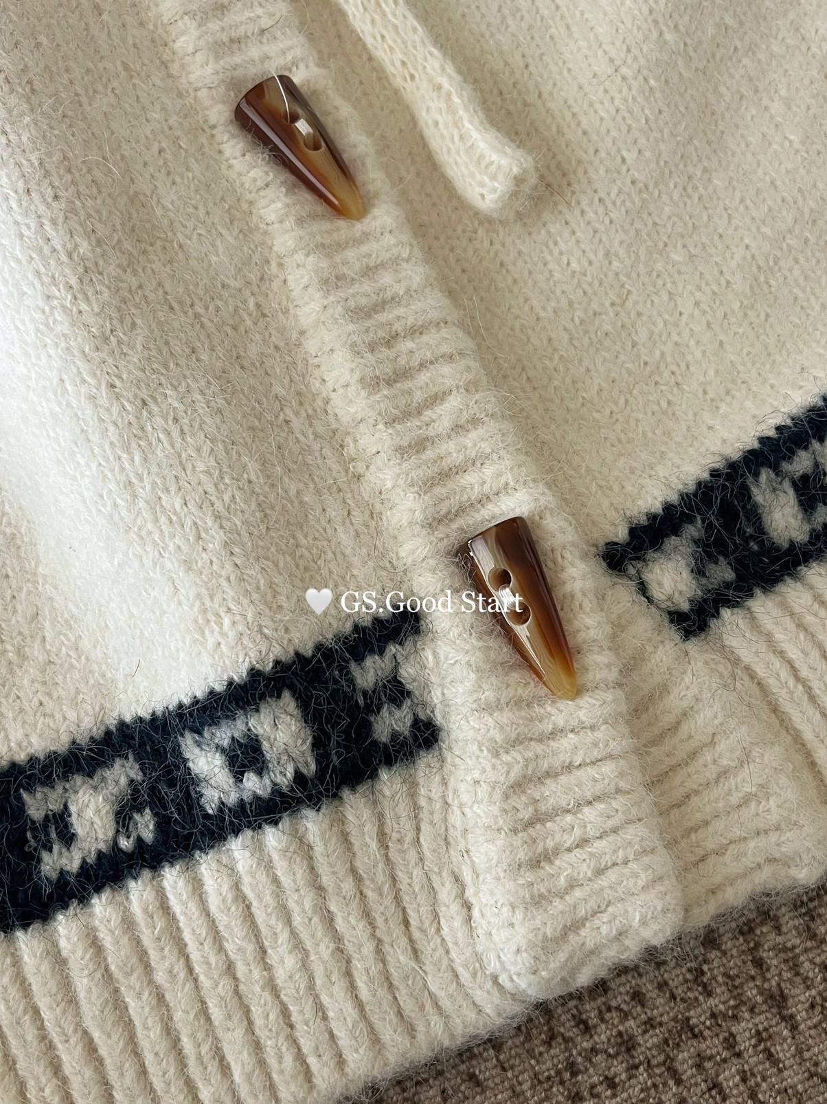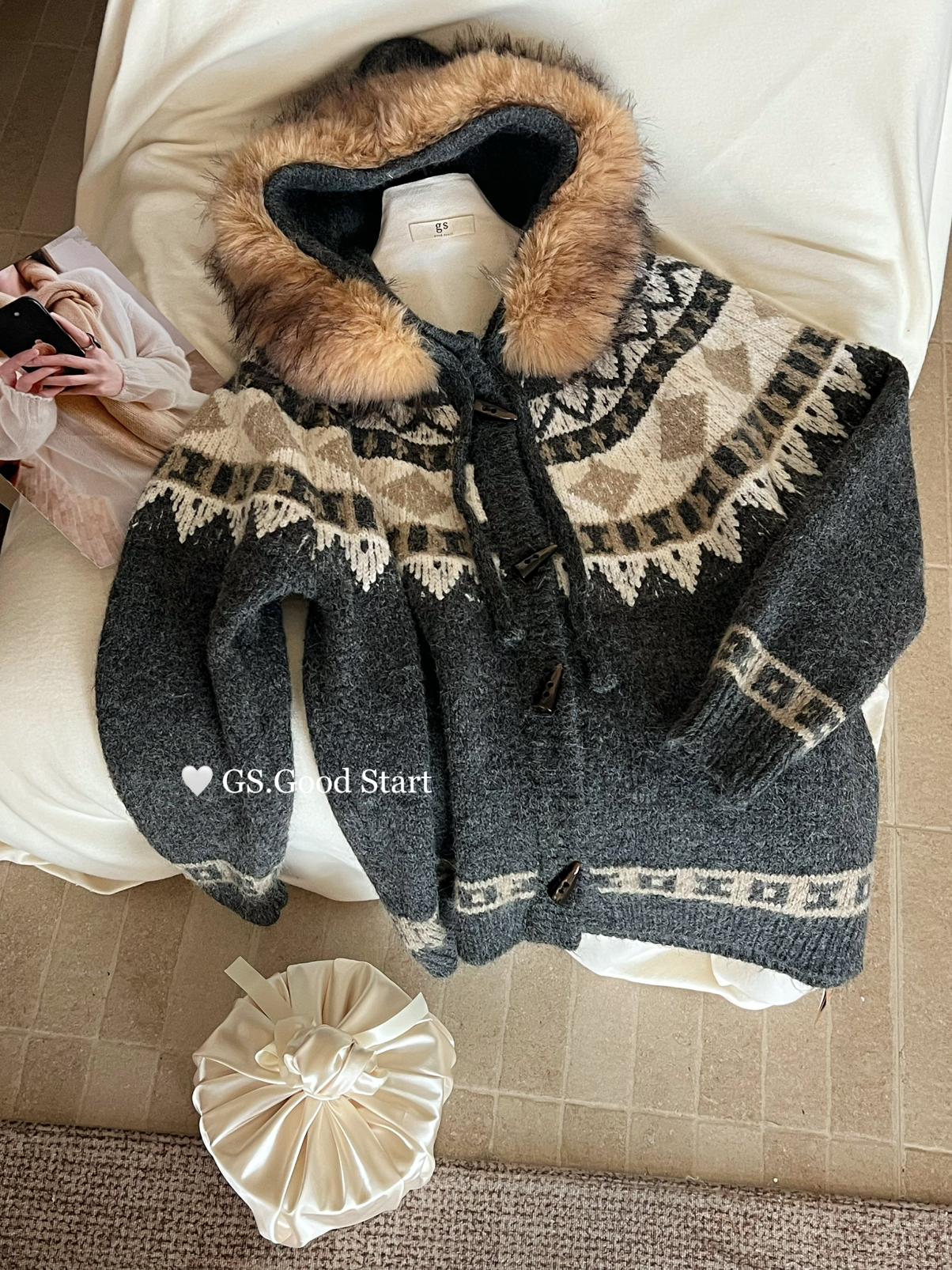 【C8038】超級火!冬季氛圍感拉滿!韓系甜美復古提花牛角扣寬鬆連帽保暖毛衣(配可拆卸毛領)