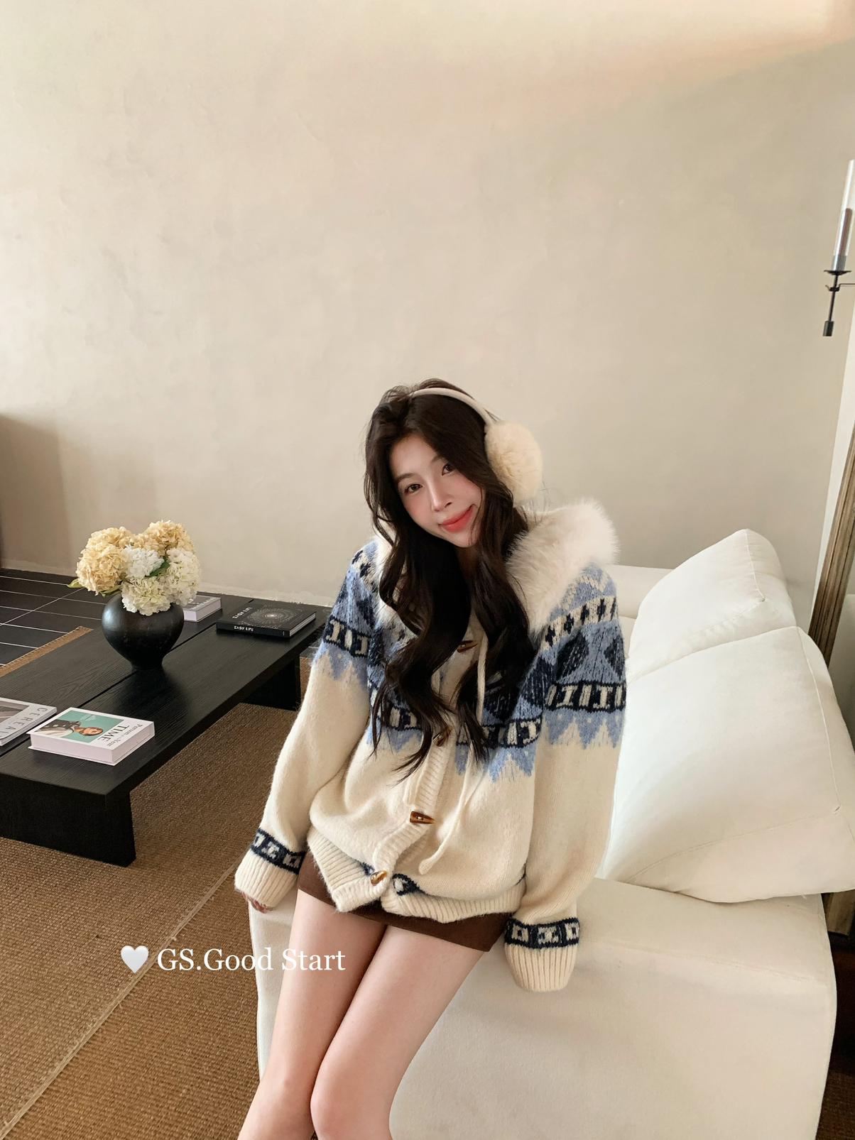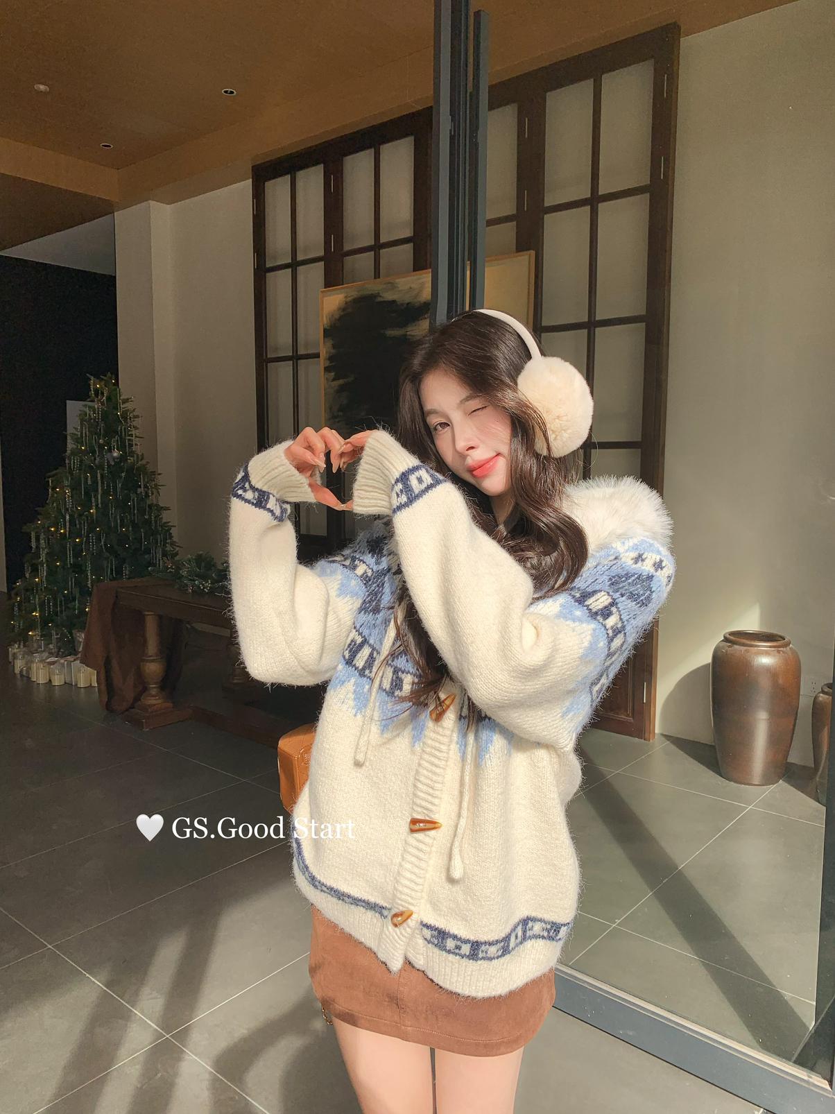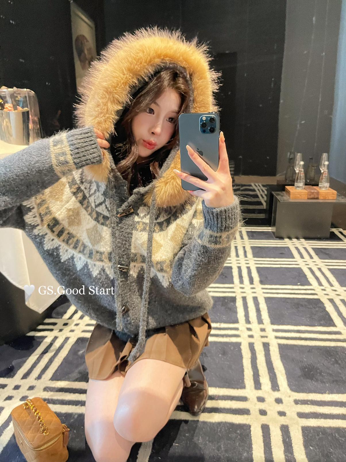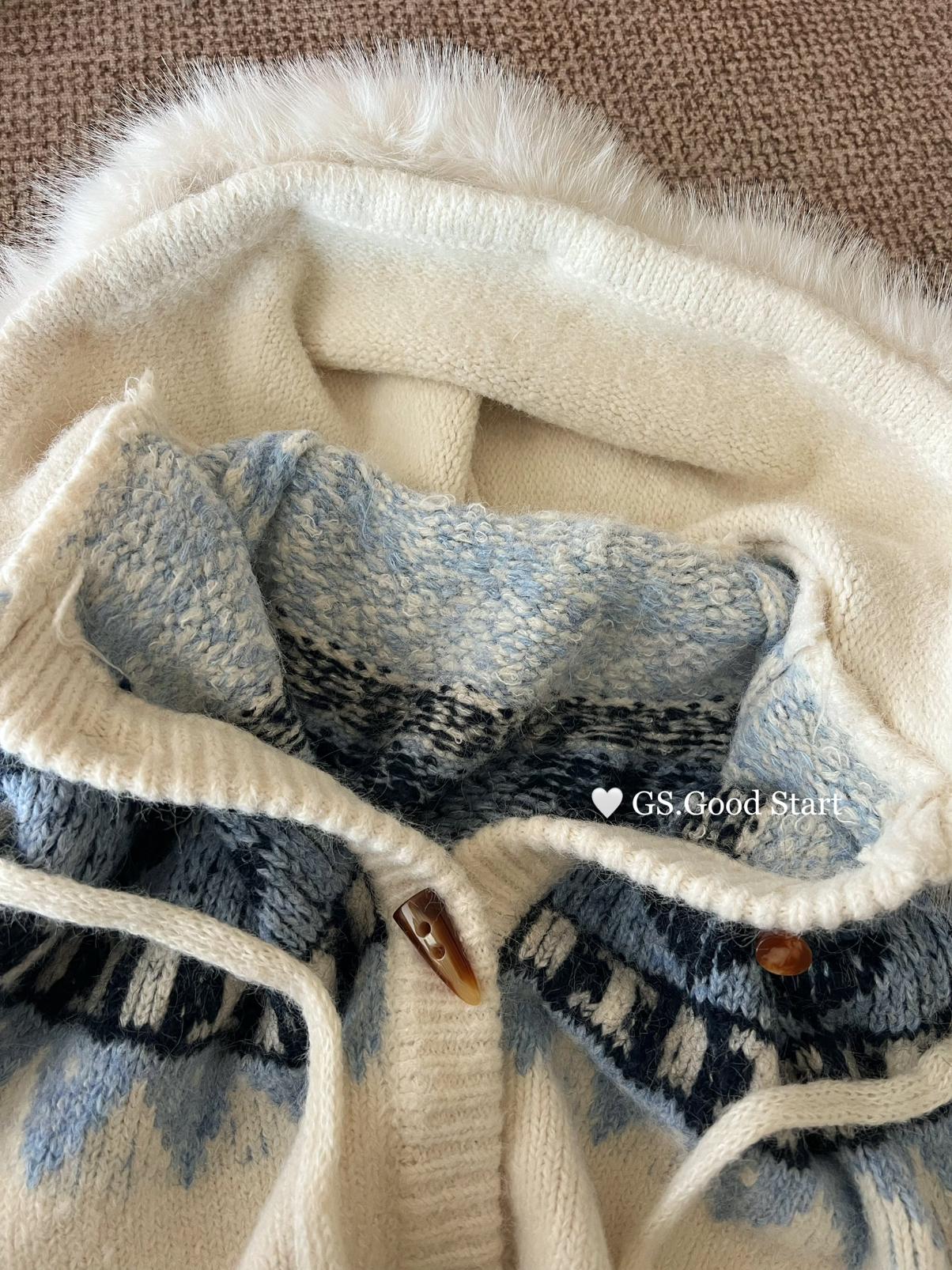 【C8038】超級火!冬季氛圍感拉滿!韓系甜美復古提花牛角扣寬鬆連帽保暖毛衣(配可拆卸毛領)