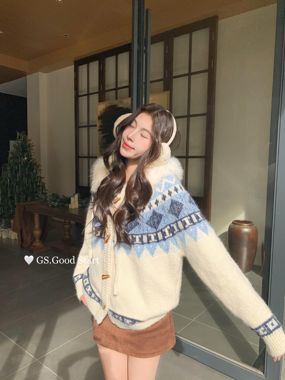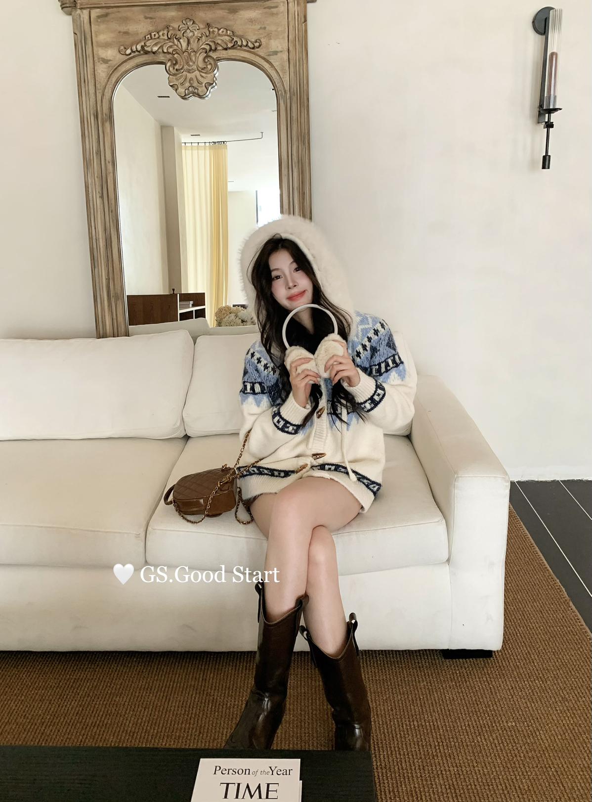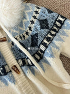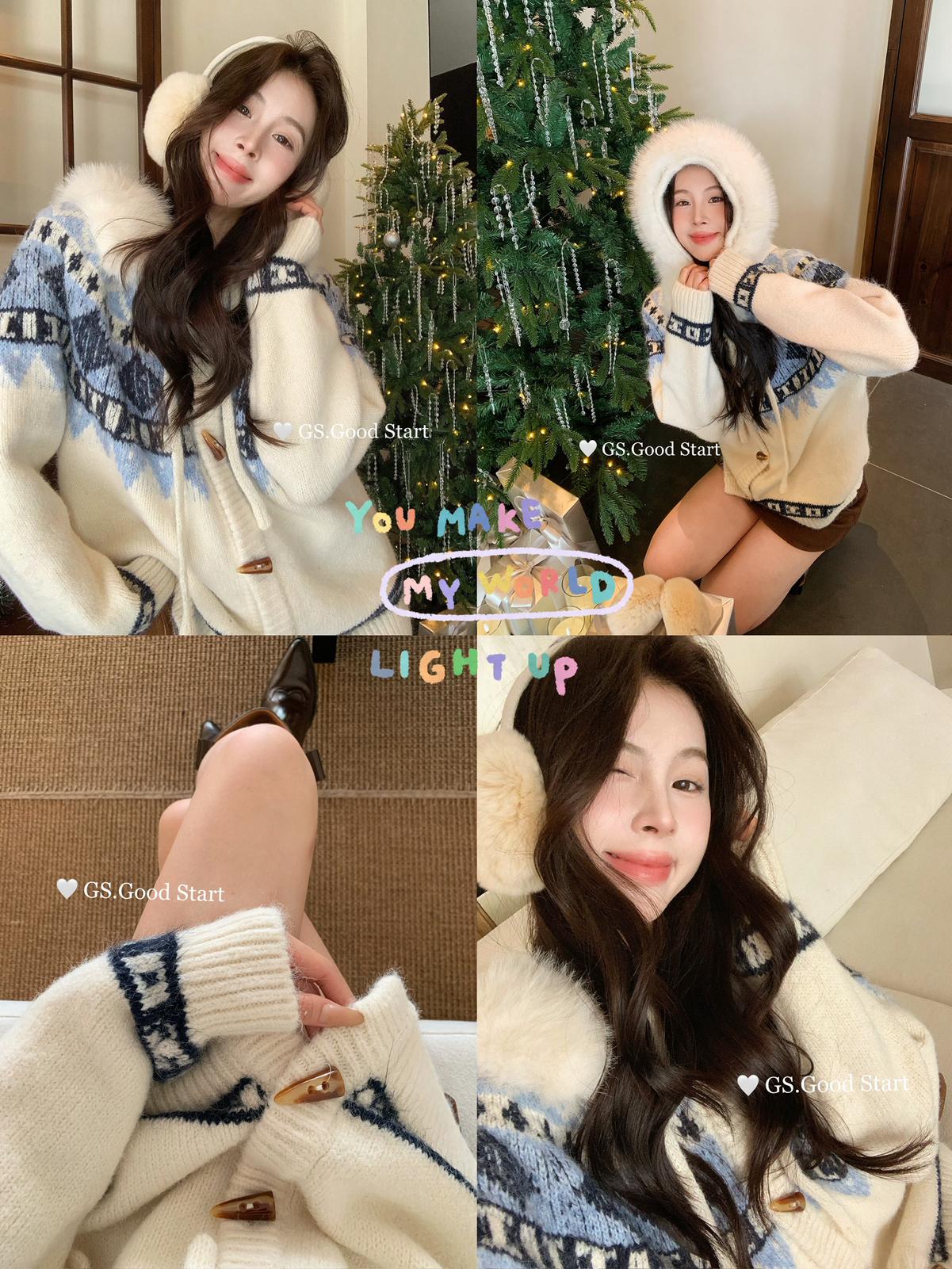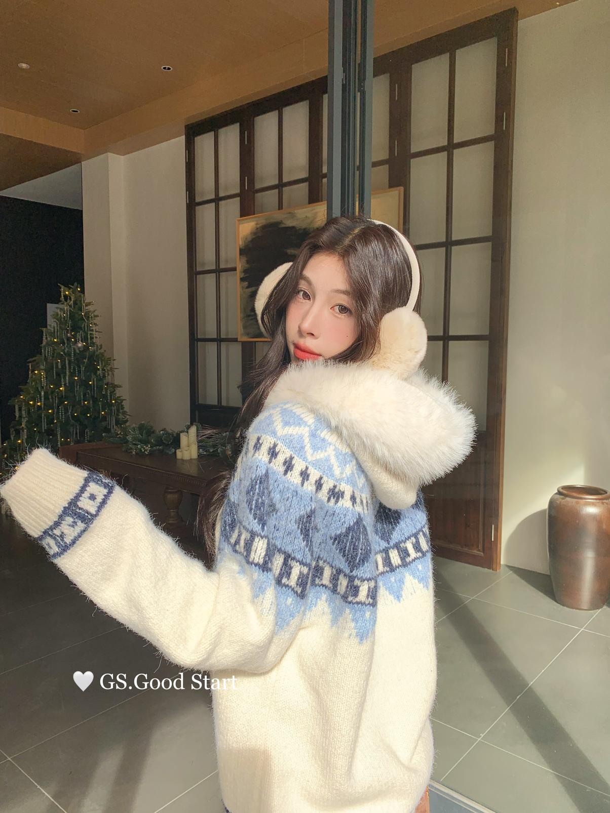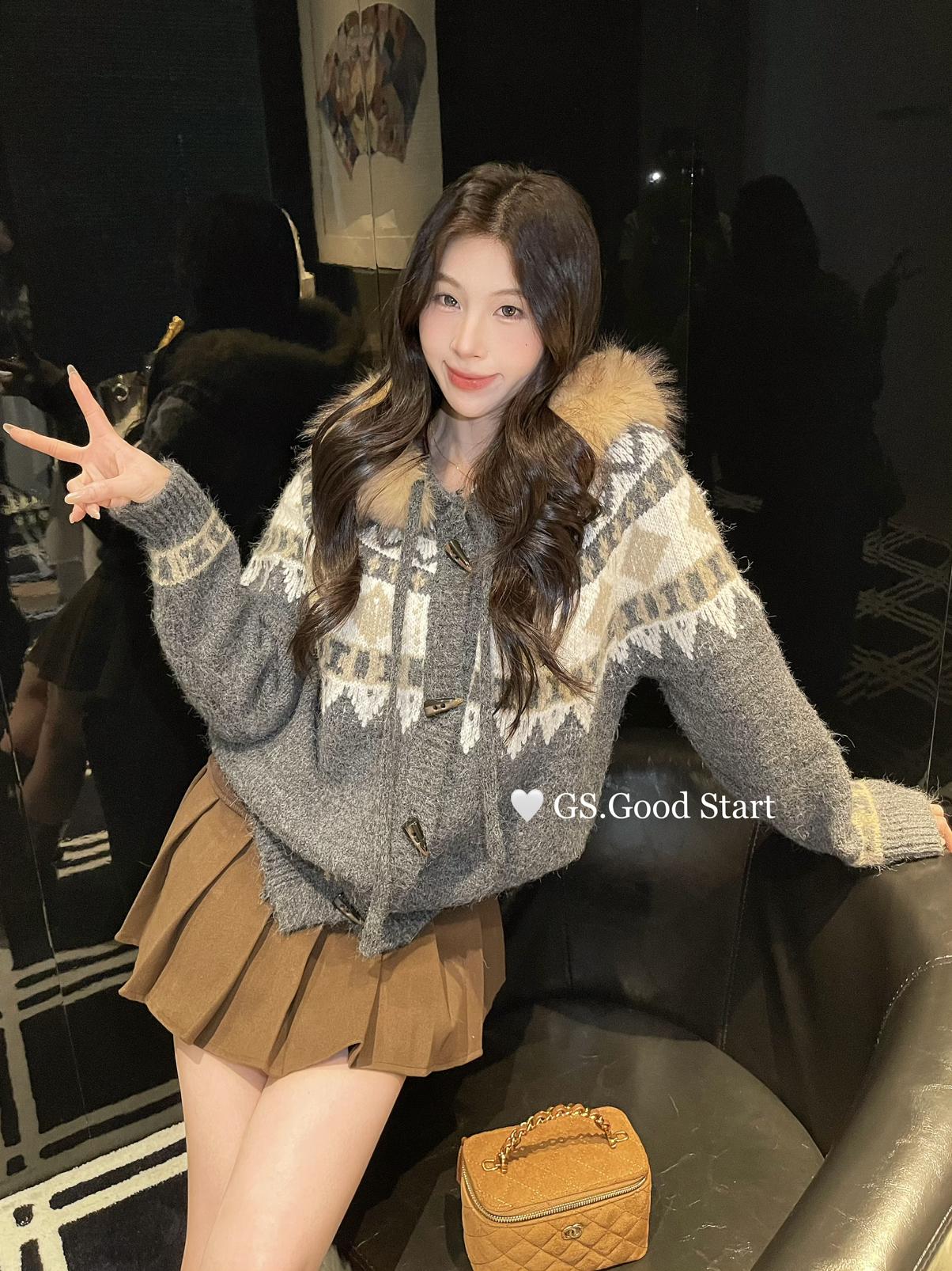 【C8038】超級火!冬季氛圍感拉滿!韓系甜美復古提花牛角扣寬鬆連帽保暖毛衣(配可拆卸毛領)