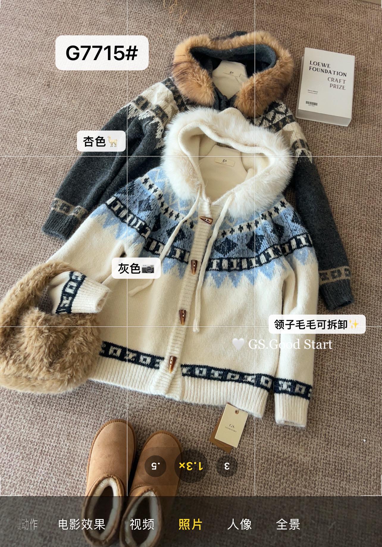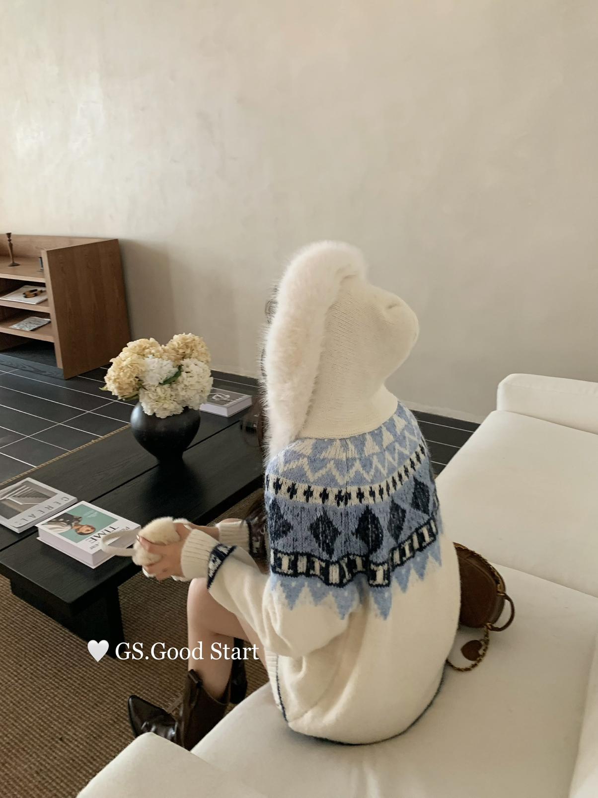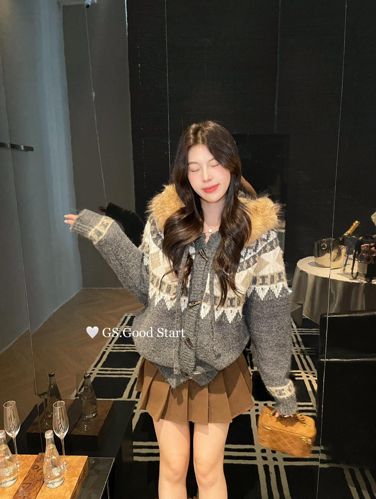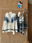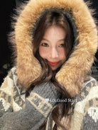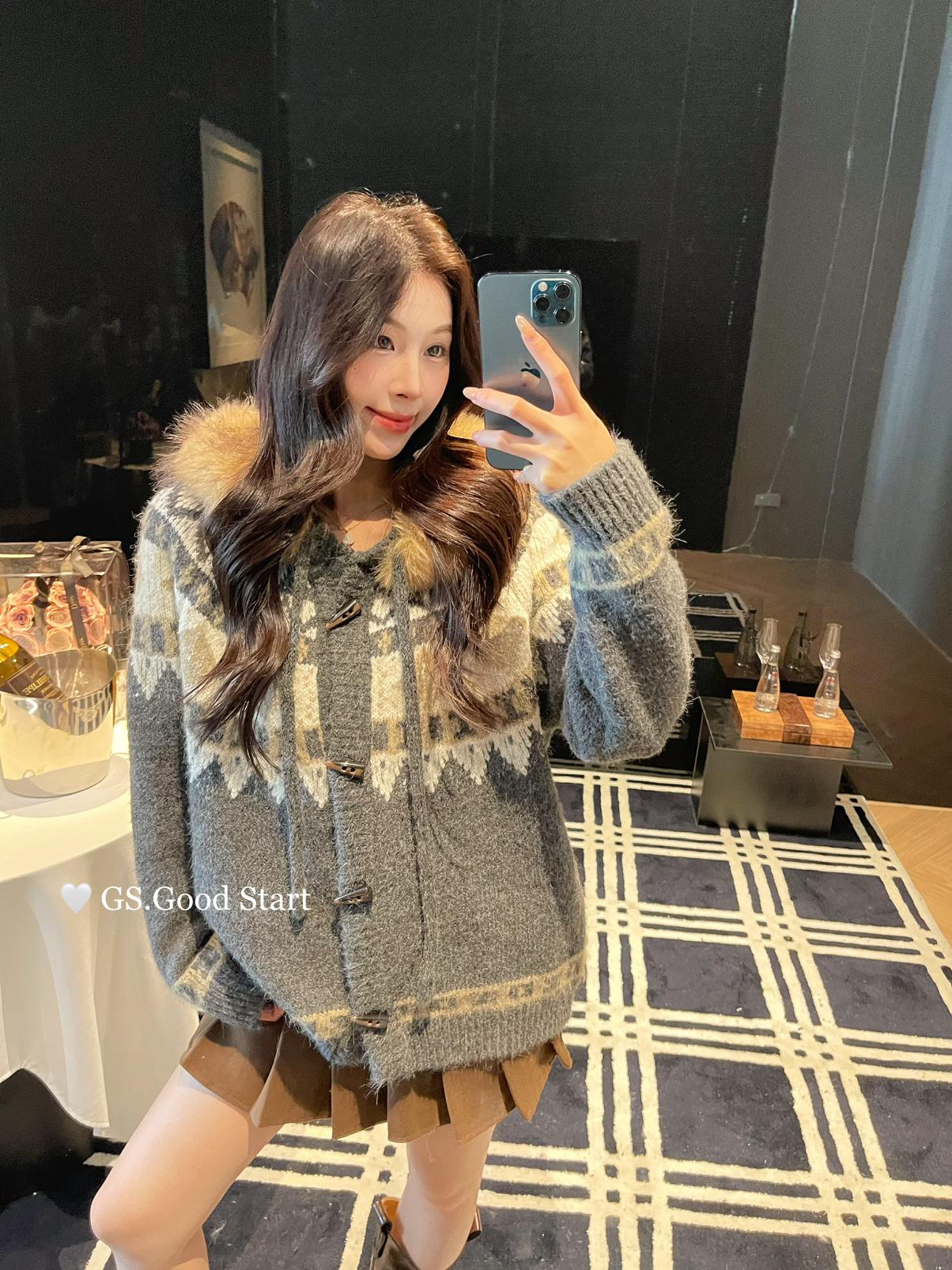 【C8038】超級火!冬季氛圍感拉滿!韓系甜美復古提花牛角扣寬鬆連帽保暖毛衣(配可拆卸毛領)