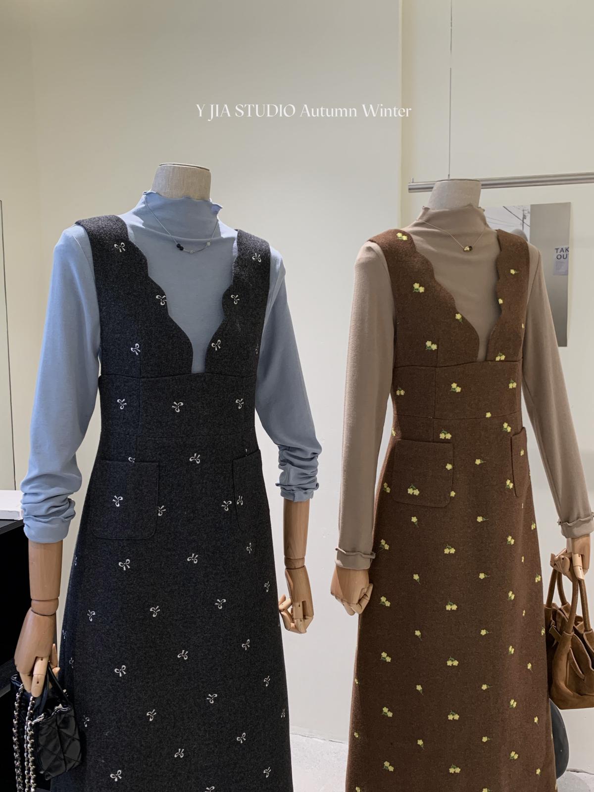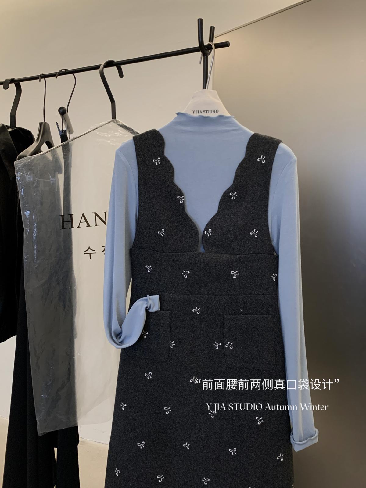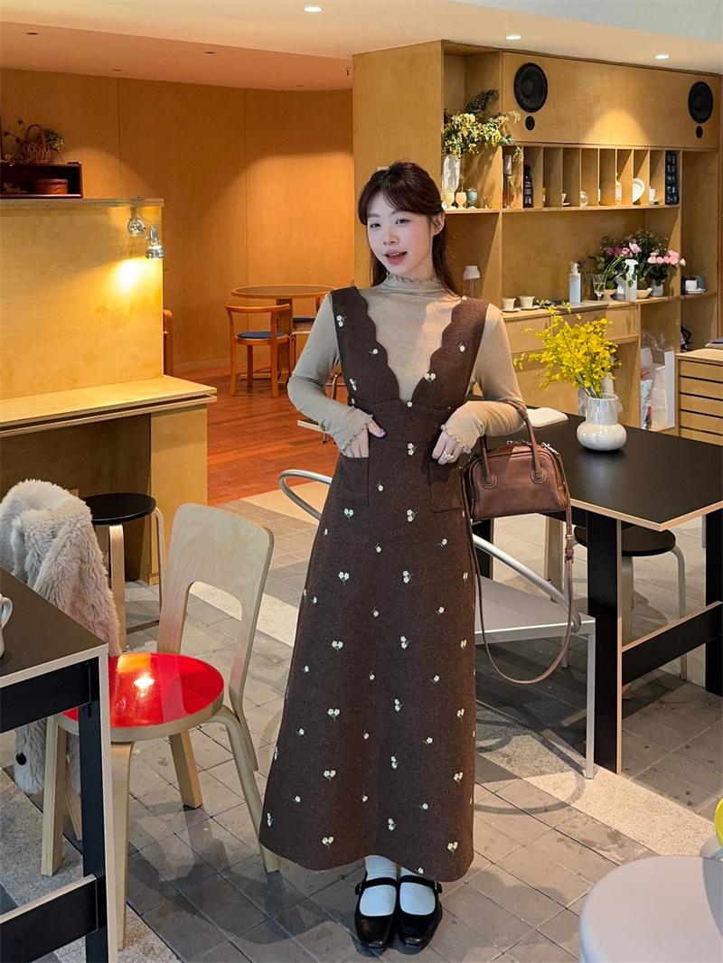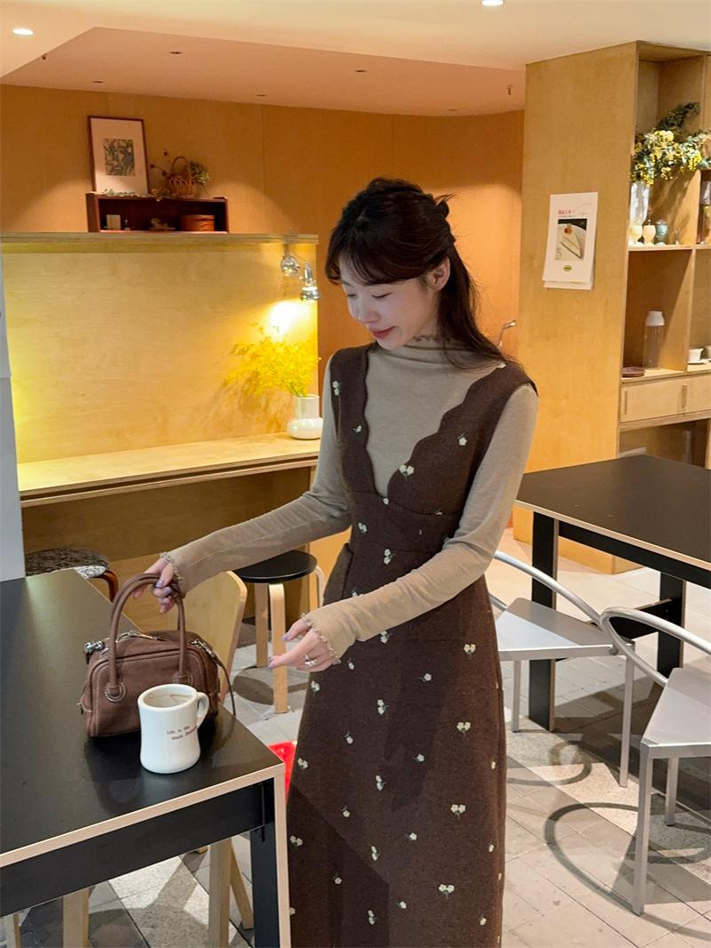 【C8044】韓版設計感重工刺繡背心連衣裙+半高領修身打底衫套裝