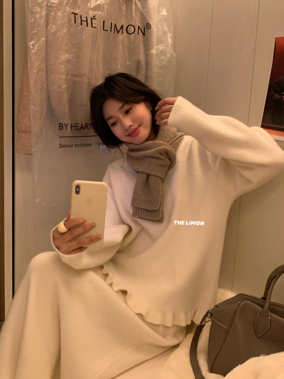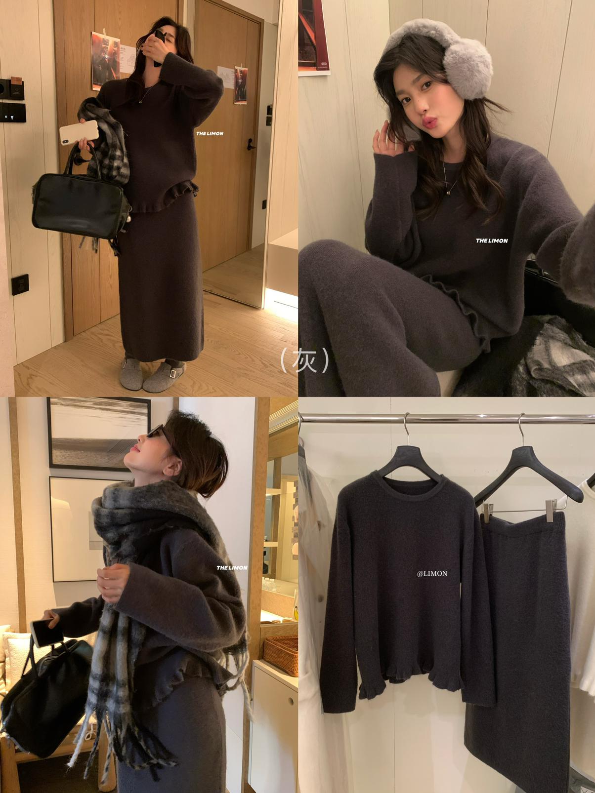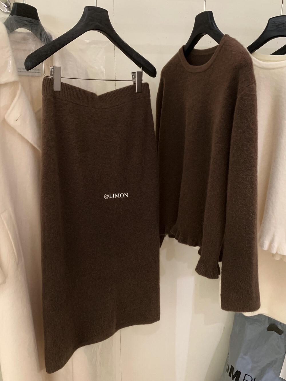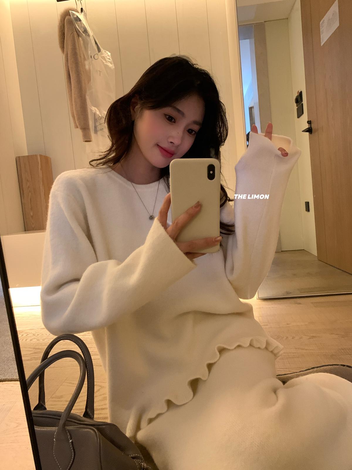 【C8048】慵懶木耳邊圓領毛衣+鬆緊腰顯瘦半身裙套裝