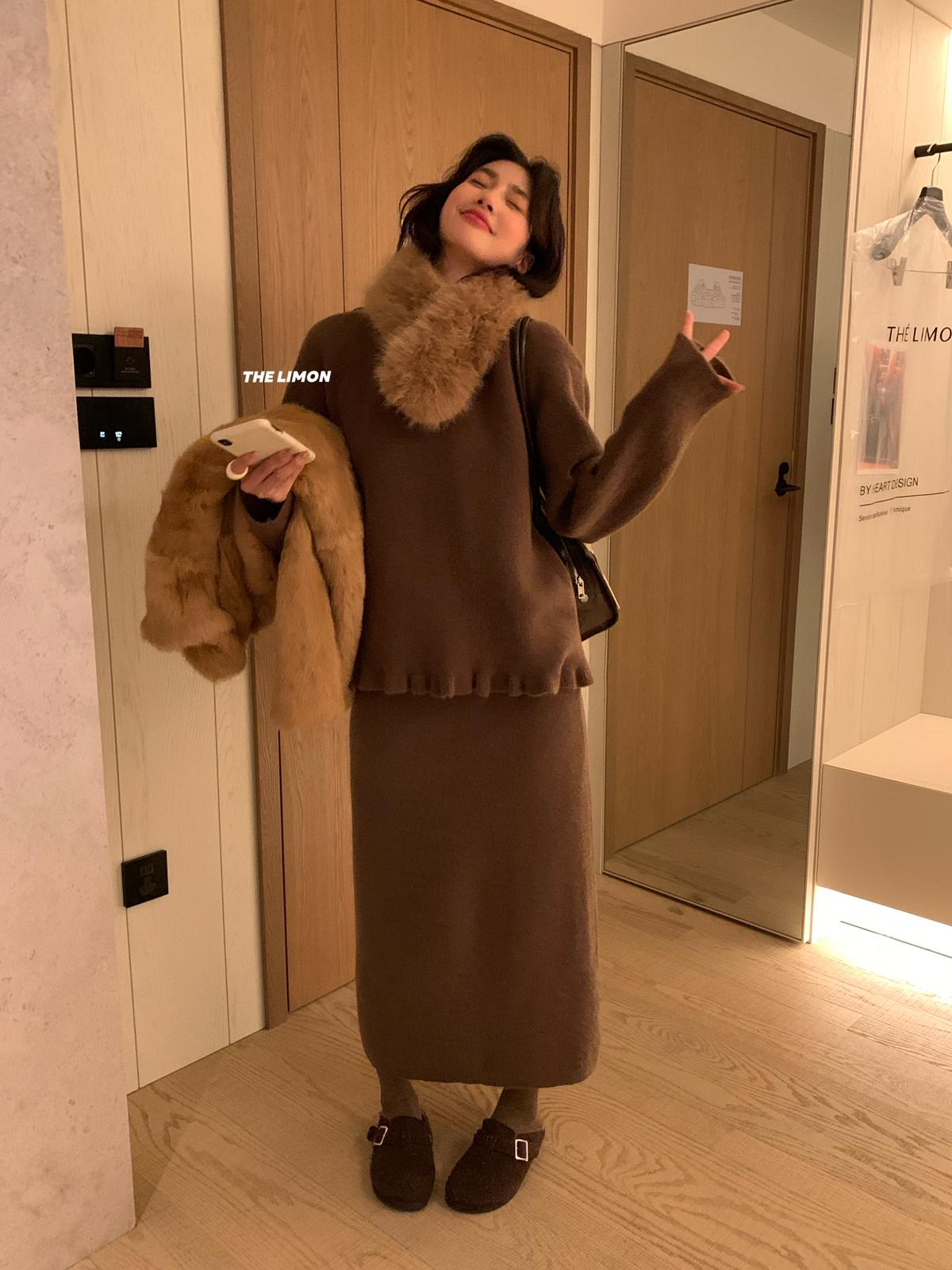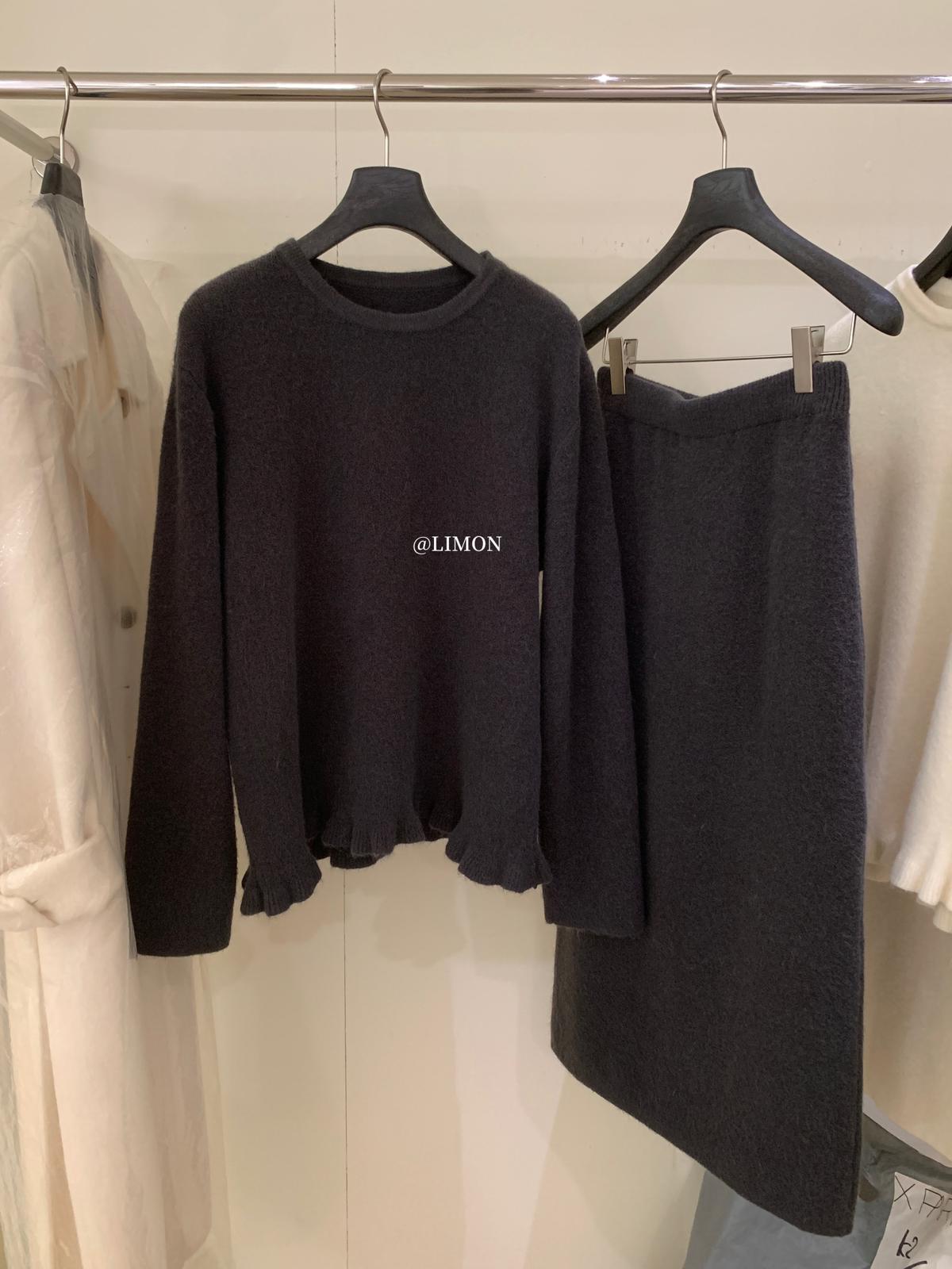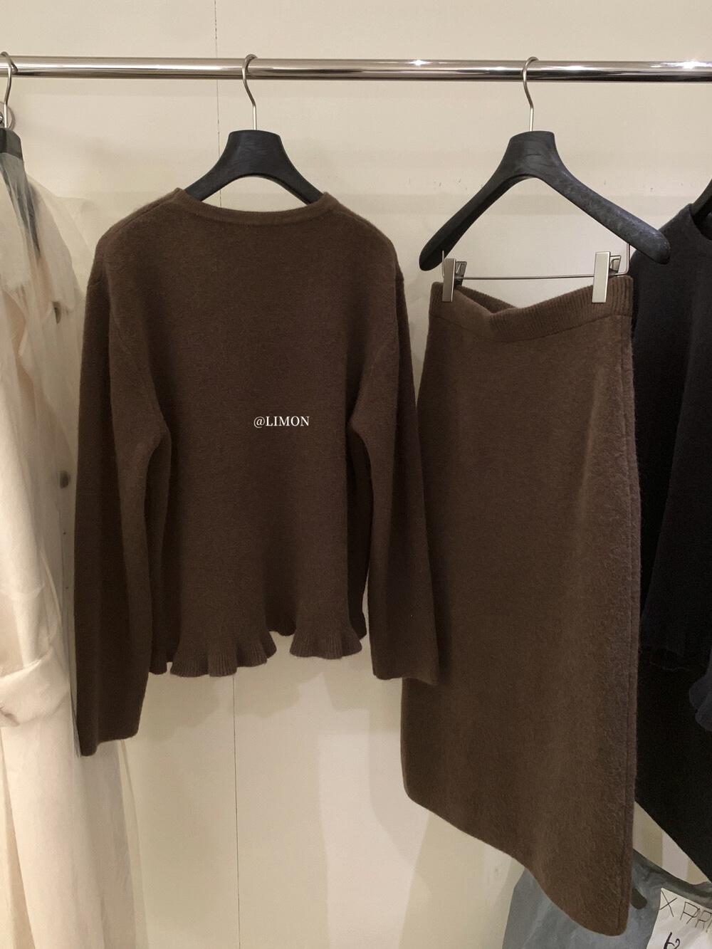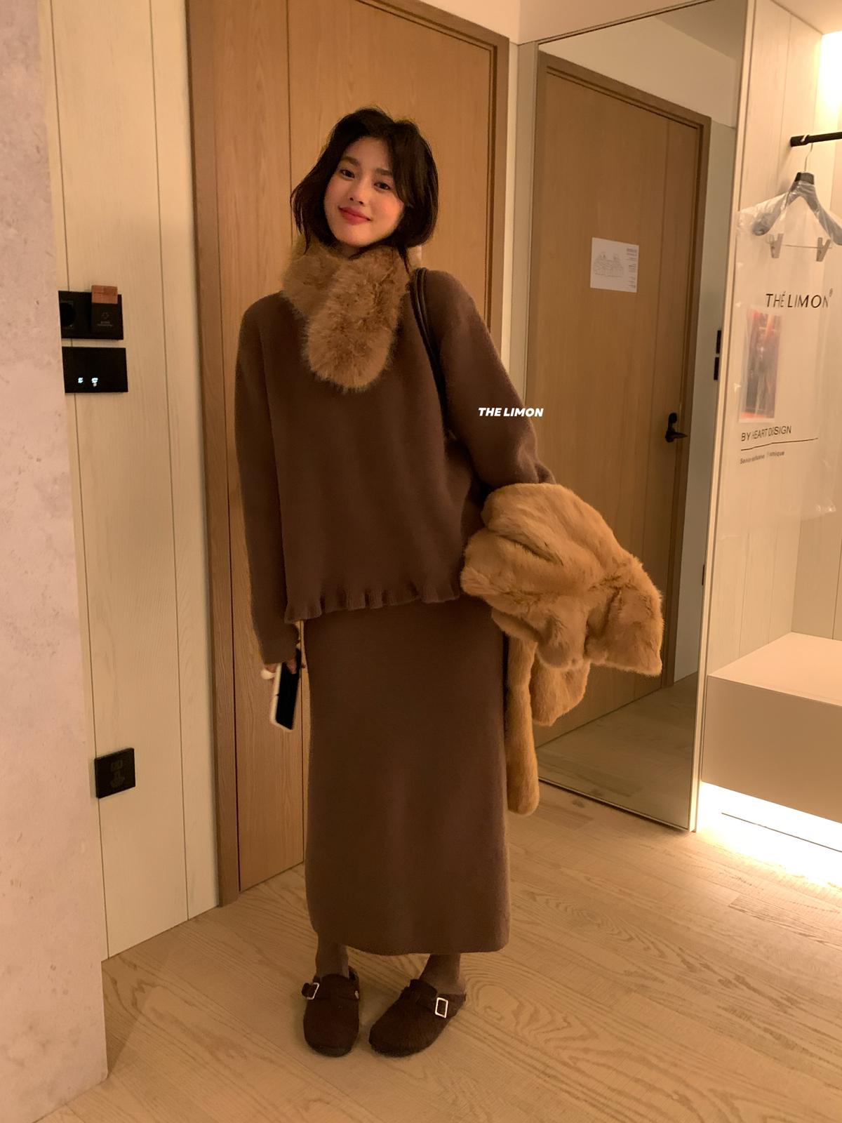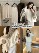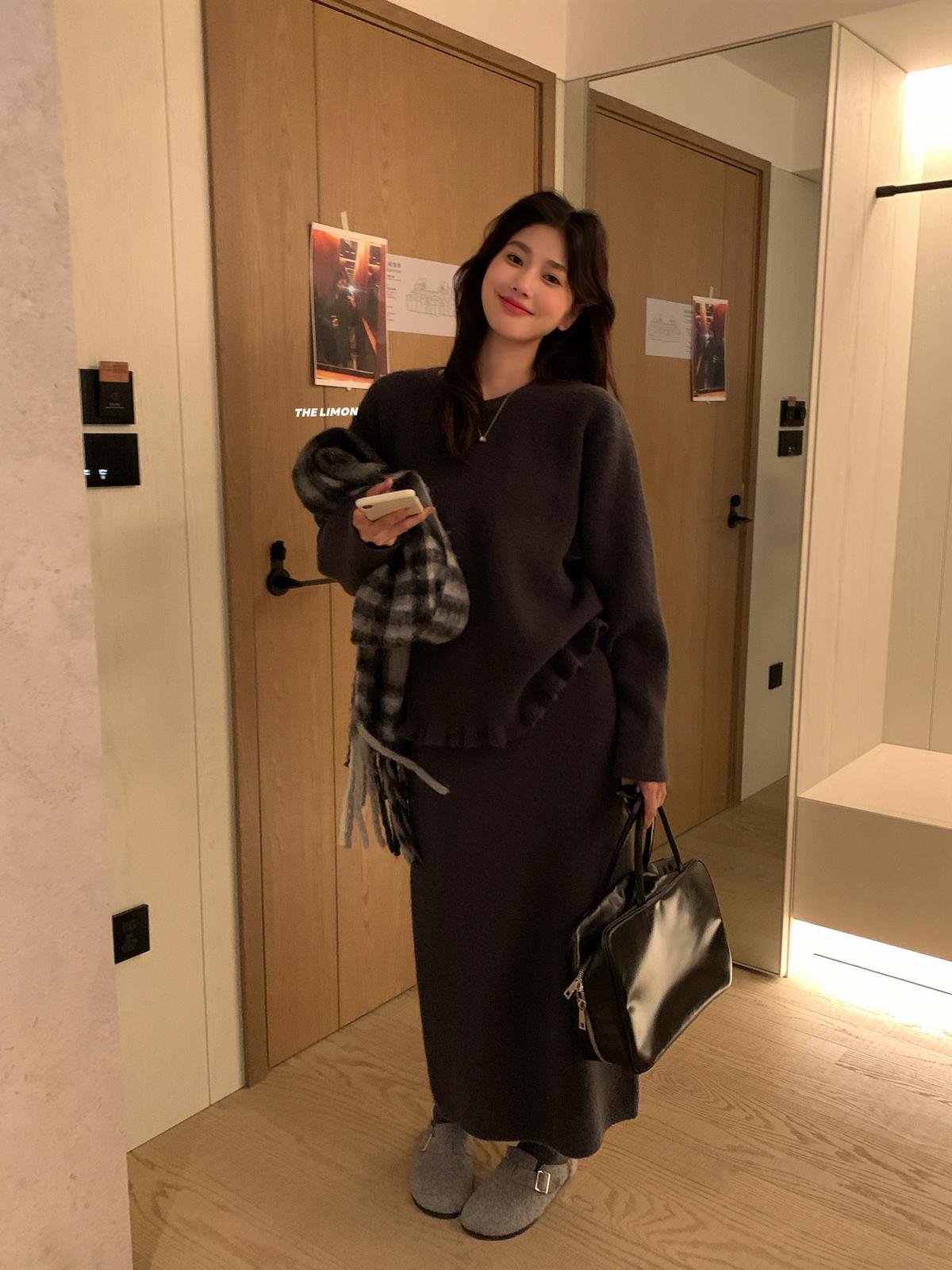 【C8048】慵懶木耳邊圓領毛衣+鬆緊腰顯瘦半身裙套裝