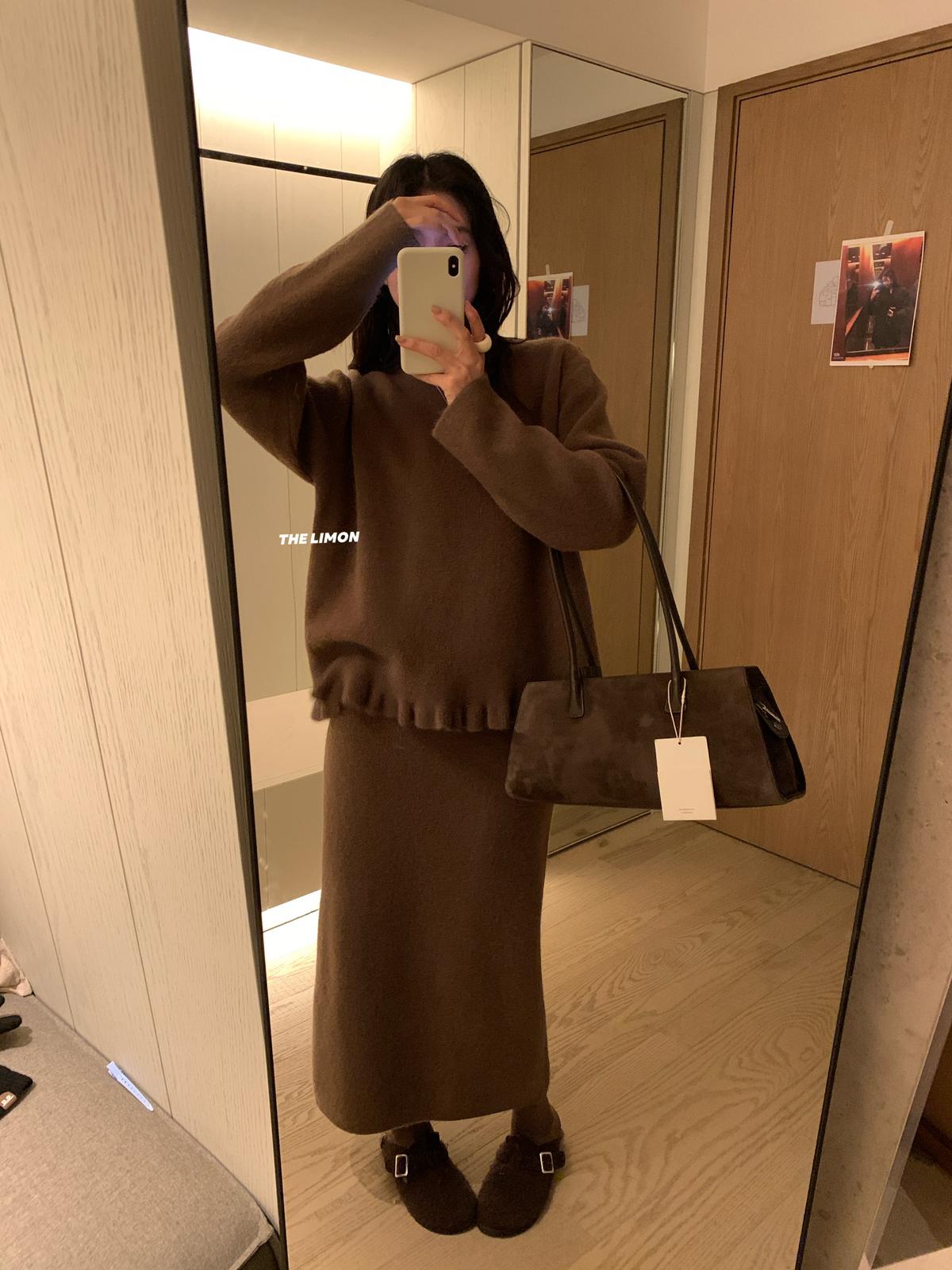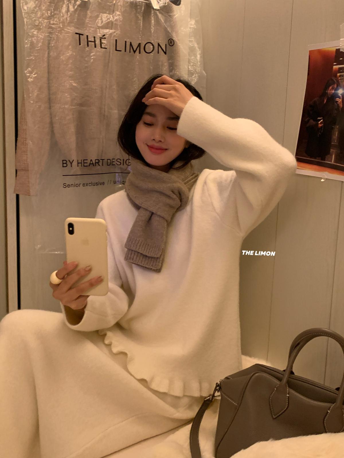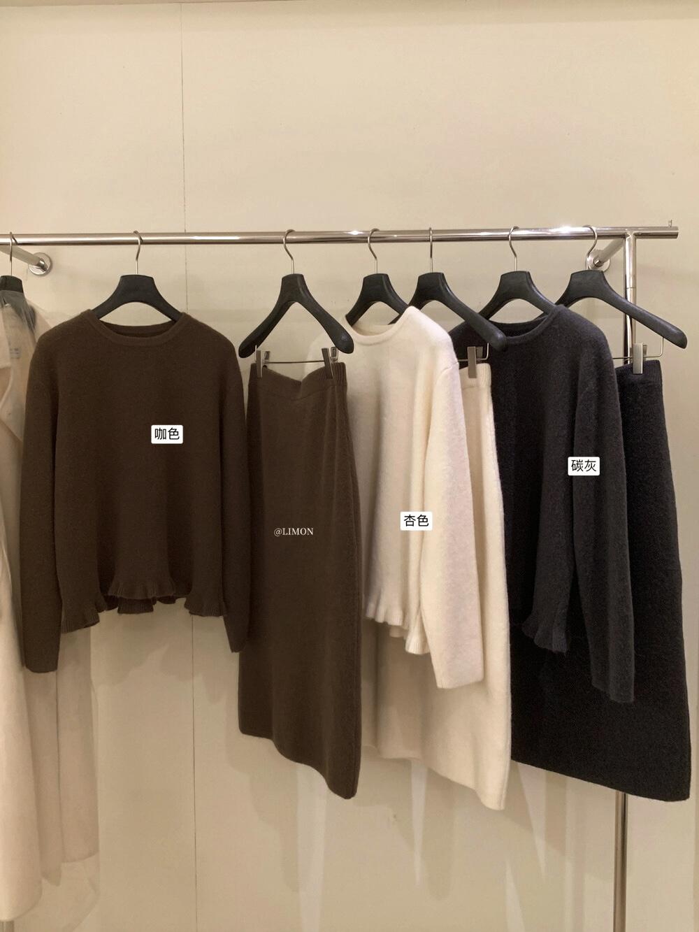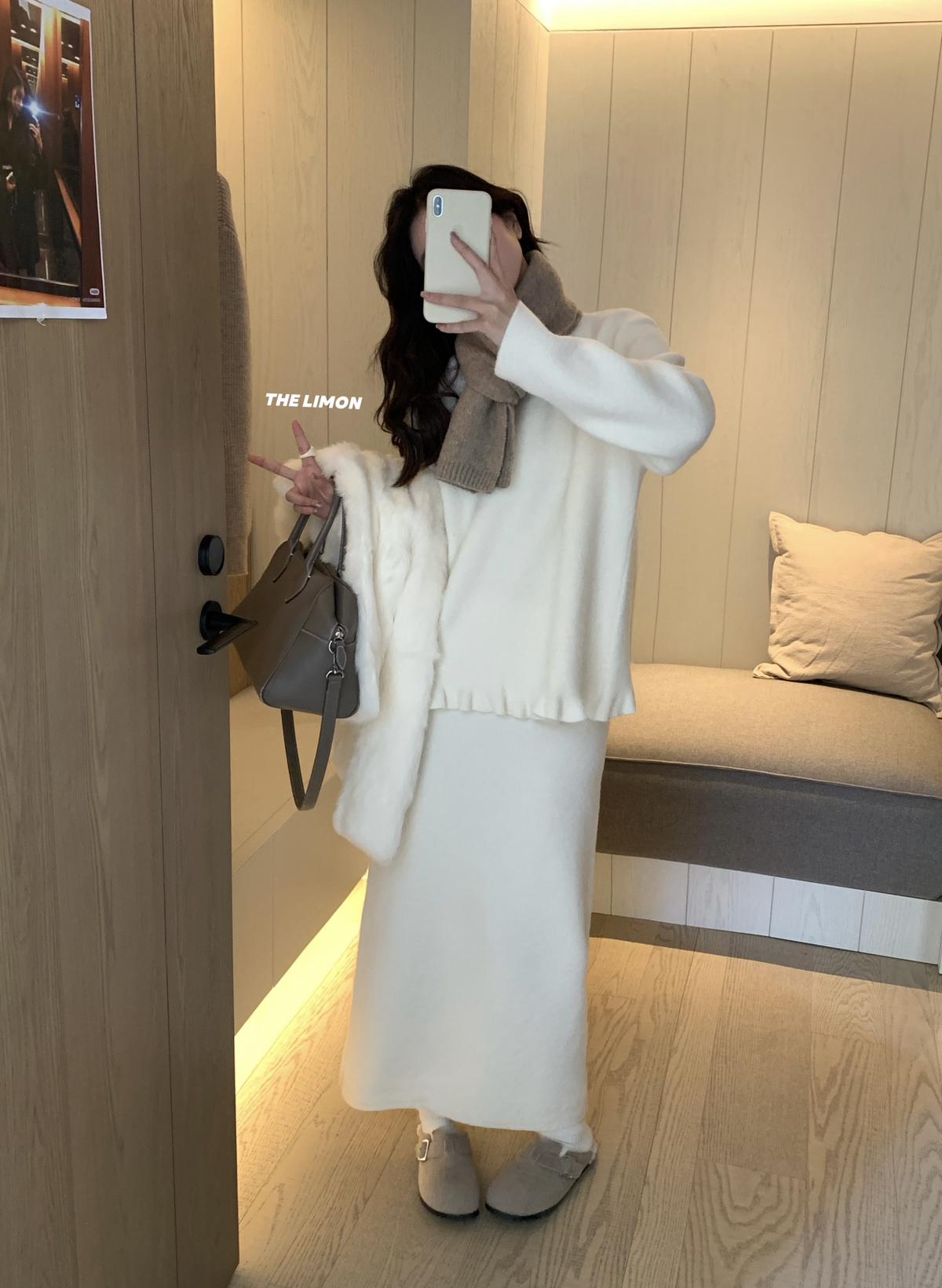 【C8048】慵懶木耳邊圓領毛衣+鬆緊腰顯瘦半身裙套裝