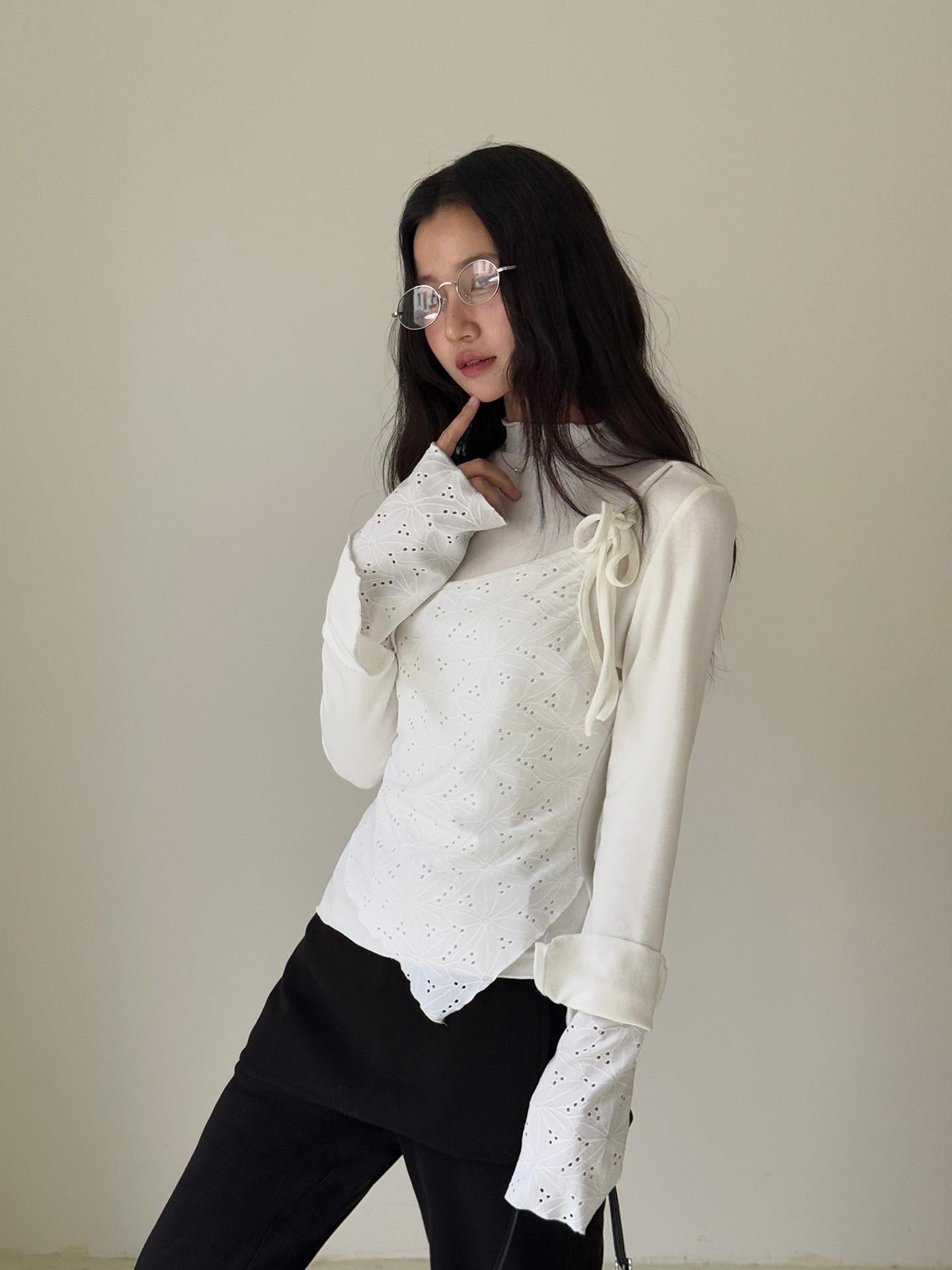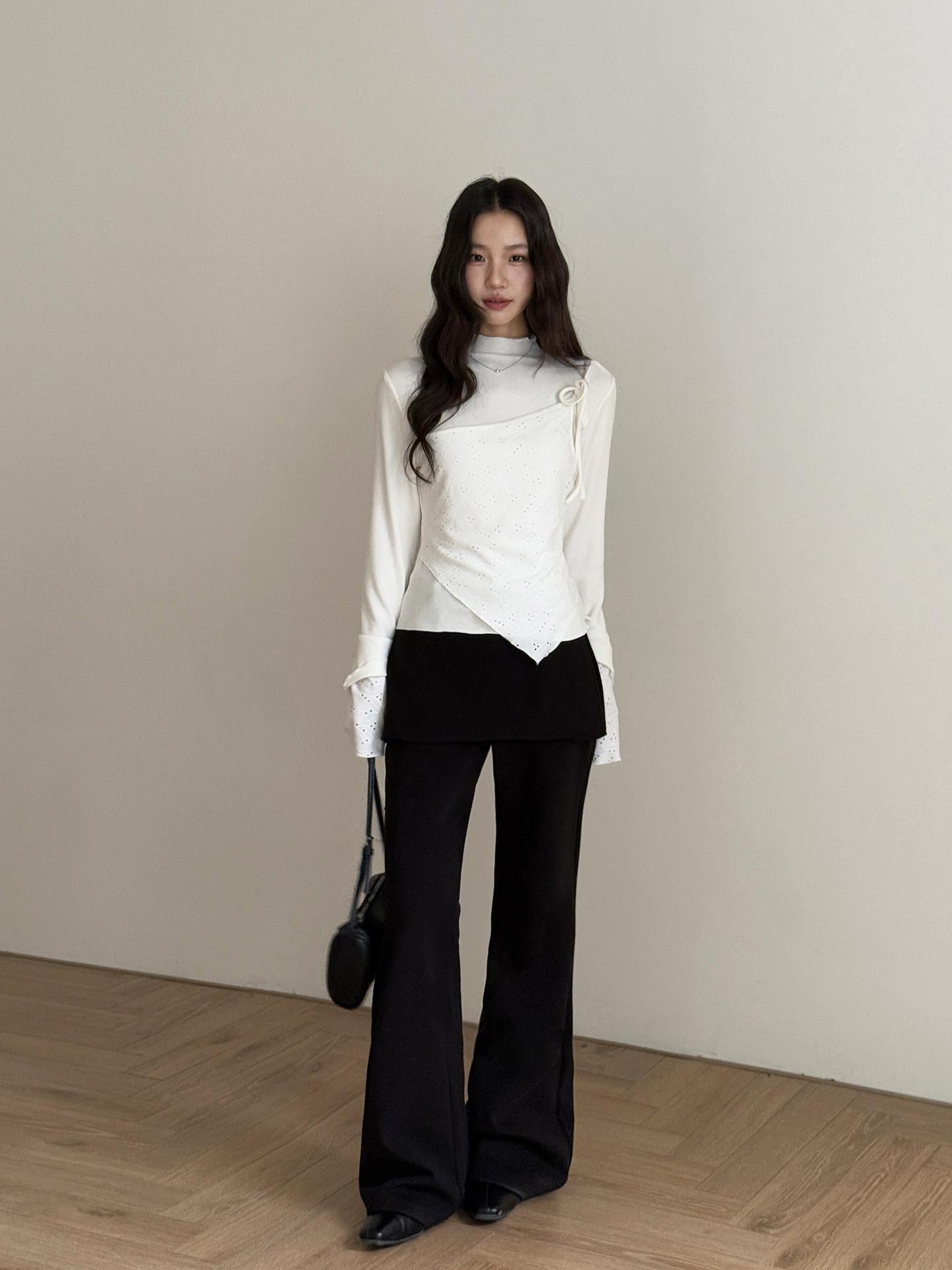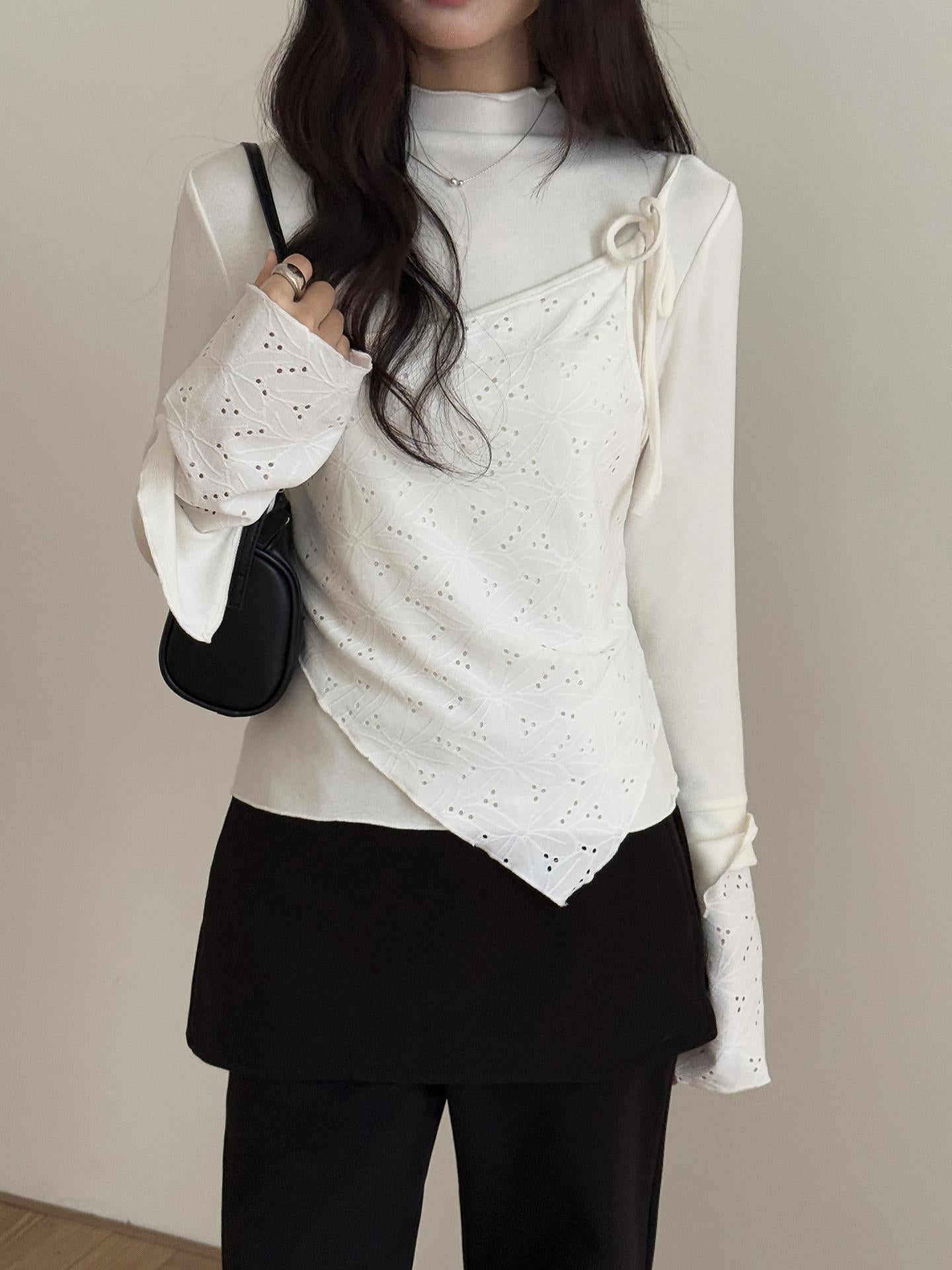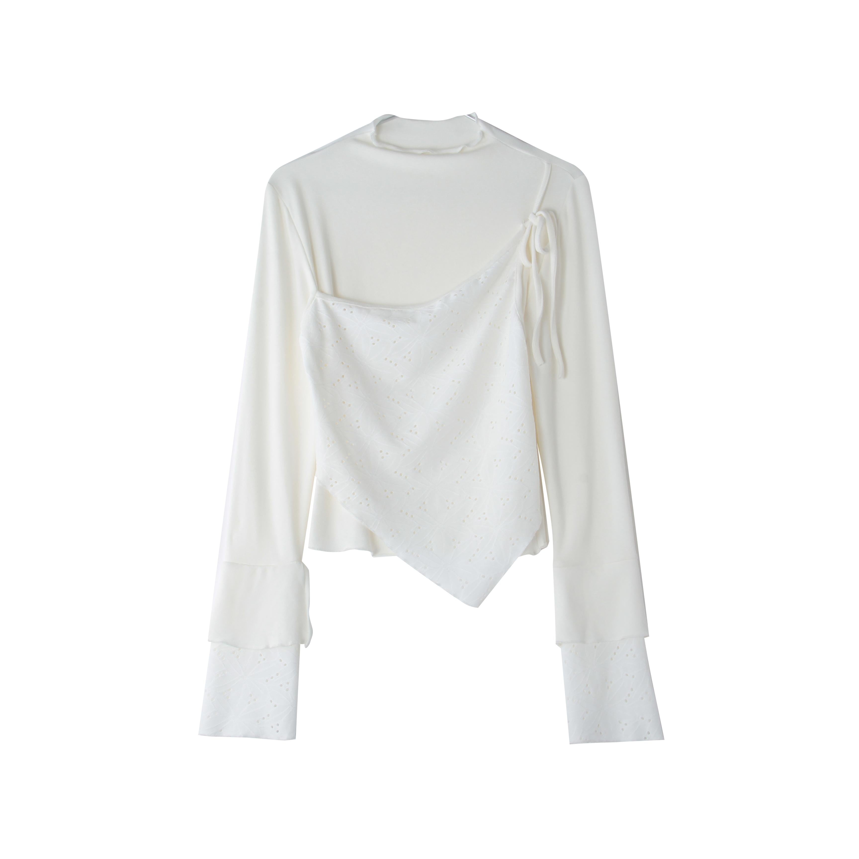 【C8057】冬上新!設計感不規則上衣拼接假兩件綁帶長袖T恤