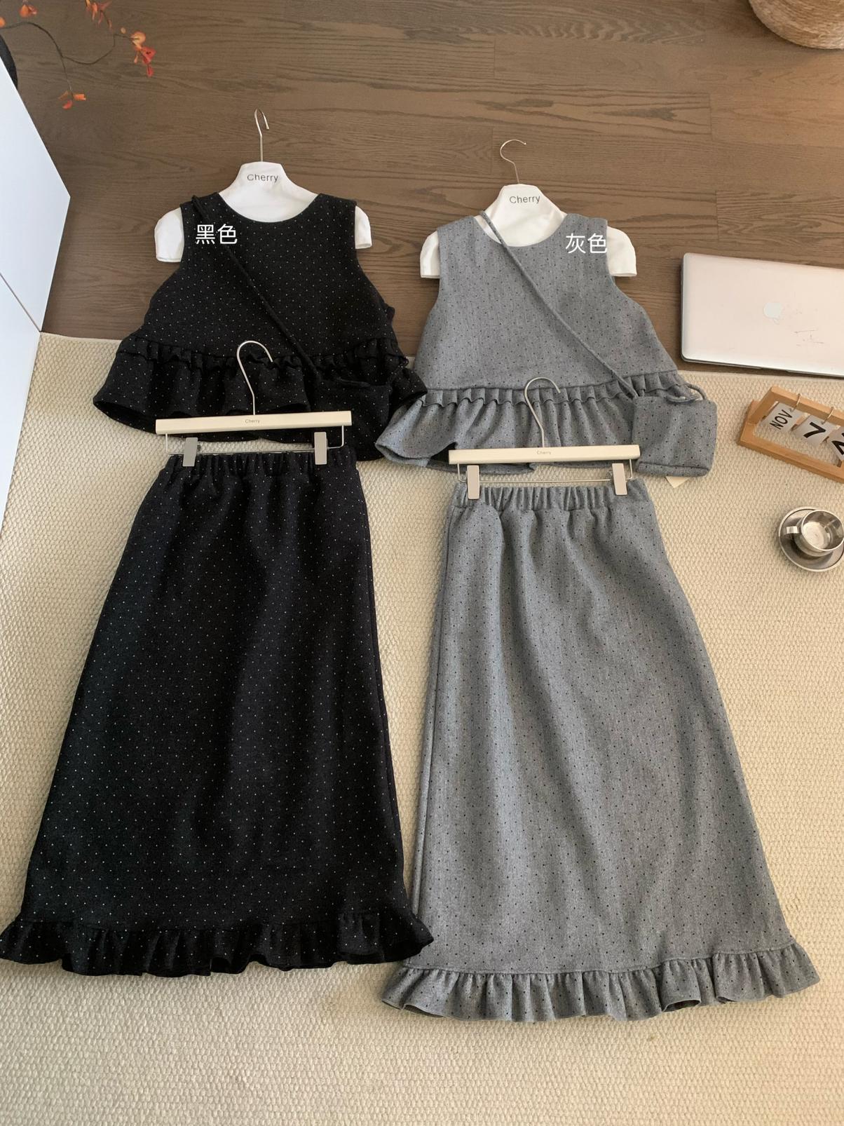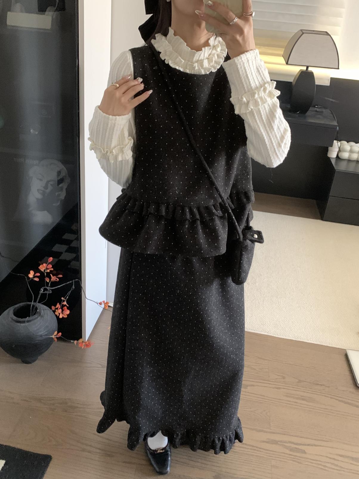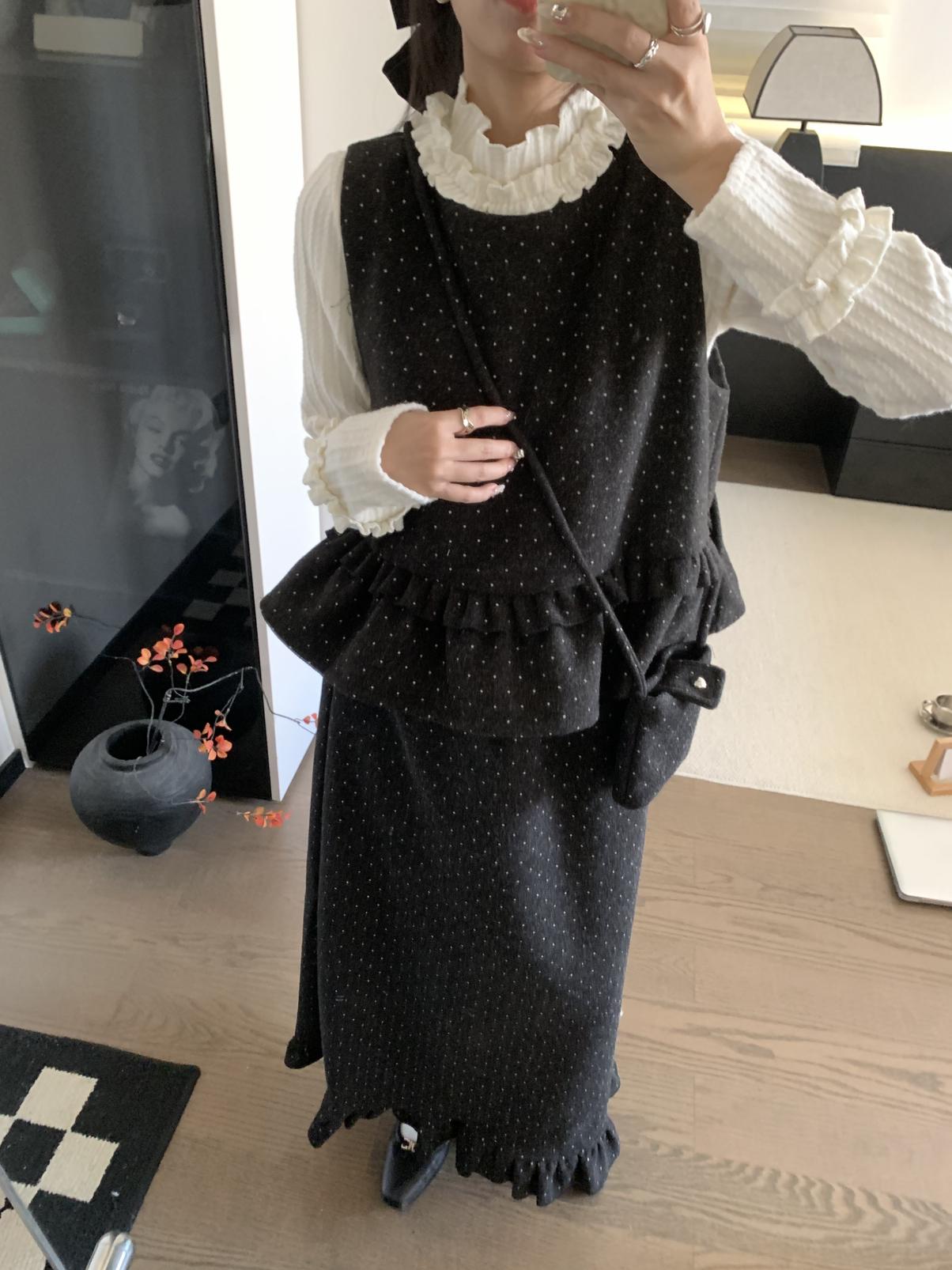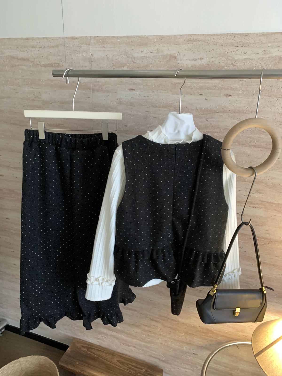 【C8059】韓式氣質波點木耳邊俏皮背心+半身裙套裝(配斜掛包)