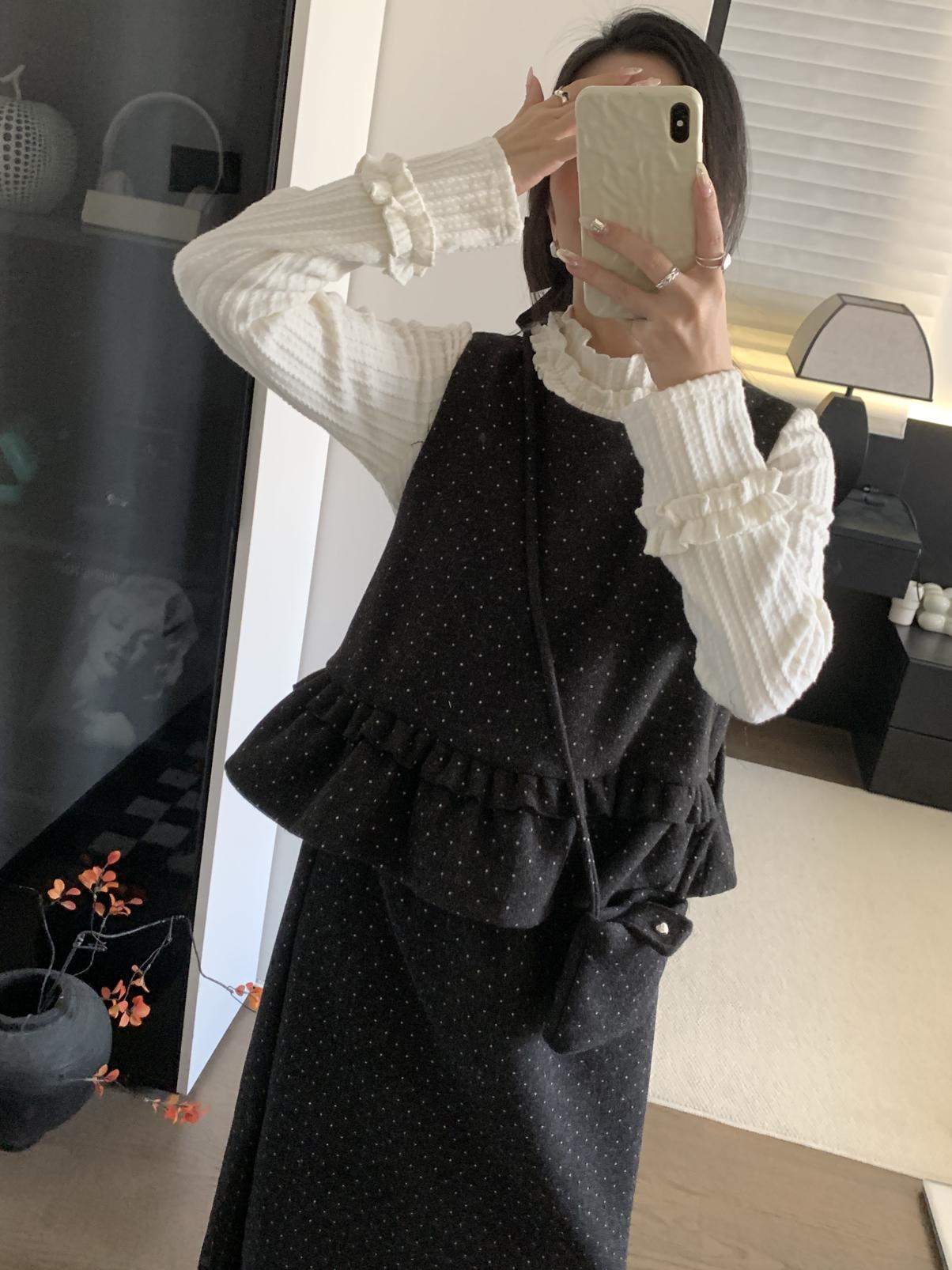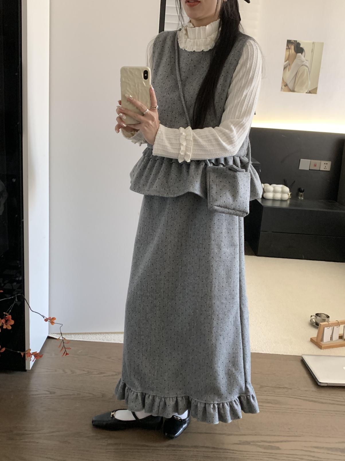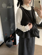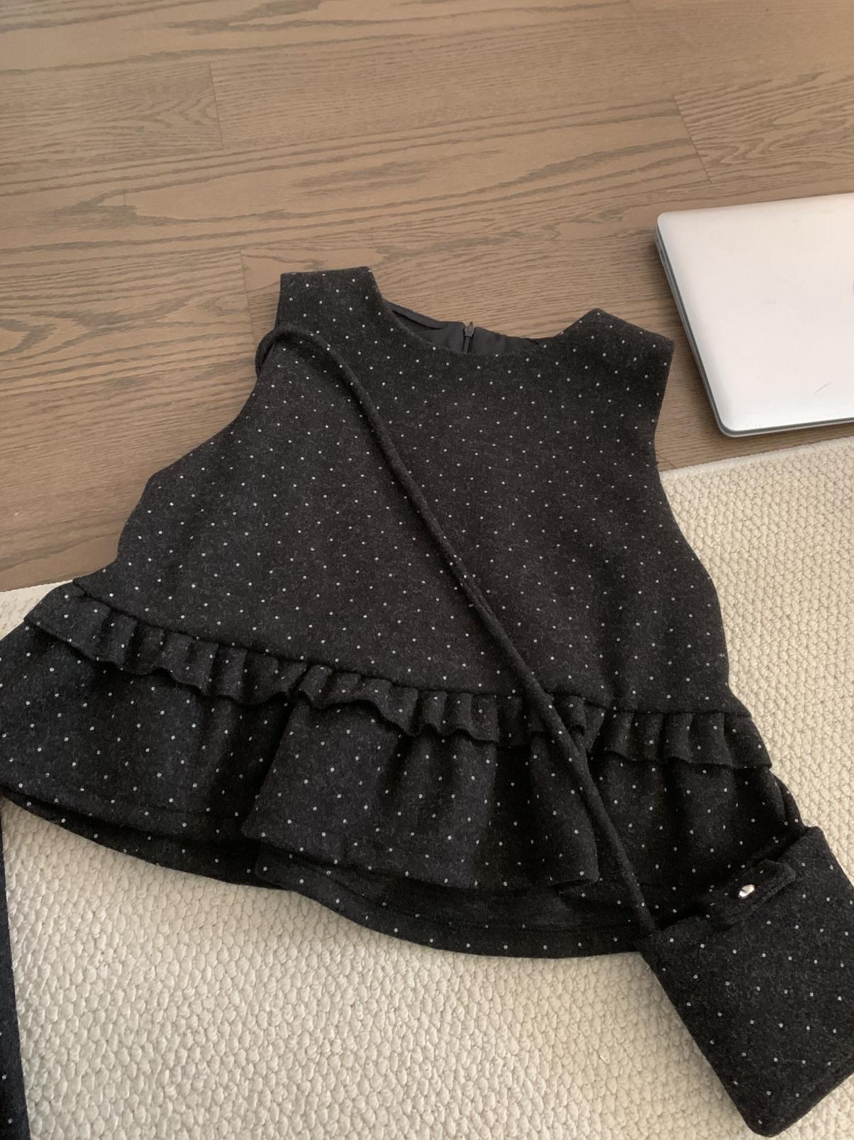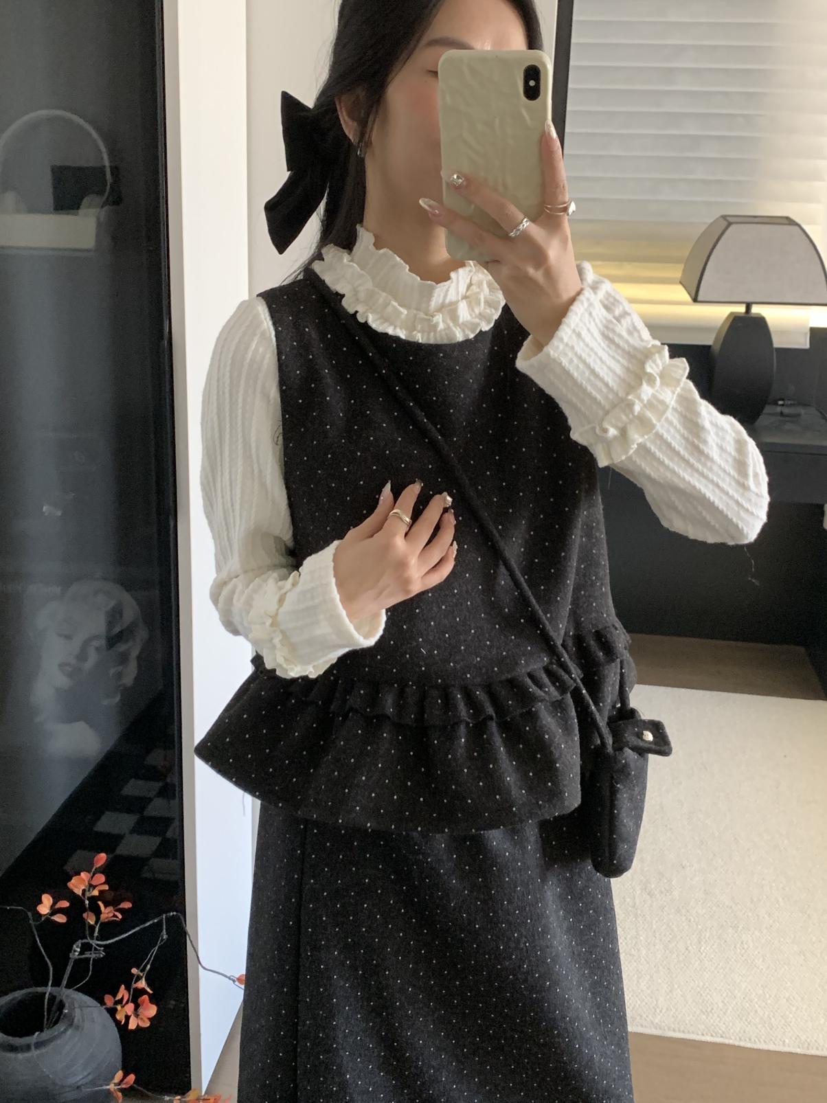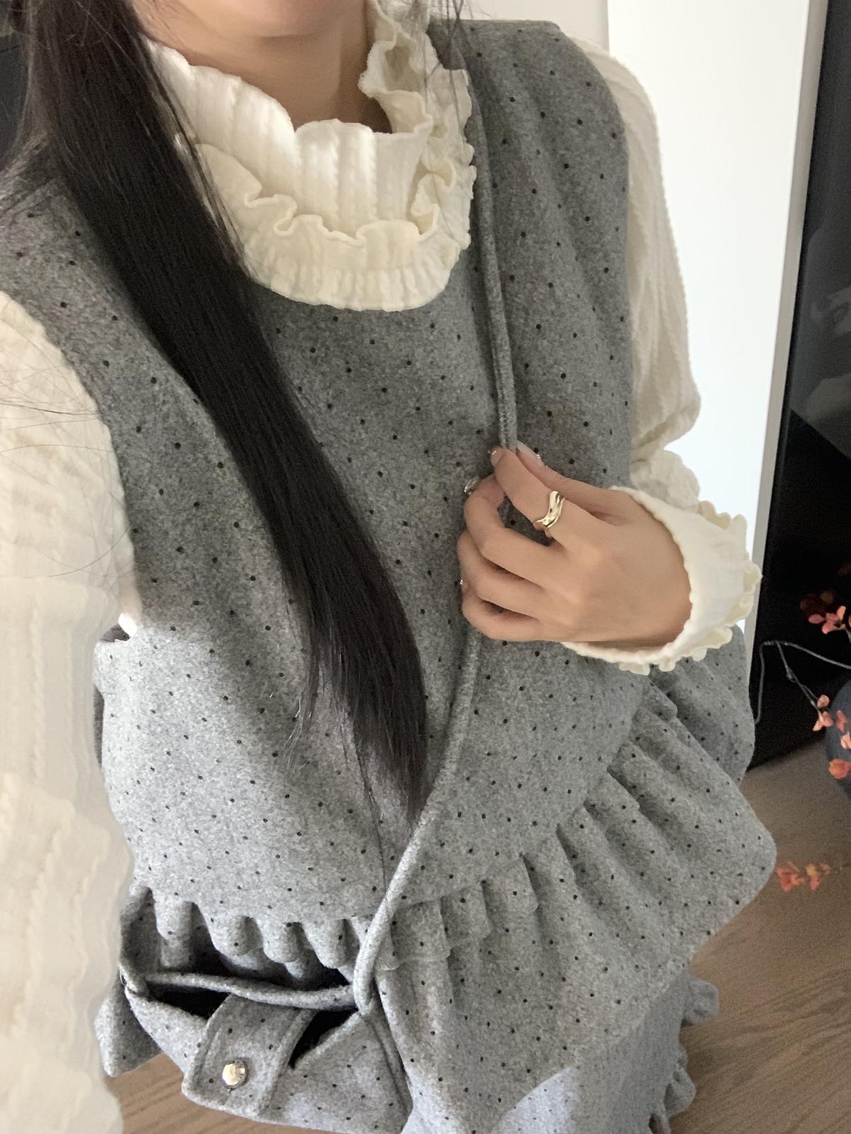 【C8059】韓式氣質波點木耳邊俏皮背心+半身裙套裝(配斜掛包)