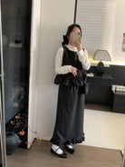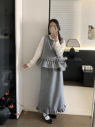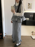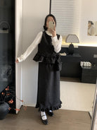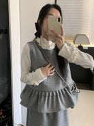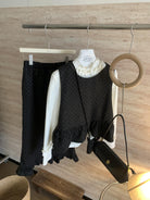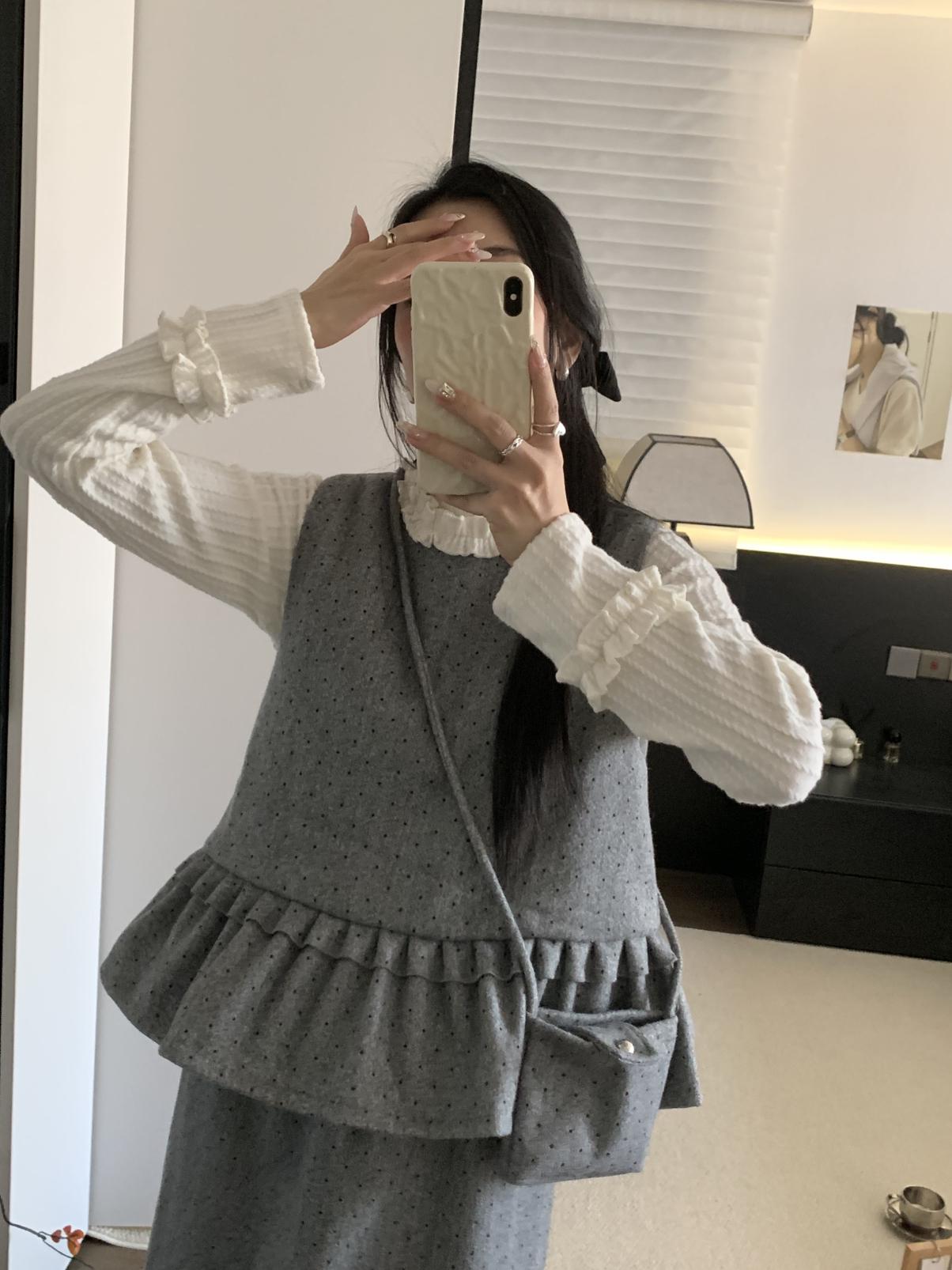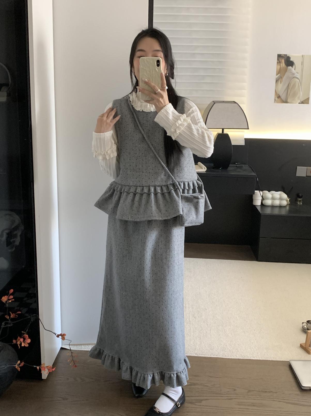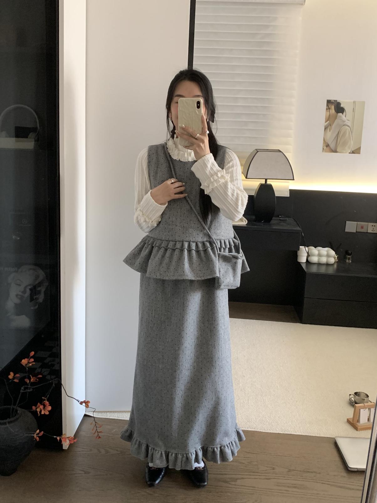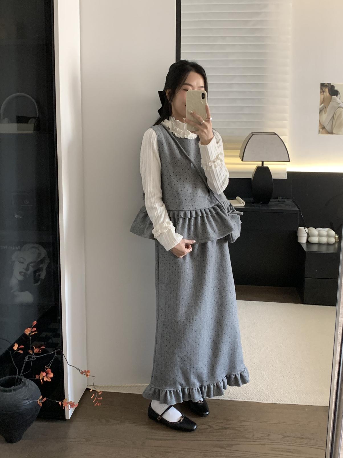 【C8059】韓式氣質波點木耳邊俏皮背心+半身裙套裝(配斜掛包)