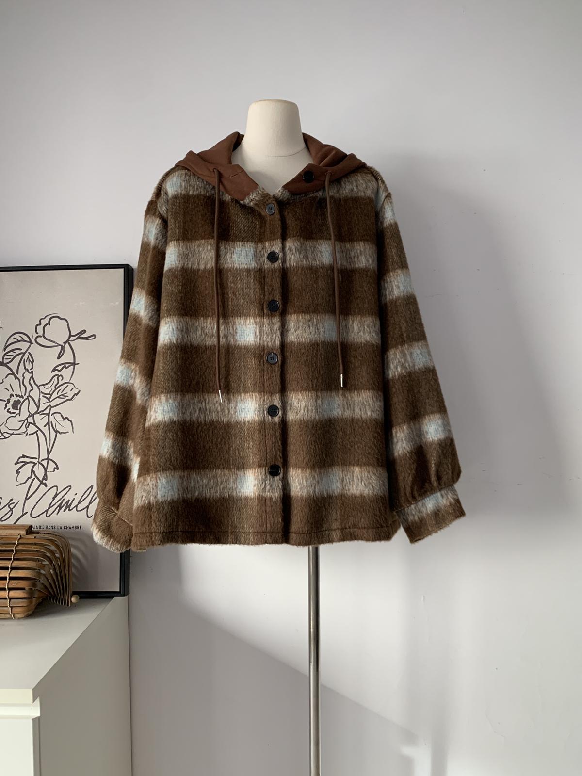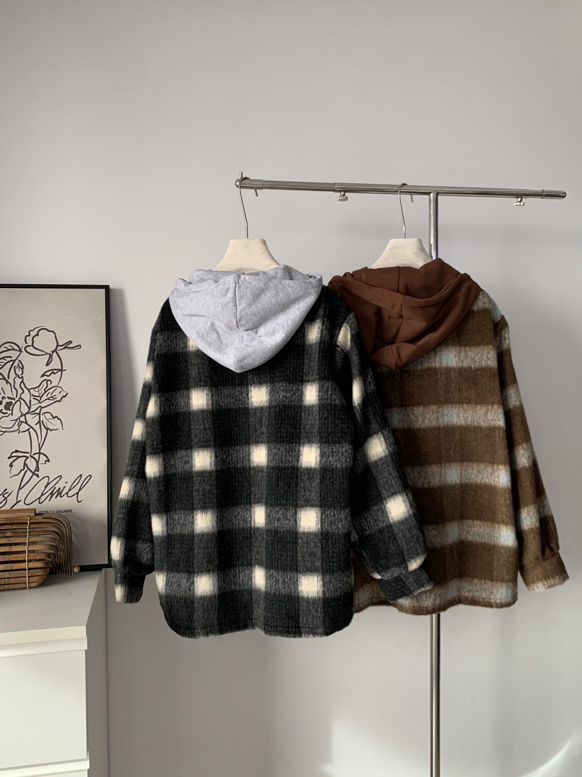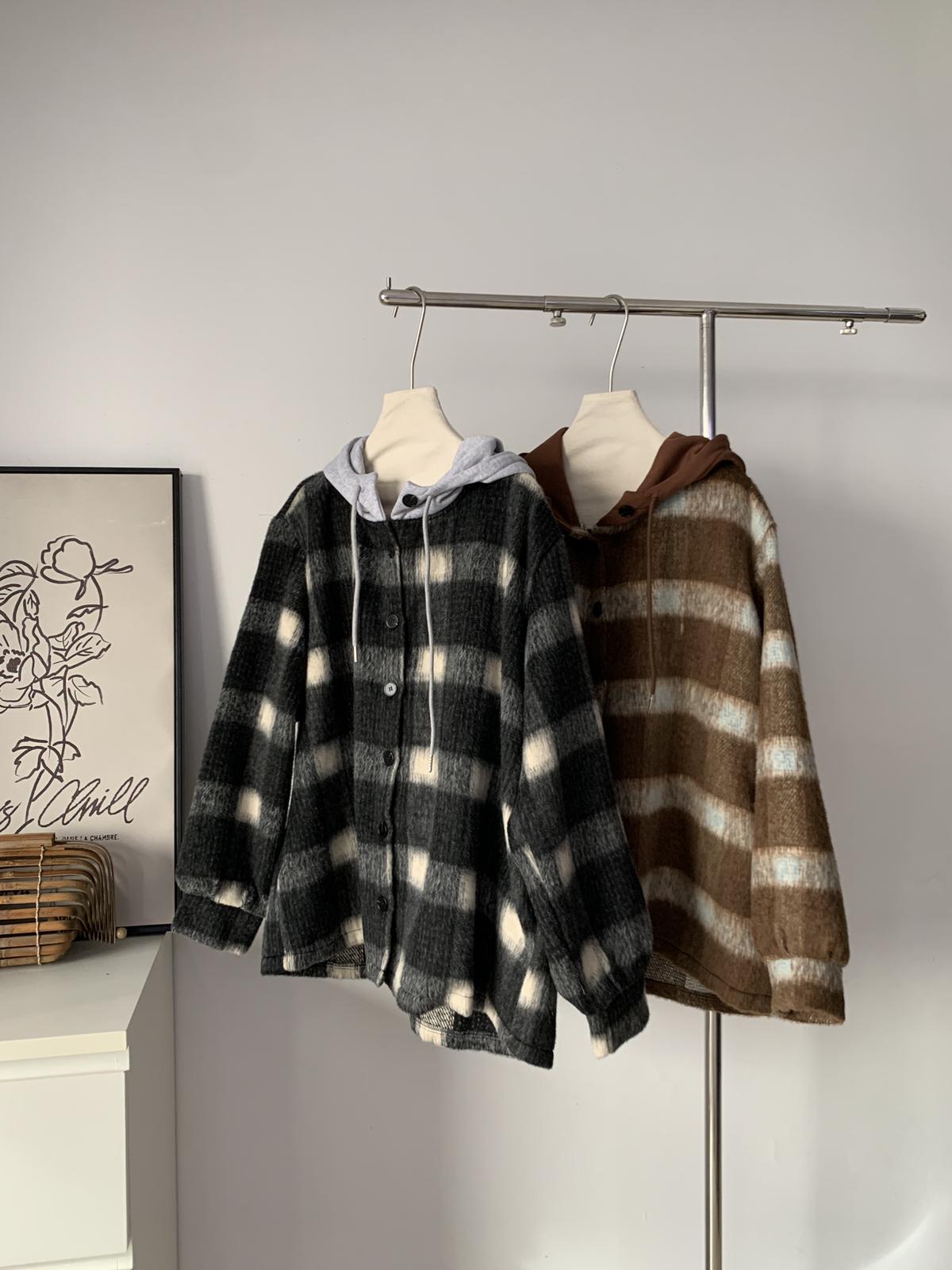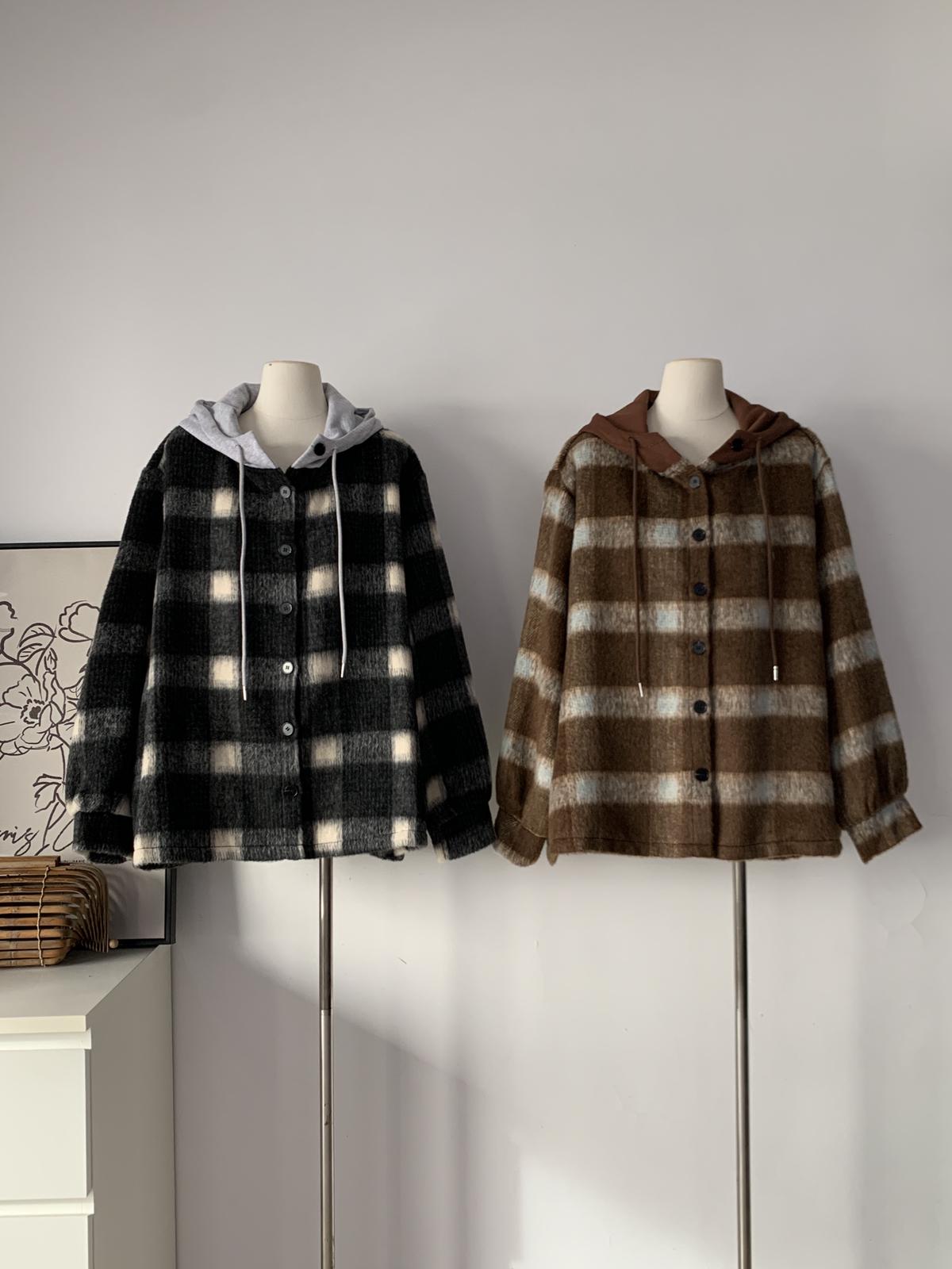 【C8063】韓系撞色拼接連帽呢子格子短外套