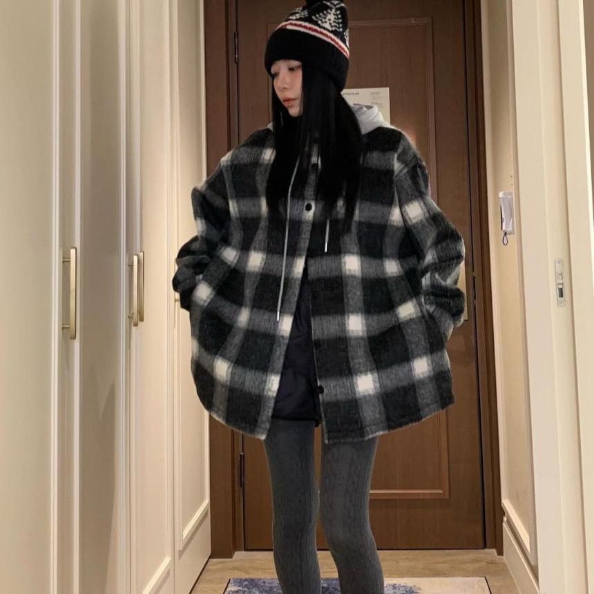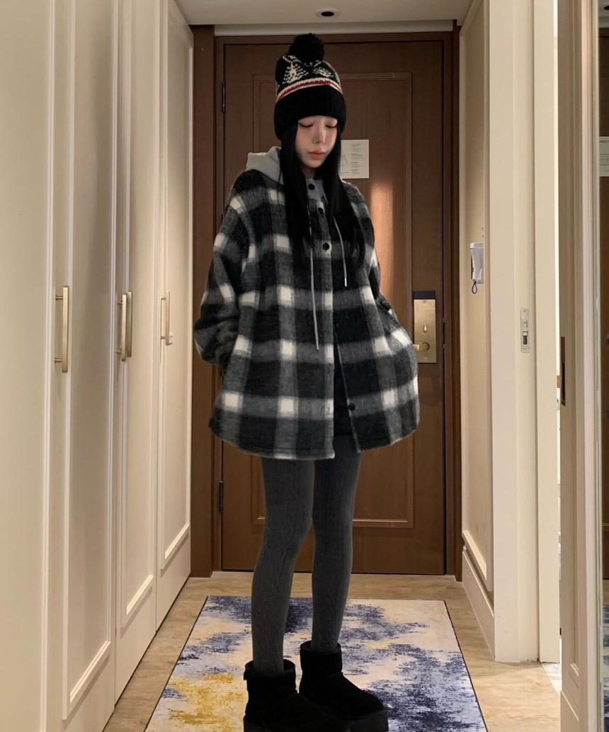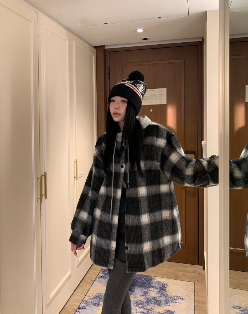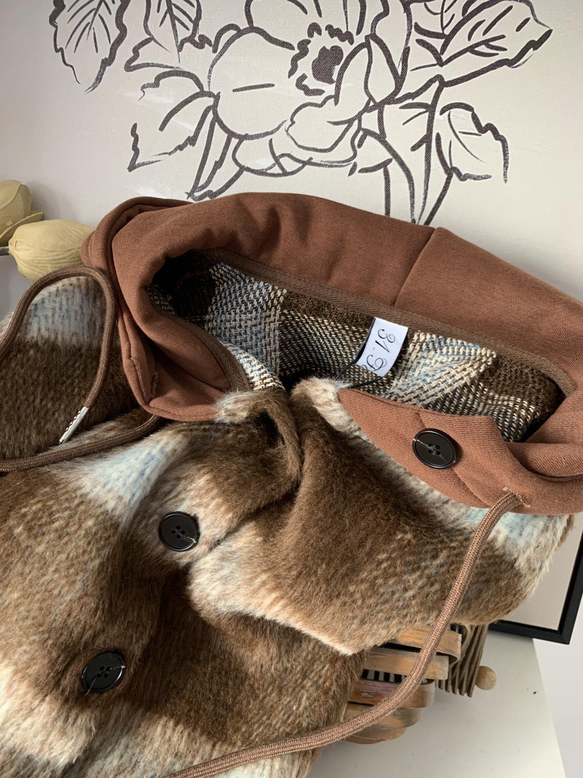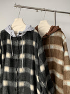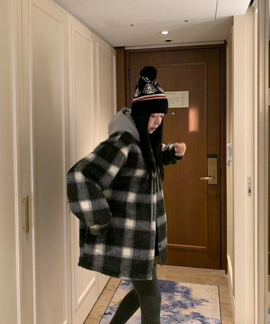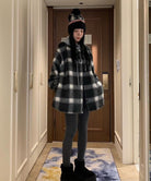 【C8063】韓系撞色拼接連帽呢子格子短外套