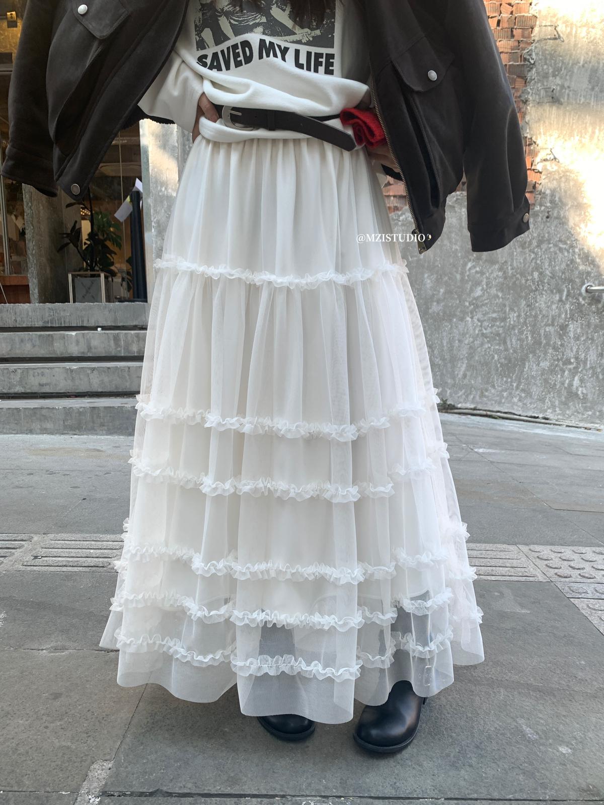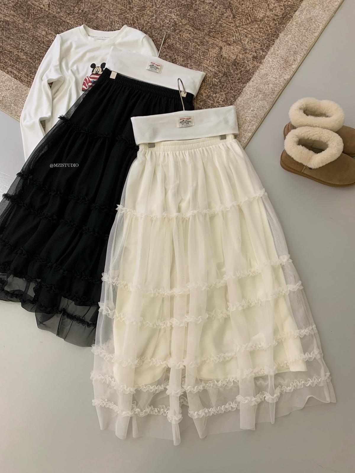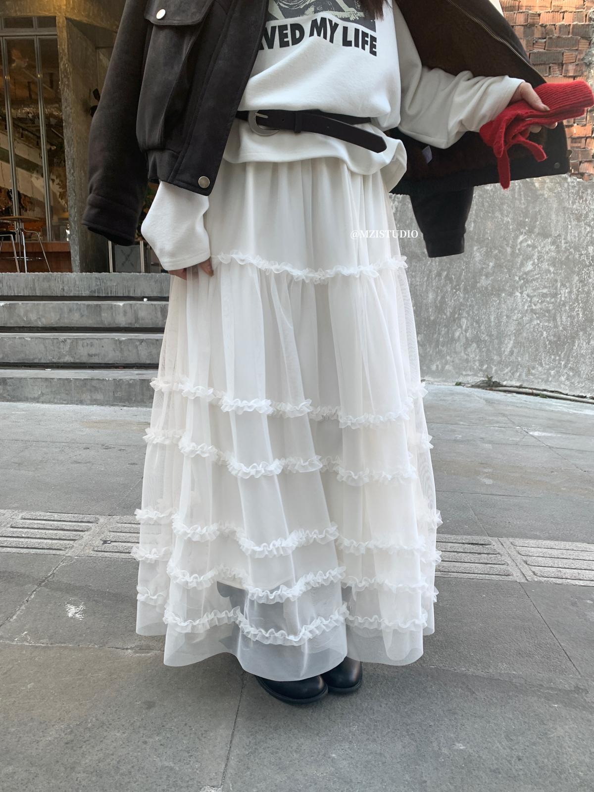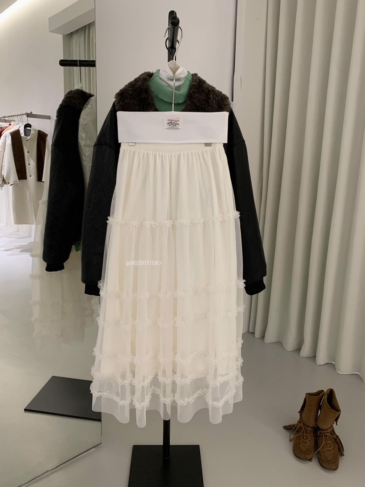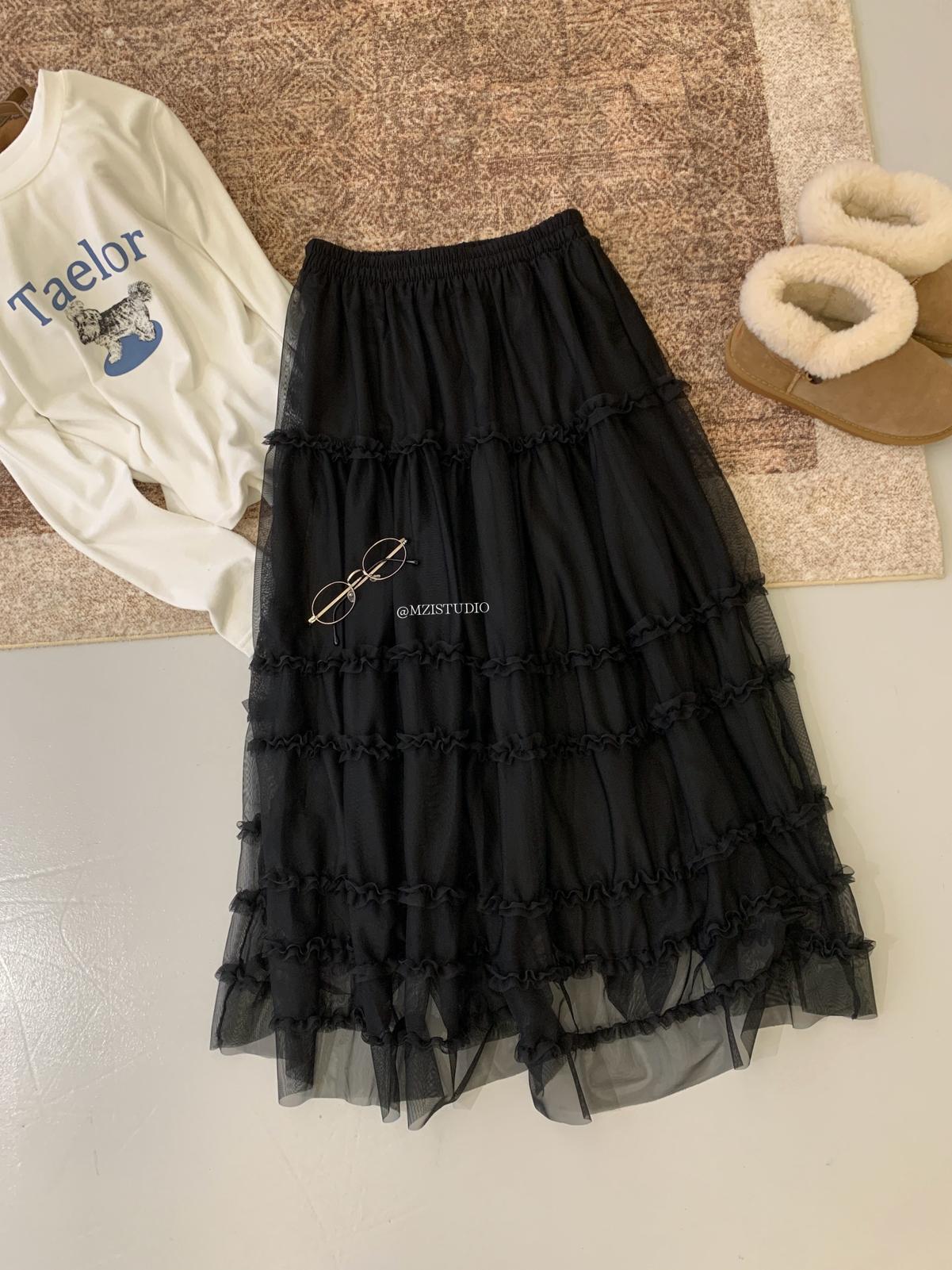 【C8064】智性優雅韓系冬季木耳邊拼接網紗清新少女感鬆緊腰半身裙