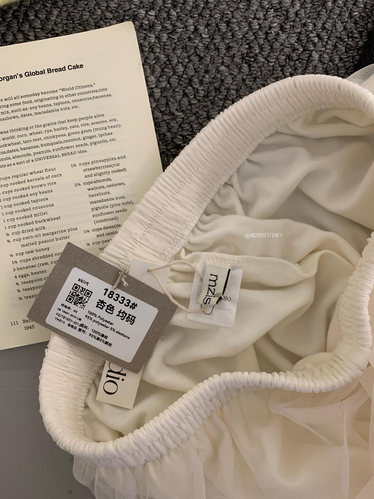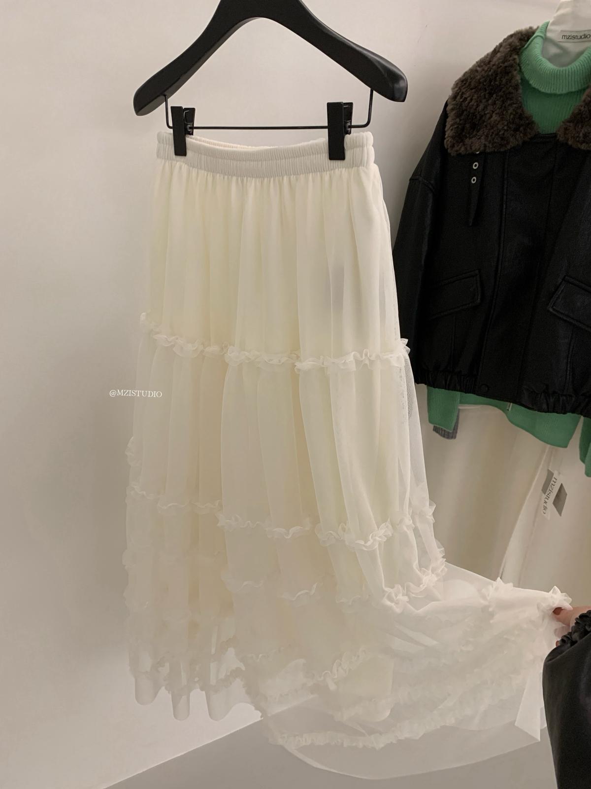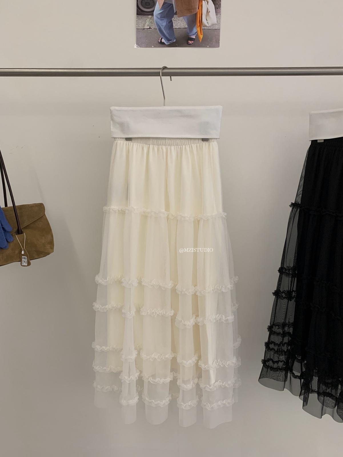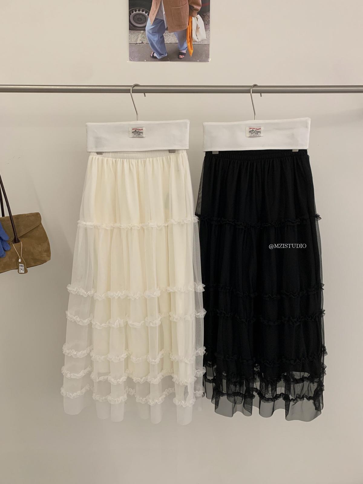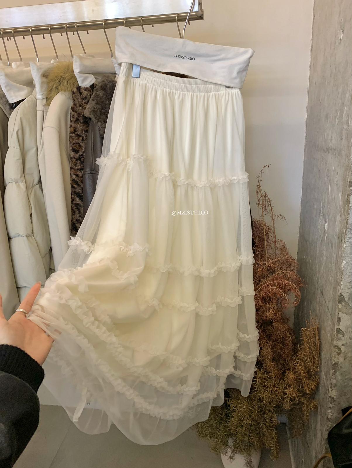 【C8064】智性優雅韓系冬季木耳邊拼接網紗清新少女感鬆緊腰半身裙