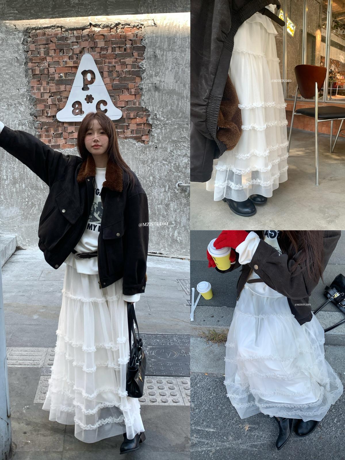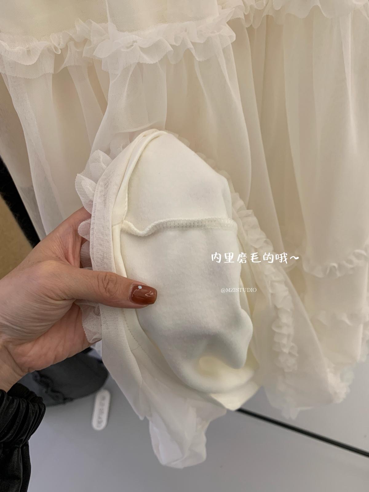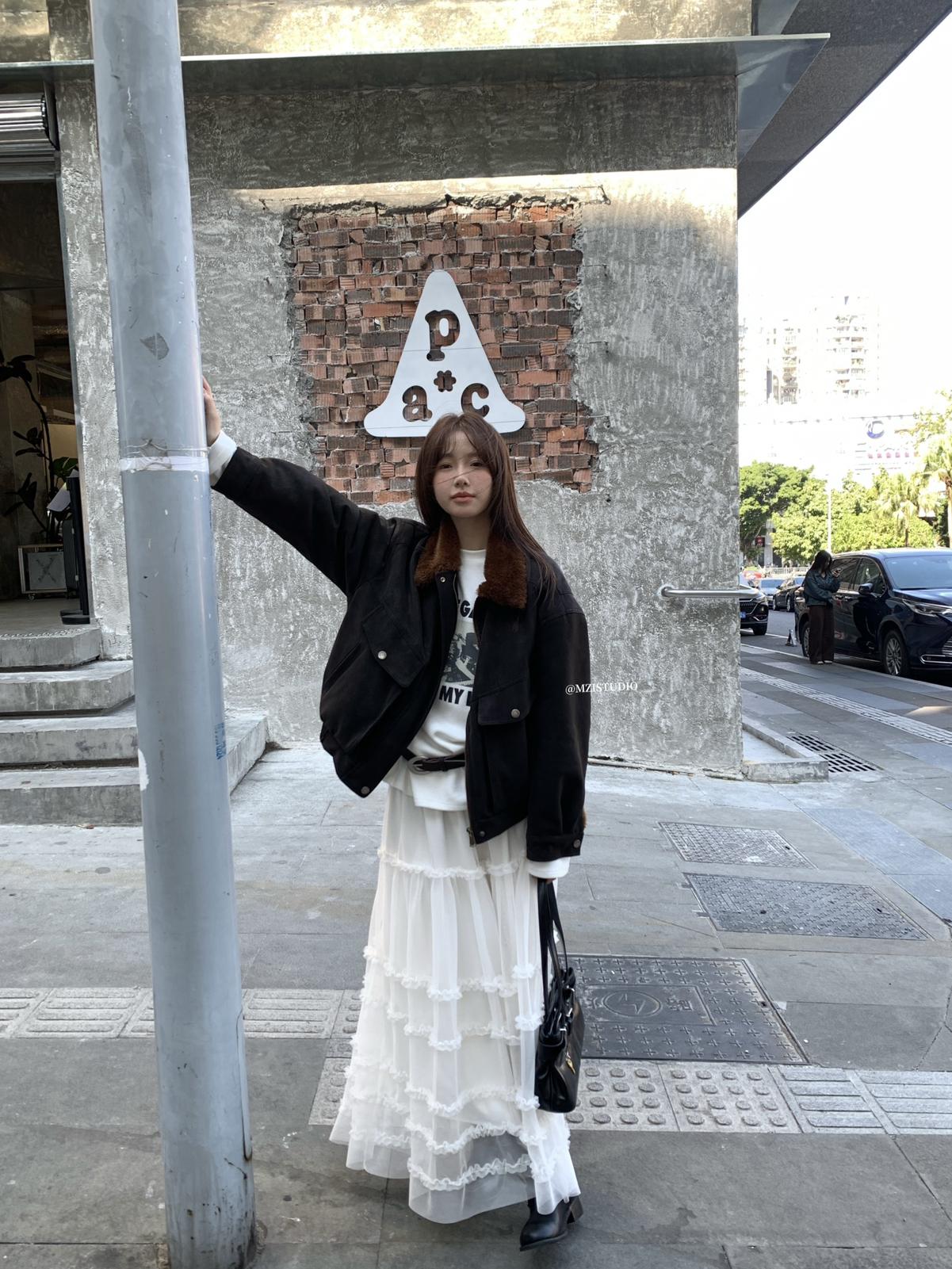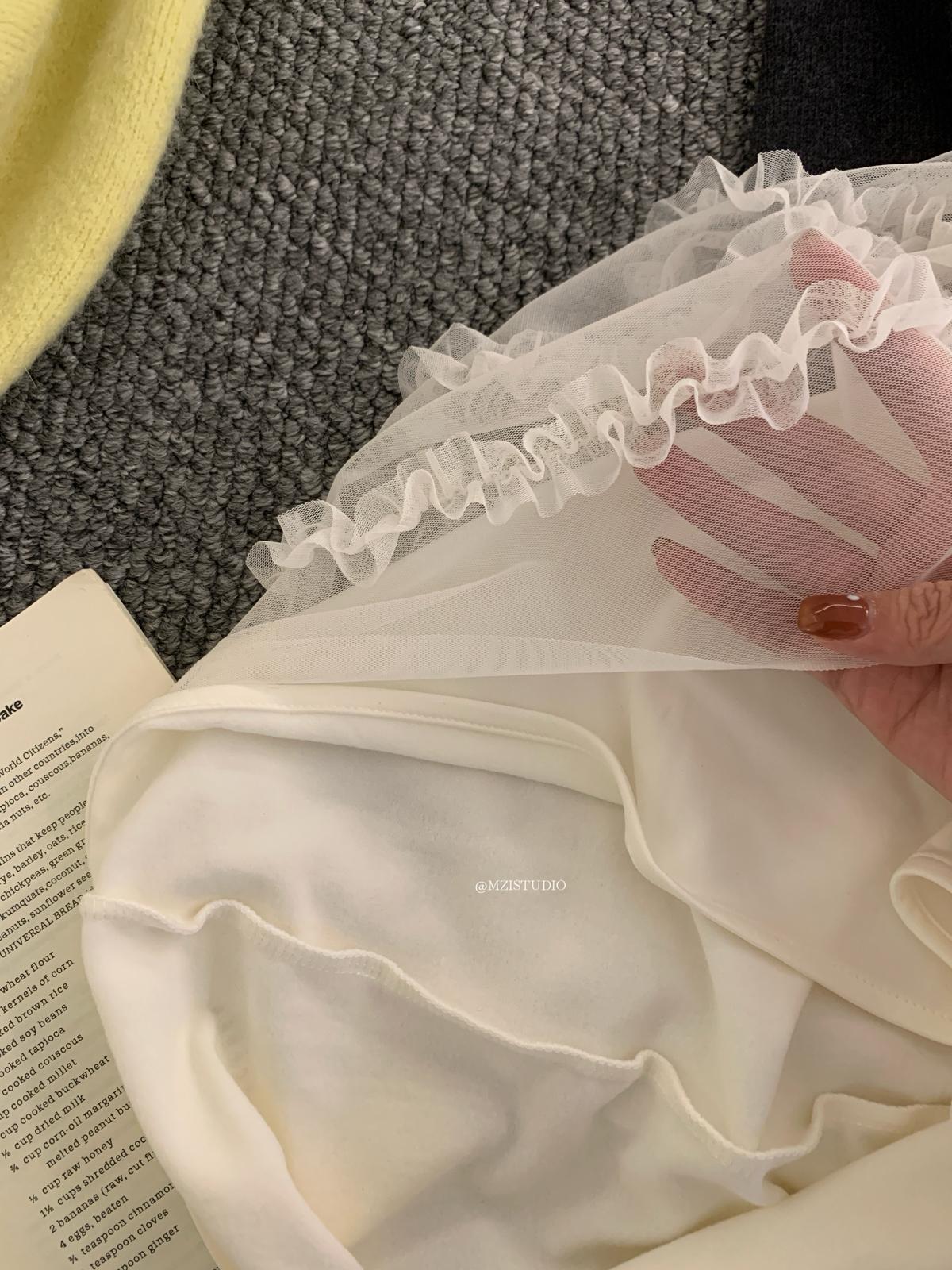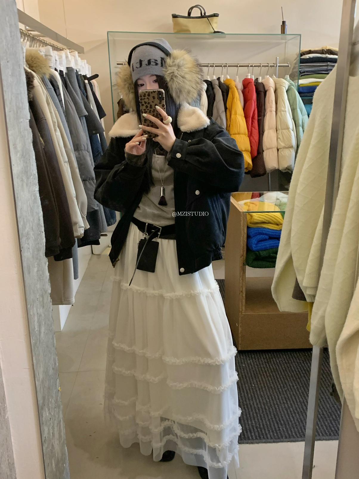 【C8064】智性優雅韓系冬季木耳邊拼接網紗清新少女感鬆緊腰半身裙