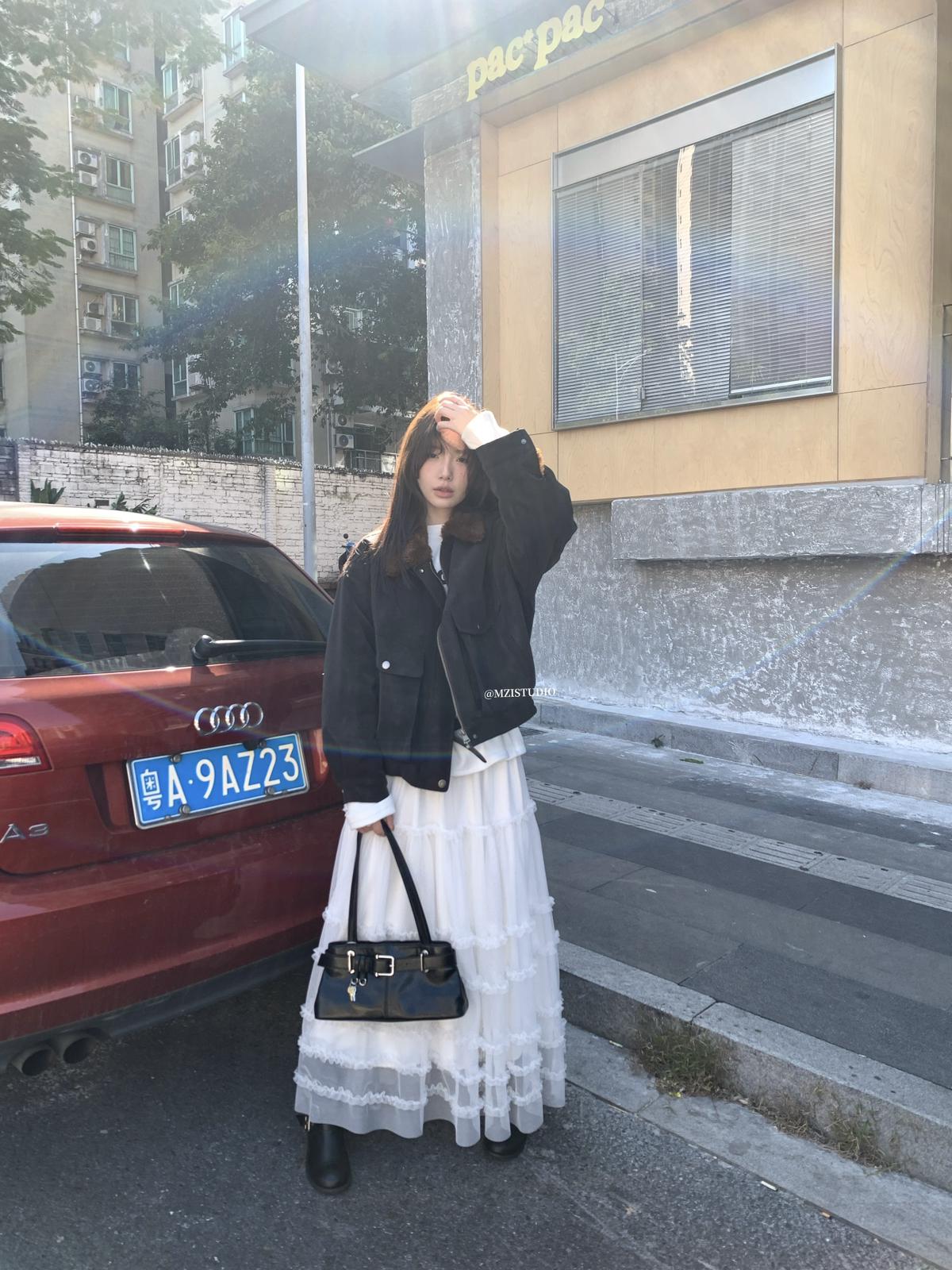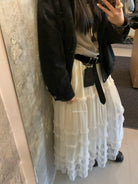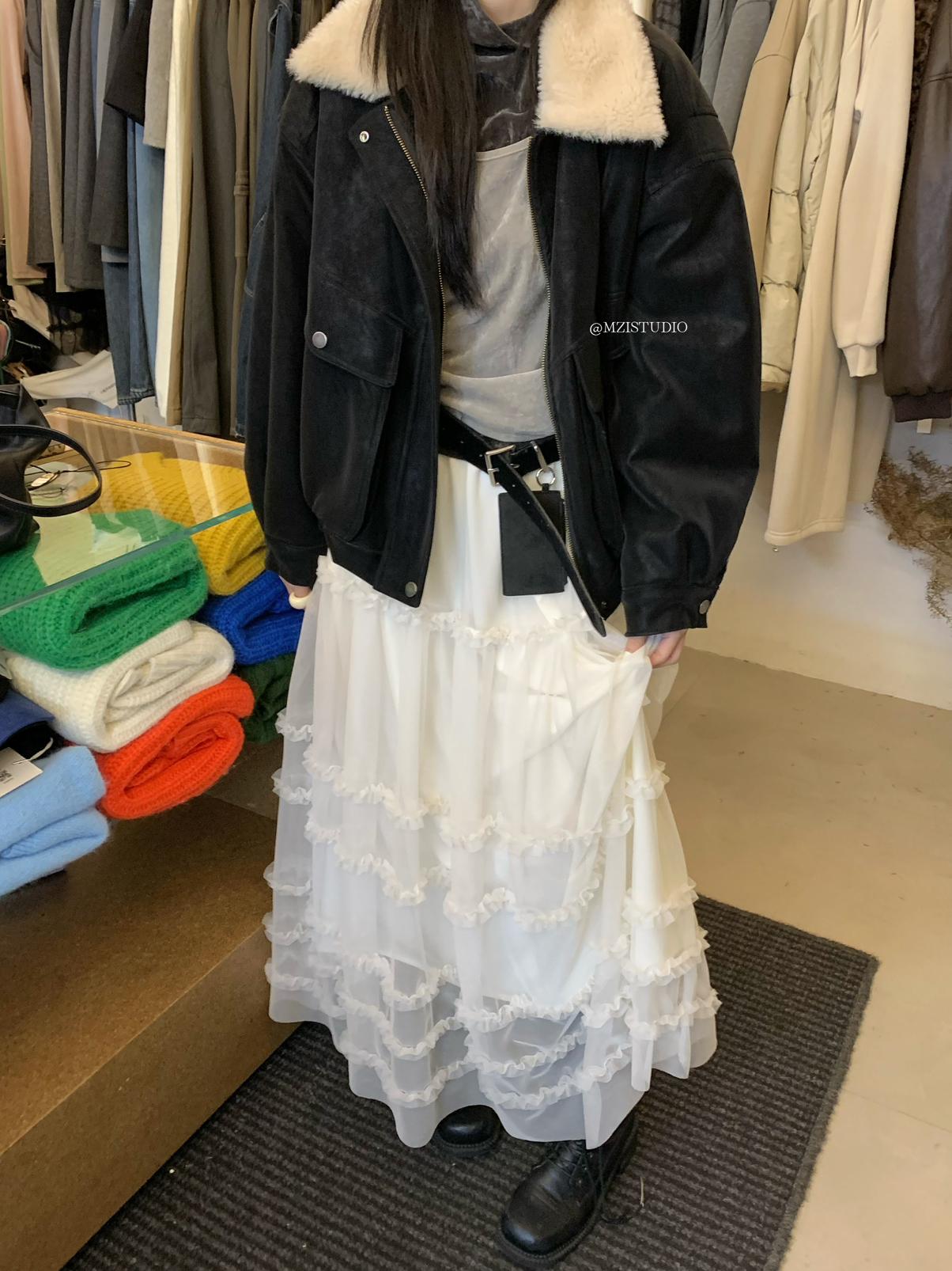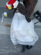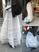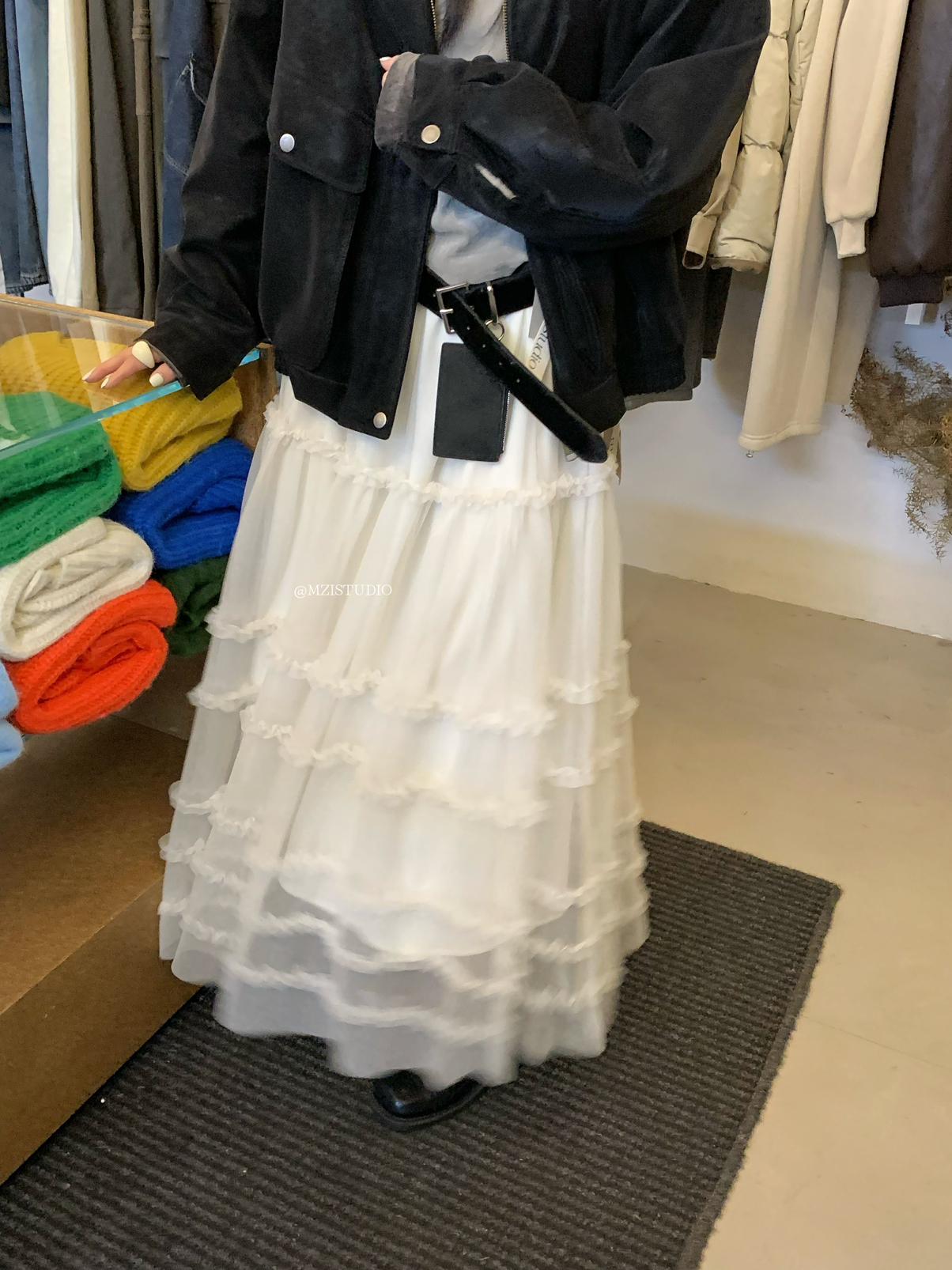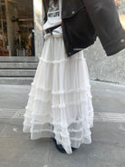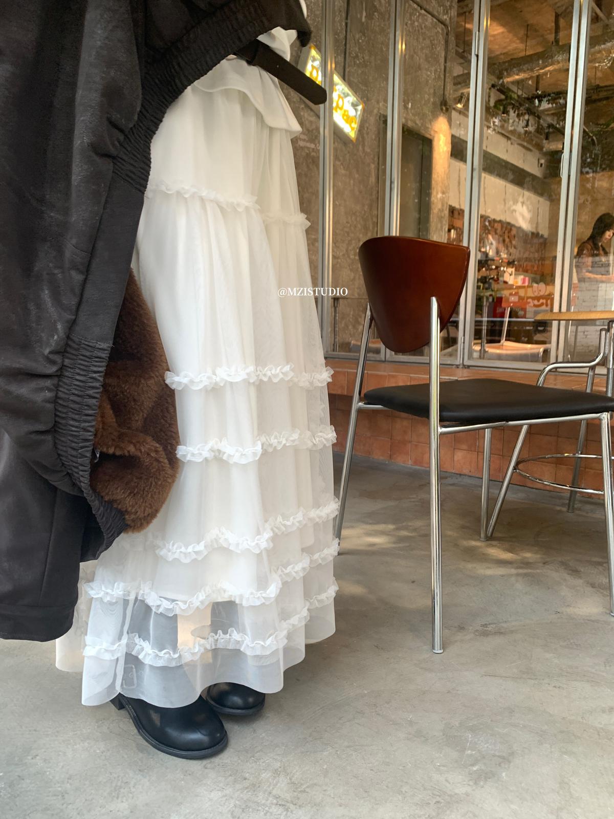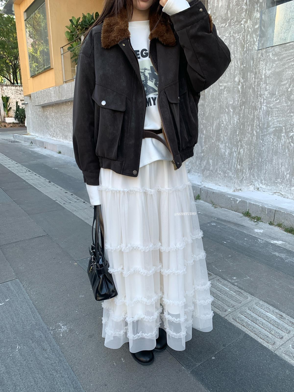 【C8064】智性優雅韓系冬季木耳邊拼接網紗清新少女感鬆緊腰半身裙
