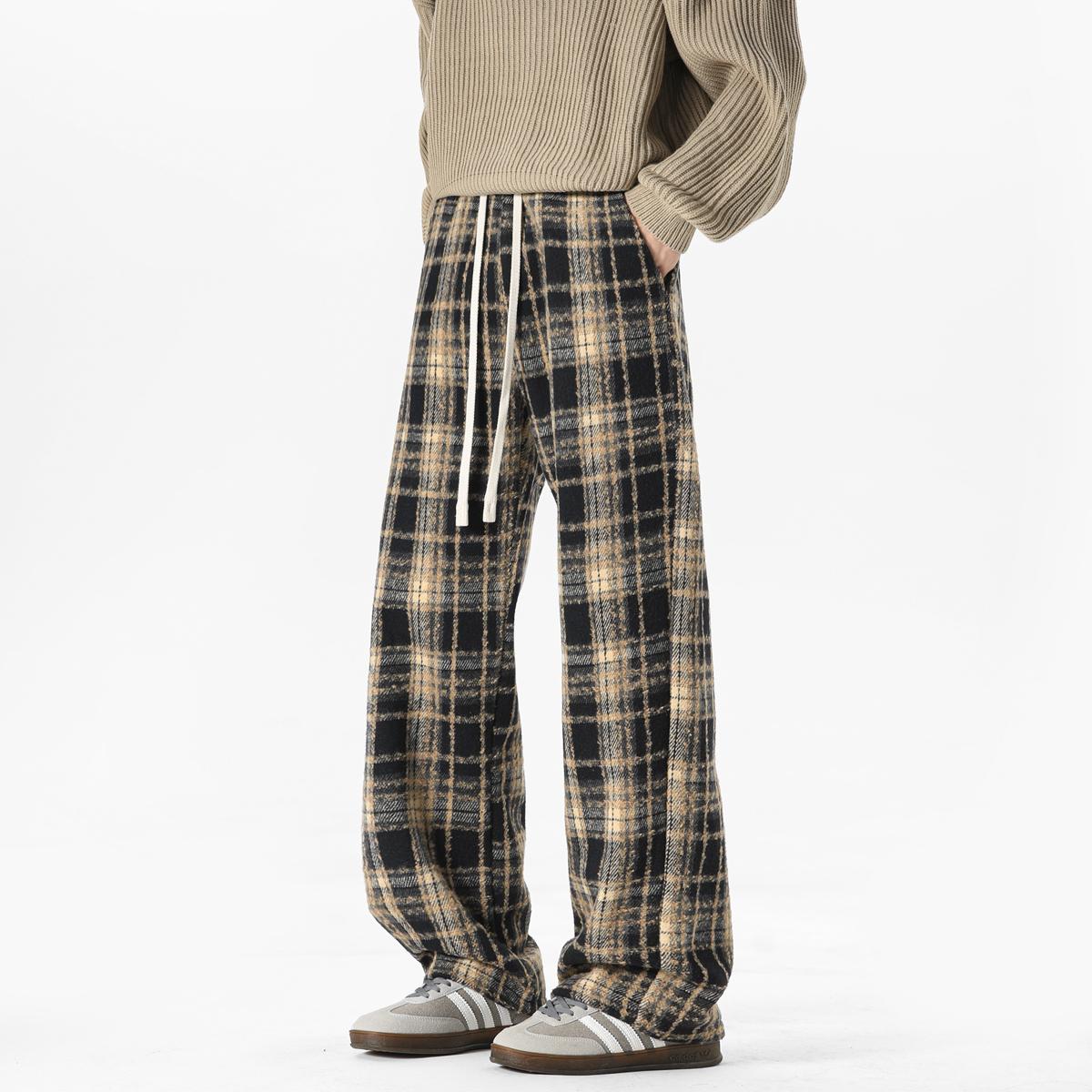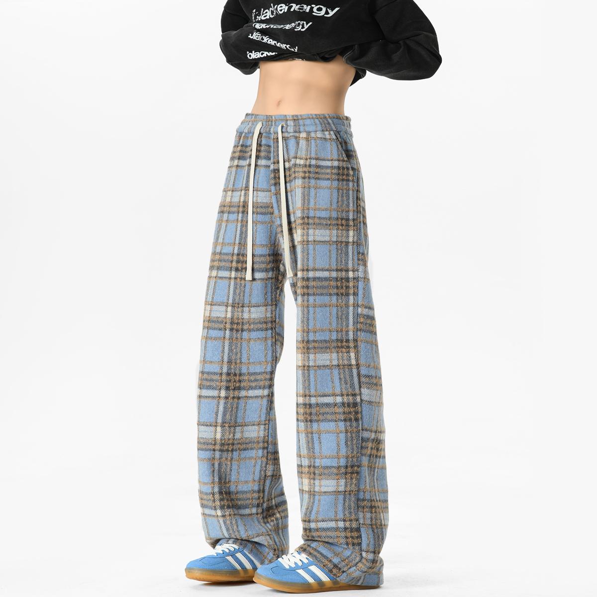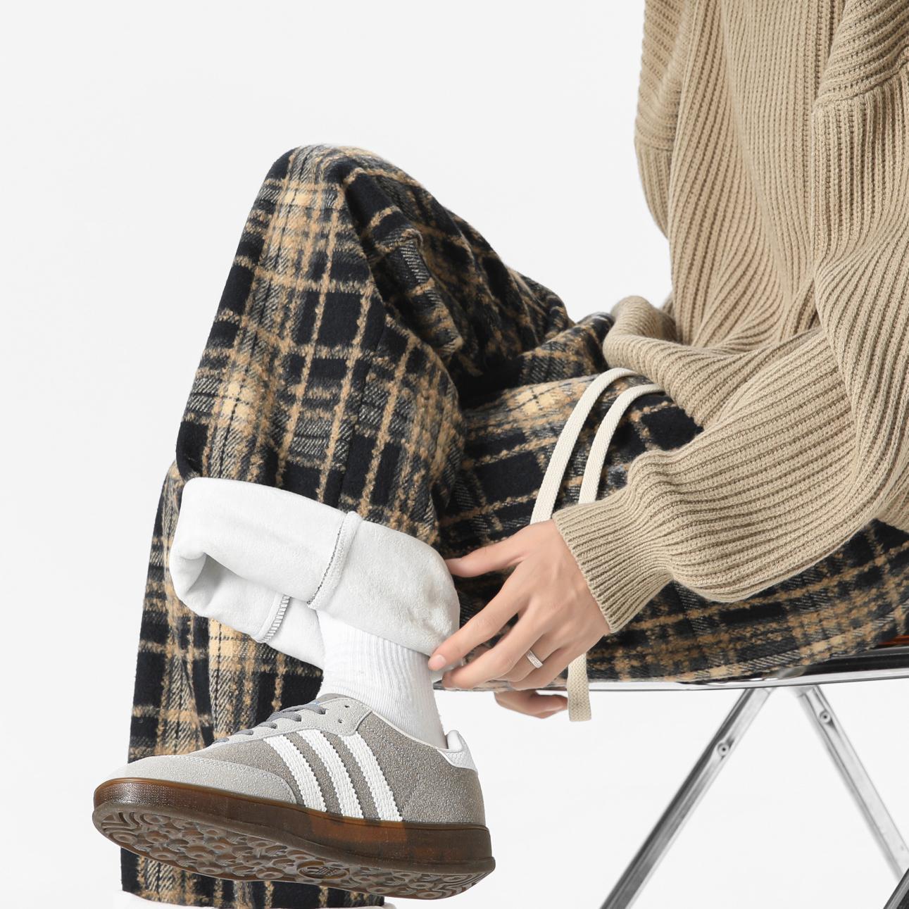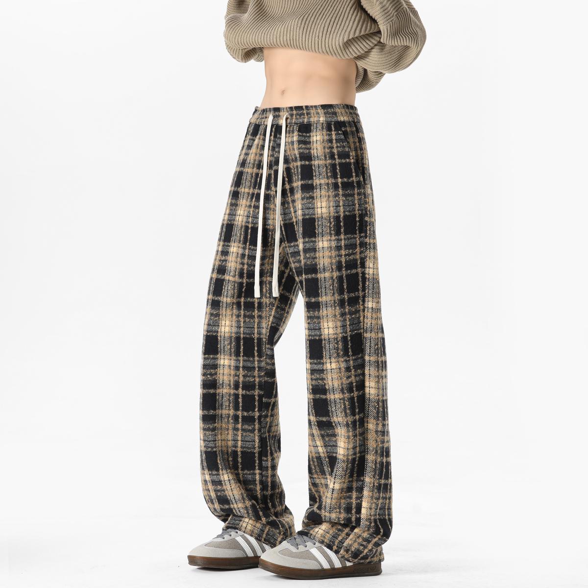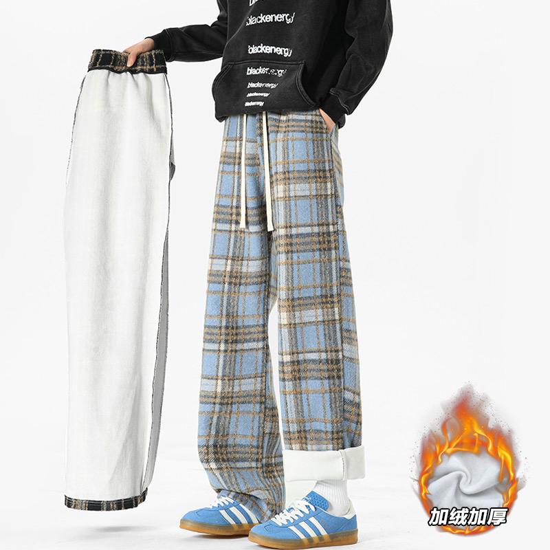 【YS2603】加絨毛呢直筒寬鬆格子加厚休閒褲