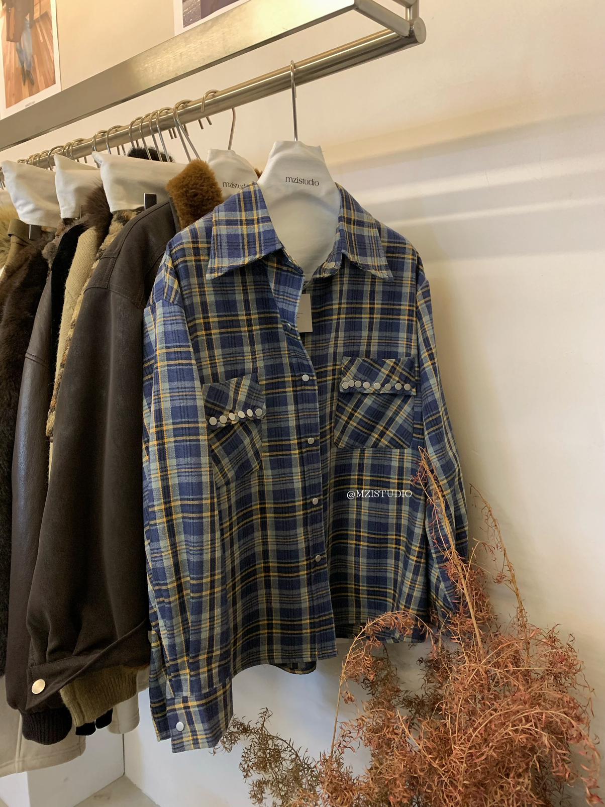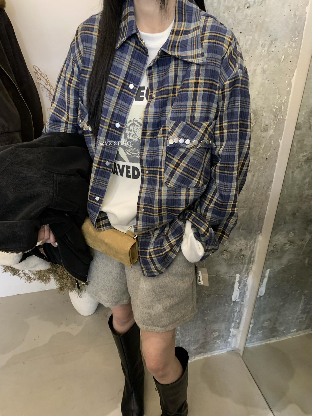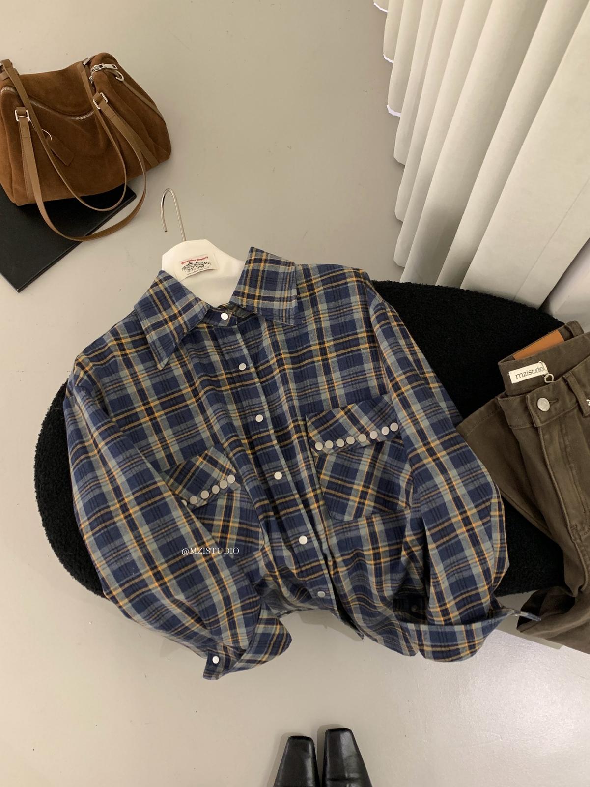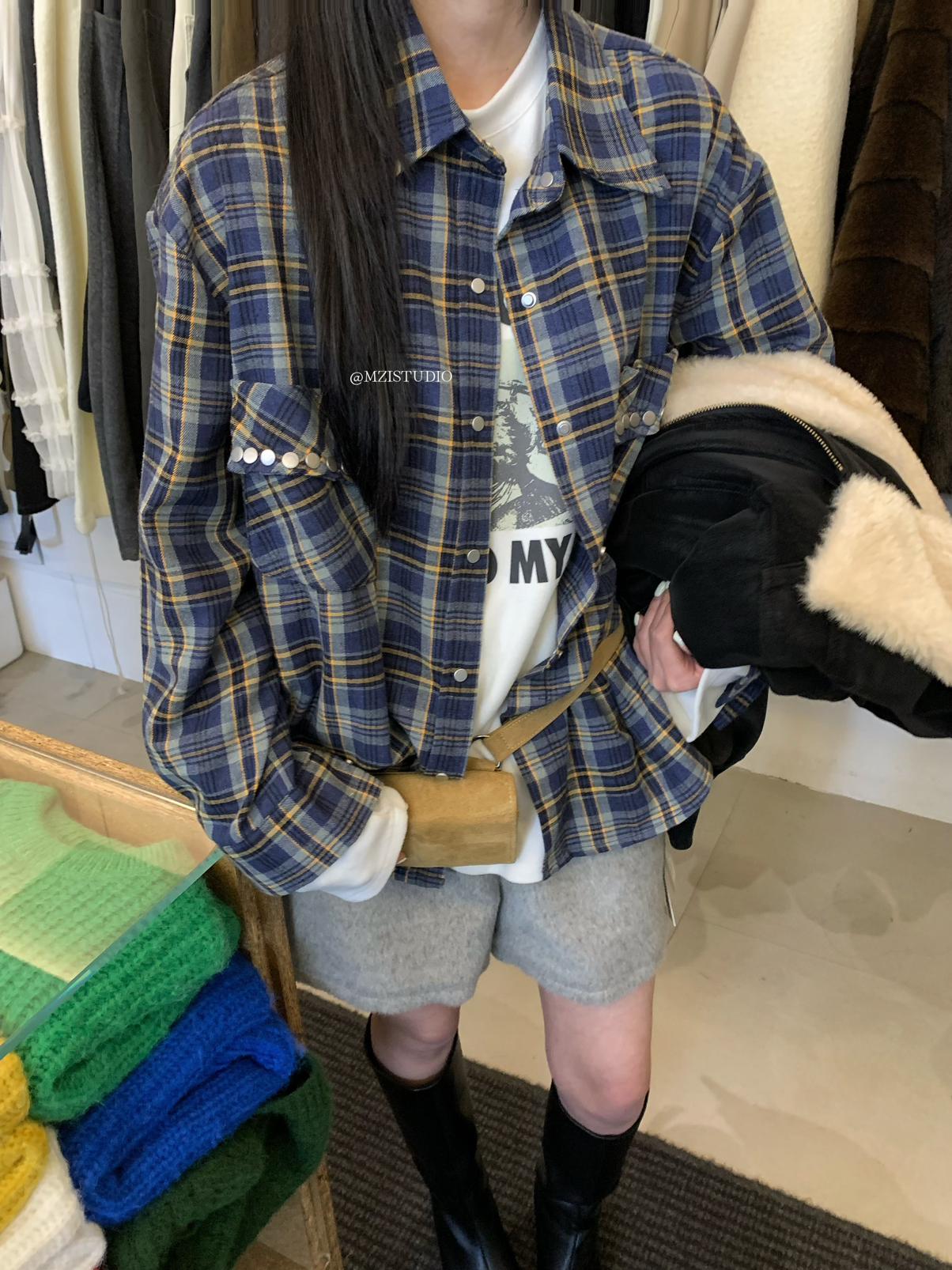 【C8124】智性表達冬日復古格紋鉚釘時髦帥酷鬆弛隨性襯衫