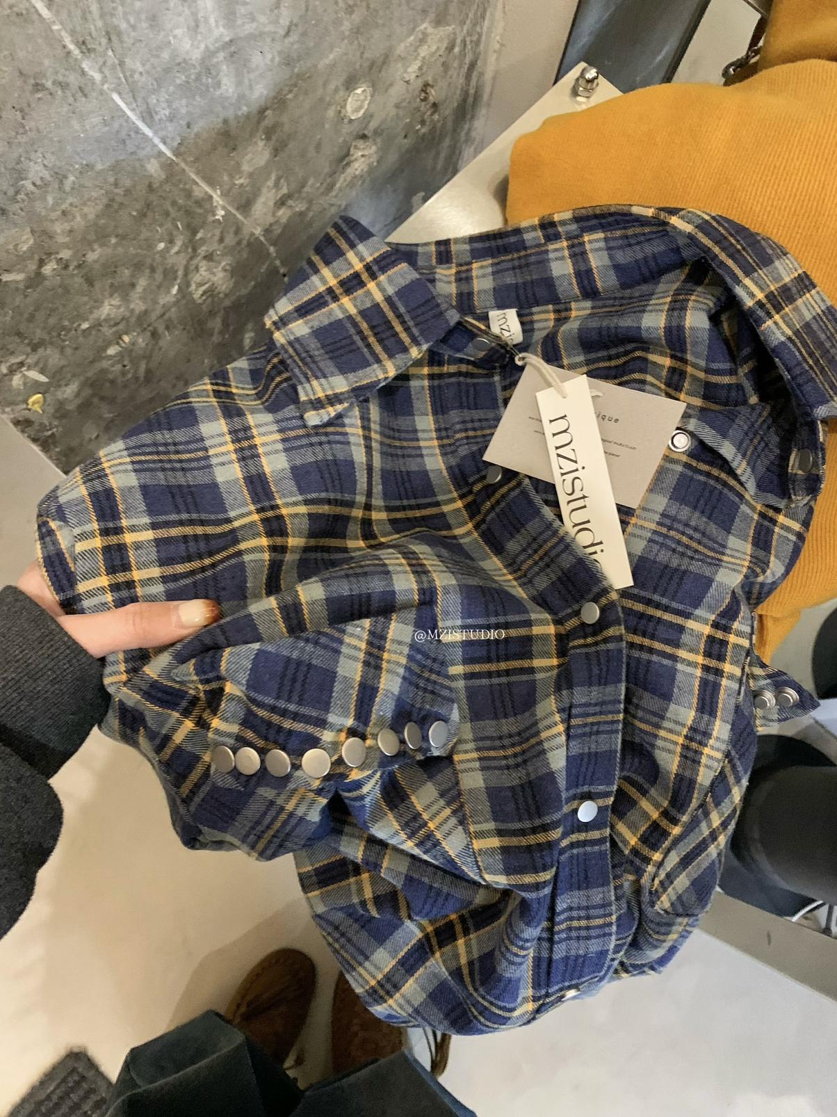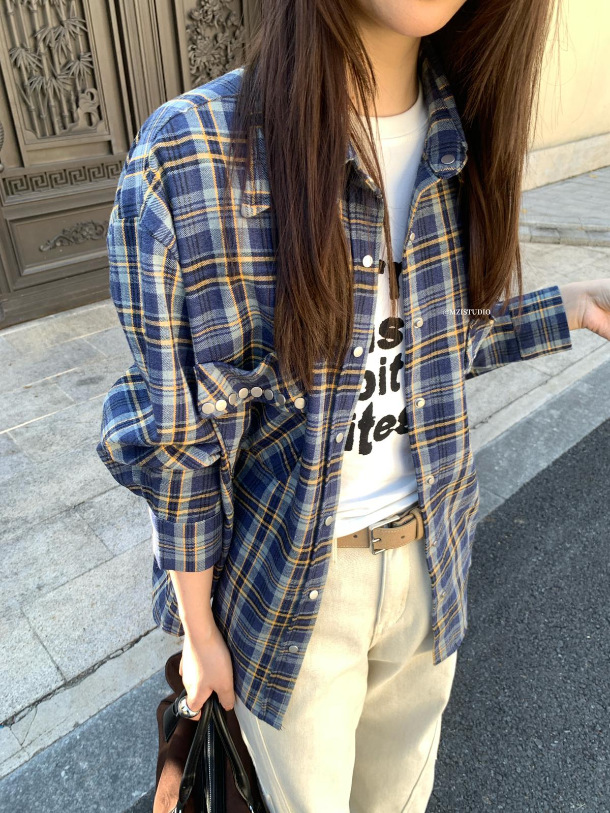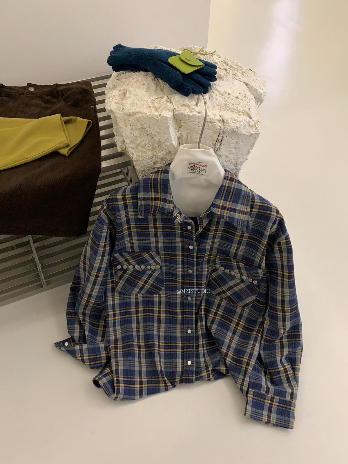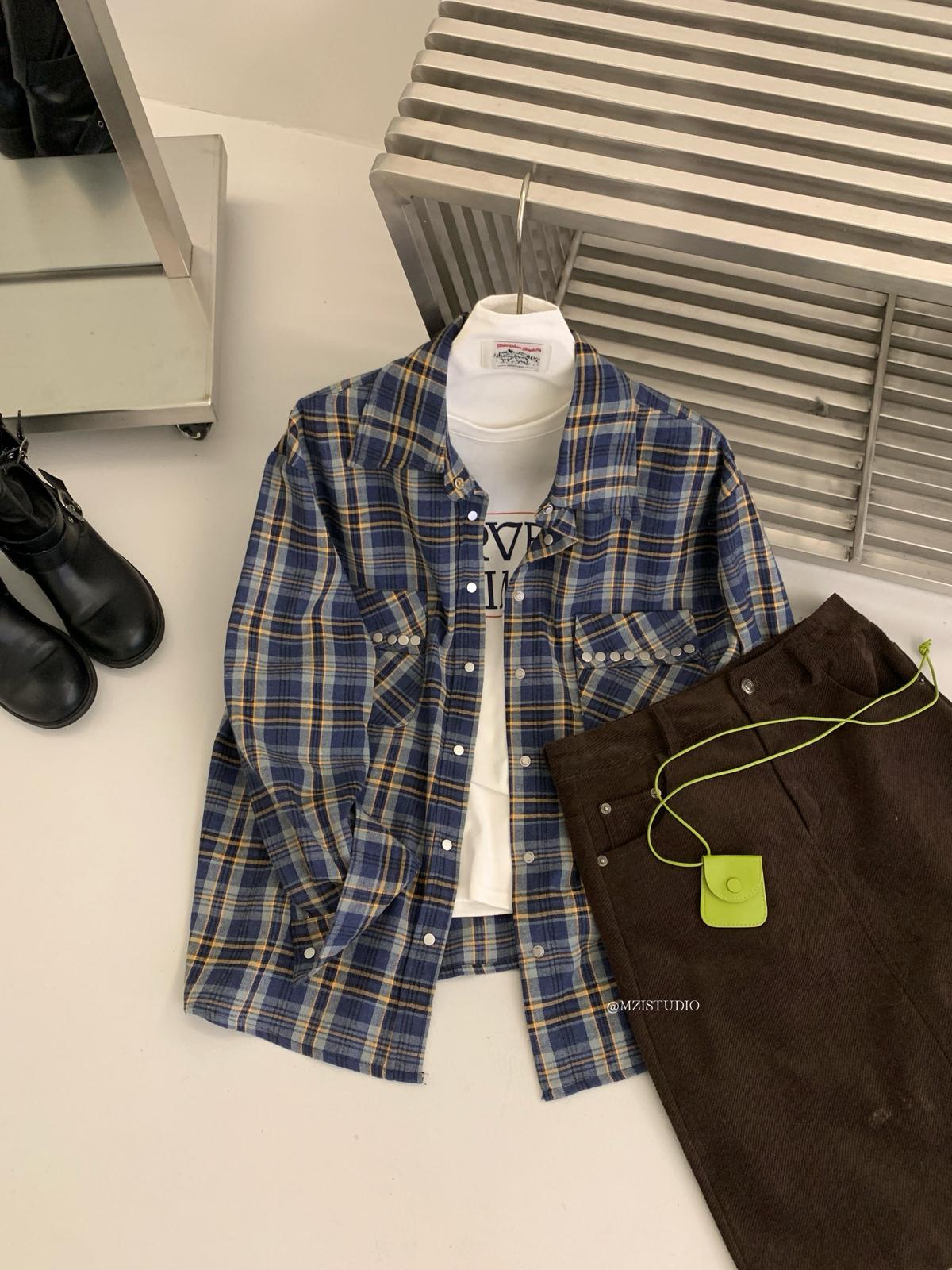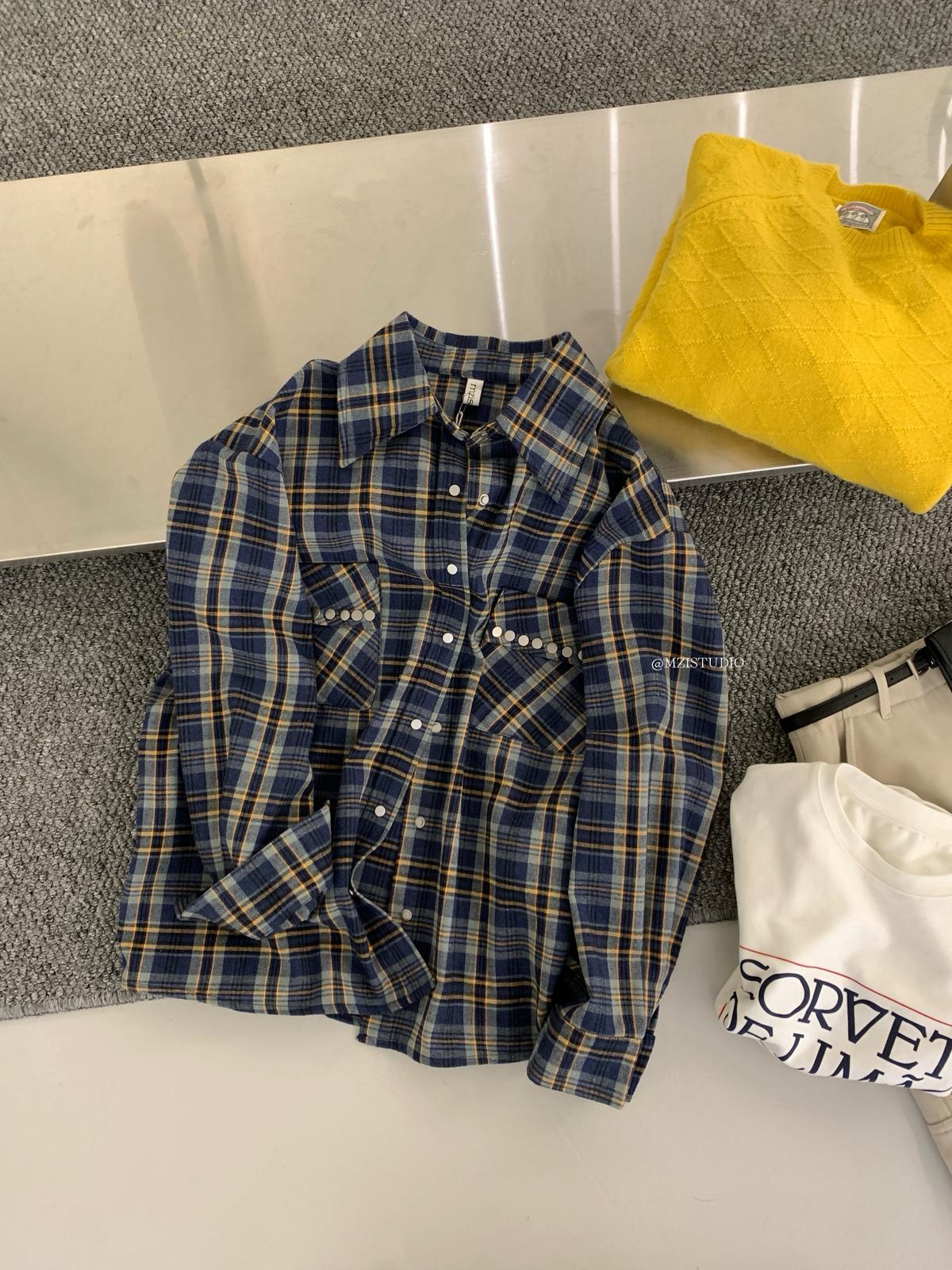 【C8124】智性表達冬日復古格紋鉚釘時髦帥酷鬆弛隨性襯衫