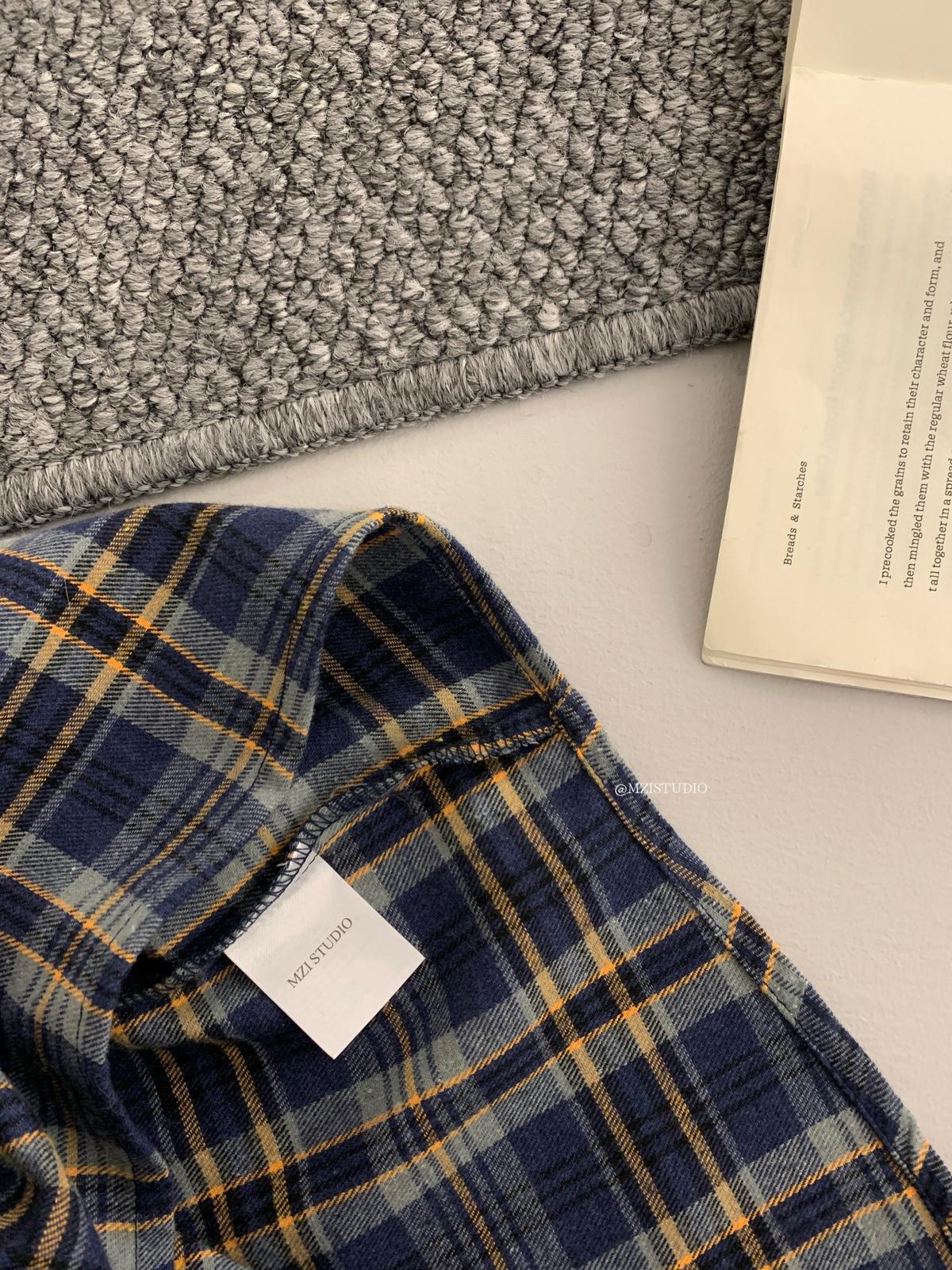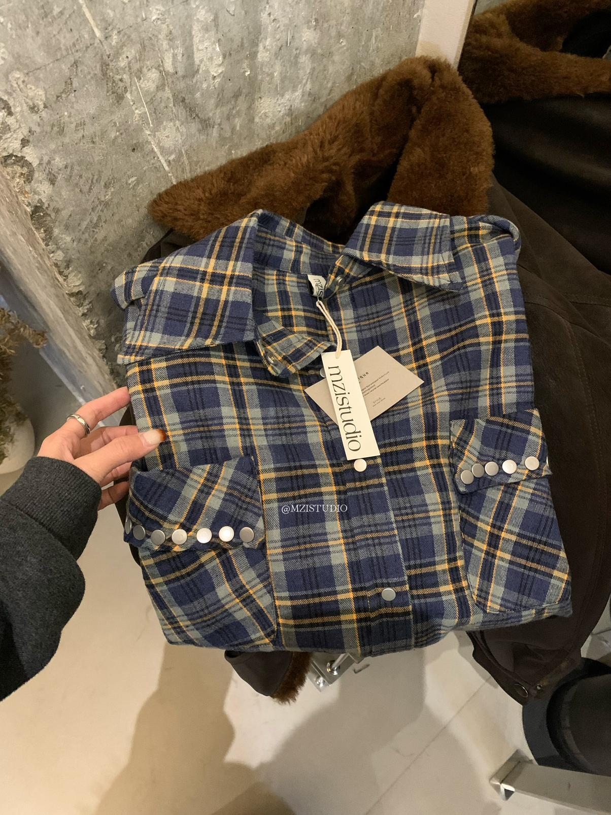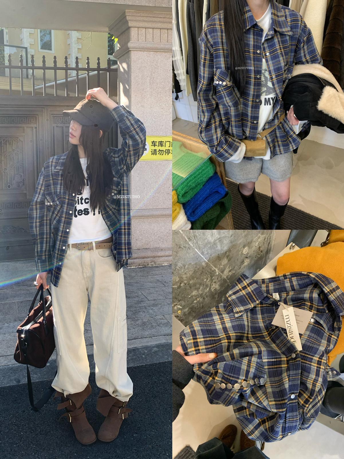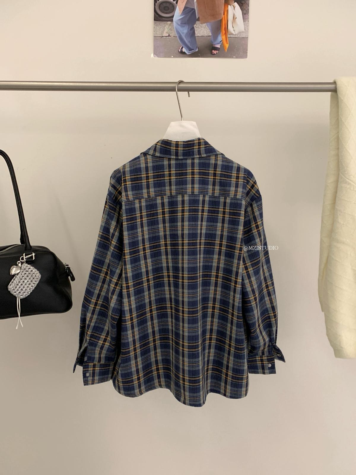 【C8124】智性表達冬日復古格紋鉚釘時髦帥酷鬆弛隨性襯衫