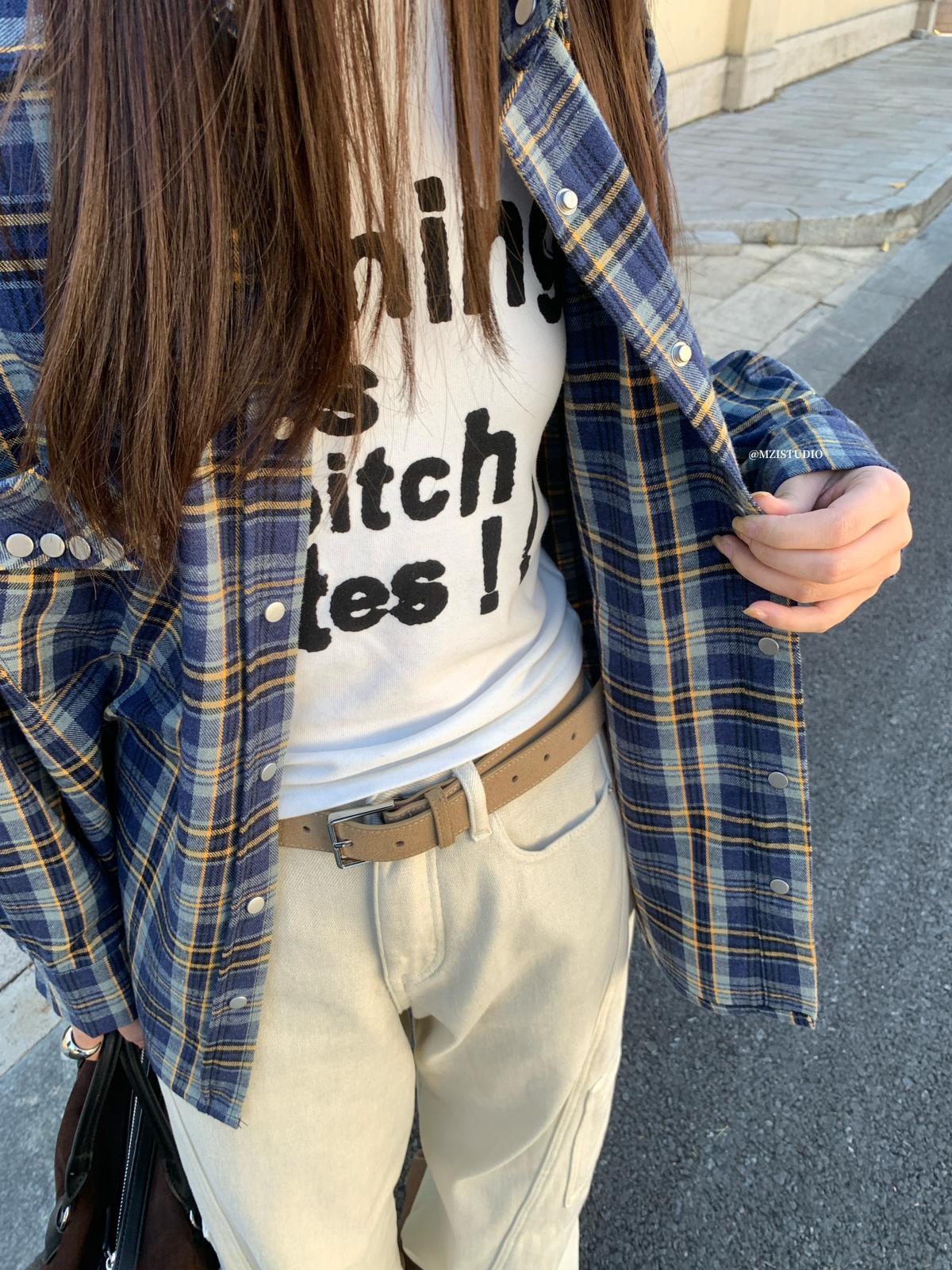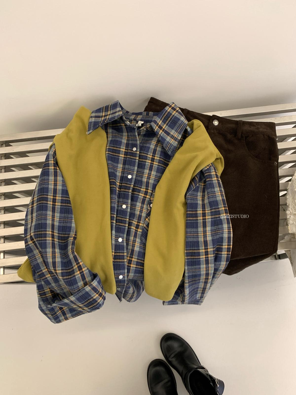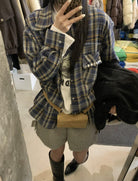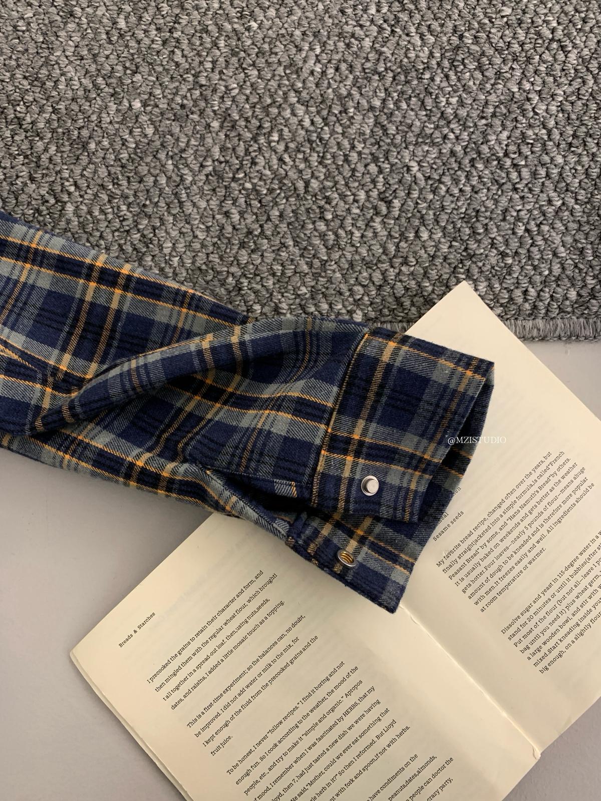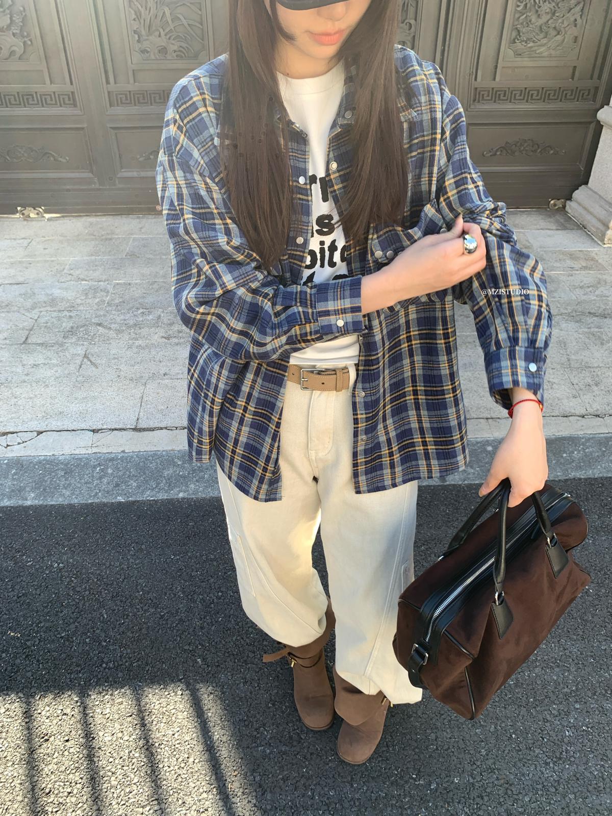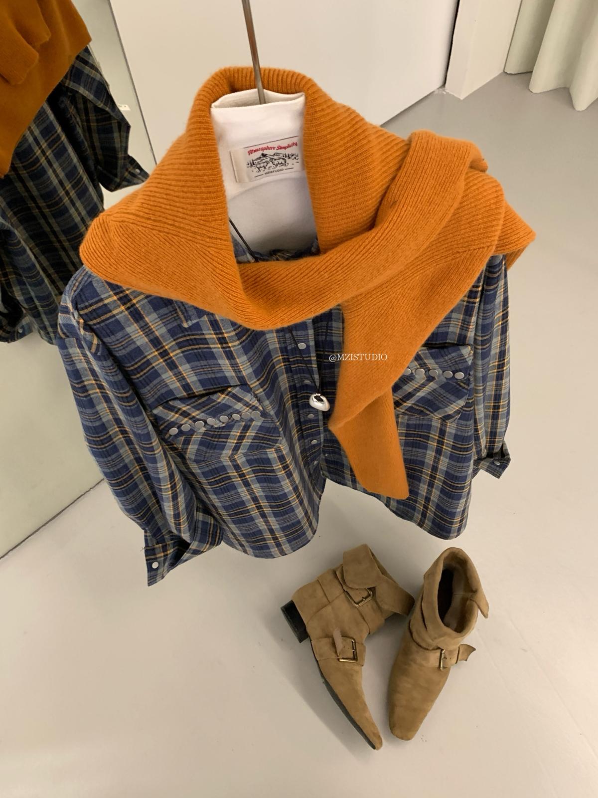 【C8124】智性表達冬日復古格紋鉚釘時髦帥酷鬆弛隨性襯衫