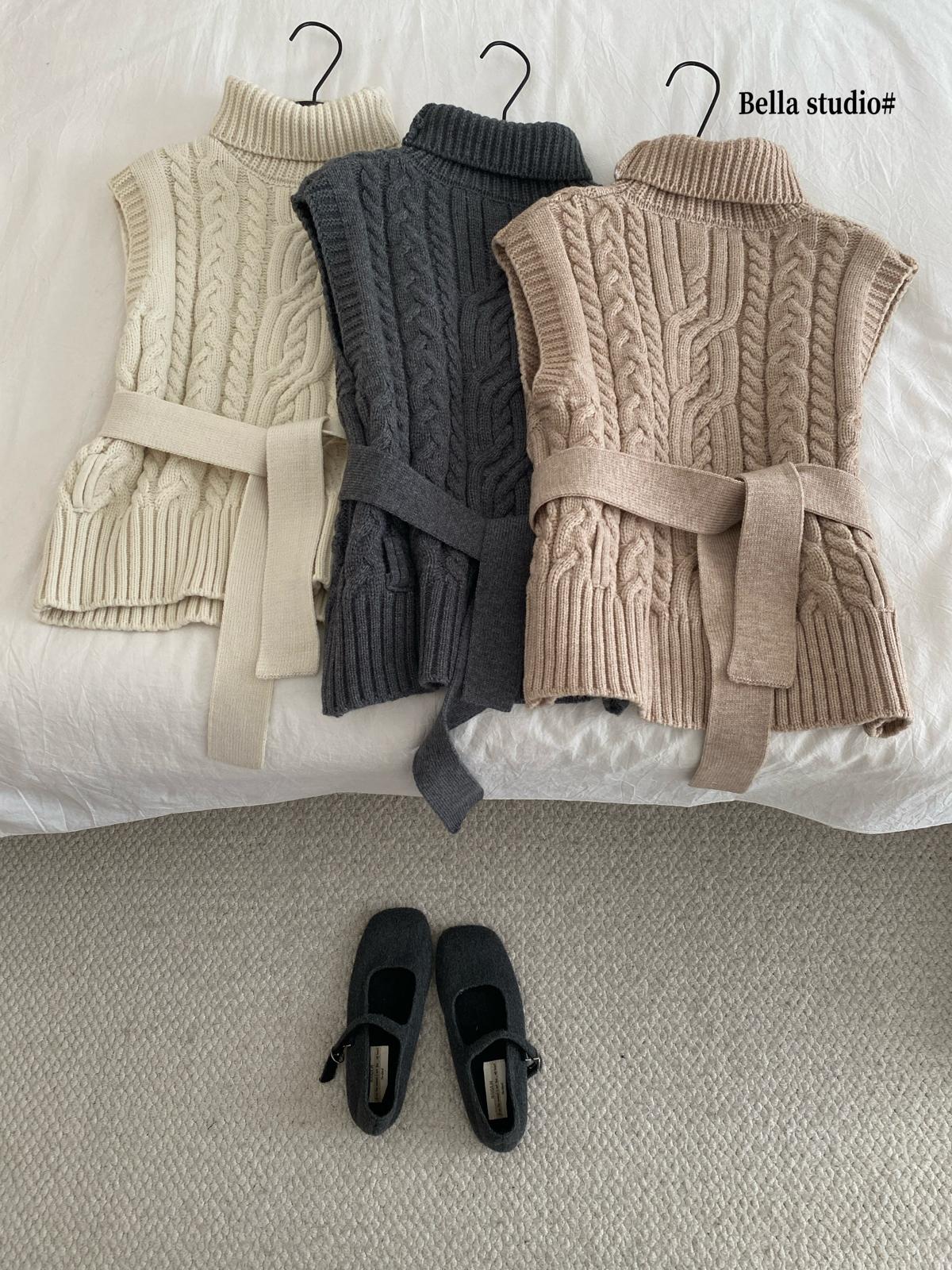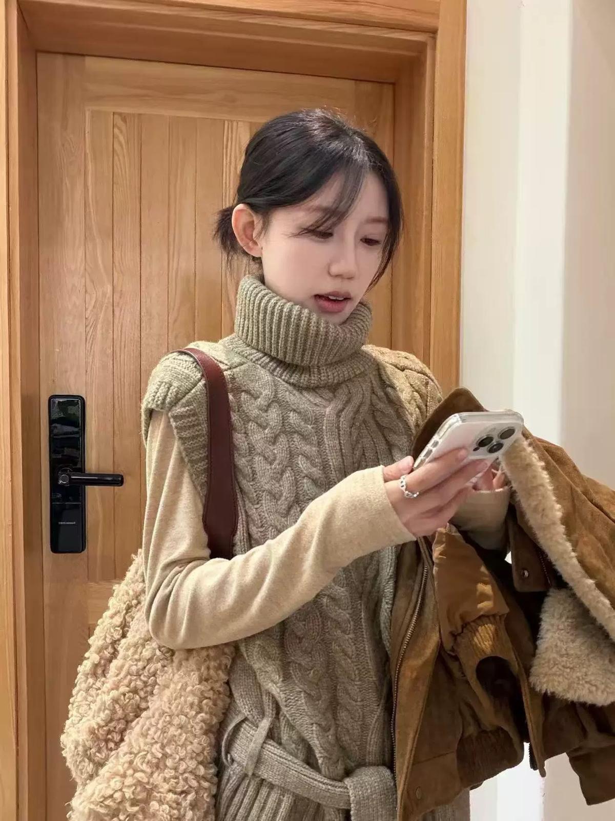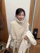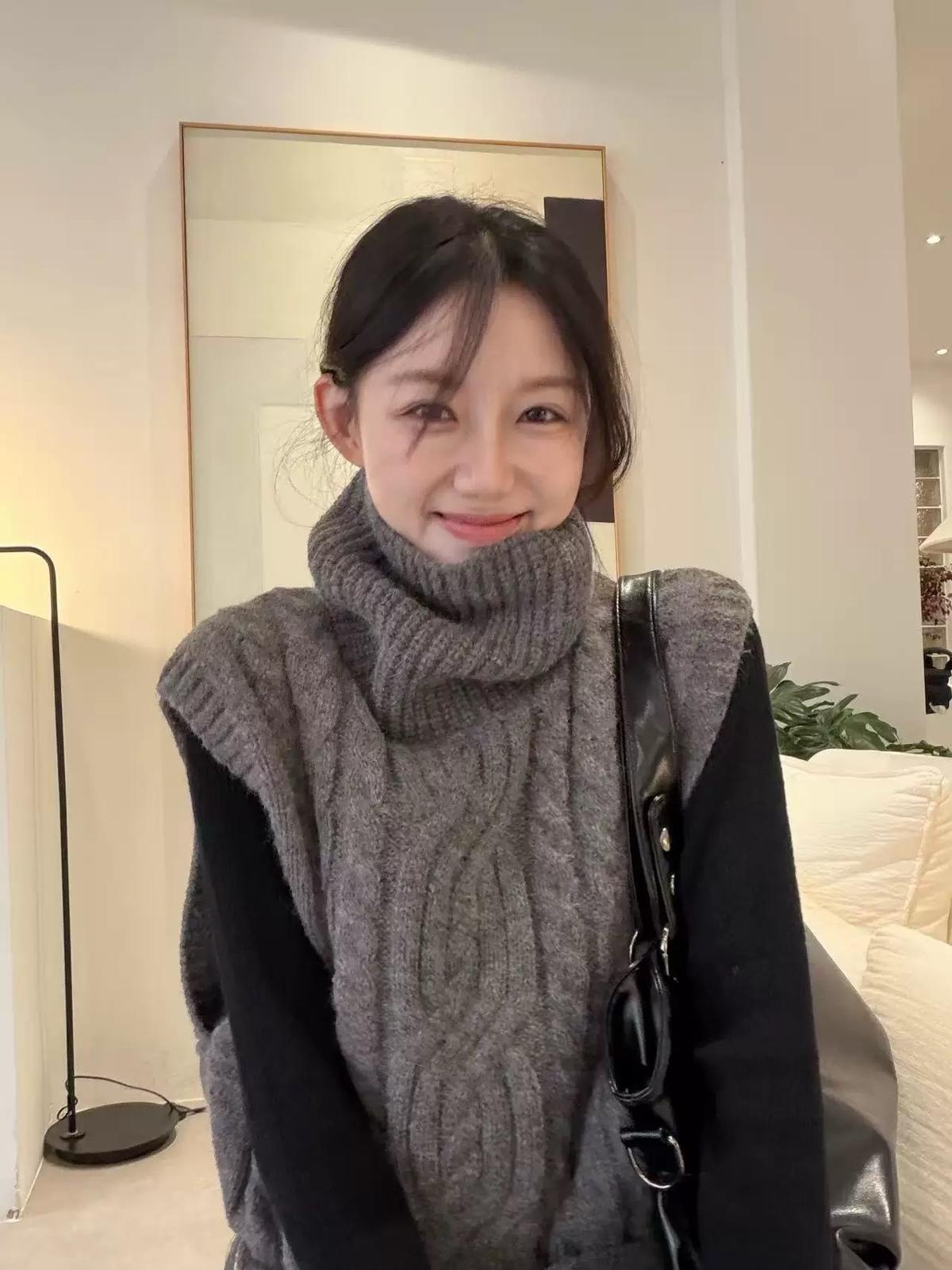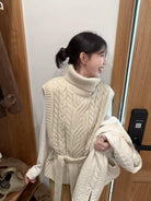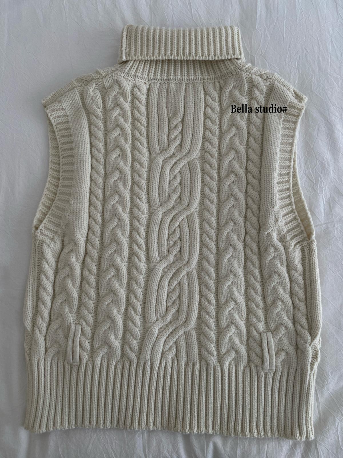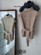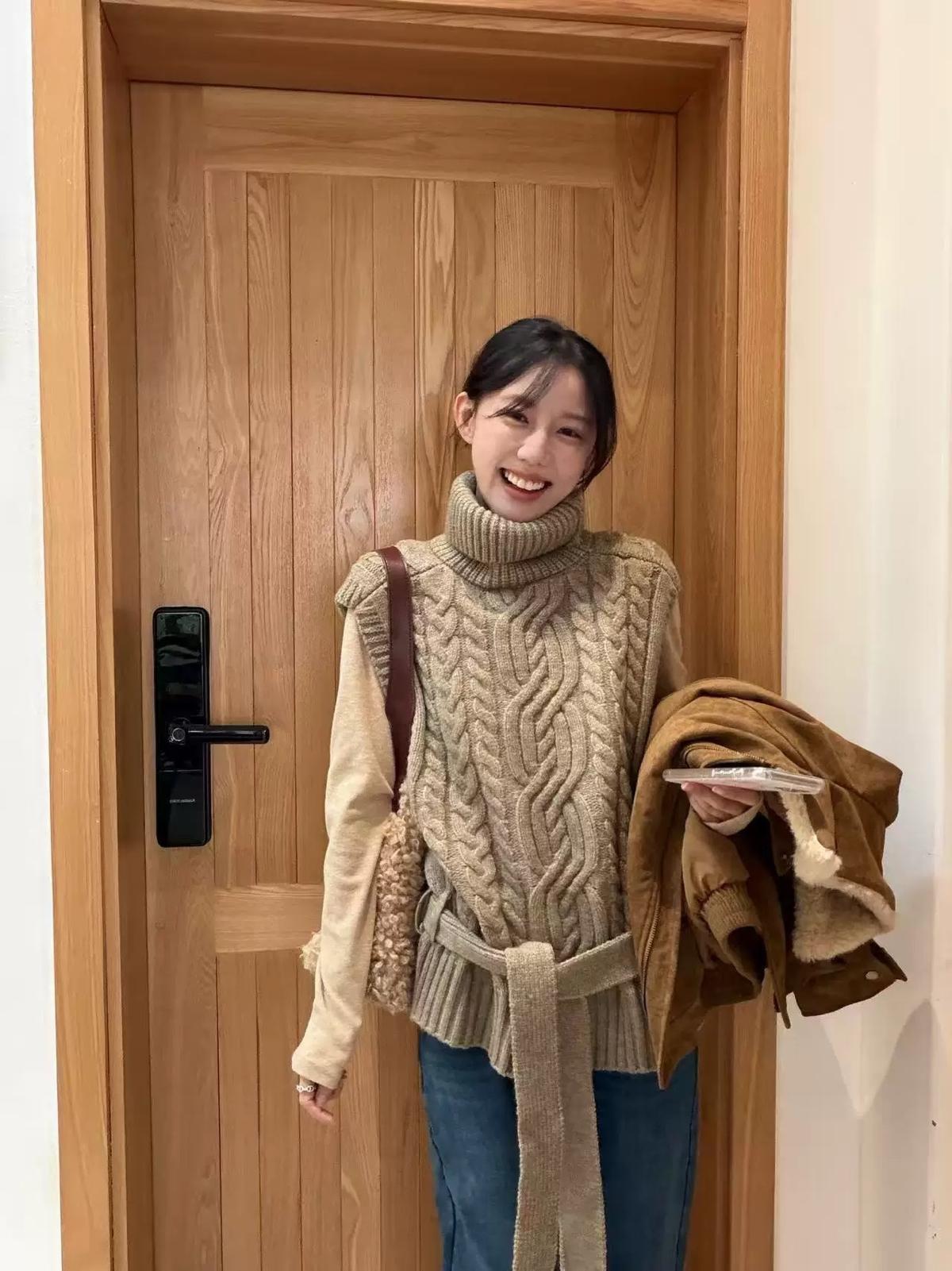 【C8176】韓系時髦疊穿神器高領繫帶麻花顯瘦氣質大氣厚實寬鬆百搭背心(配腰帶)