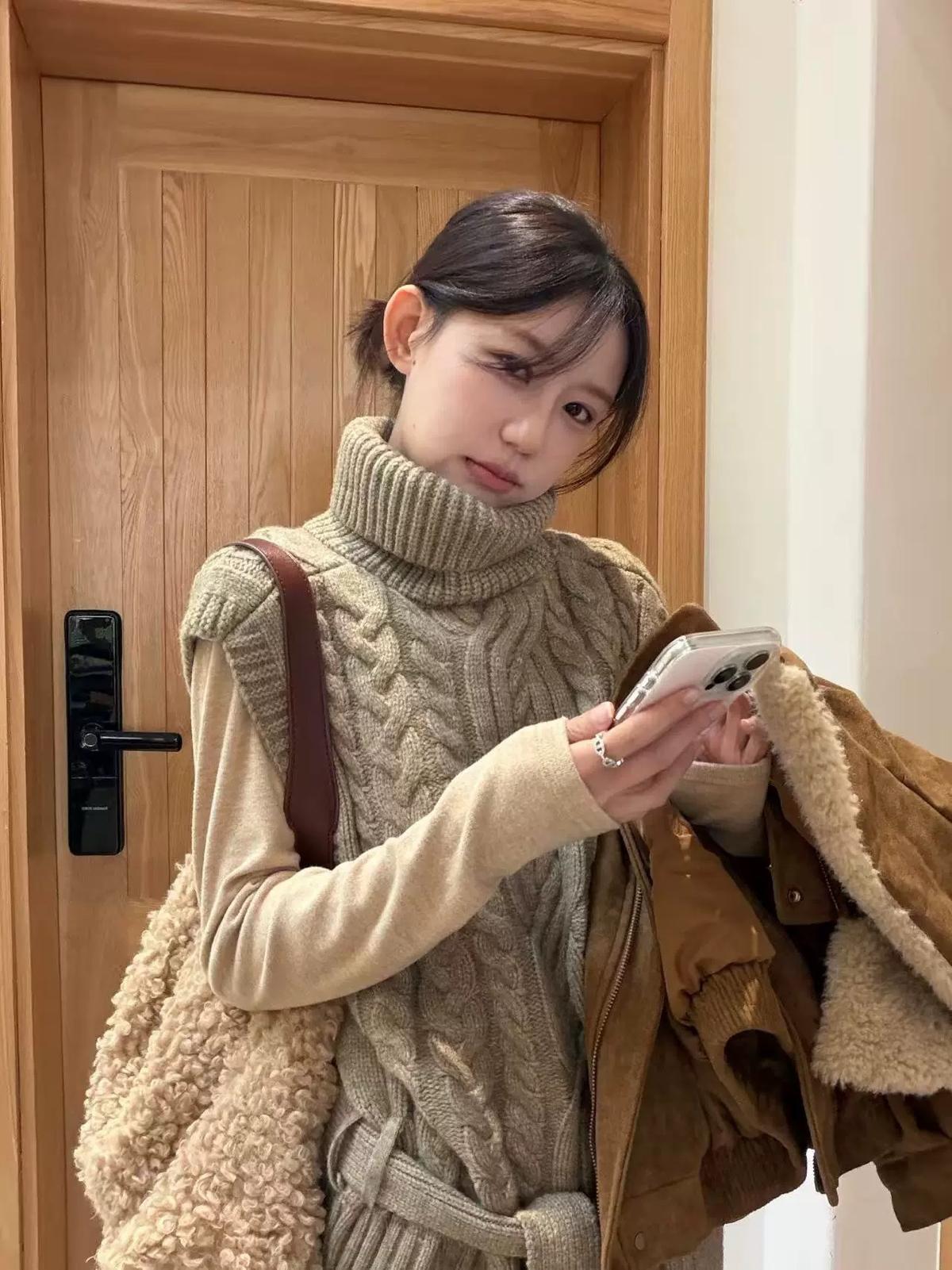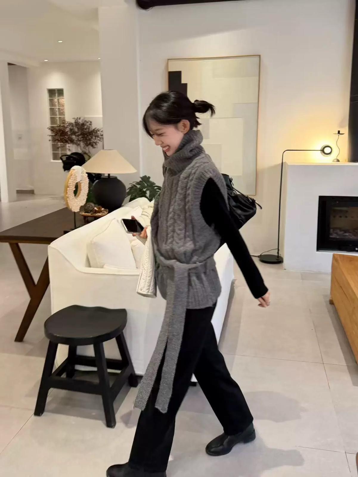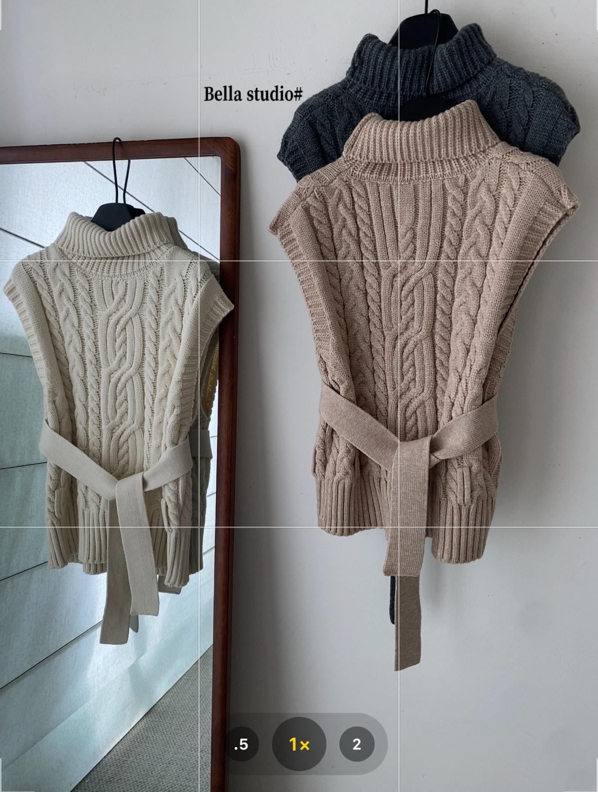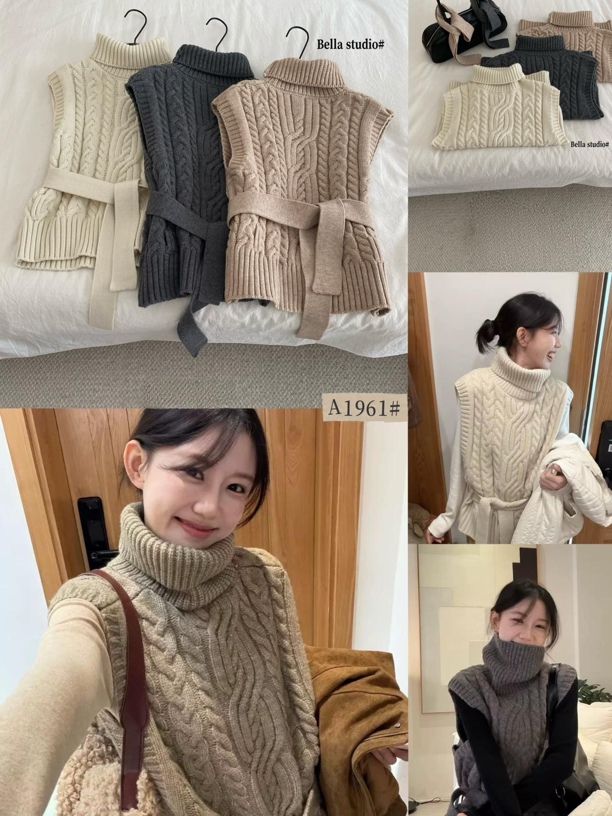 3. 【C8176】韓系時髦疊穿神器高領繫帶麻花顯瘦氣質大氣厚實寬鬆百搭背心(配腰帶)