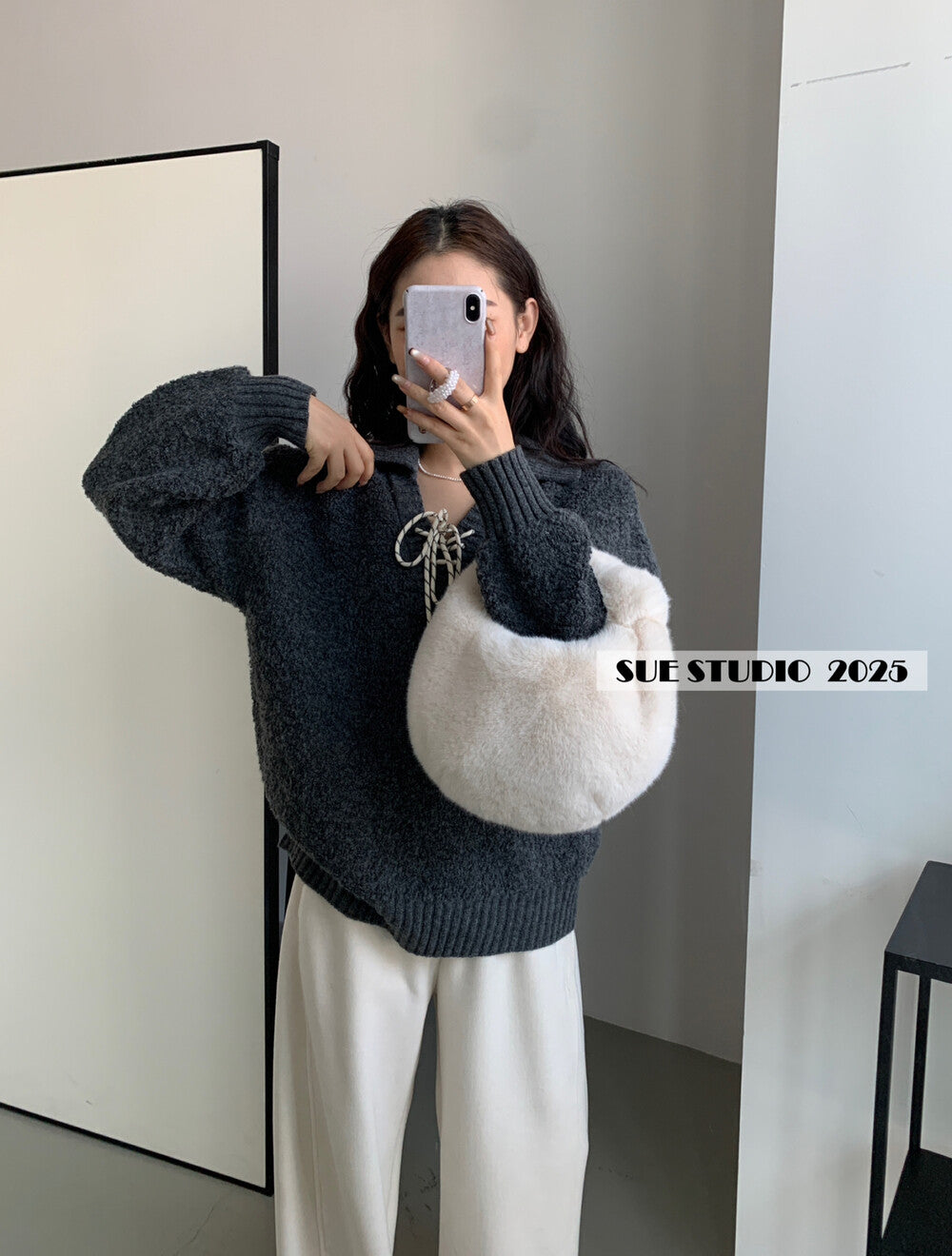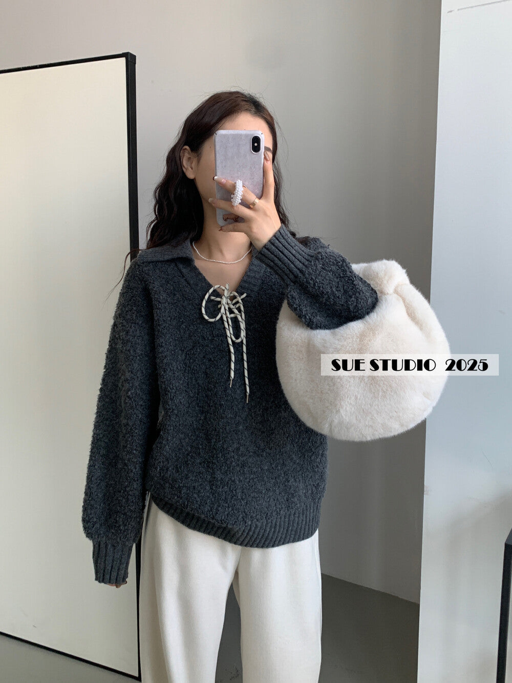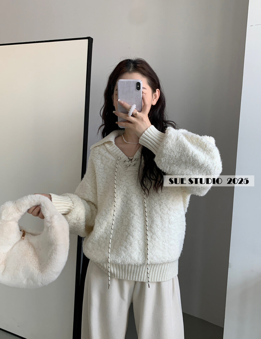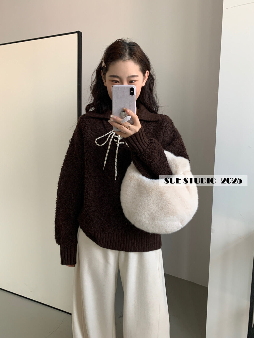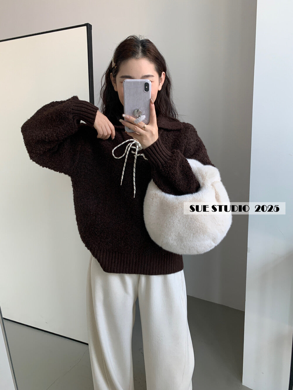 【C8189】韓系休閒翻領加厚圈圈毛套頭保暖毛衣(配織帶)